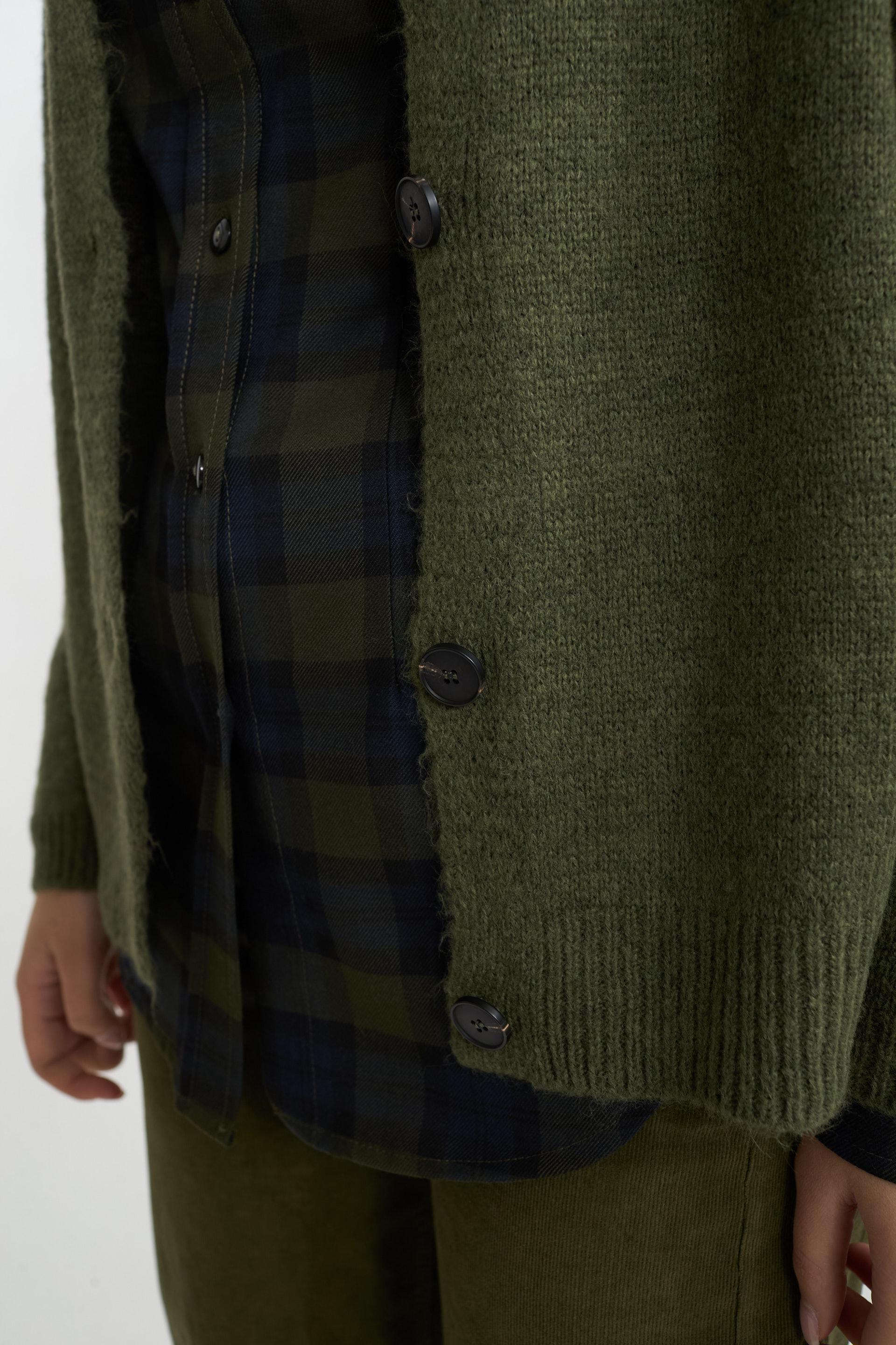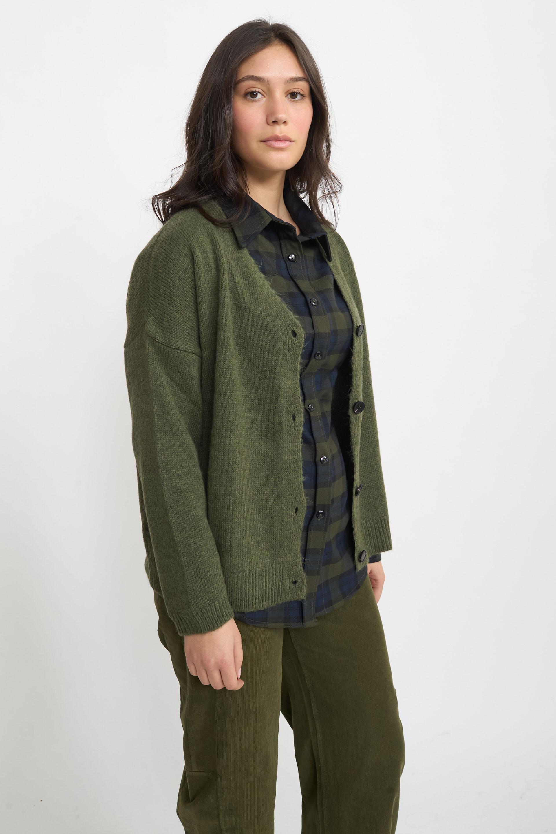 | Cardigan scollo V con bottoni e lavorazione a coste su polsini e orlo. | ||