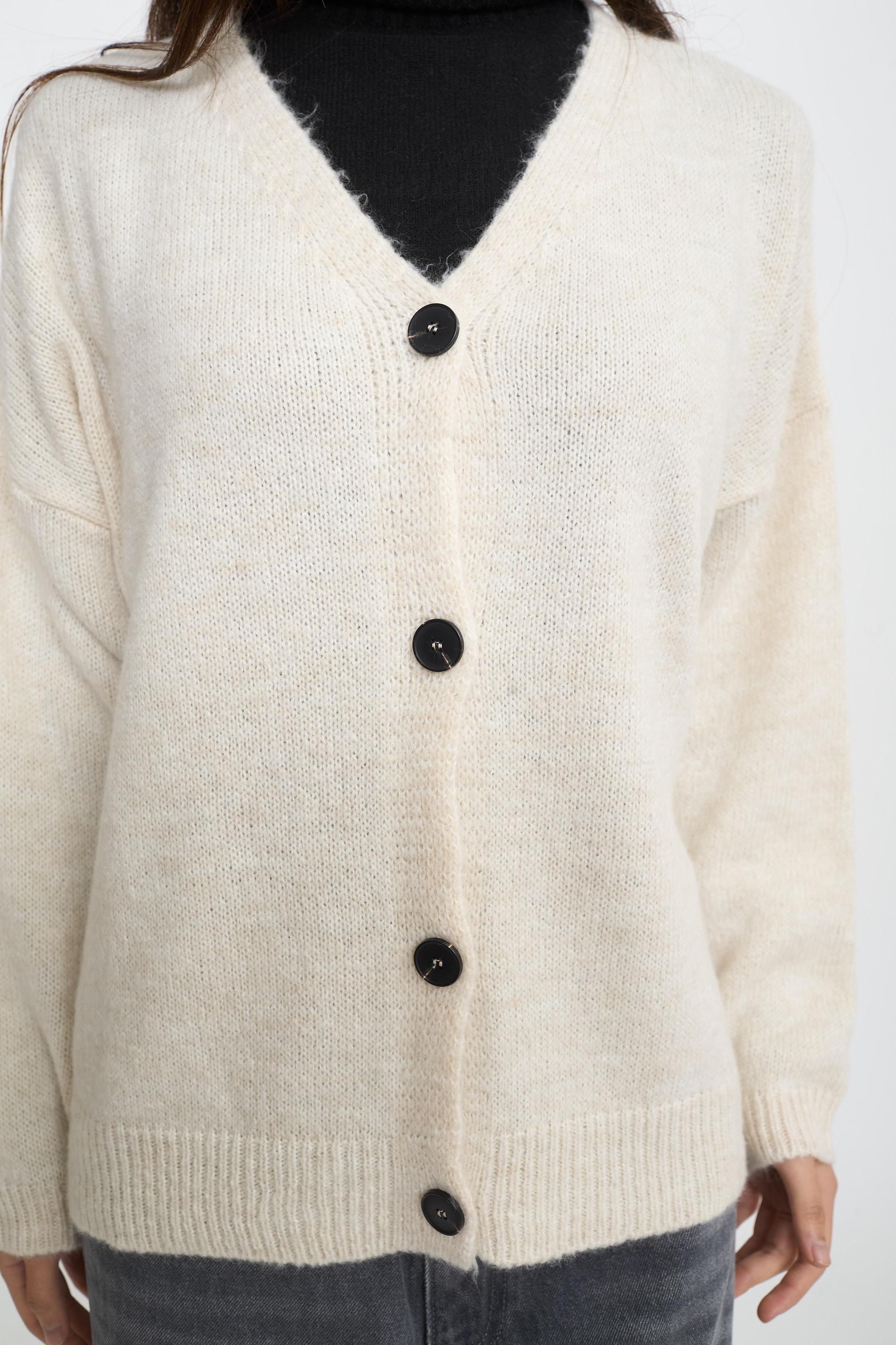 | Cardigan scollo V con bottoni e lavorazione a coste su polsini e orlo. | ||