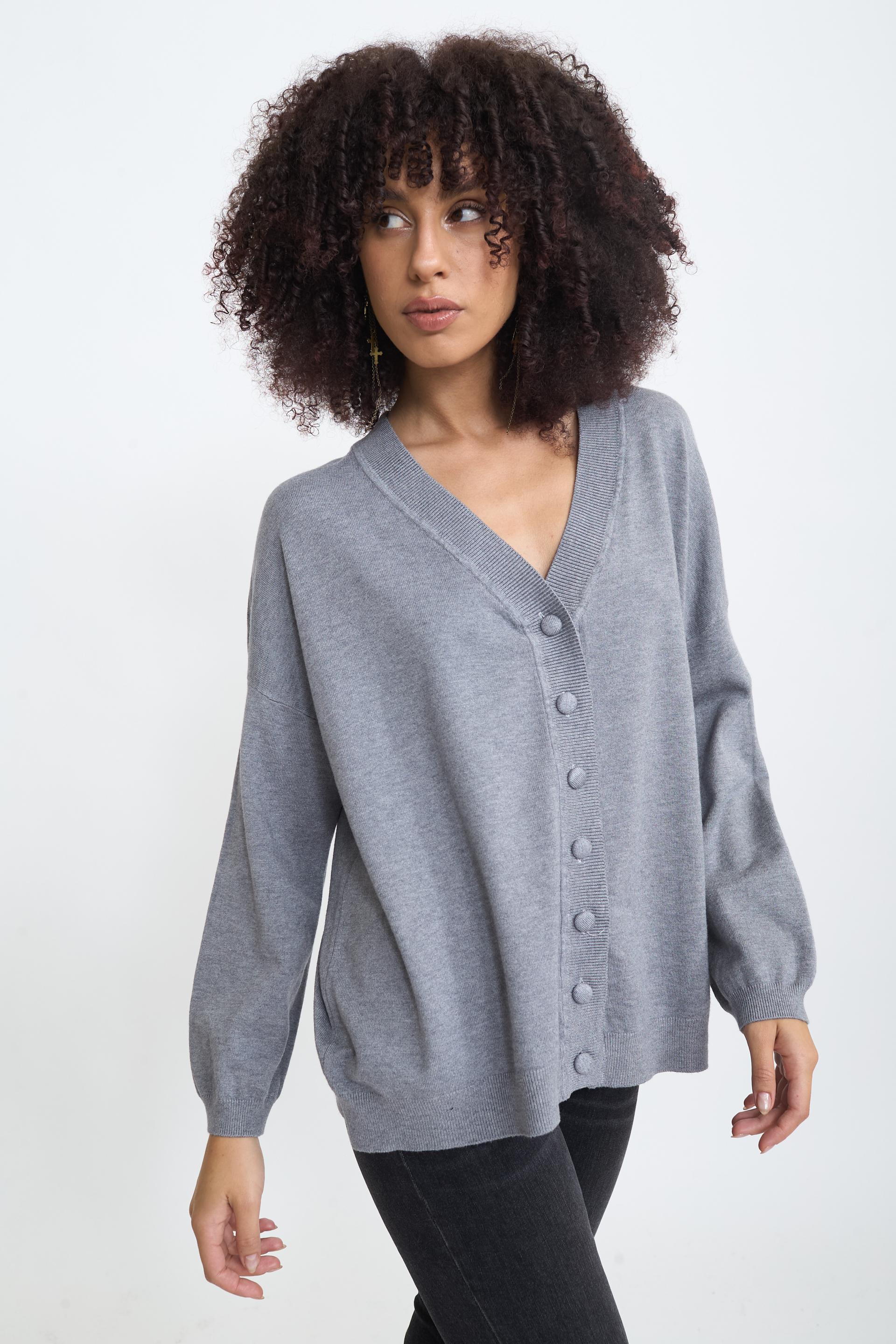 Cardigan over scollo V con lavorazione a coste su bordi. Bottoni rivestiti in maglia. | ||