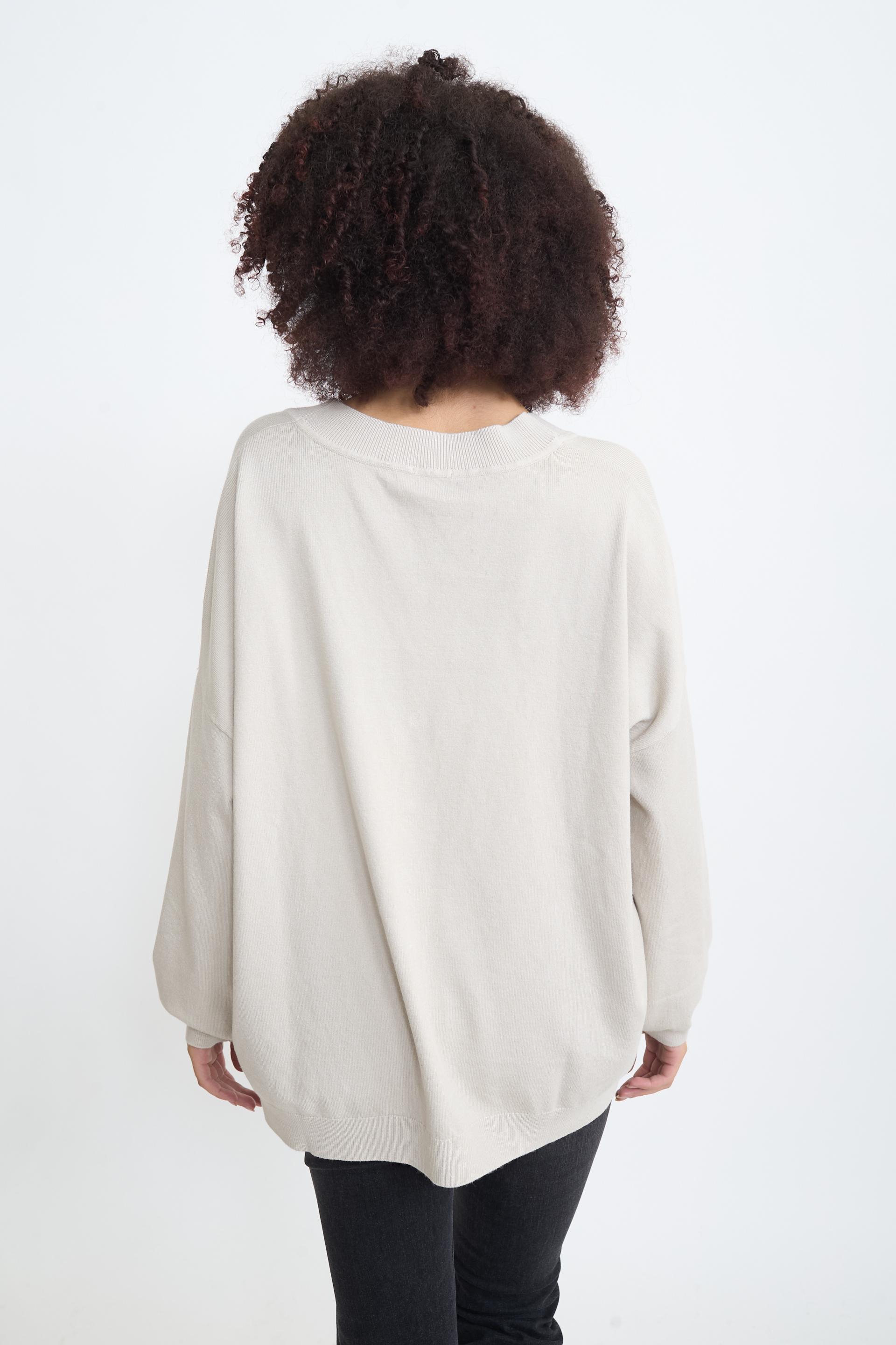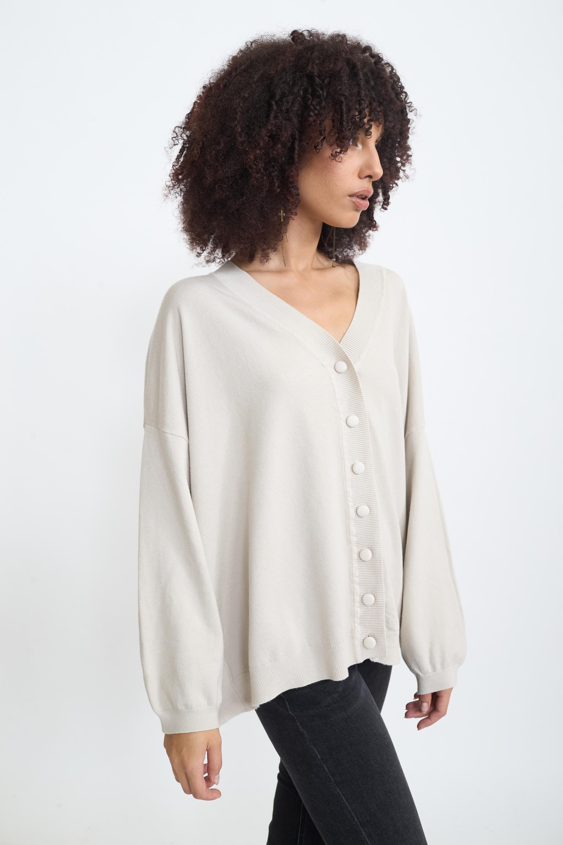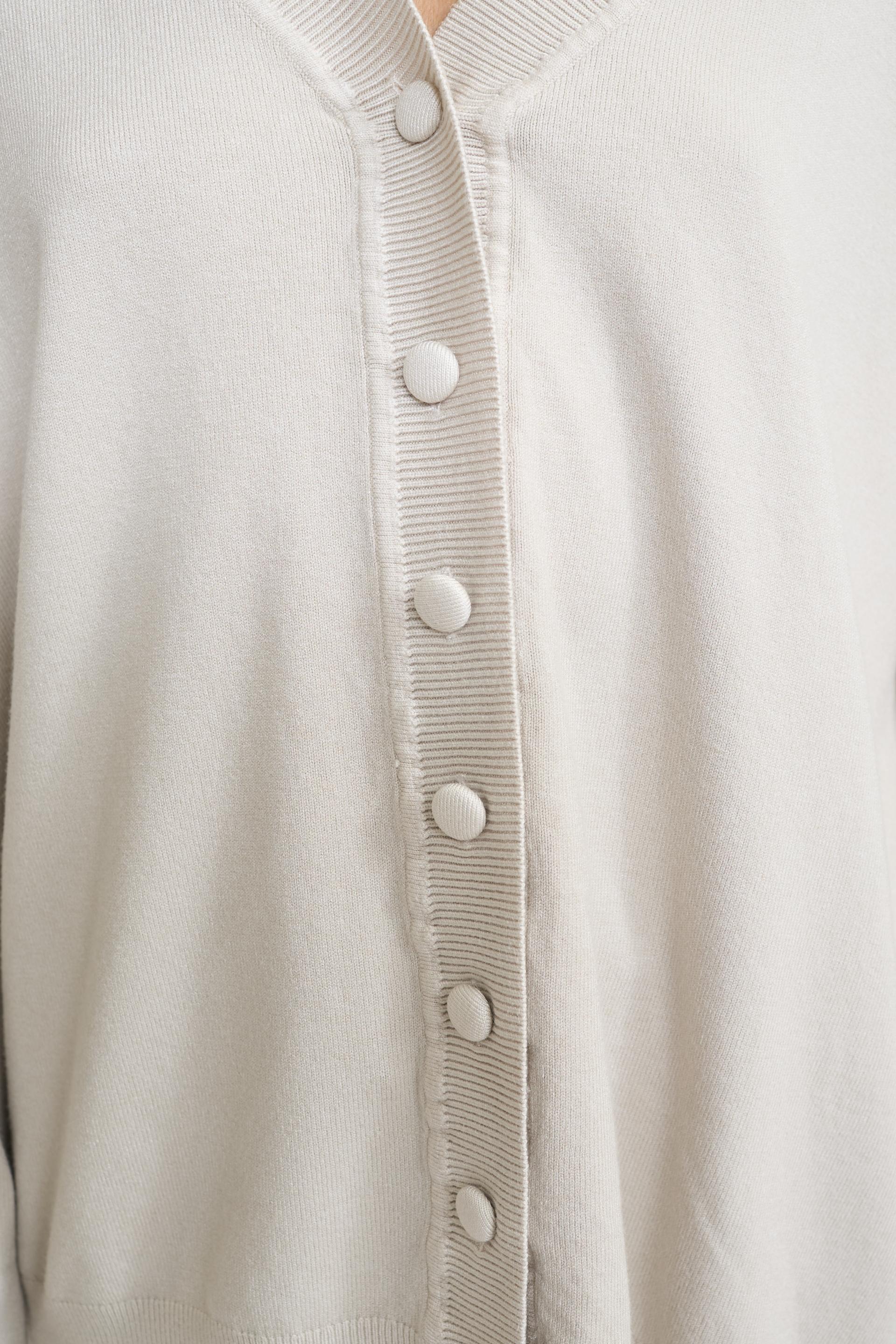 Cardigan over scollo V con lavorazione a coste su bordi. Bottoni rivestiti in maglia. | ||