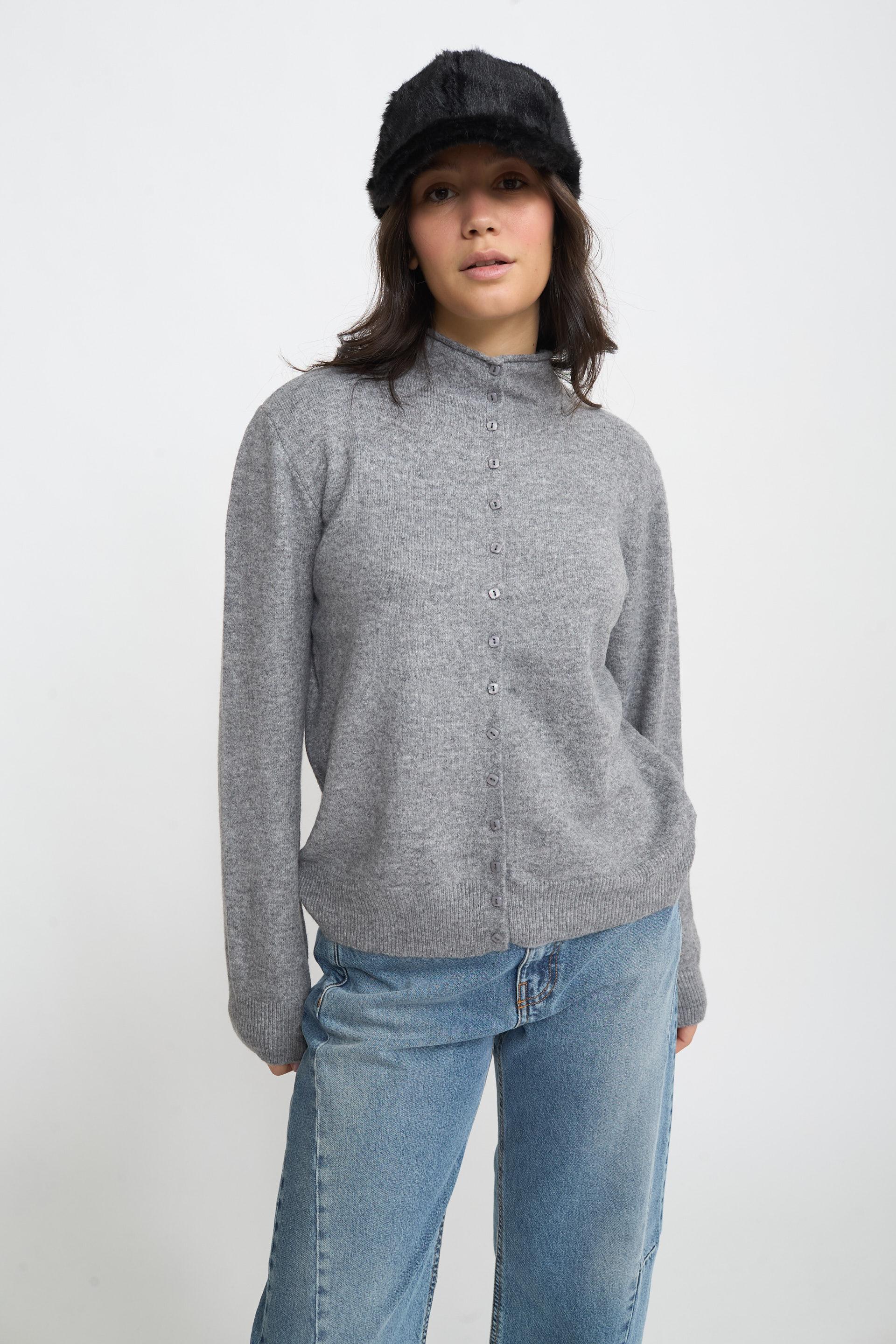 | Cardigan collo alto con chiusura tramite bottoni squadrati tono su tono. | ||