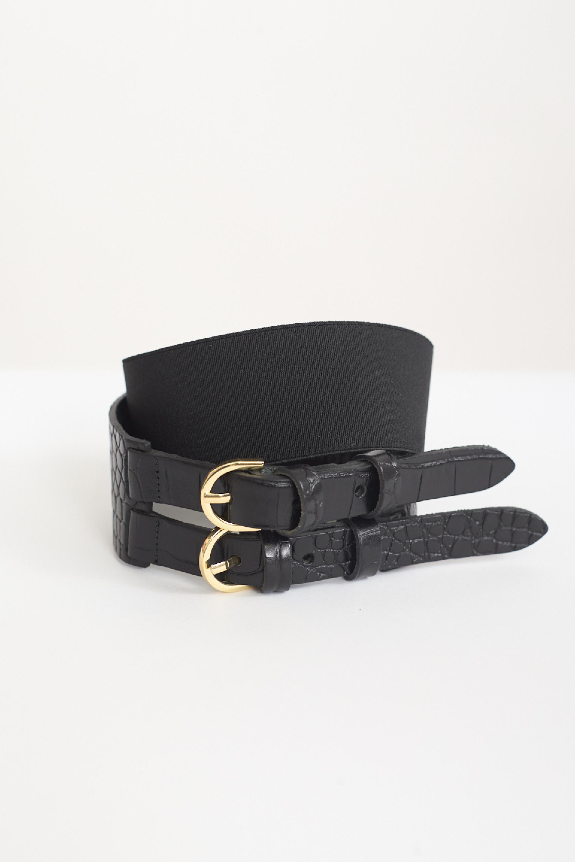 | Cintura in vera pelle con lavorazione effetto coccodrillo e porzione a elastico. Dettaglio di doppia fibbia. | ||