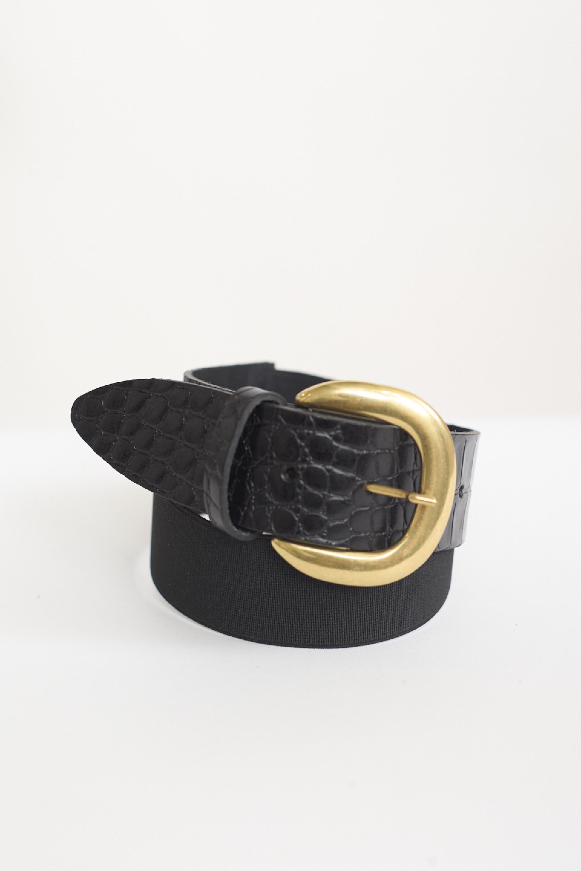 | Cintura in vera pelle con lavorazione effetto coccodrillo e porzione a elastico. Fibbia stondata. | ||