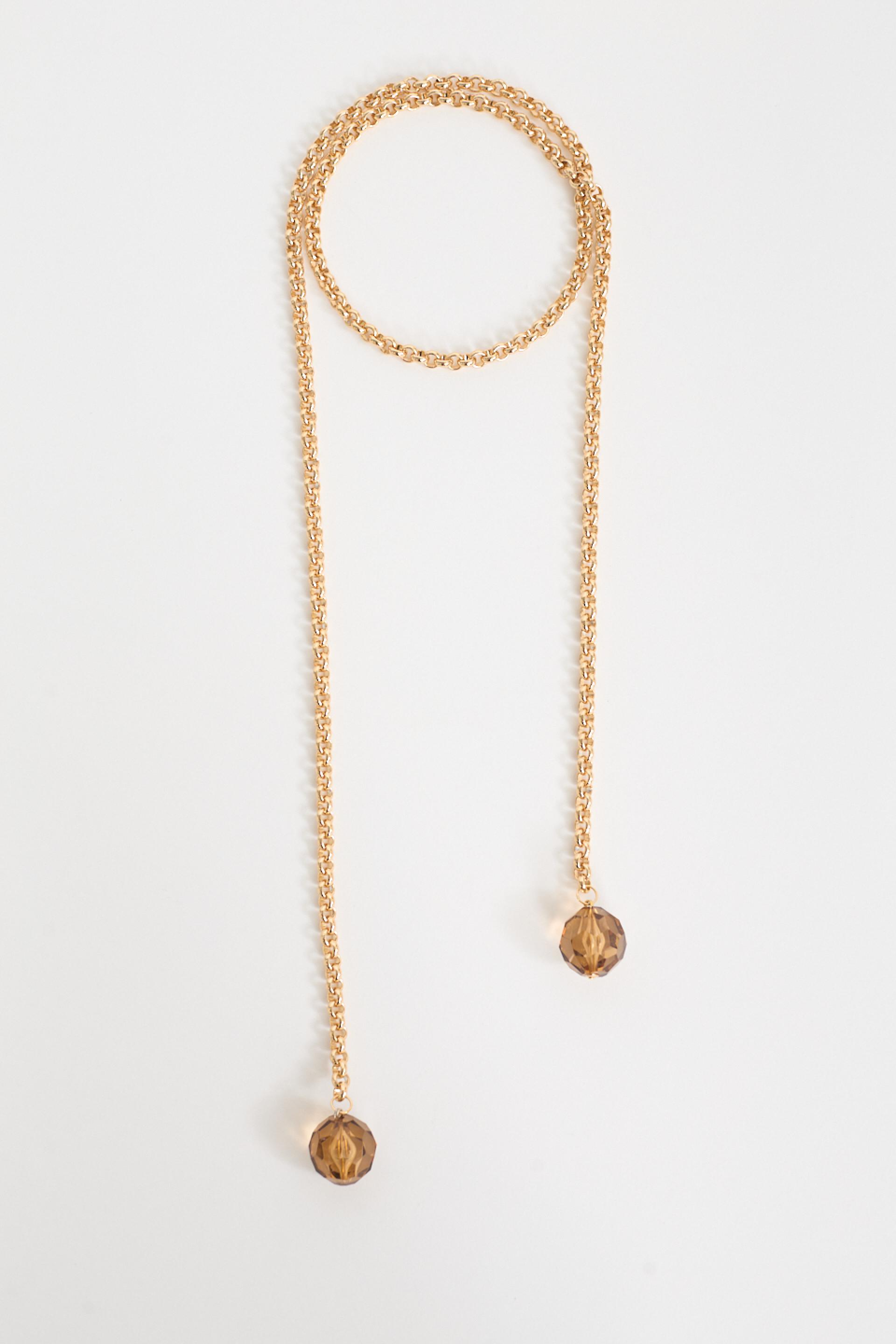 | Collana lunga a catena con due sfere trasparenti in resina. Chiusura tramite nodo. | ||
