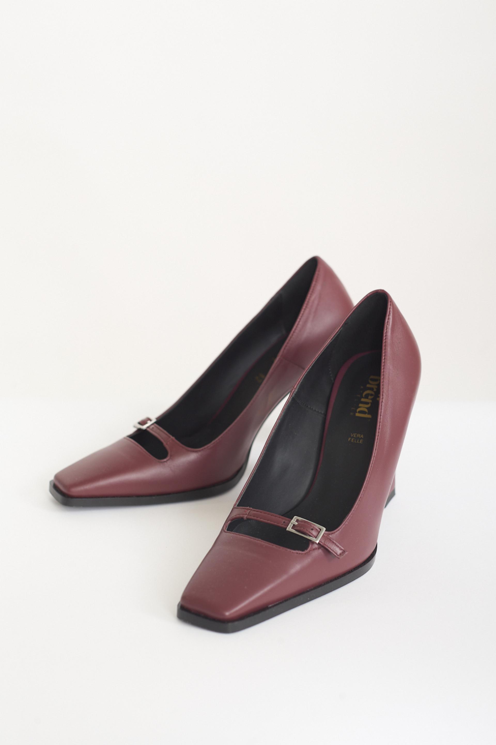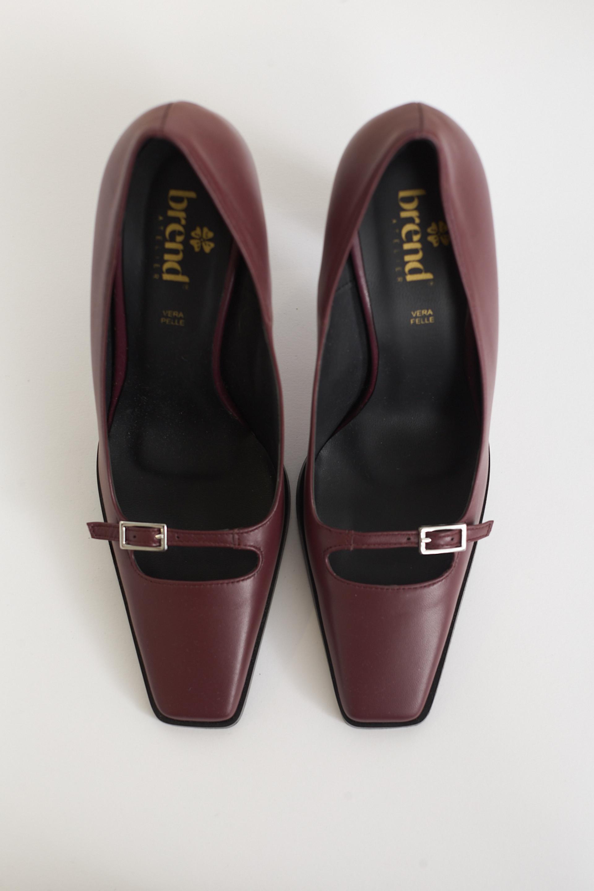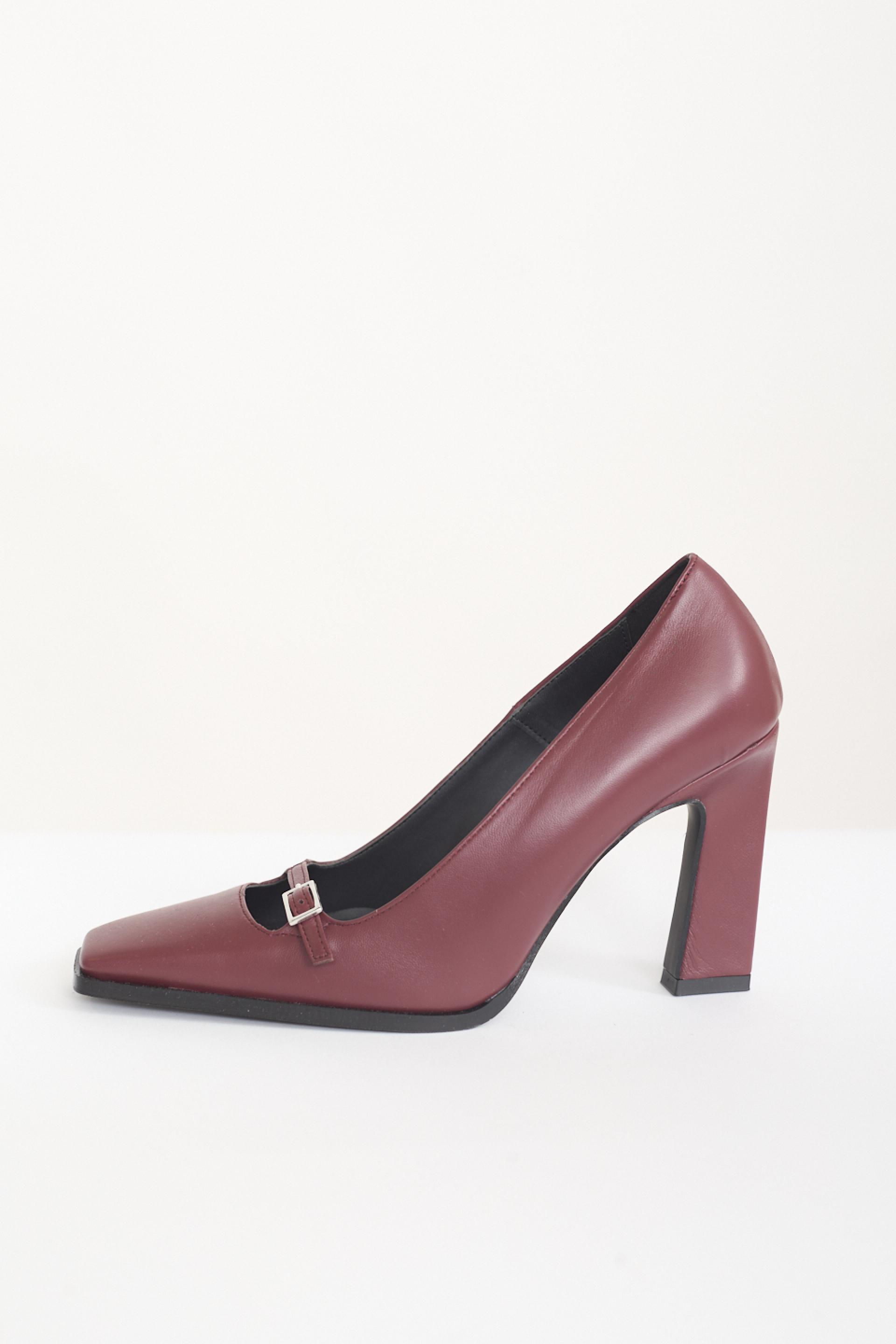 | Dècollettè punta squadrata con fibbia. Tacco rettangolare altezza 10 cm. | ||