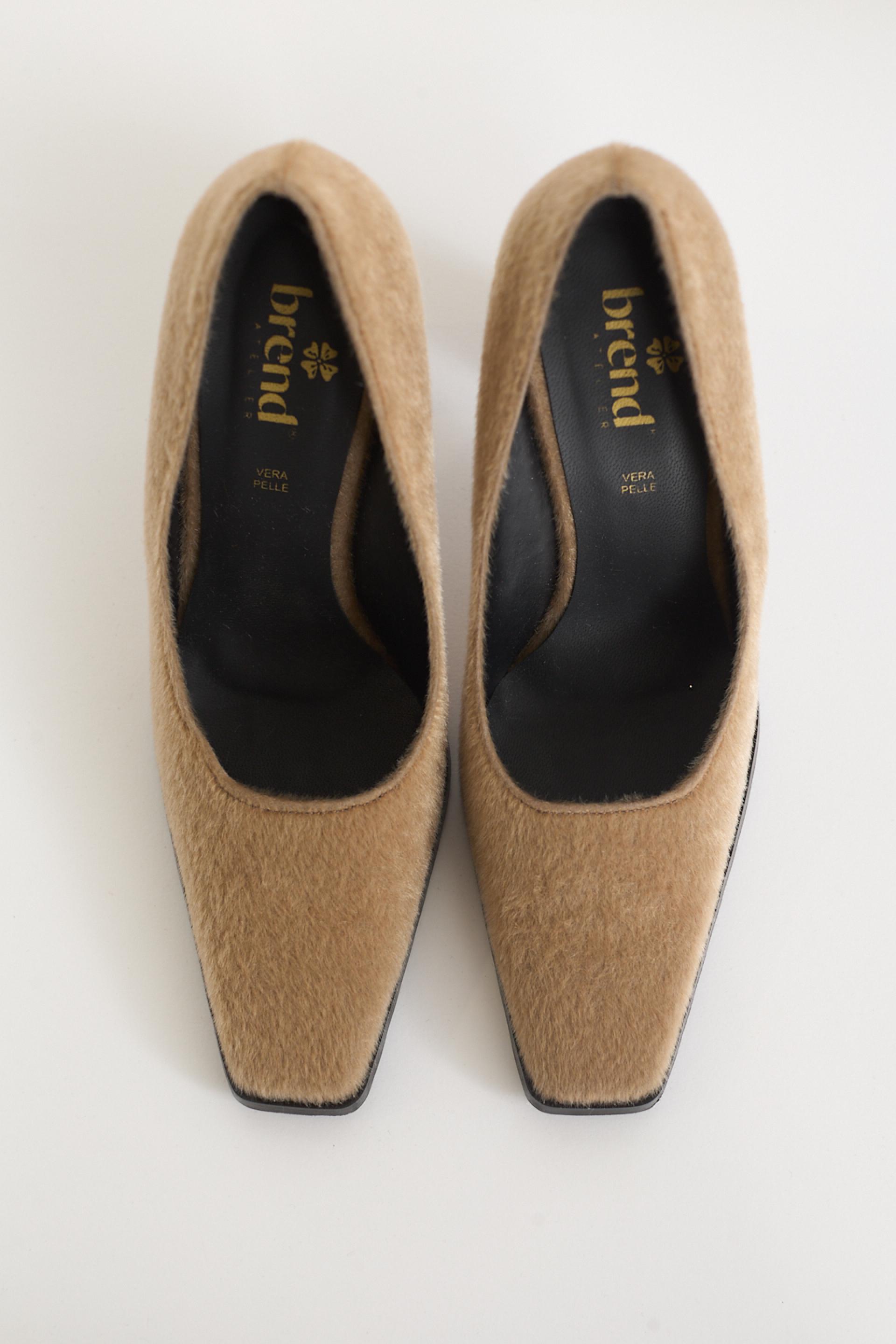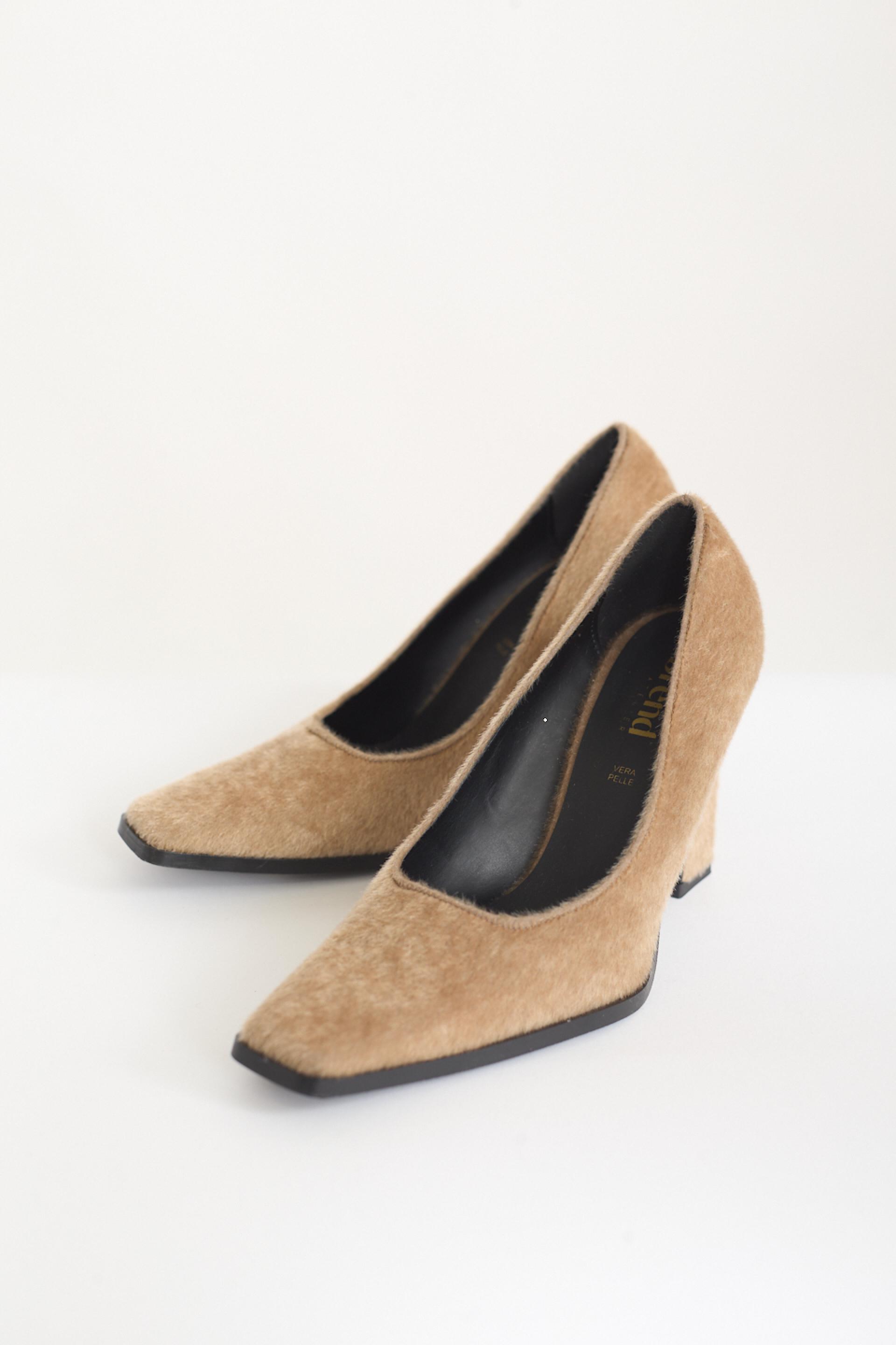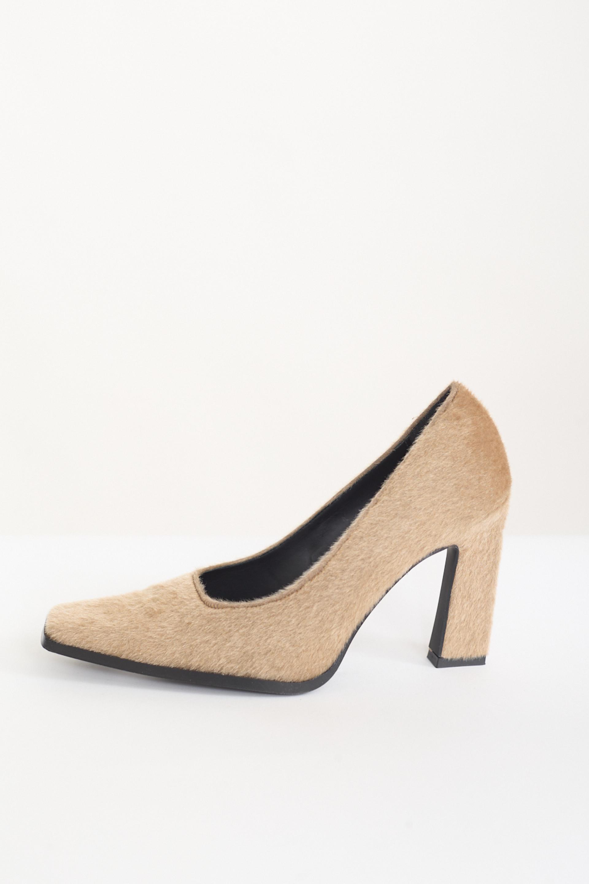 | Dècollettè a punta squadrata effetto cavallino. Tacco rettangolare altezza 10 cm. | ||