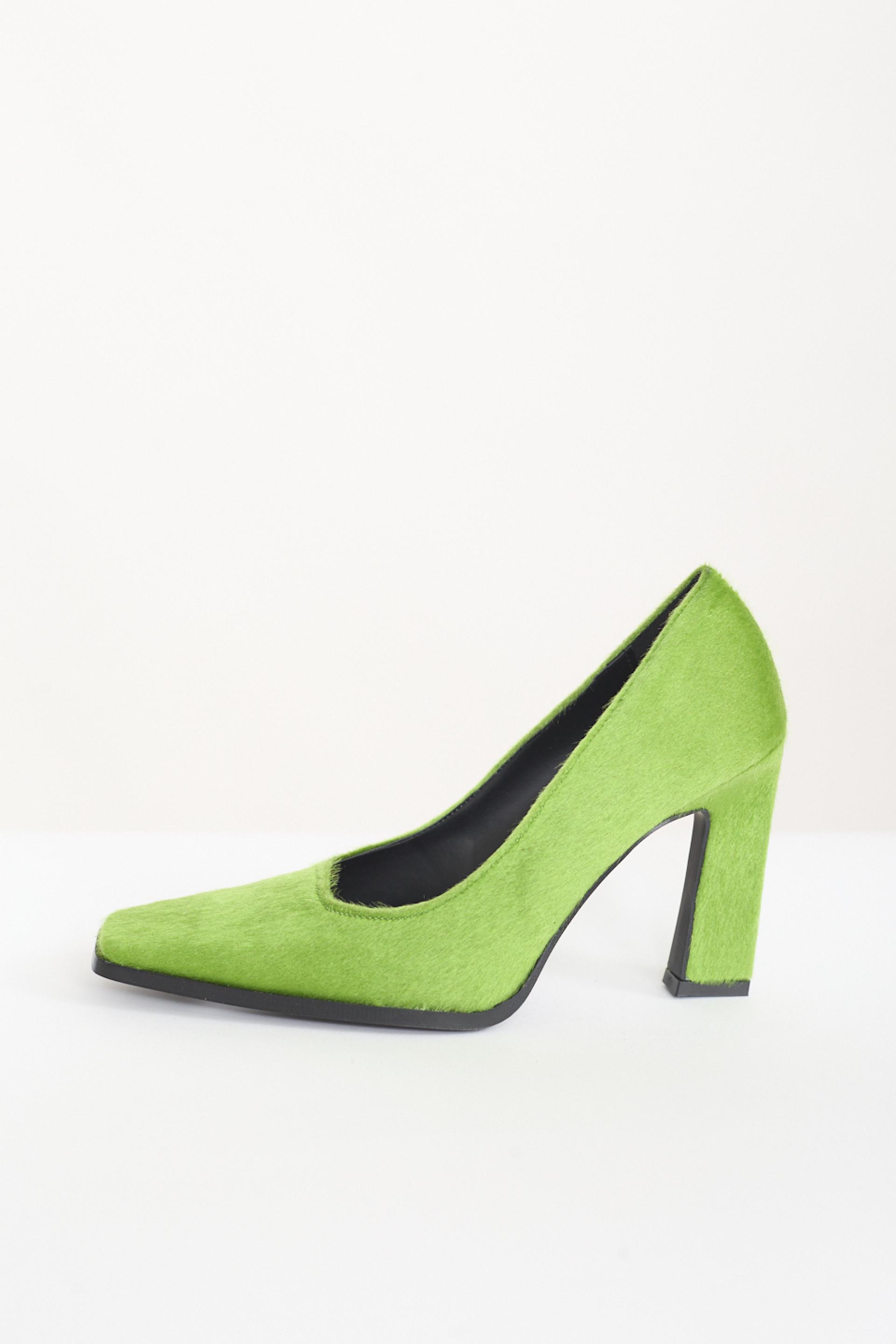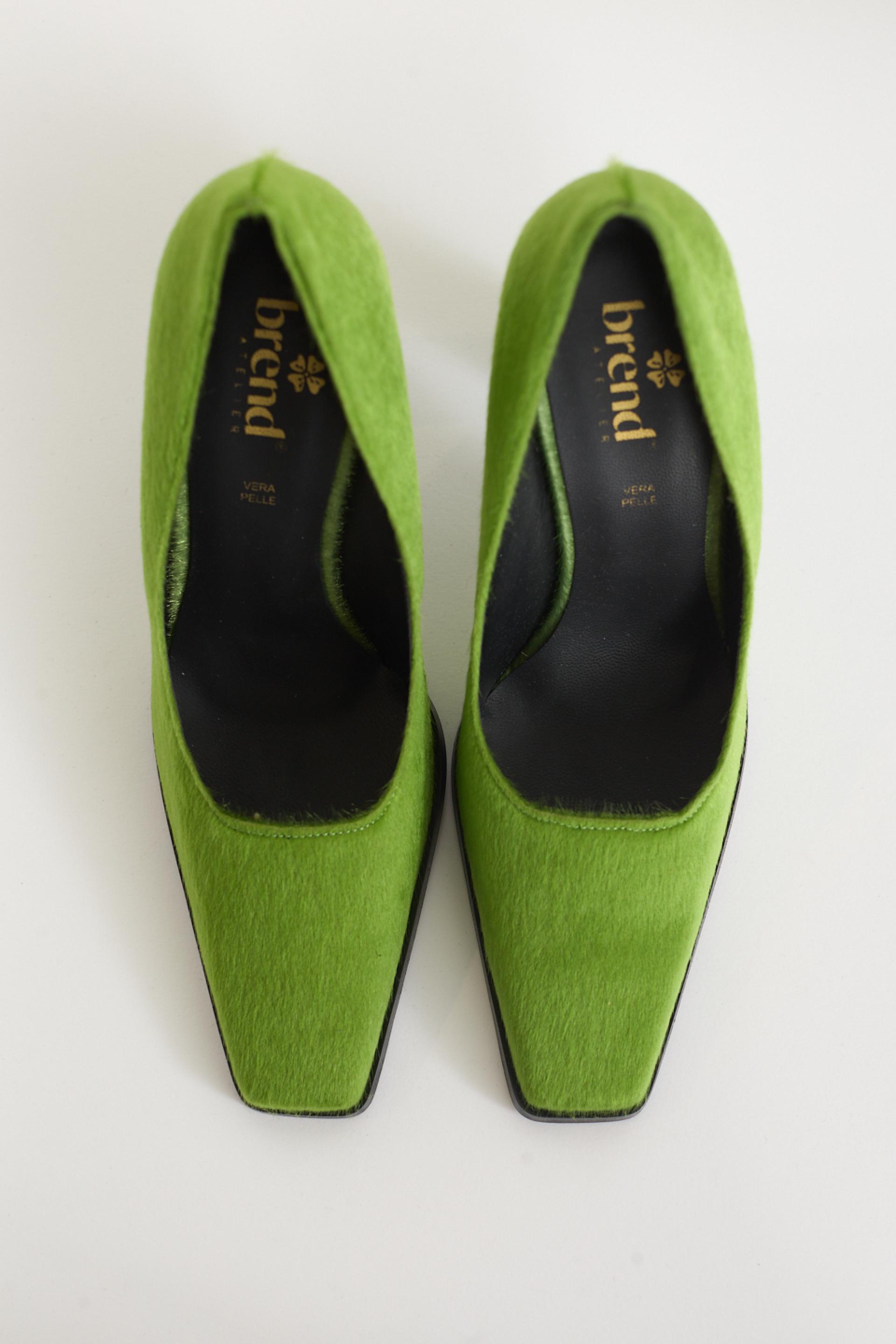 | Dècollettè a punta squadrata effetto cavallino. Tacco rettangolare altezza 10 cm. | ||