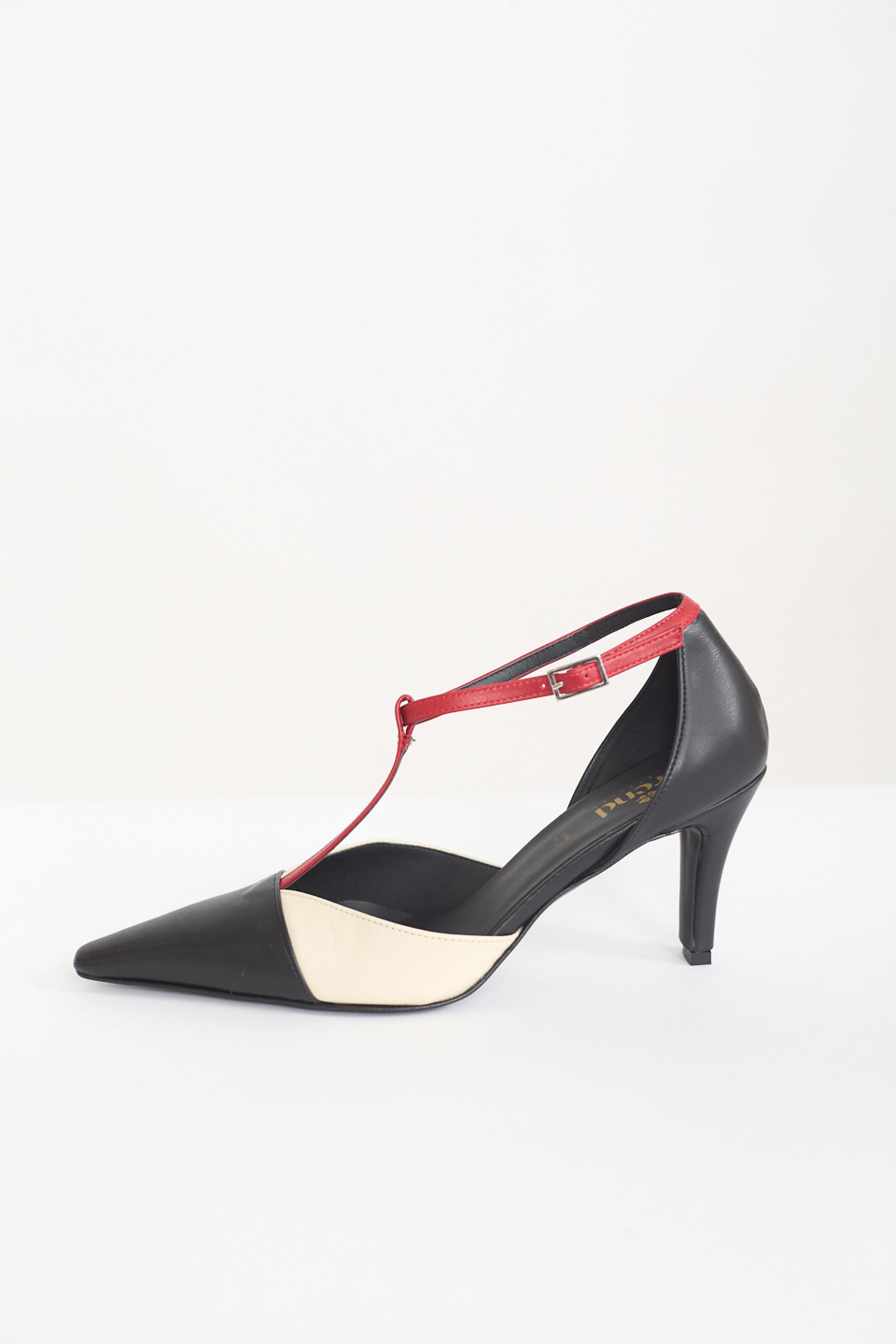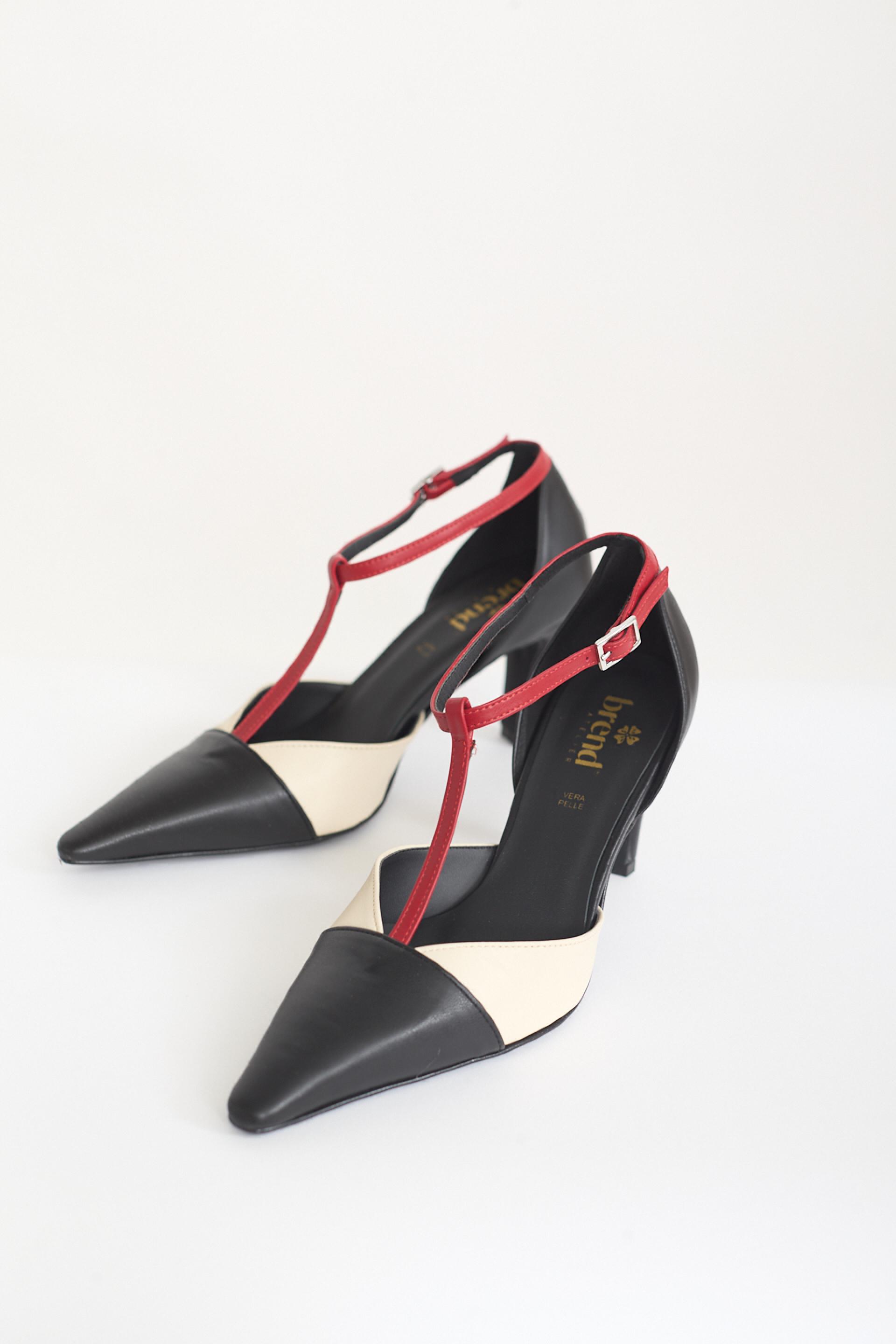 | Dècolletè aperte a punta con cinturino. e fibbia. Tacco altezza 8 cm. | ||