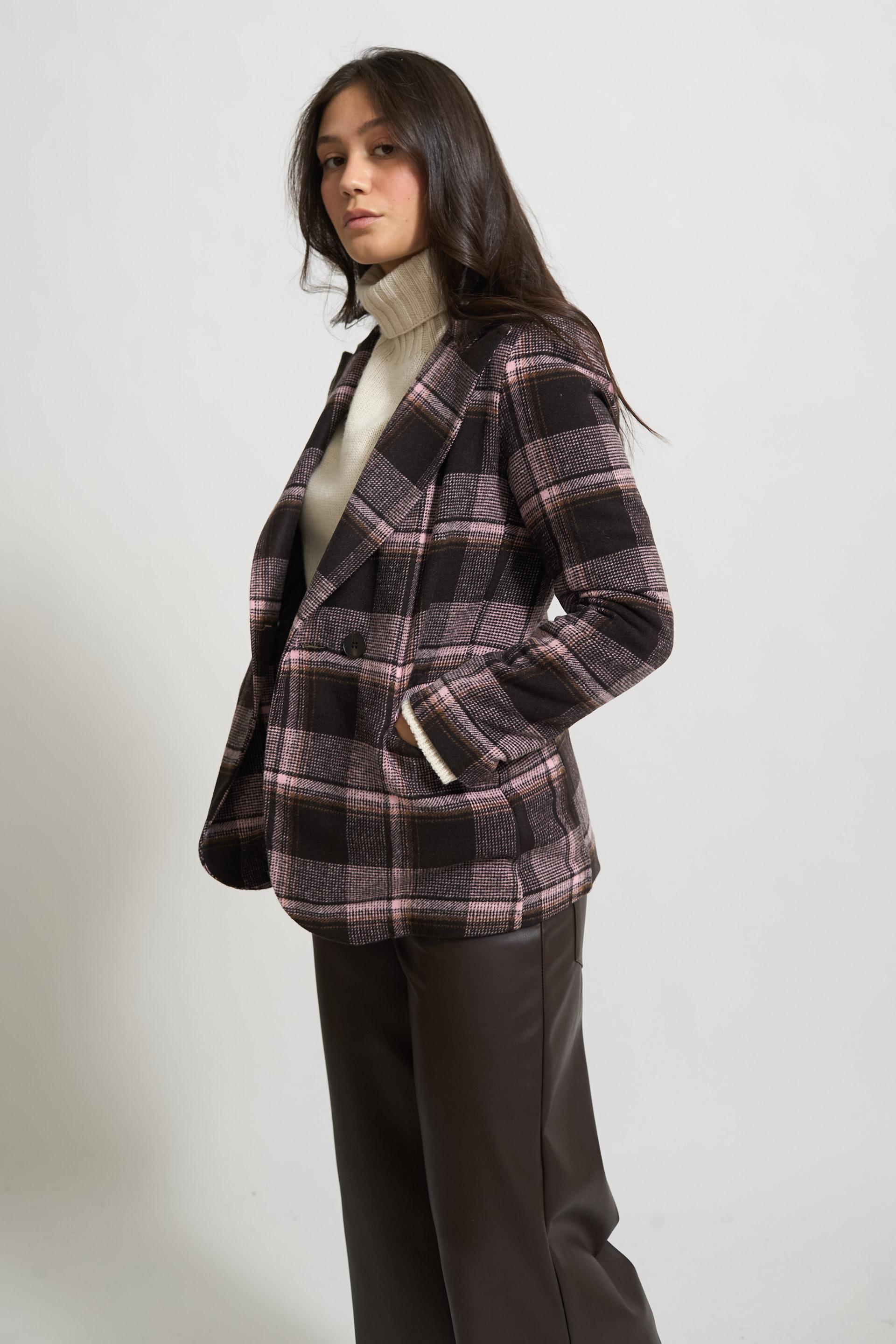 | Giacca doppio petto in tessuto check con tasche con pattine. Fodera interna. | ||