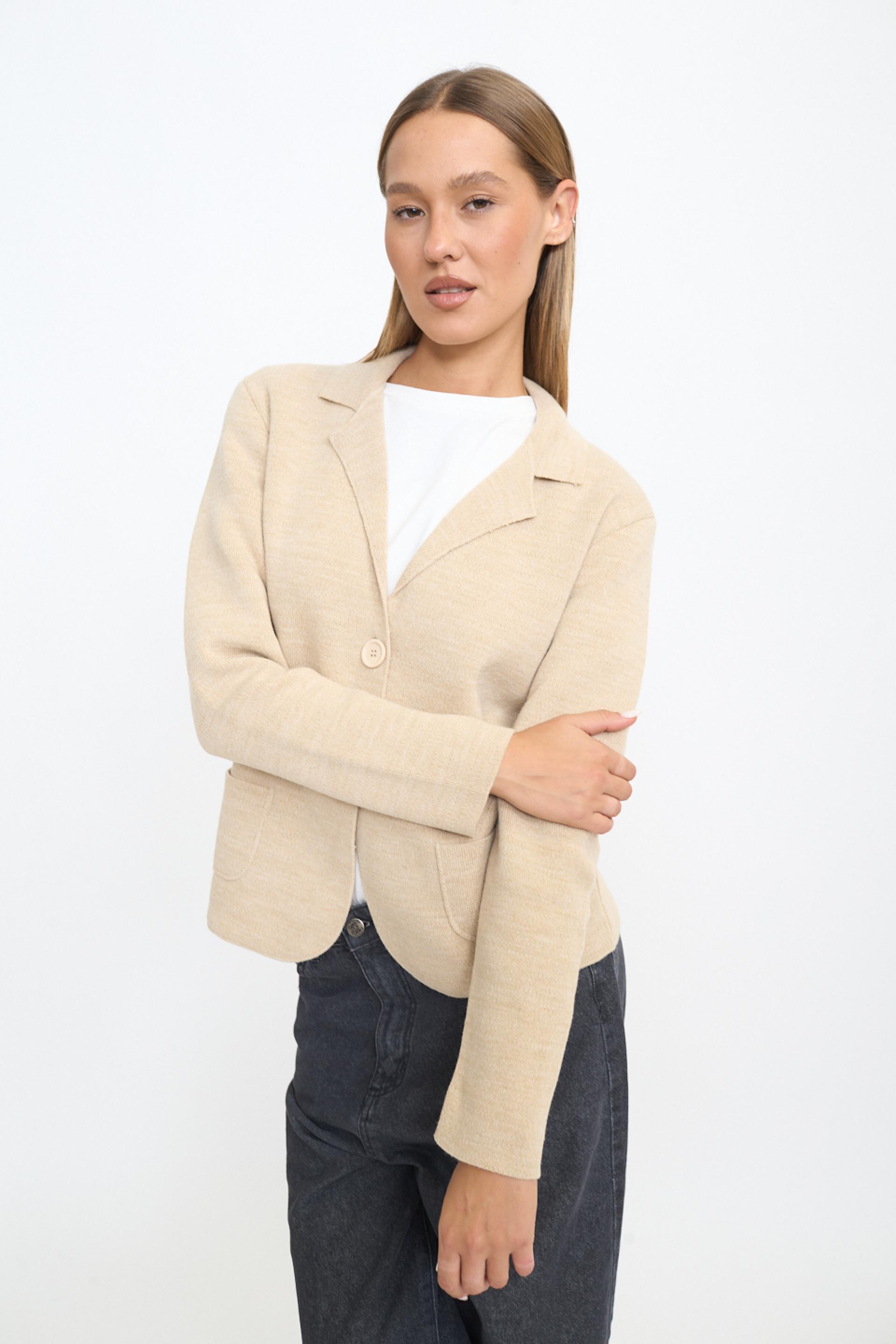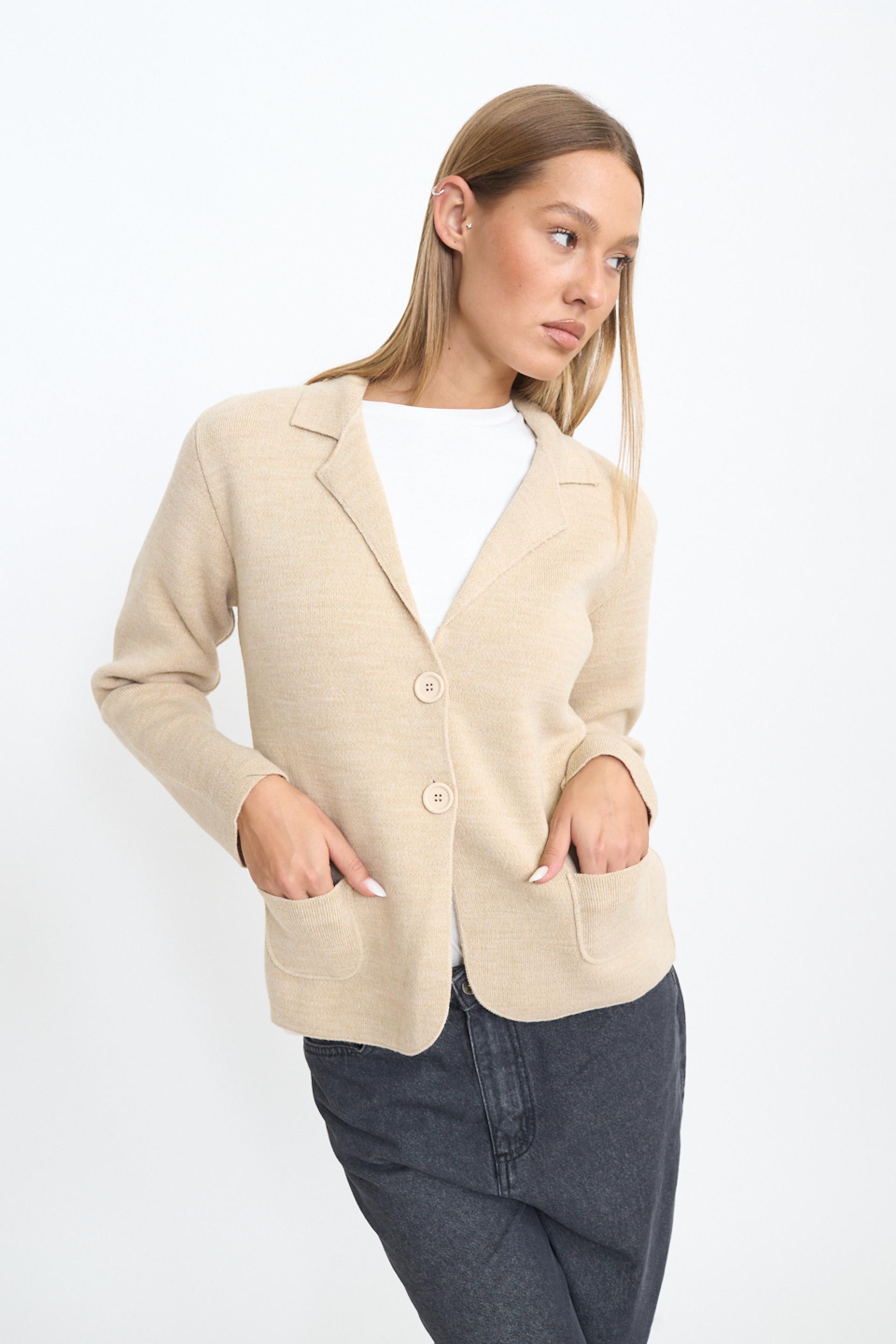| Giacca in maglia tinta unita con tasche applicate. Chiusura tramite 2 bottoni. | ||