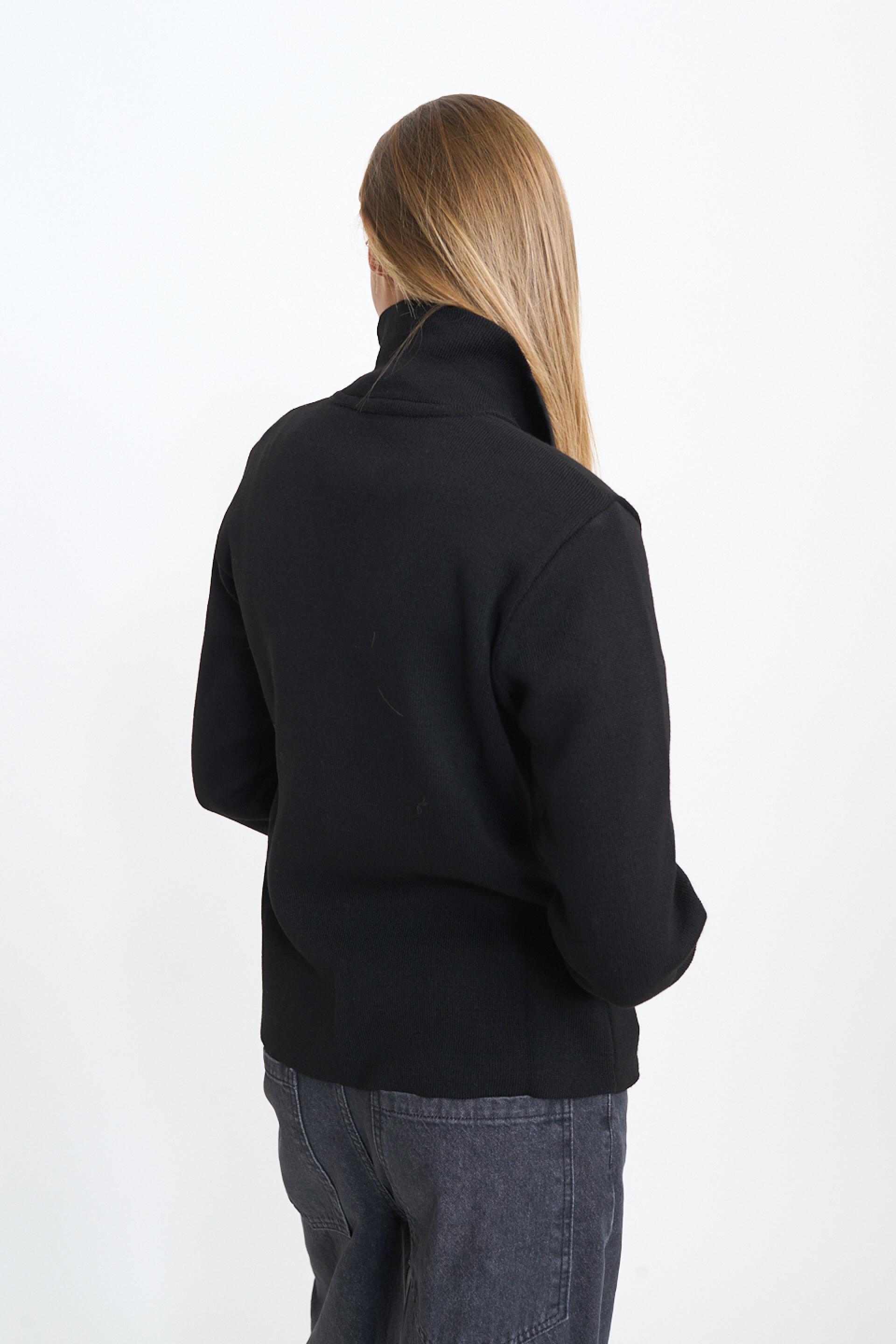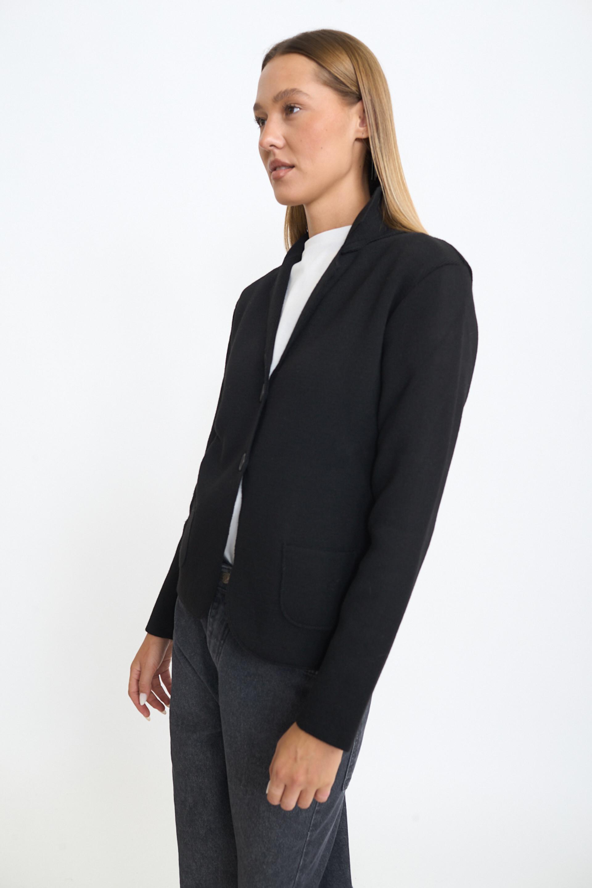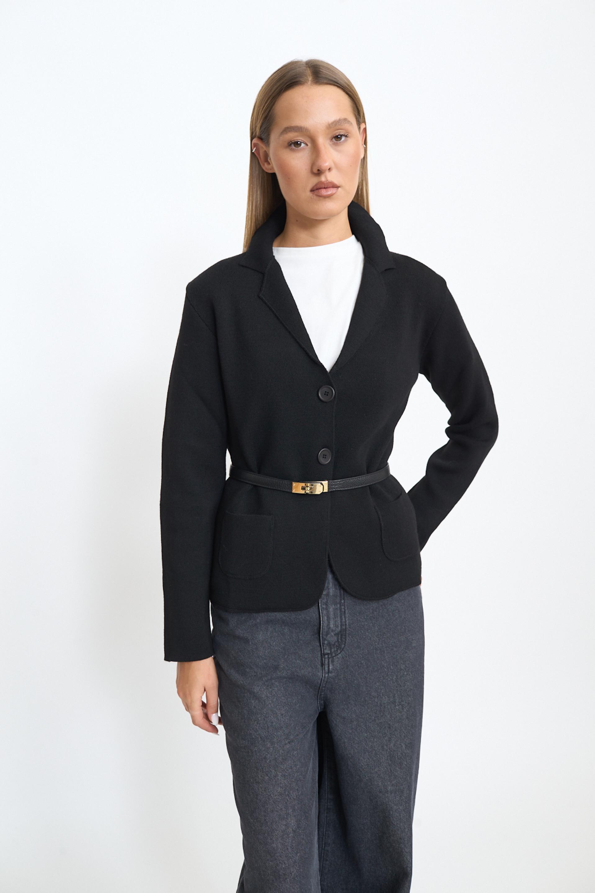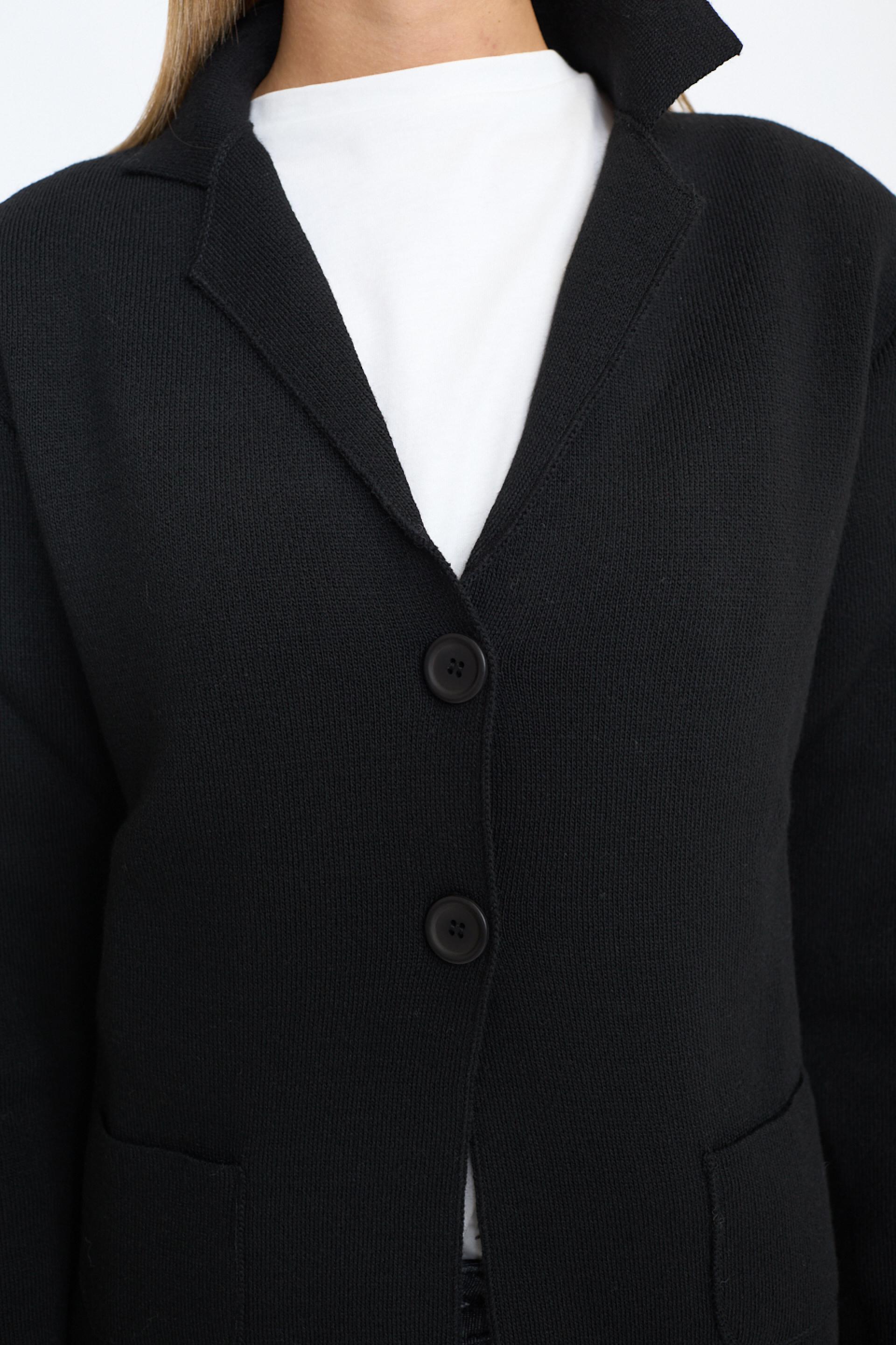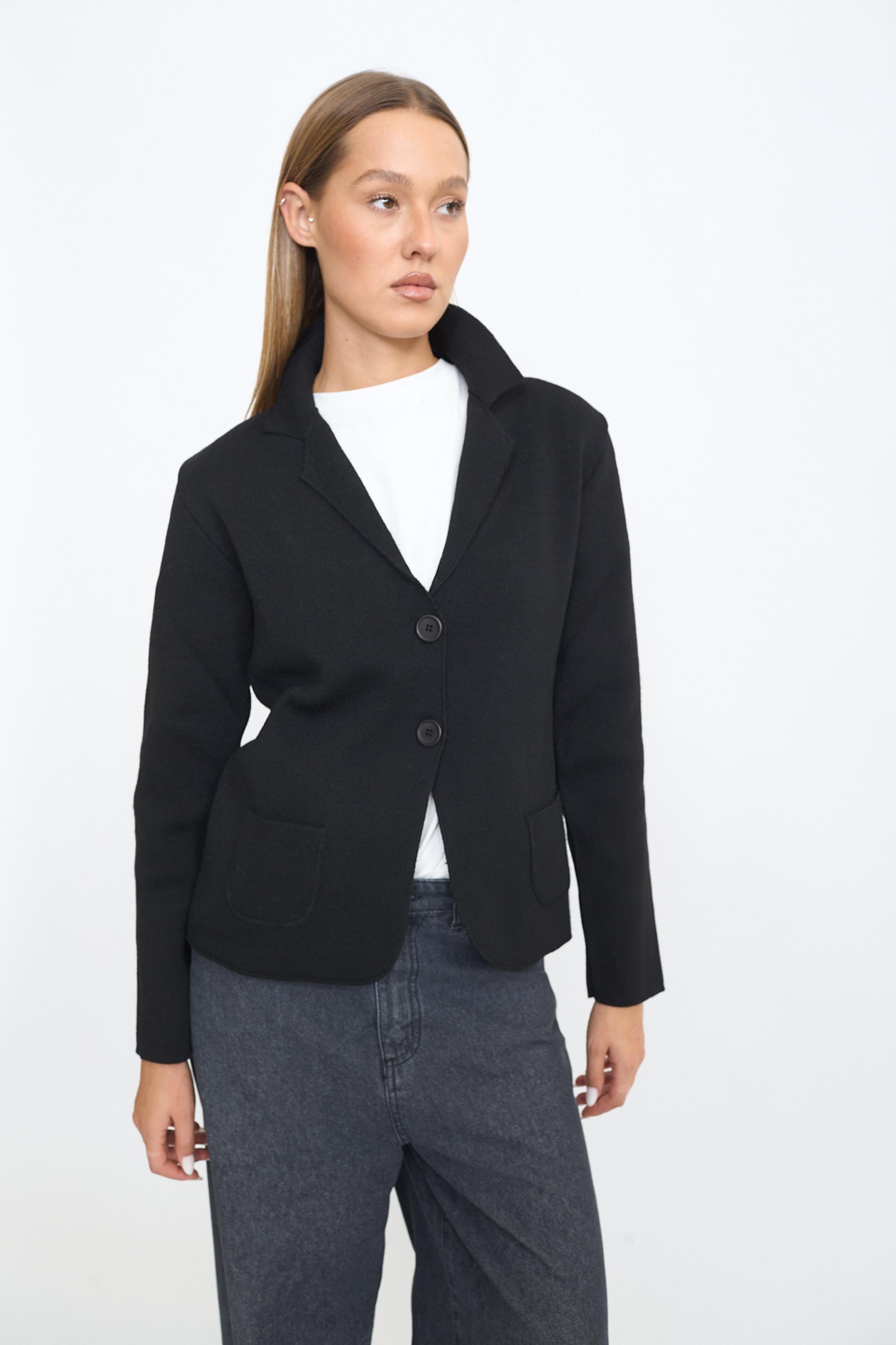 | Giacca in maglia tinta unita con tasche applicate. Chiusura tramite 2 bottoni. | ||