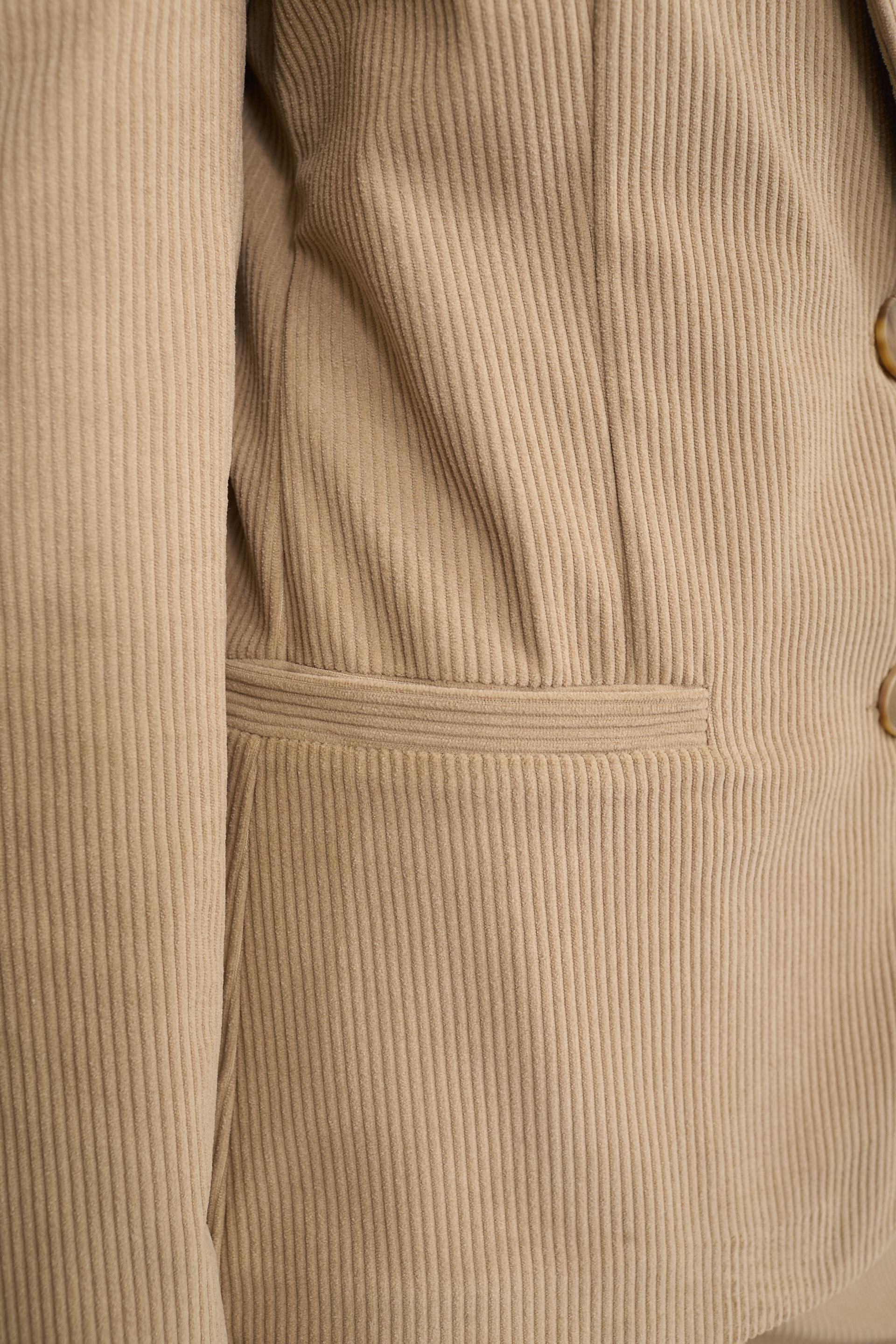 | Giacca collo revers con spalline imbottite in velluto. Finte tasche a filetto e fodera interna tono su tono. Chiusura tramite 2 bottoni. | ||