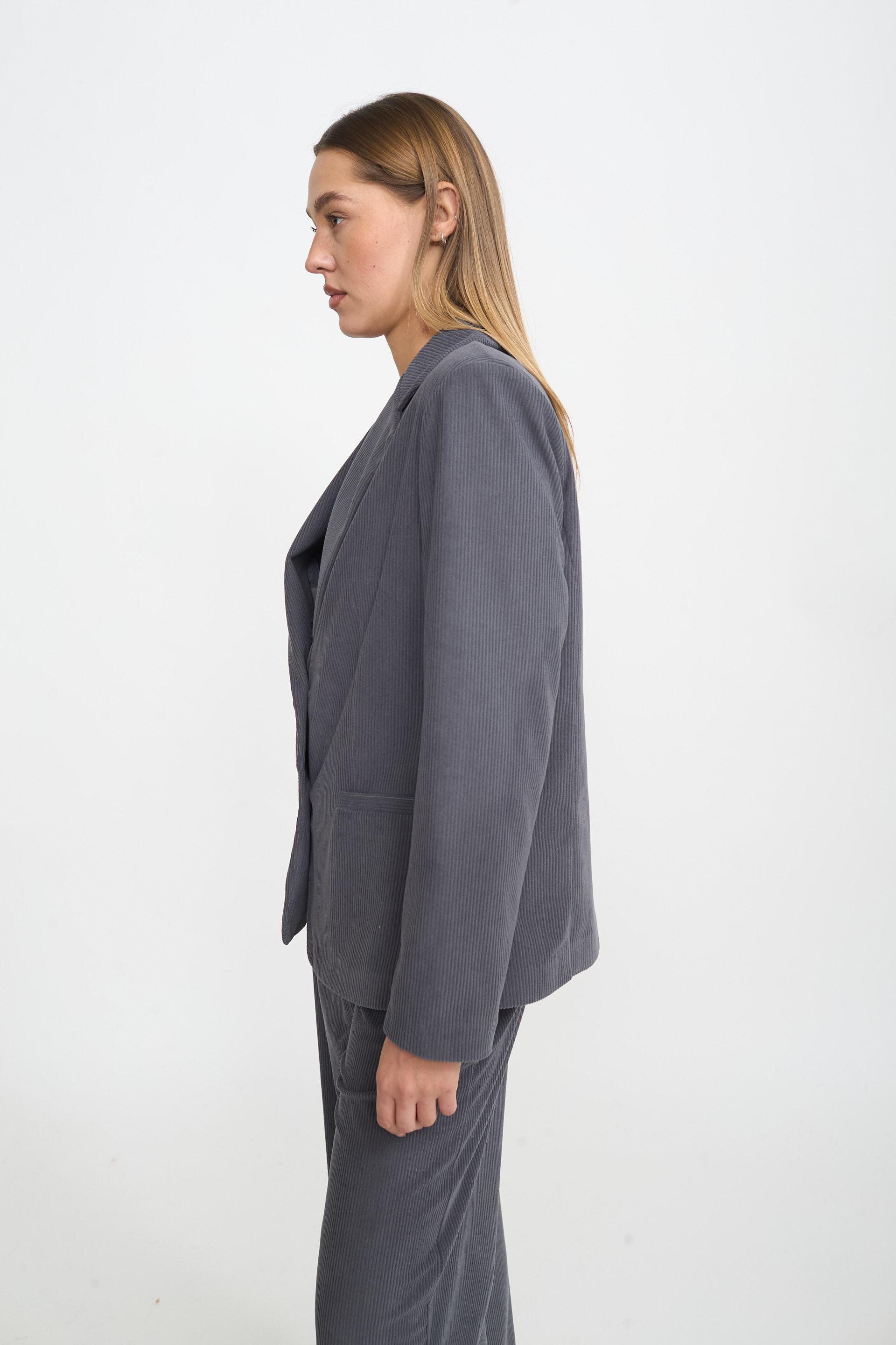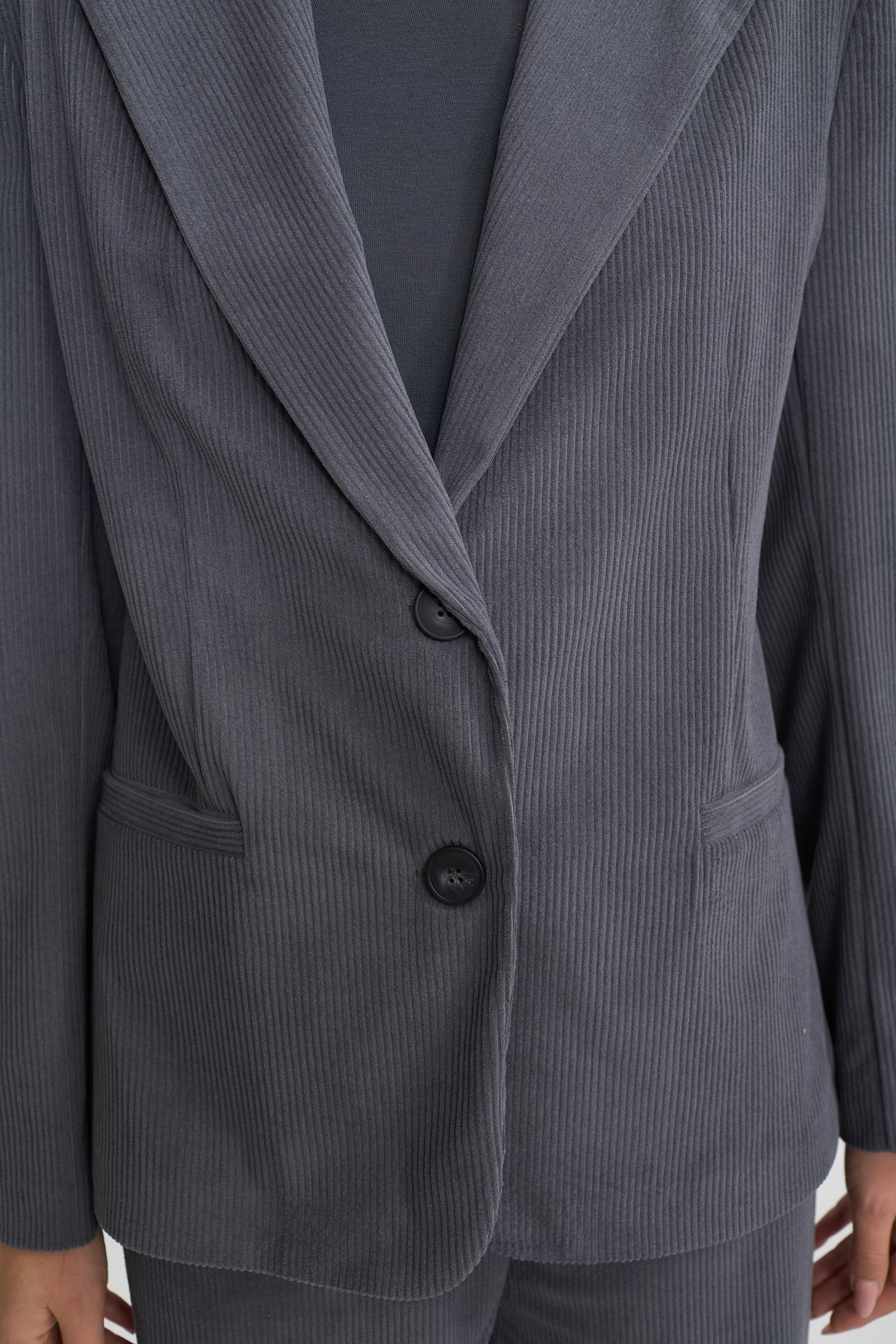 | Giacca collo revers con spalline imbottite in velluto. Finte tasche a filetto e fodera interna tono su tono. Chiusura tramite 2 bottoni. | ||