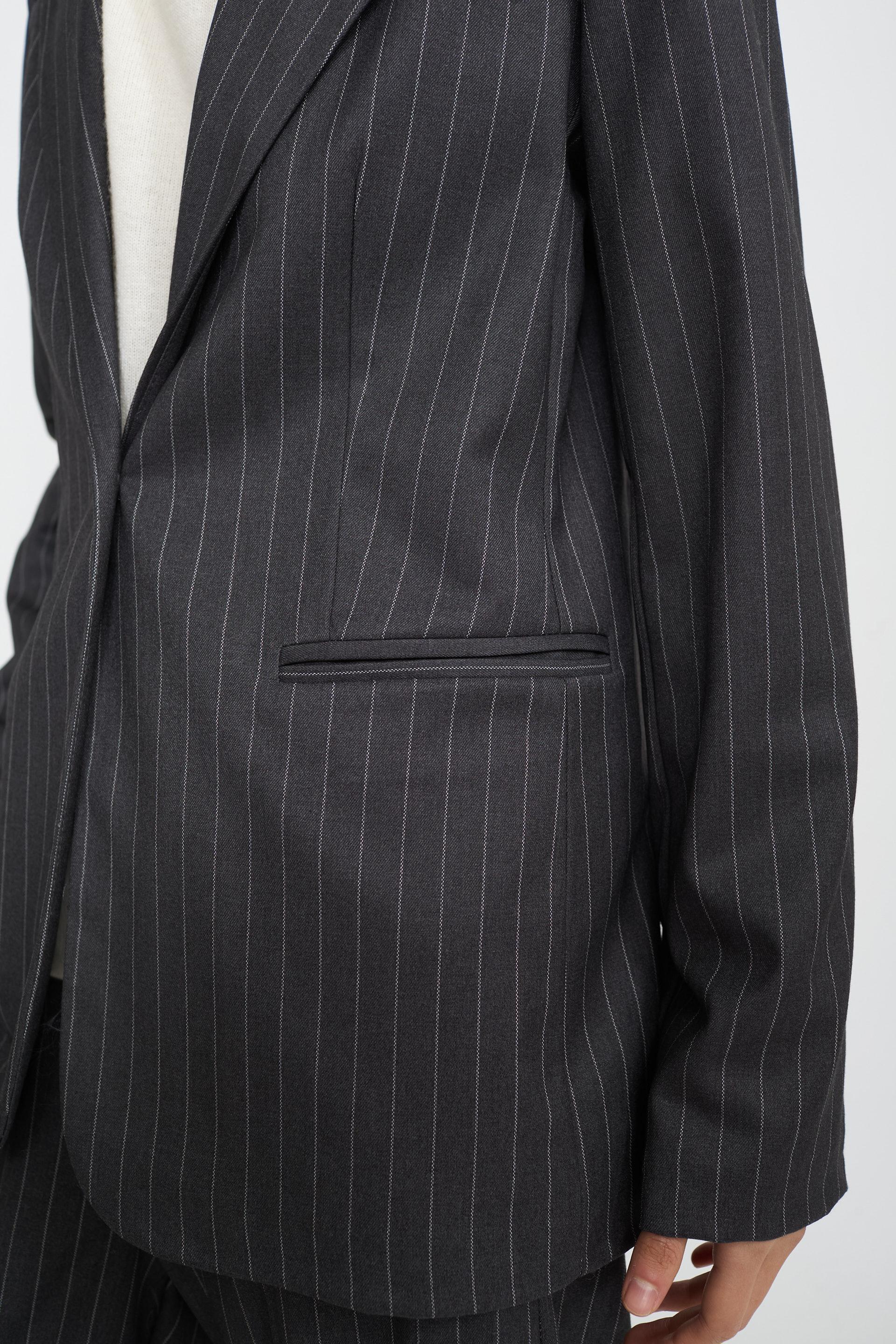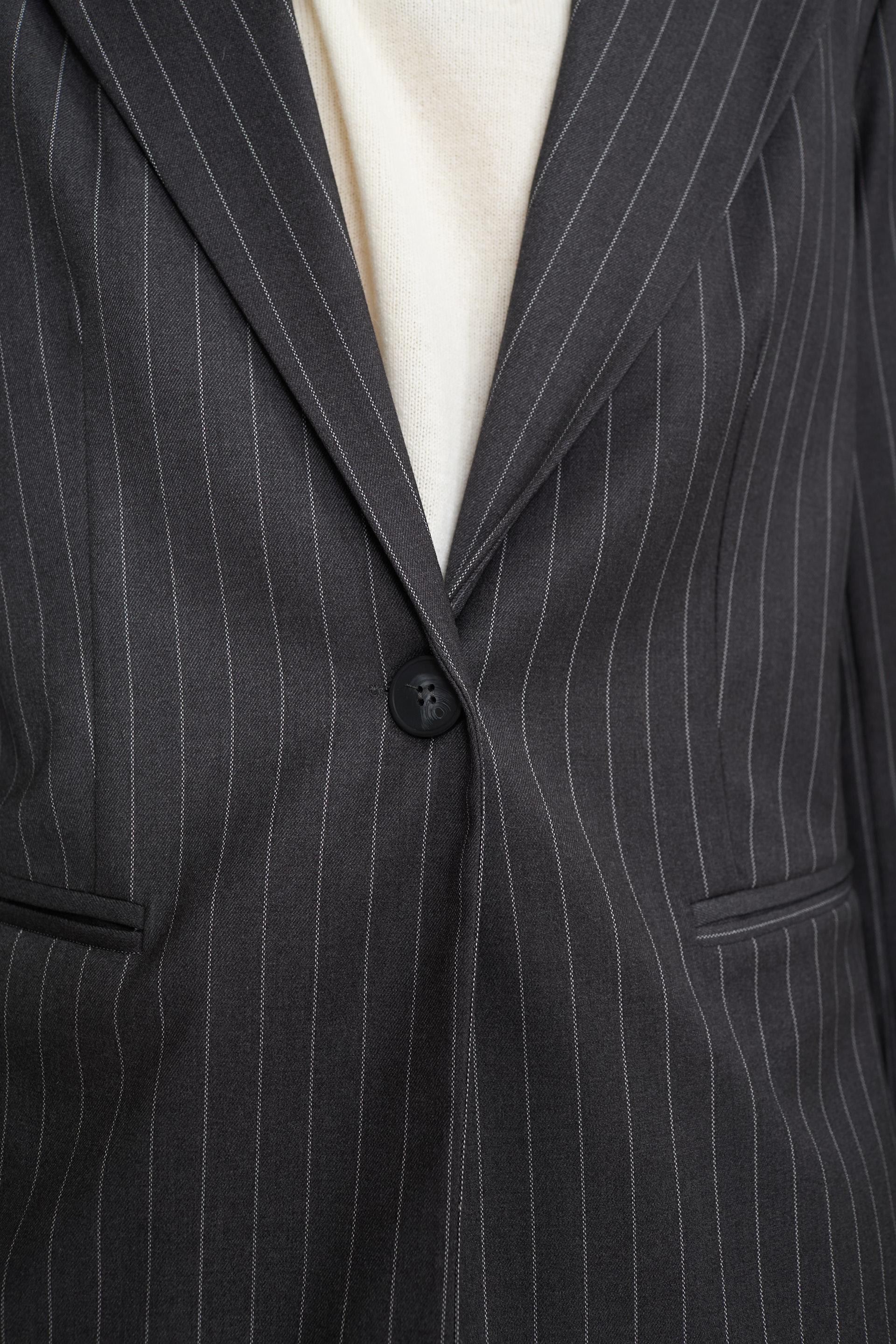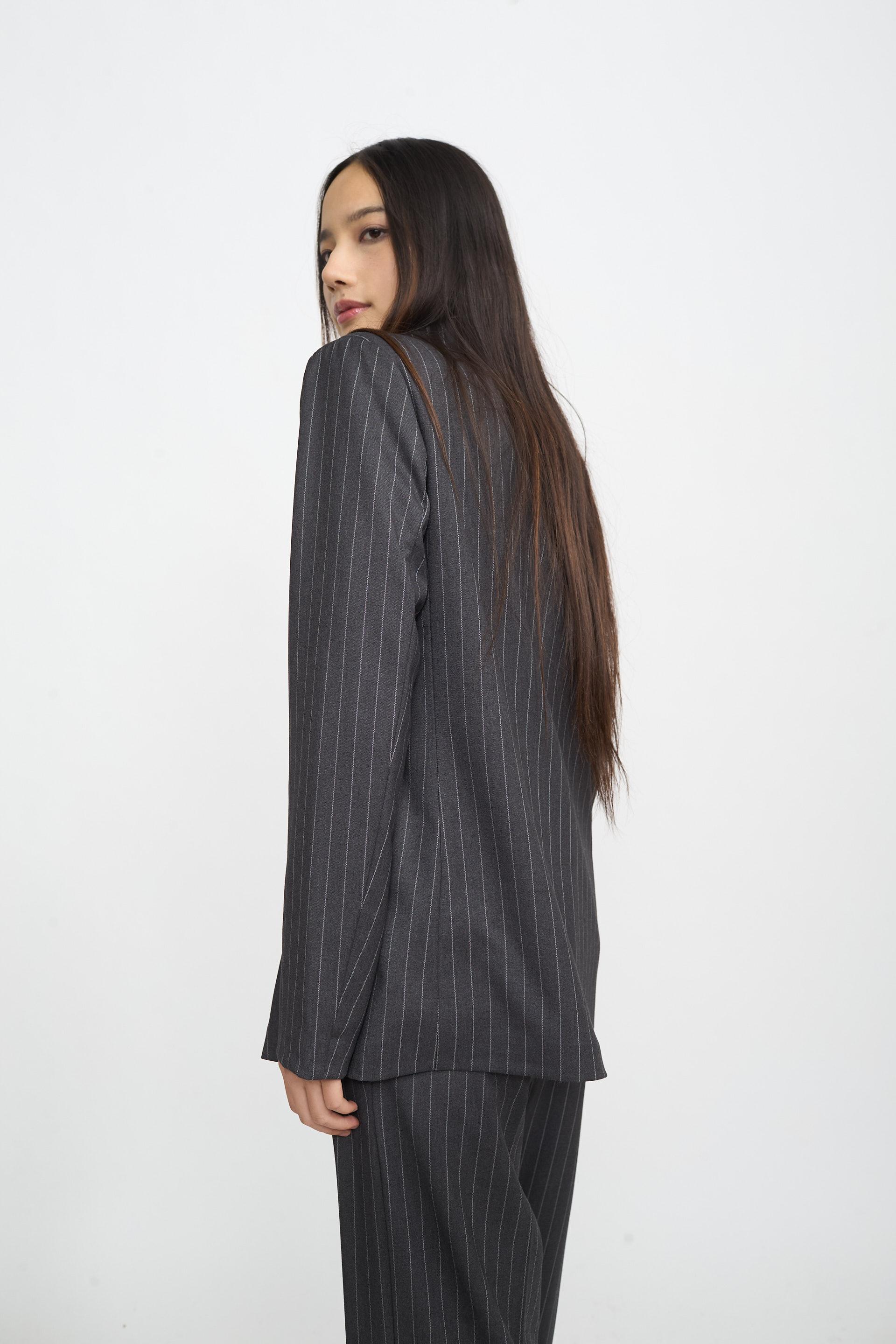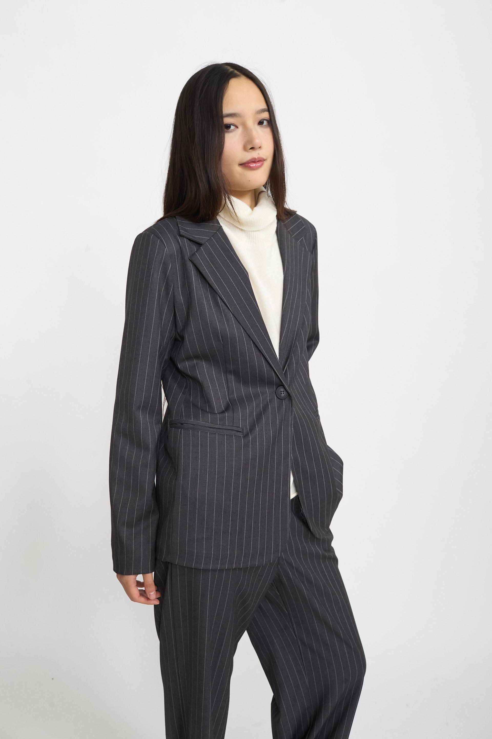 | Giacca con collo revers in tessuto gessato. Spalline imbottite e finte tasche a filetto. Fodera interna tono su tono, chiusura tramite 1 bottone. | ||