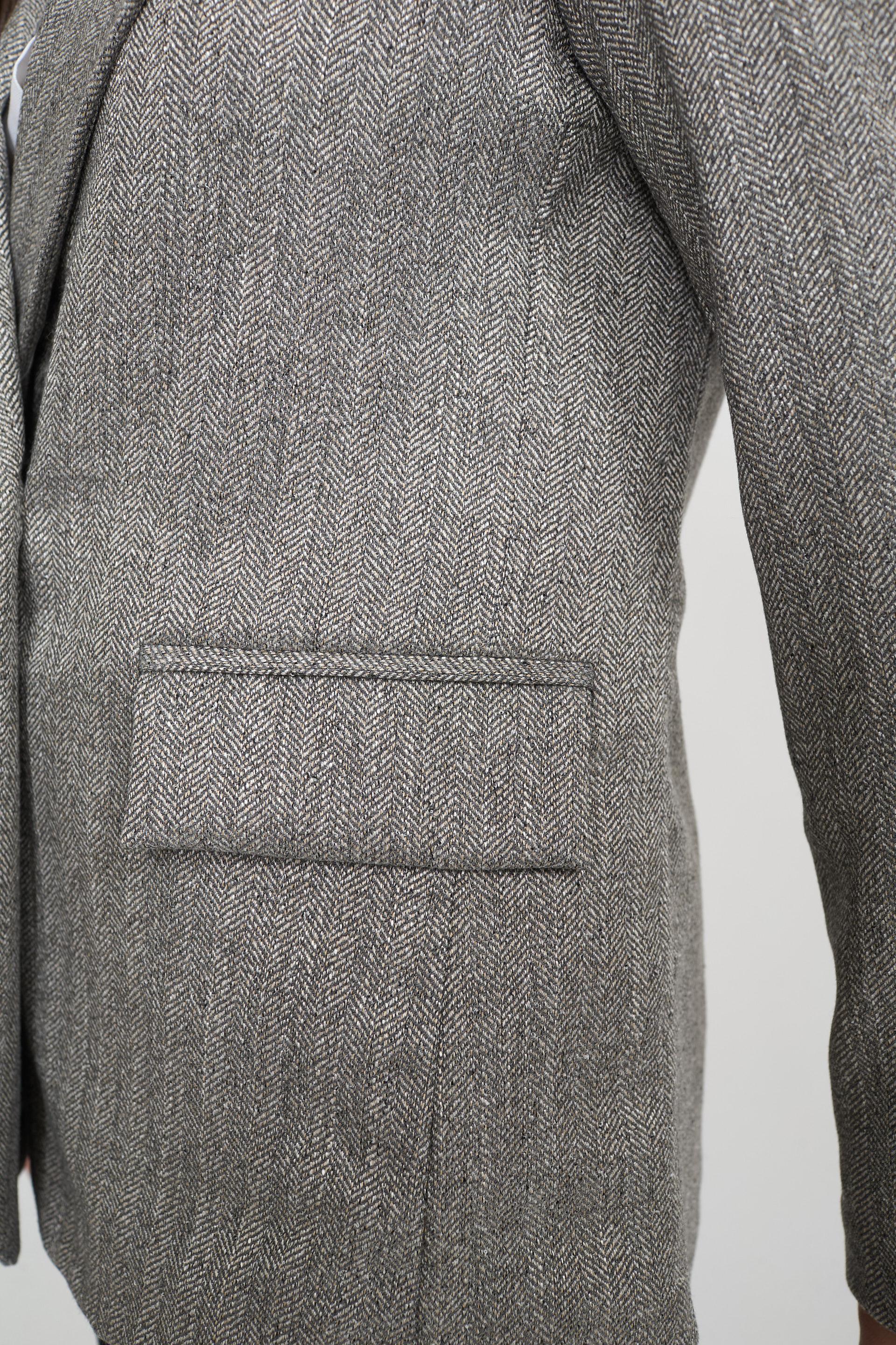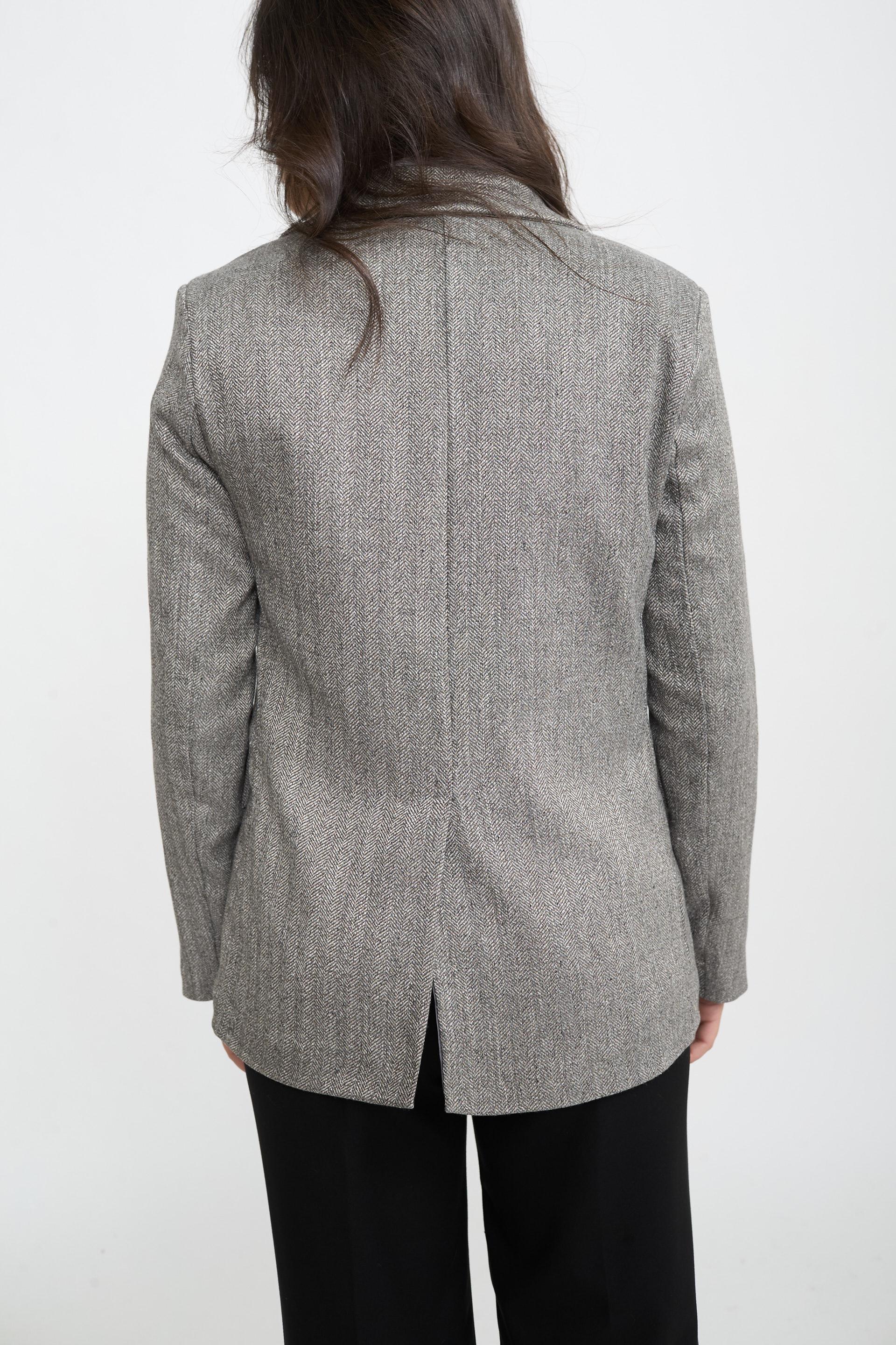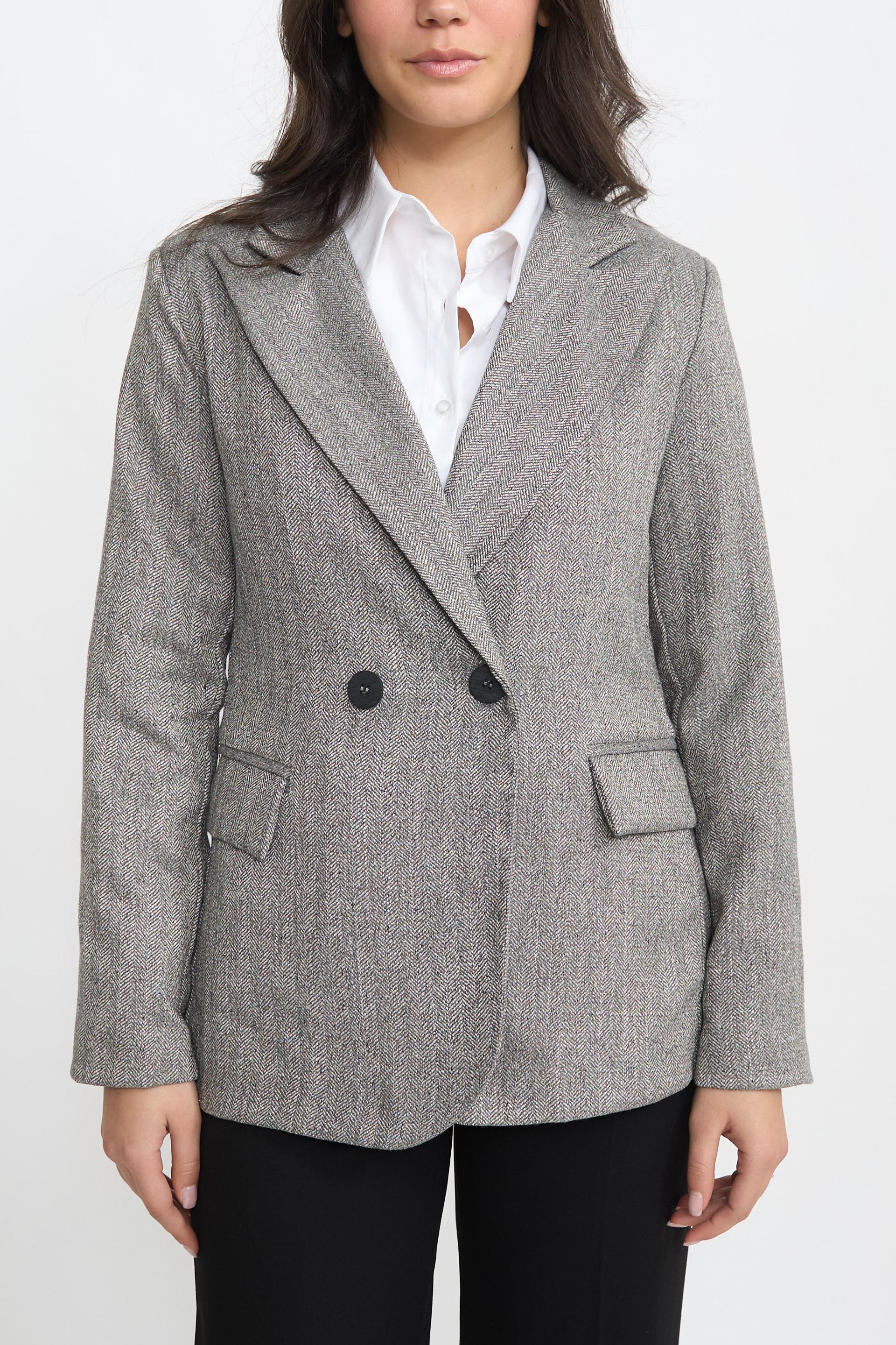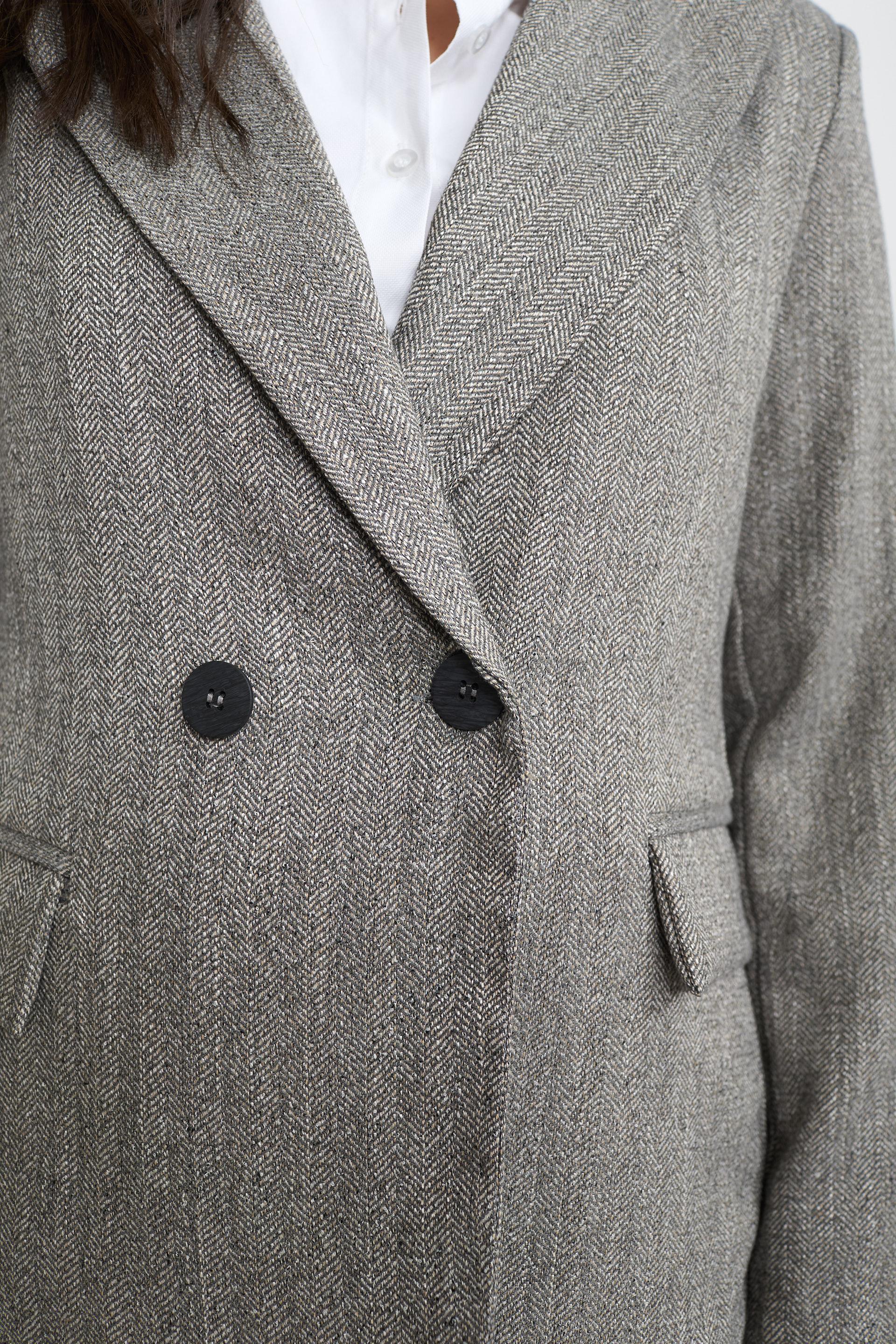 | Giacca collo revers doppio petto con spacco dietro. Tasche a filetto con pattine e spalline imbottite. Fodera interna. | ||