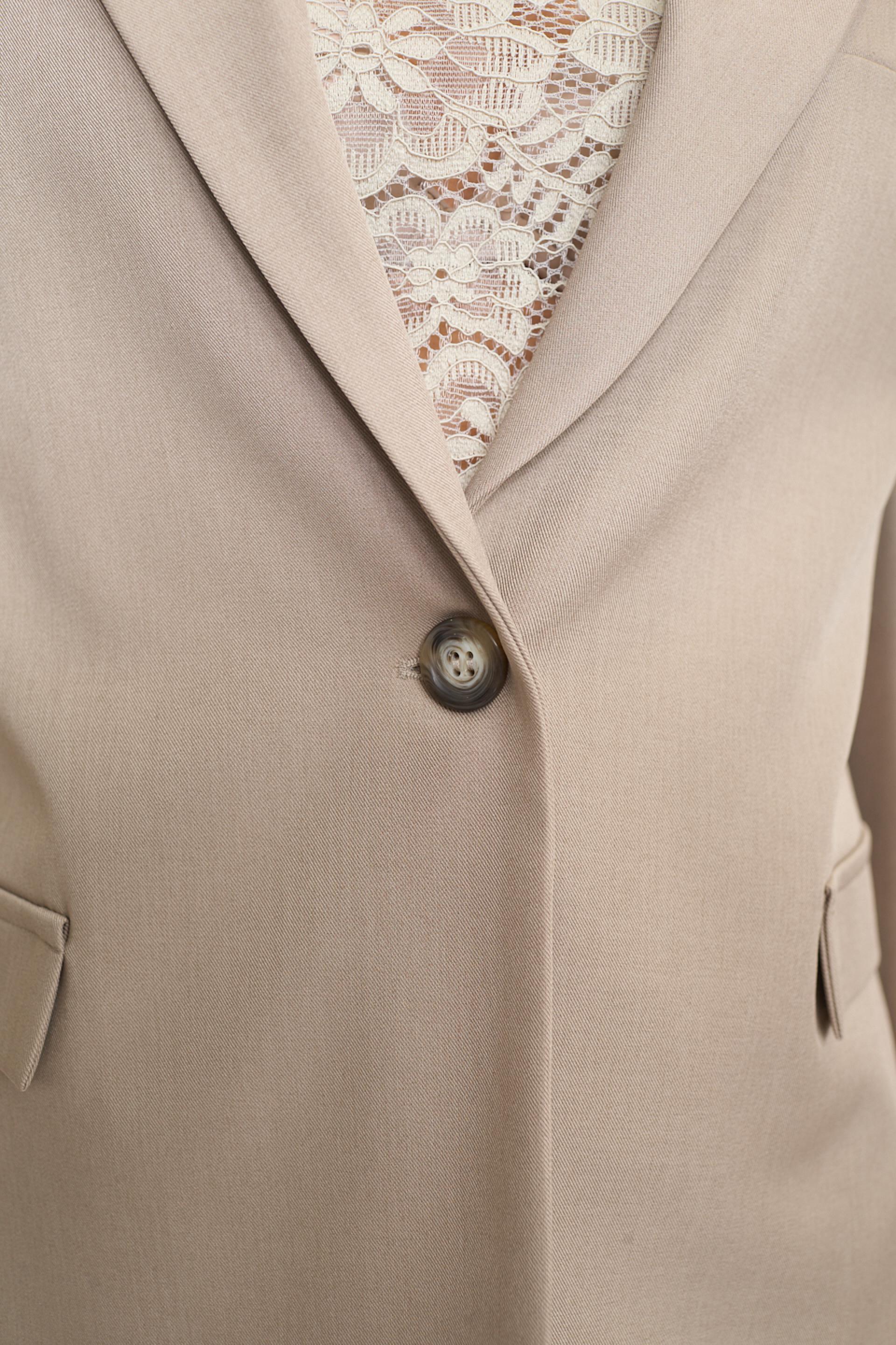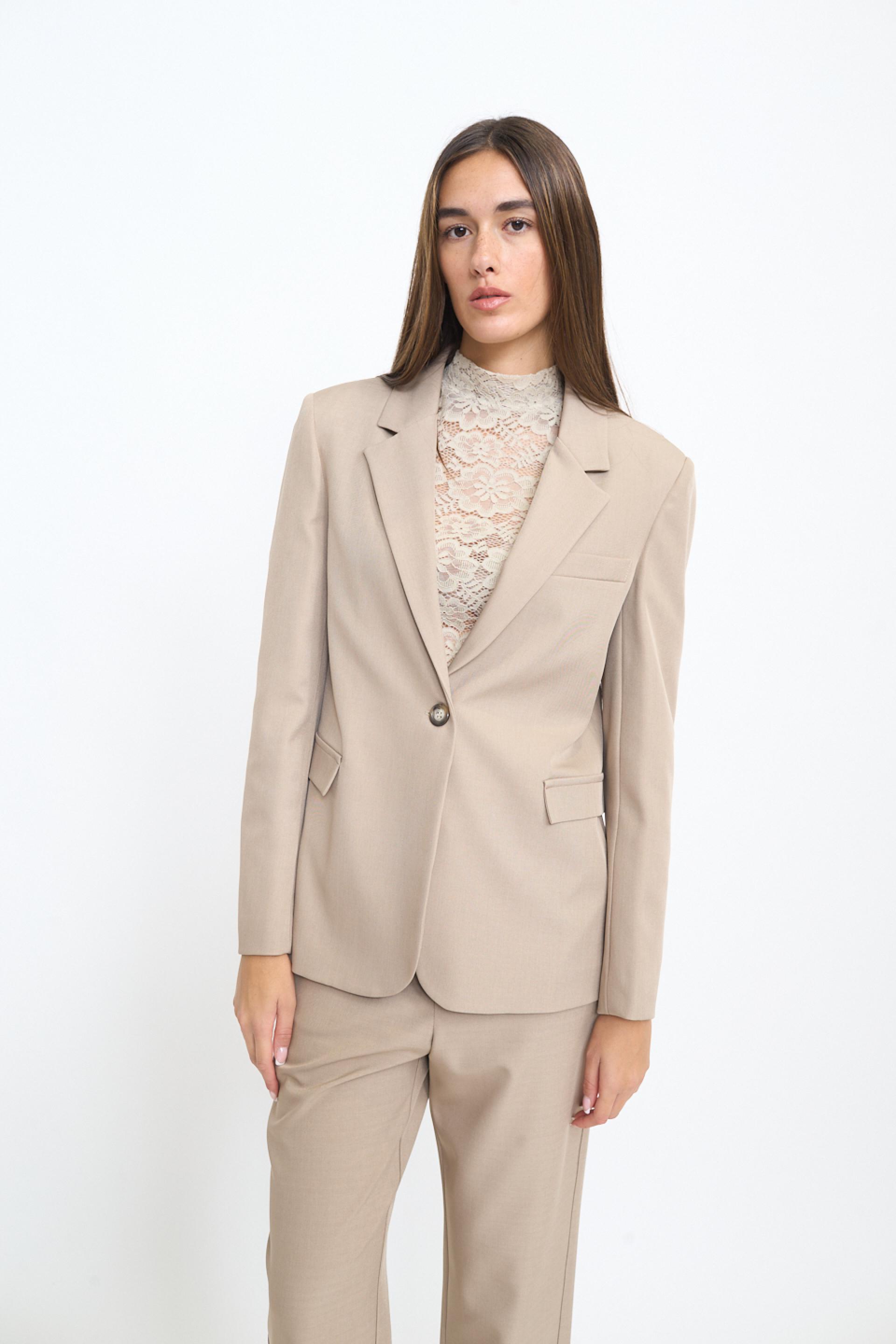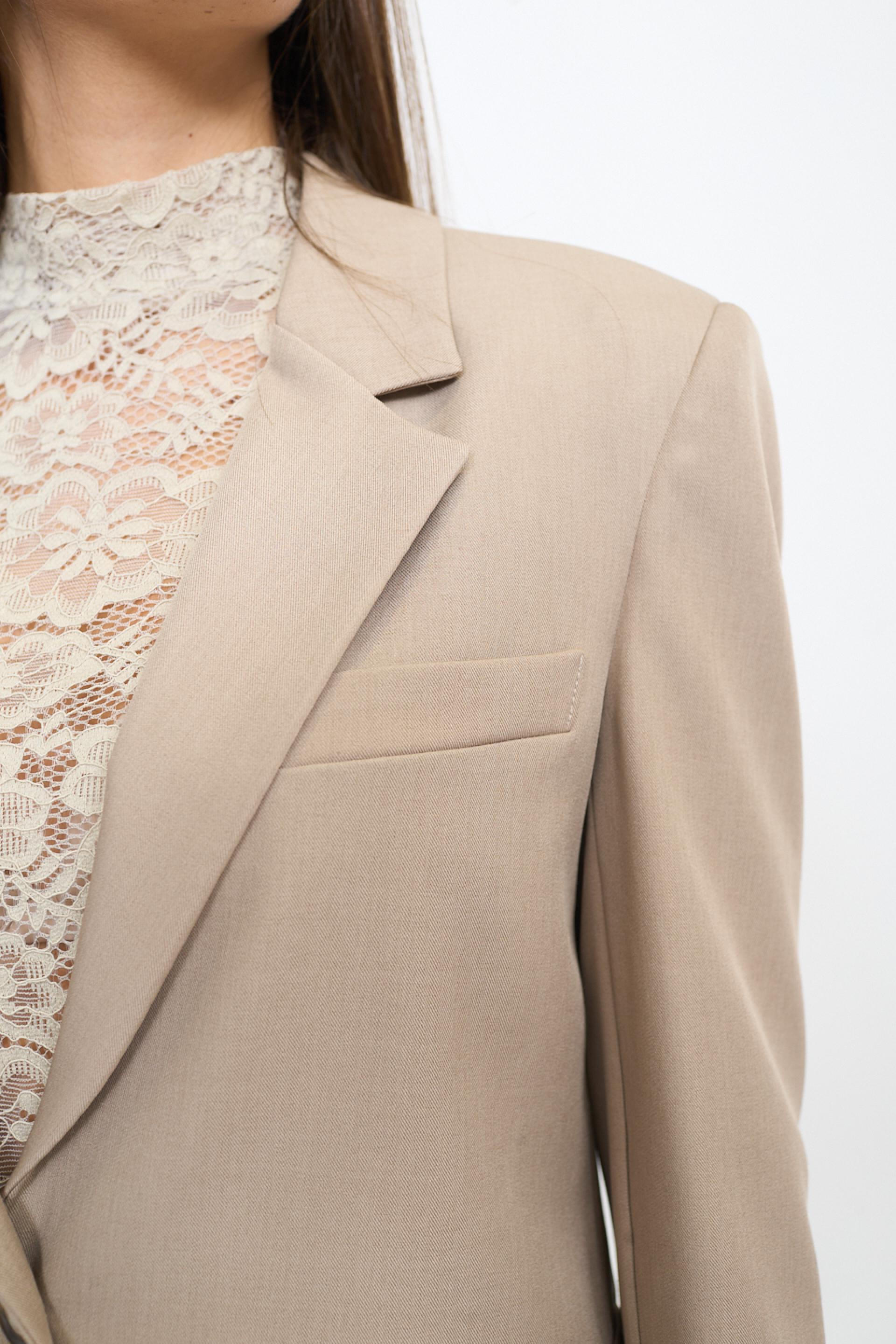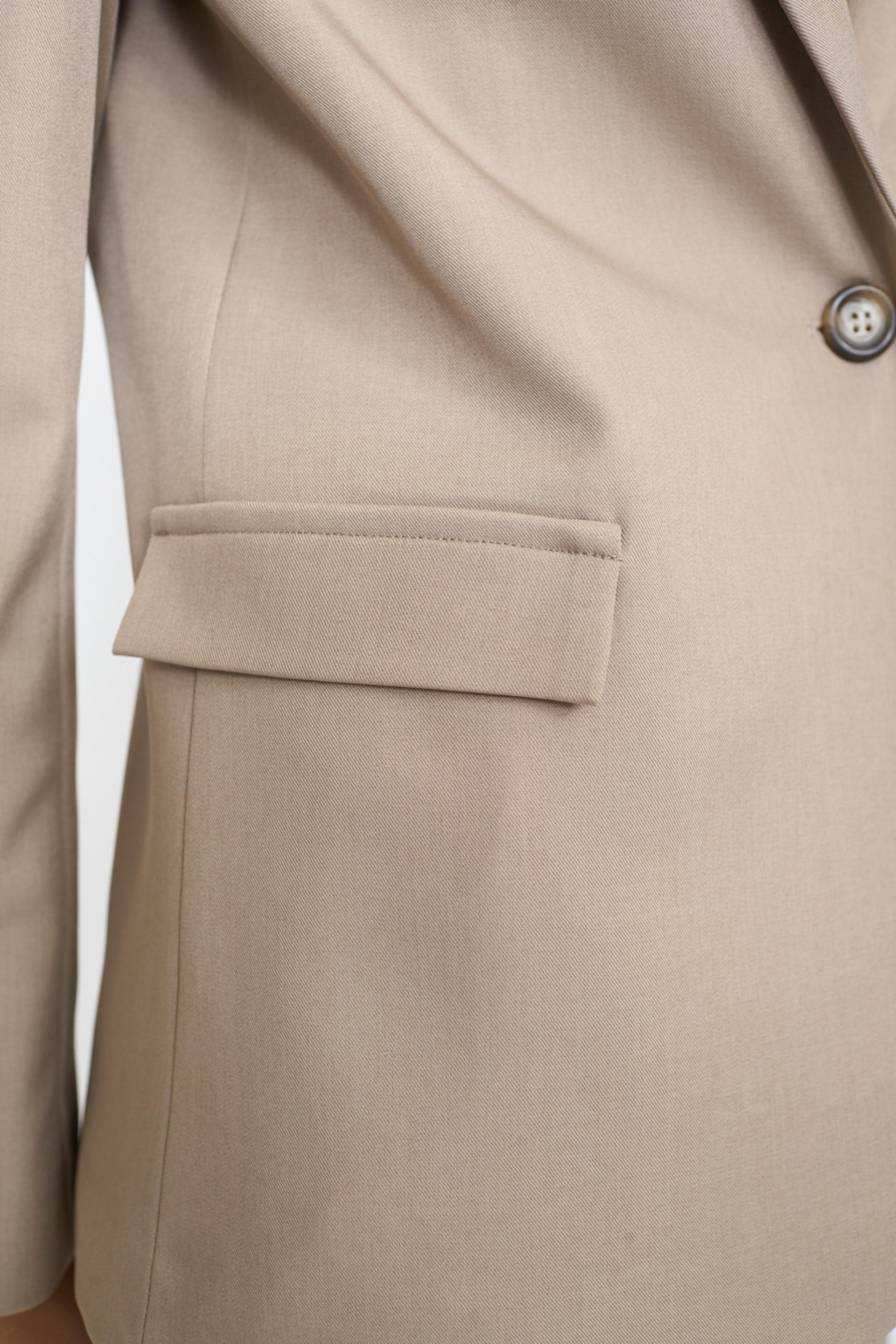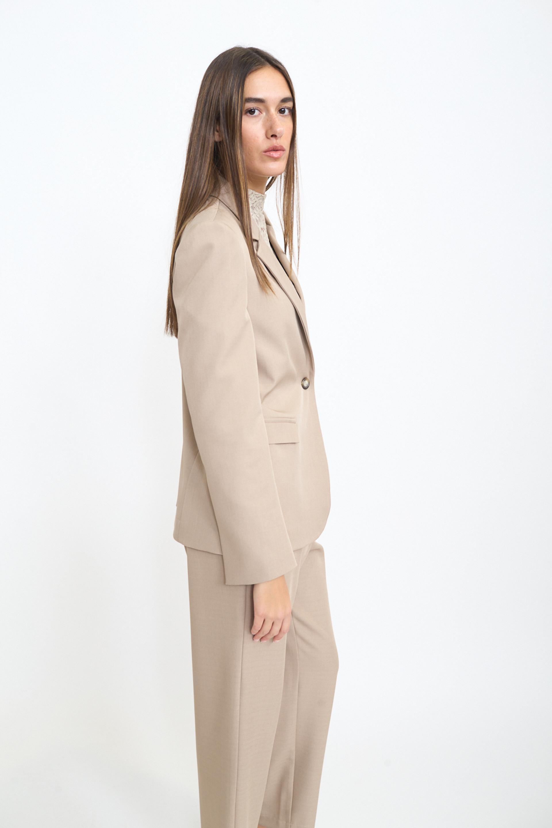 | Giacca collo revers ad 1 bottone con finta tasche con pattine e finto taschino sul petto. Spalline imbottite e fodera interna tono su tono. | ||