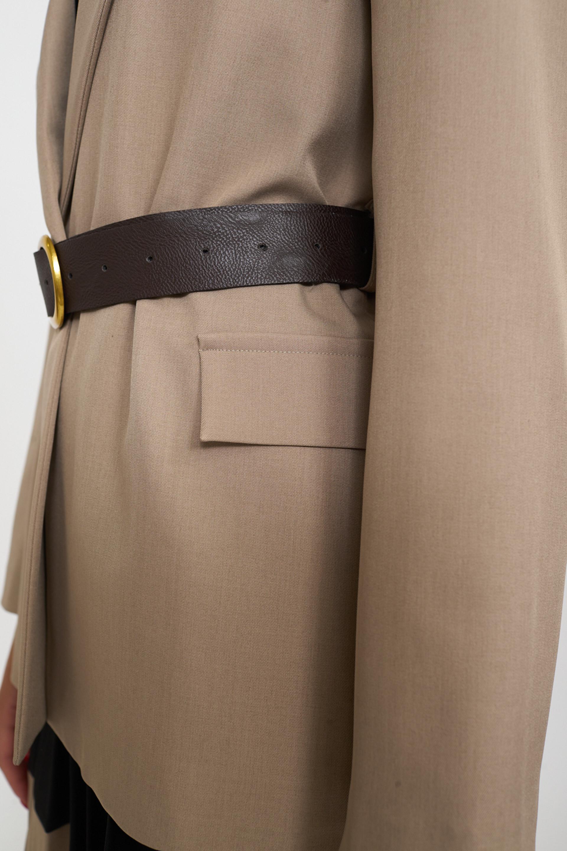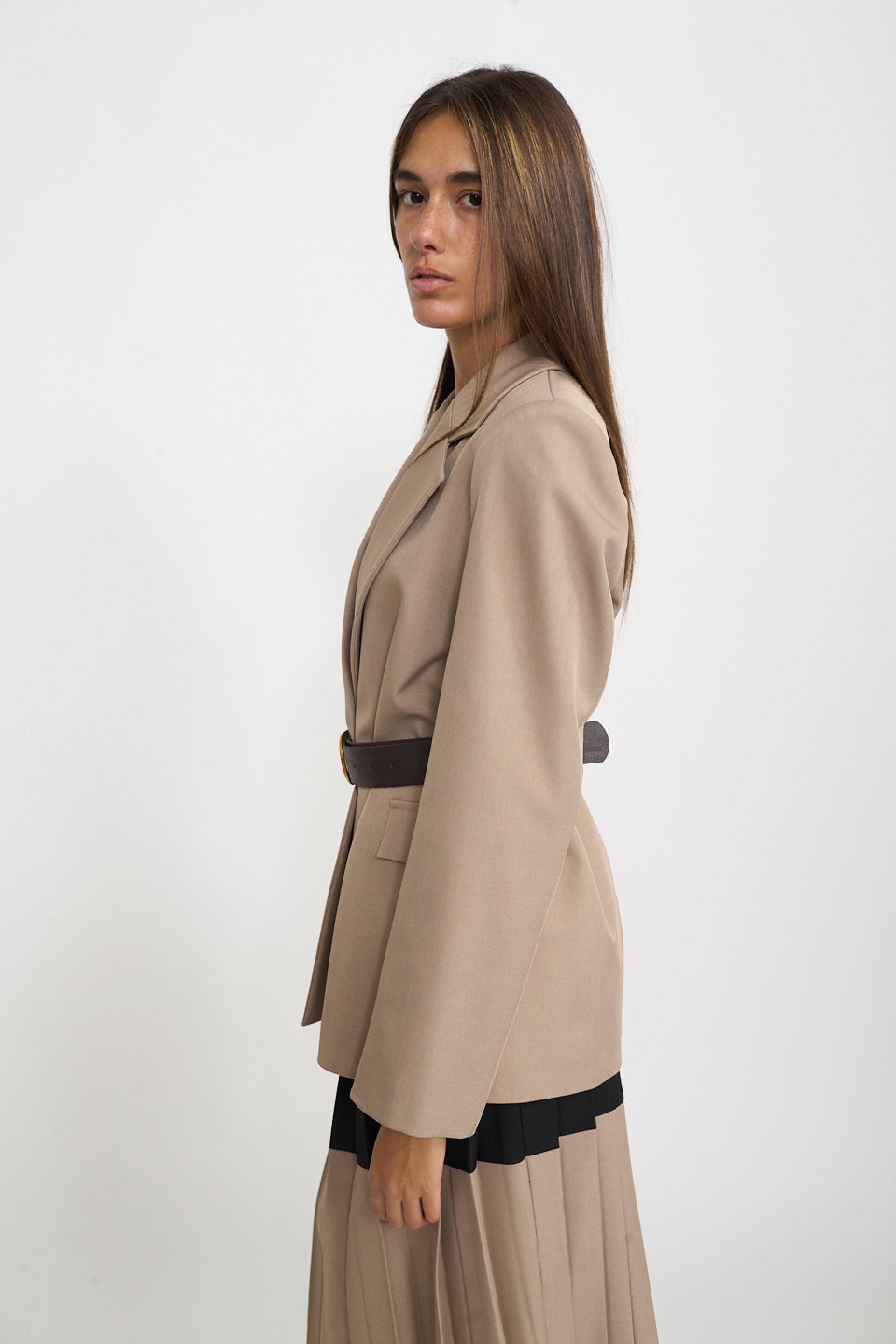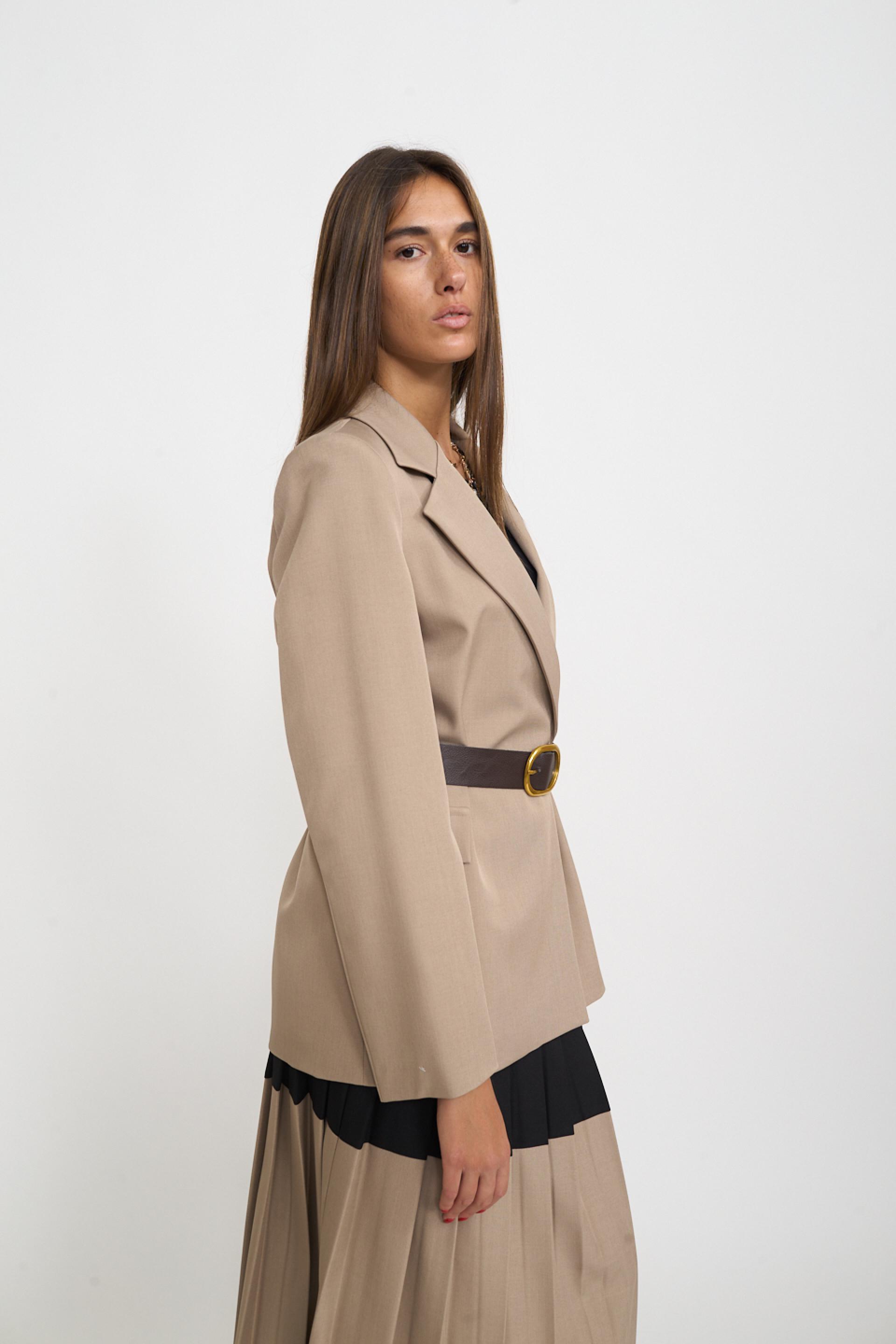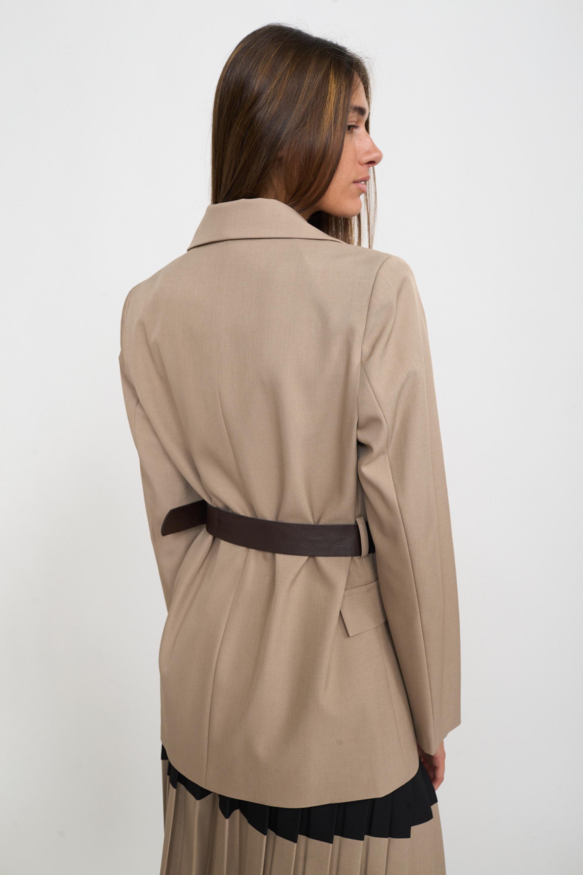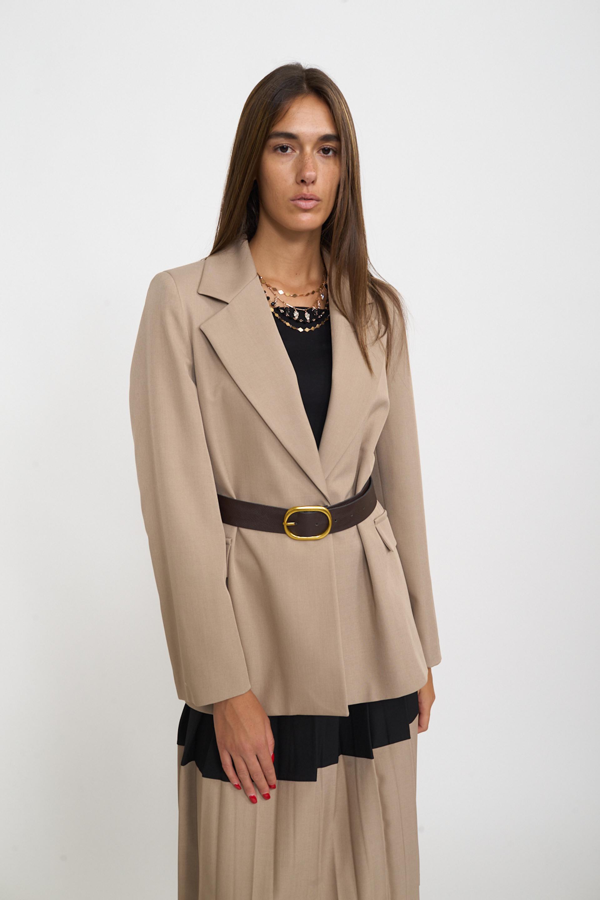 | Giacca collo revers ad 1 bottone con finte tasche con pattine. Passanti in vita e cinta compresa. Fodera interna tono su tono. | ||