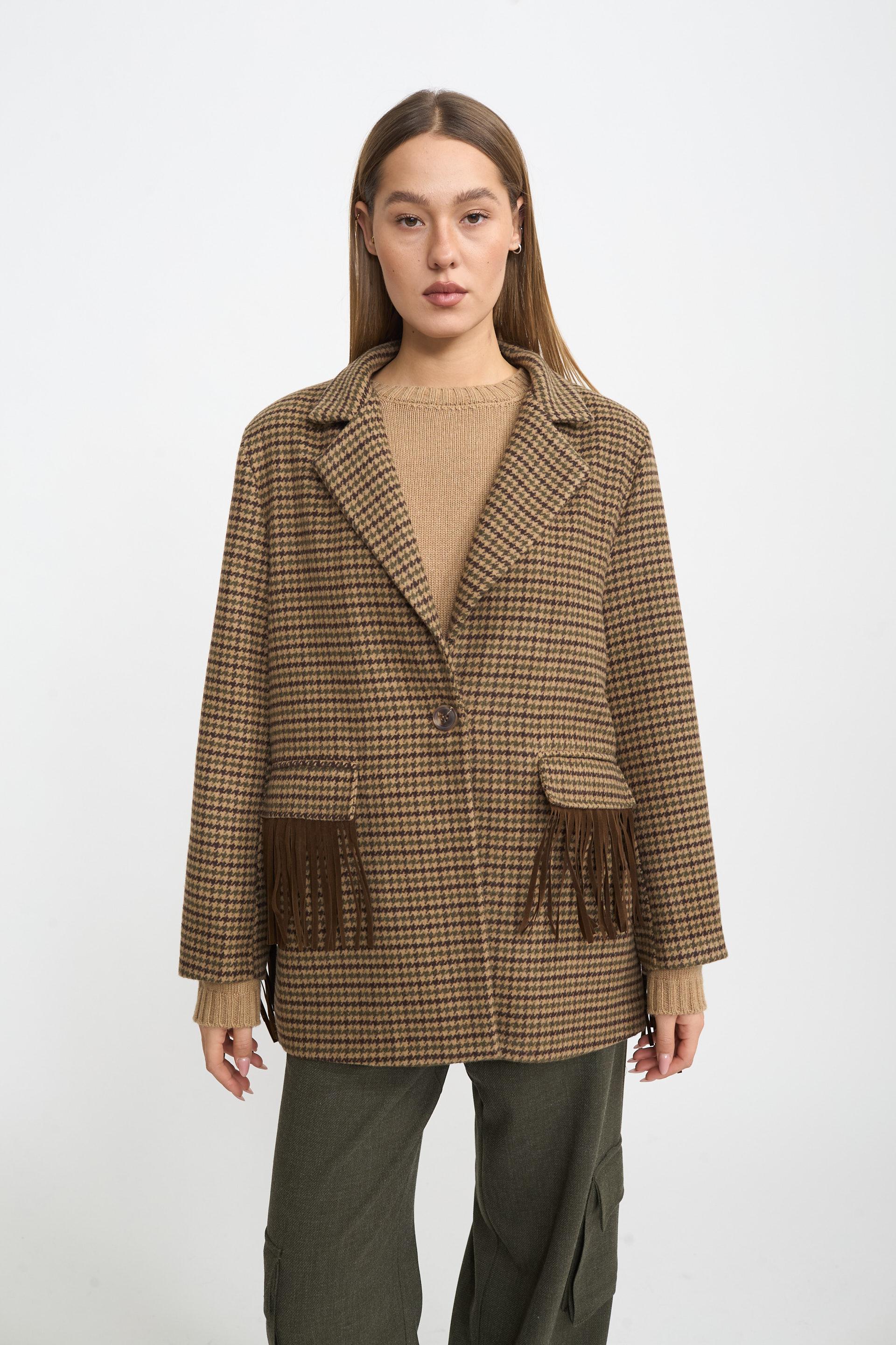 | Giacca over con spalline imbottite e finte tasche con pattine decorate con frange. Dettaglio di frange posteriori applicate. Fodera interna e chiusura tramite 1 bottone. | ||