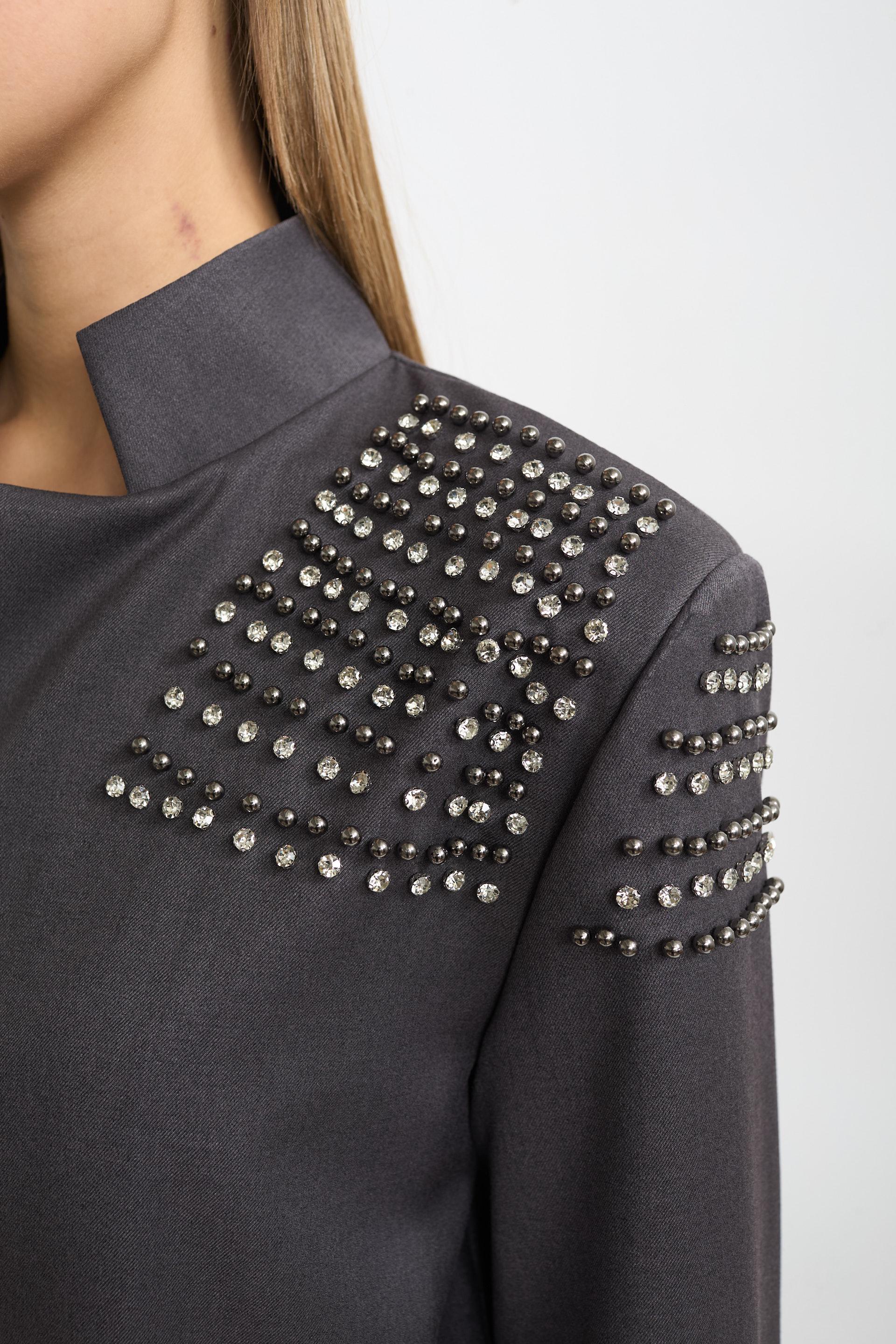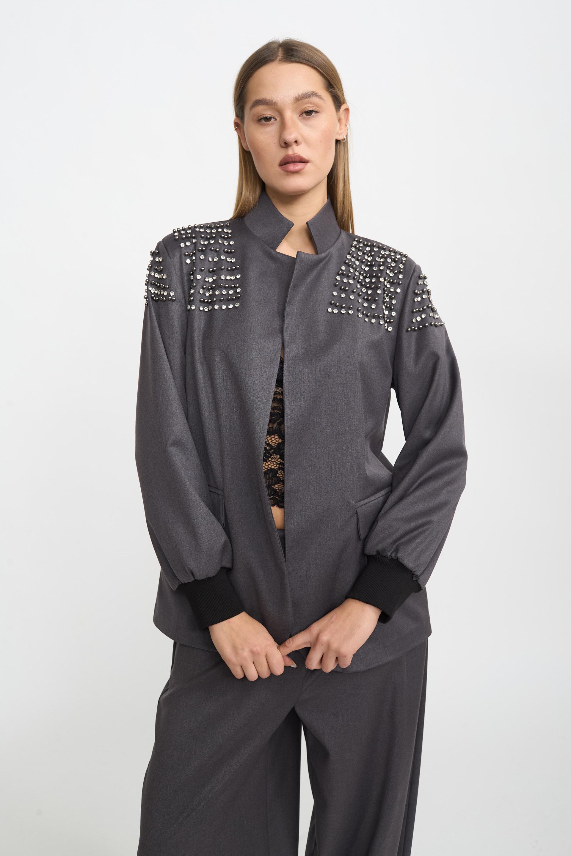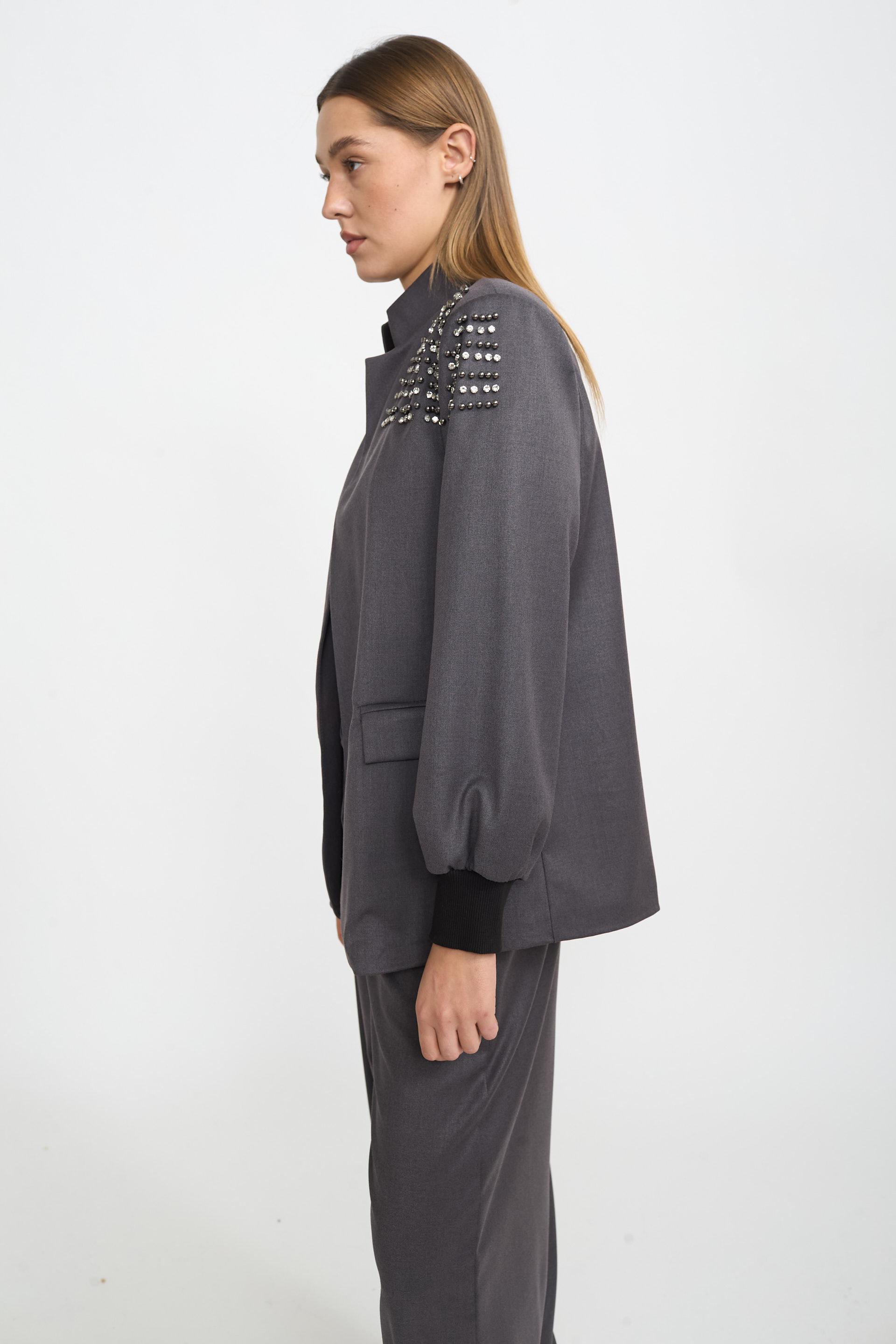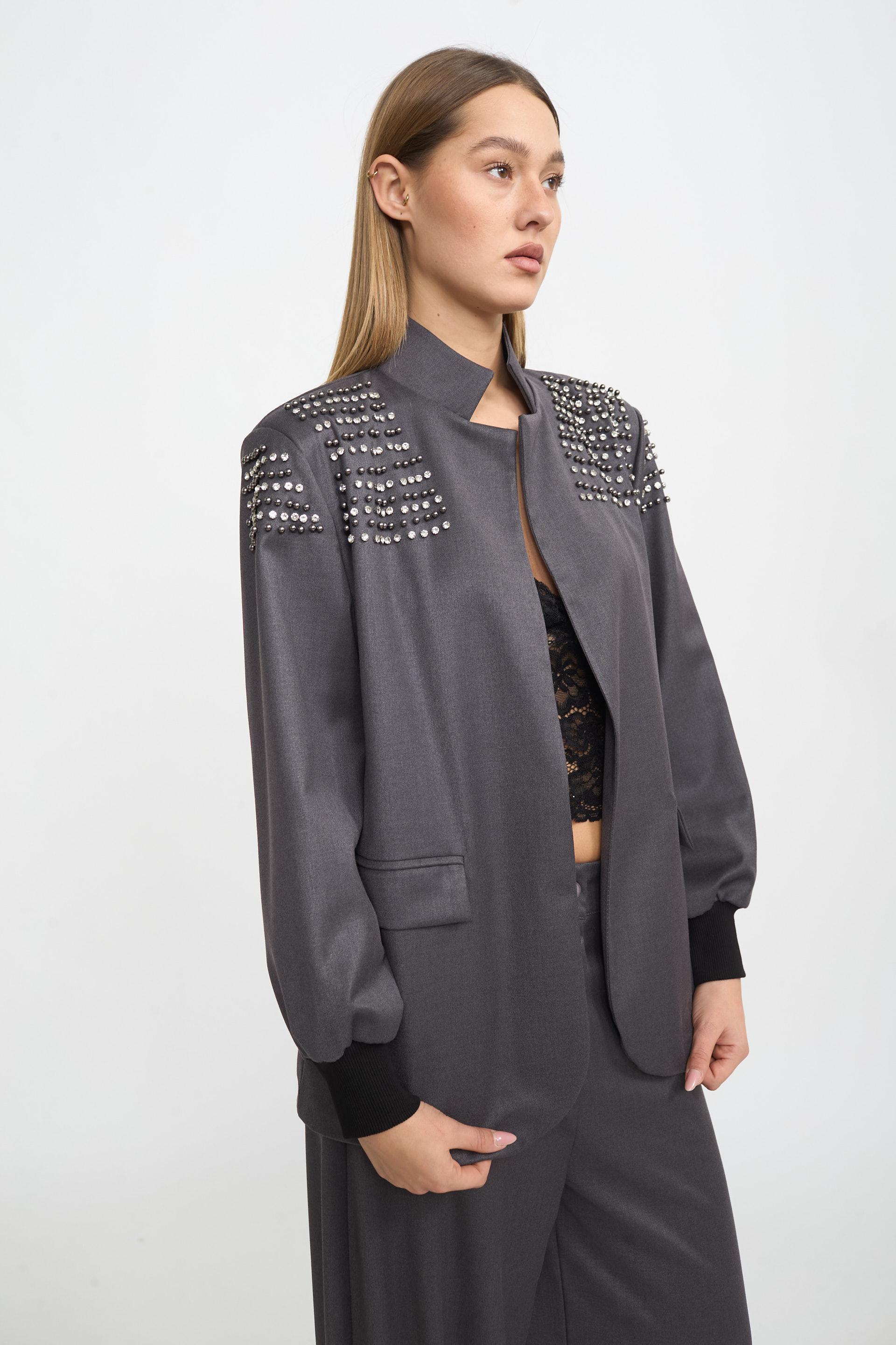 | Giacca aperta con dettagli di borchie e strass applicati sulle spalle. Spalline imbottite e finte tasche con pattine. Fodera interna. | ||