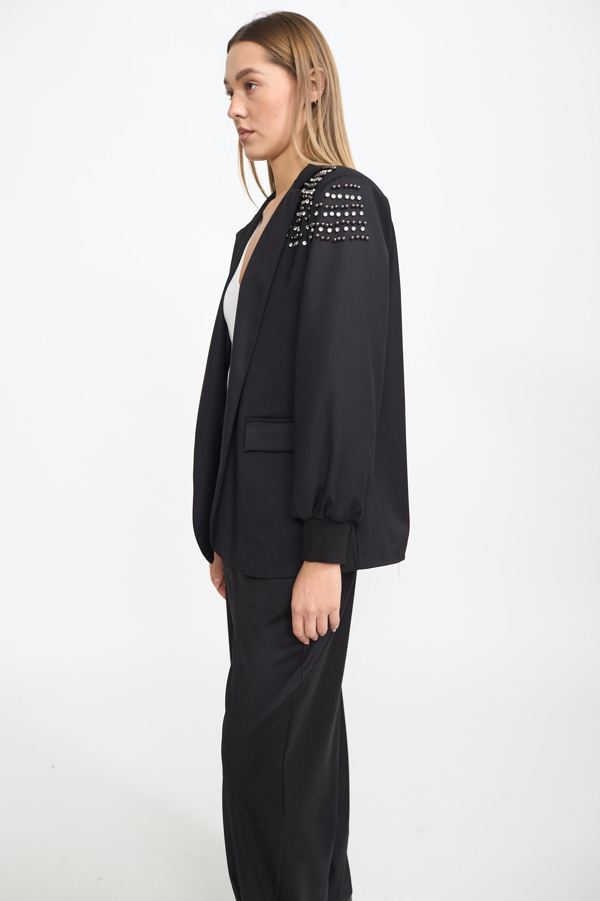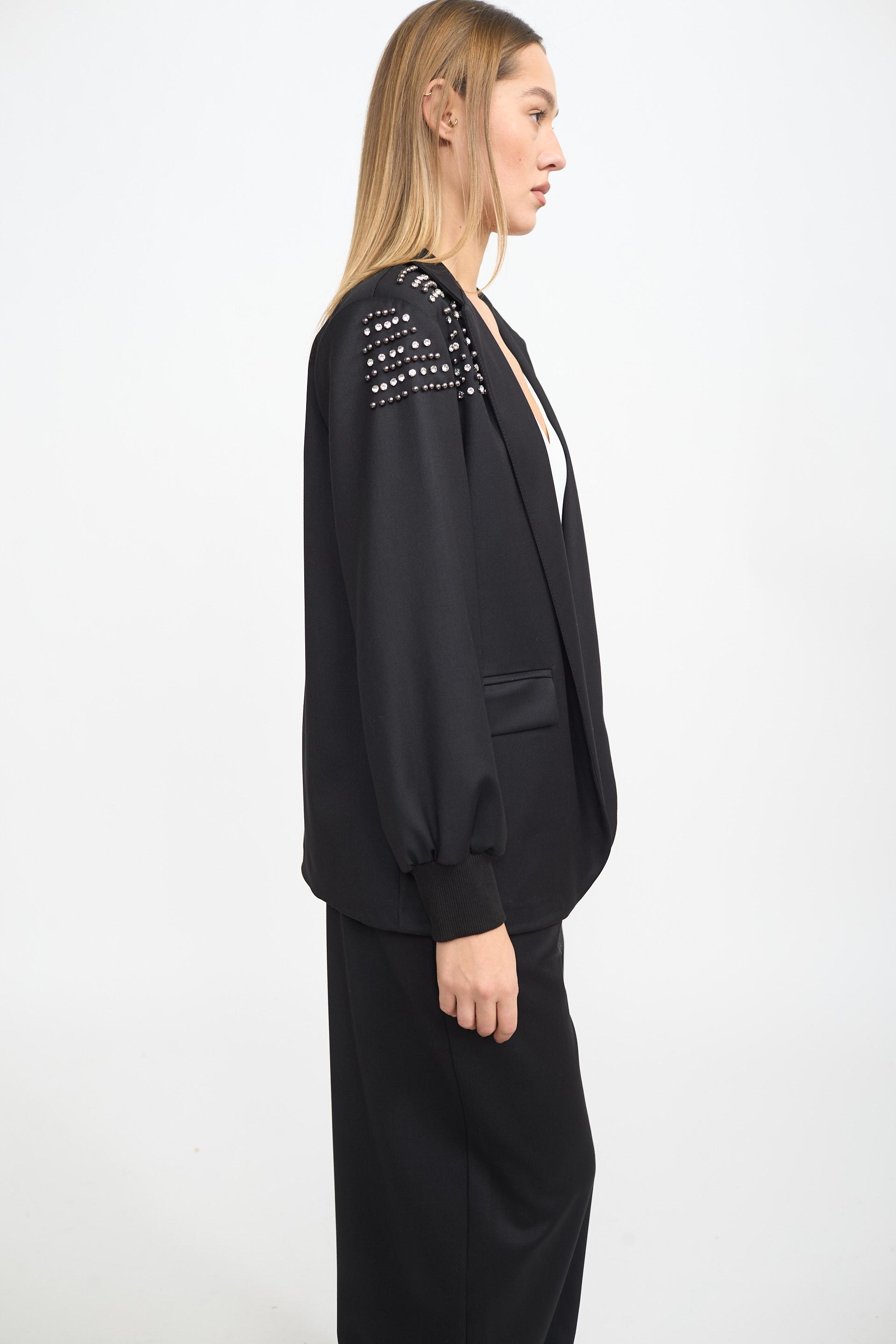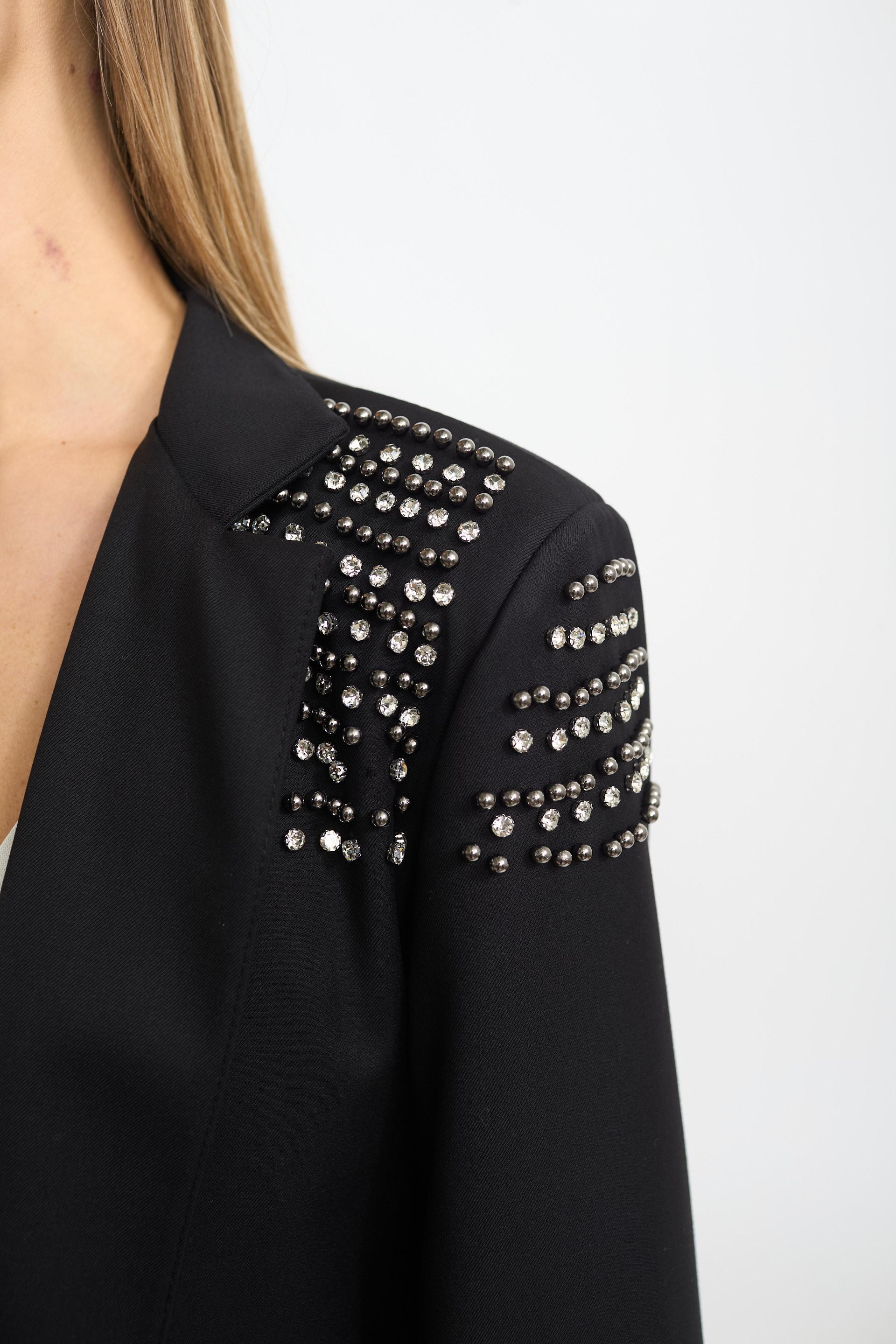 | Giacca aperta con dettagli di borchie e strass applicati sulle spalle. Spalline imbottite e finte tasche con pattine. Fodera interna. | ||
