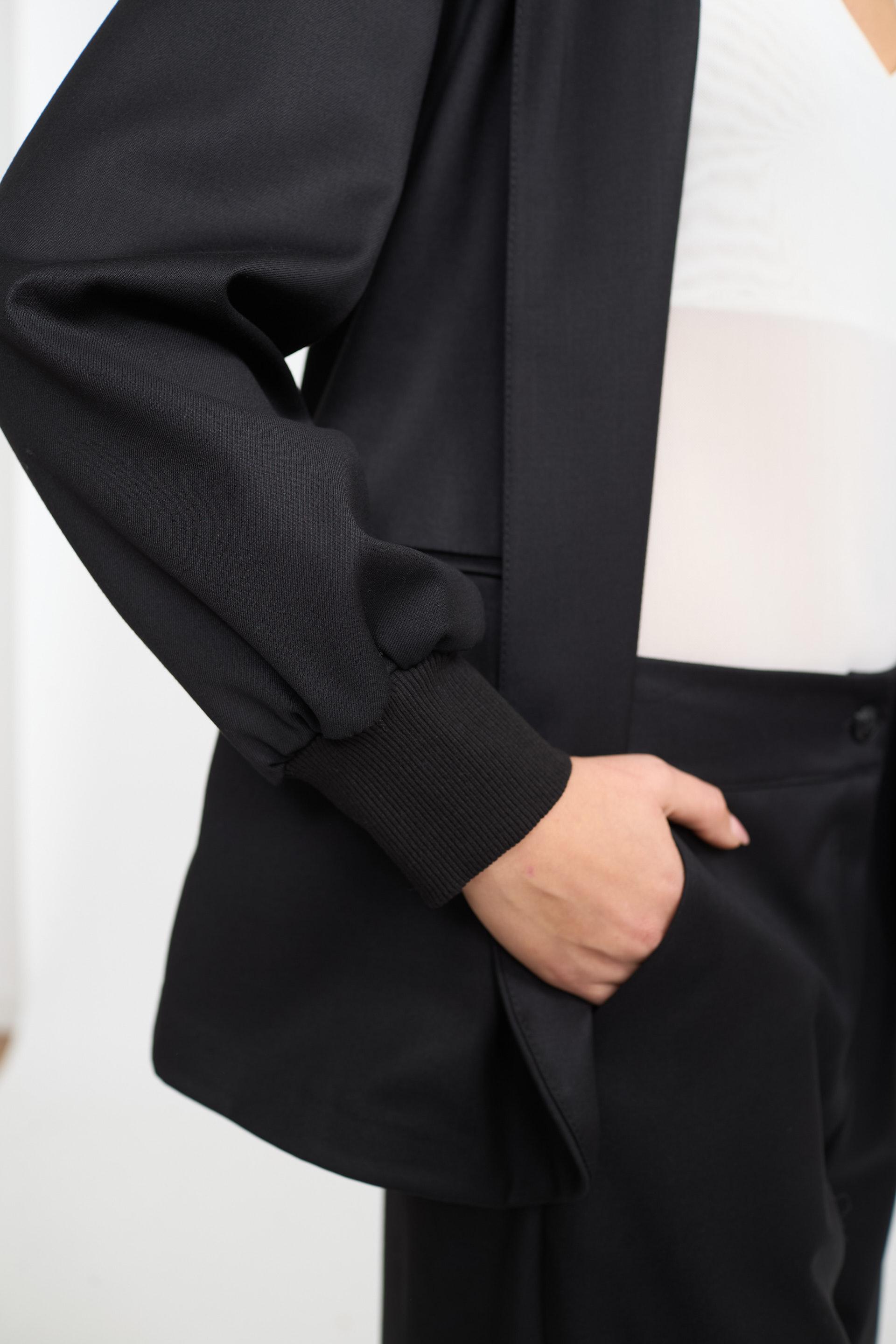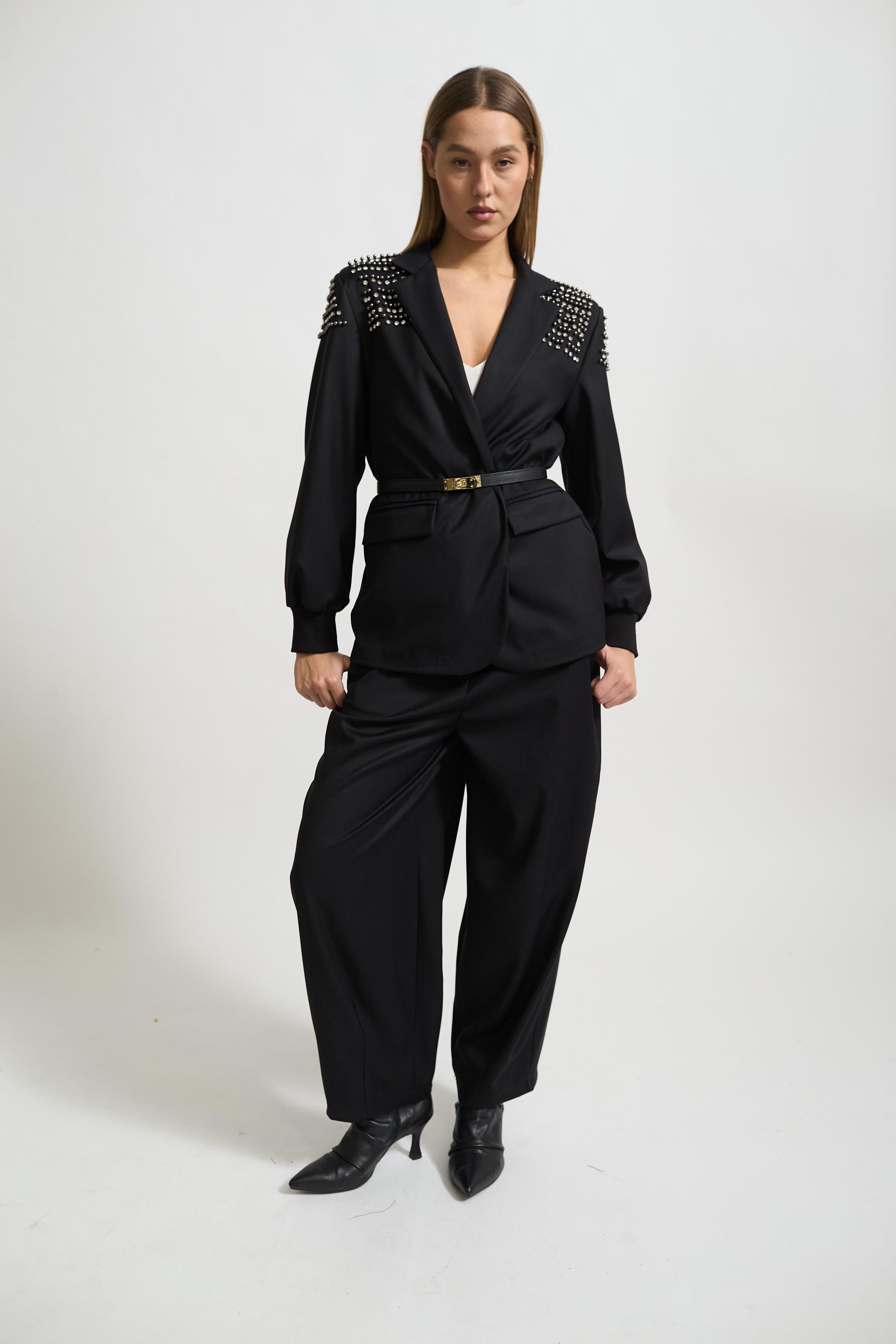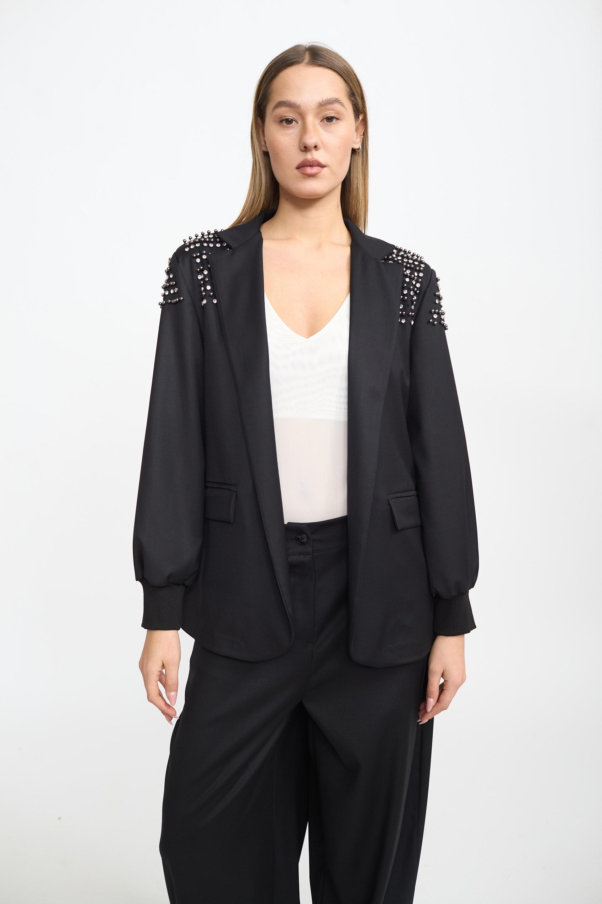 | Giacca aperta con dettagli di borchie e strass applicati sulle spalle. Spalline imbottite e finte tasche con pattine. Fodera interna. | ||