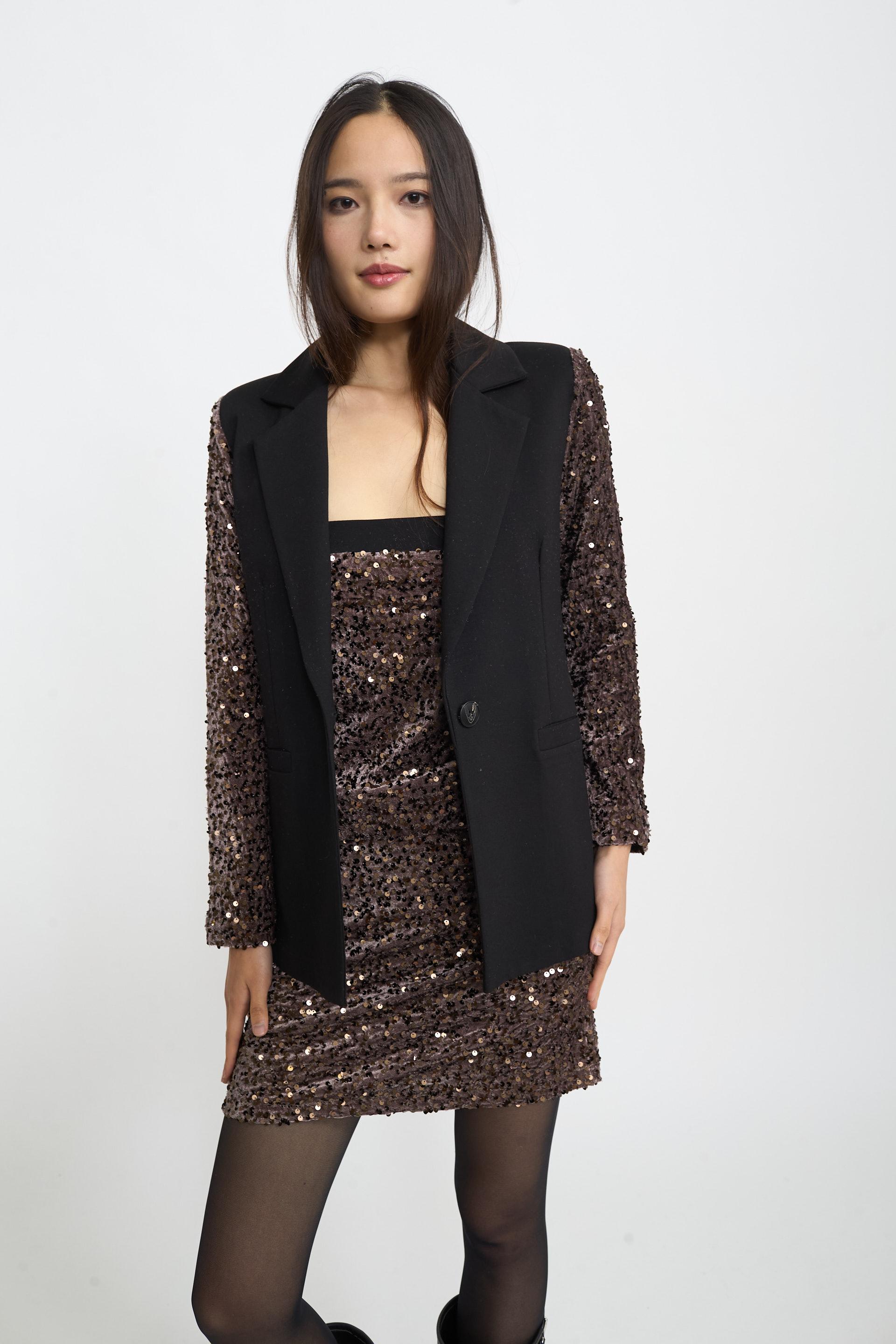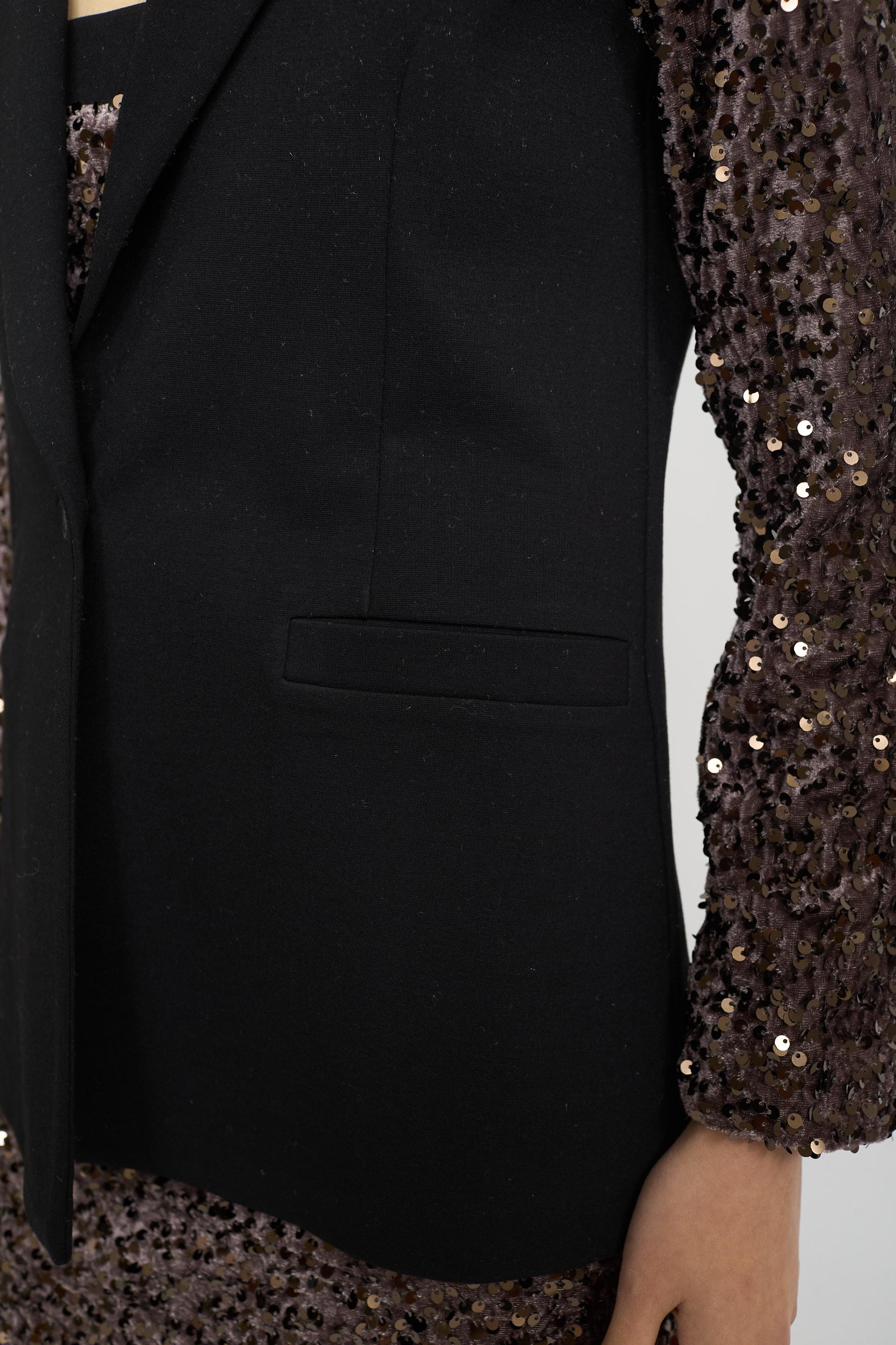 | Giacca collo revers in punto Milano con maniche in paillettes. Finte tasche a filetto e fodera interna. Chiusura tramite 1 bottone. | ||