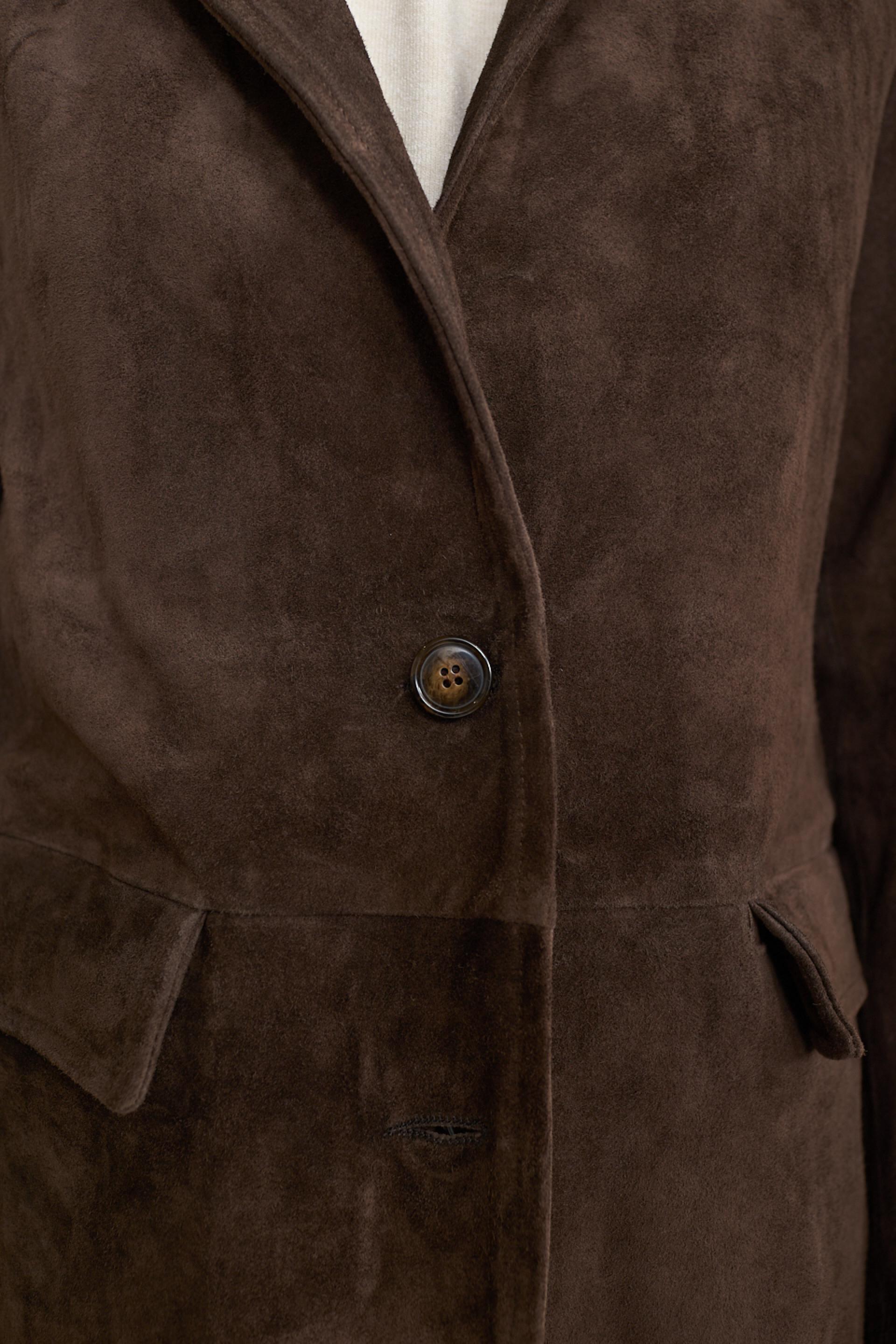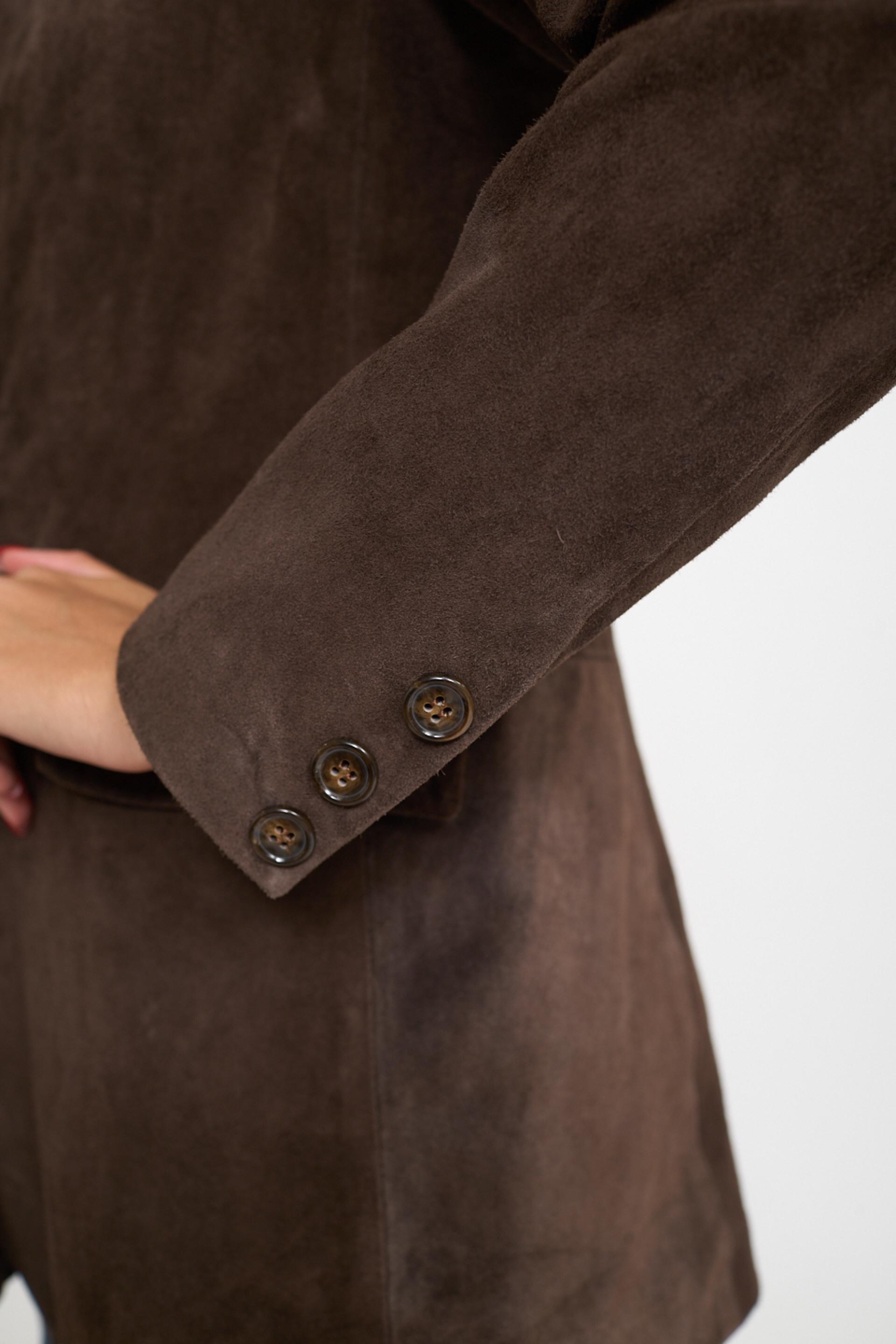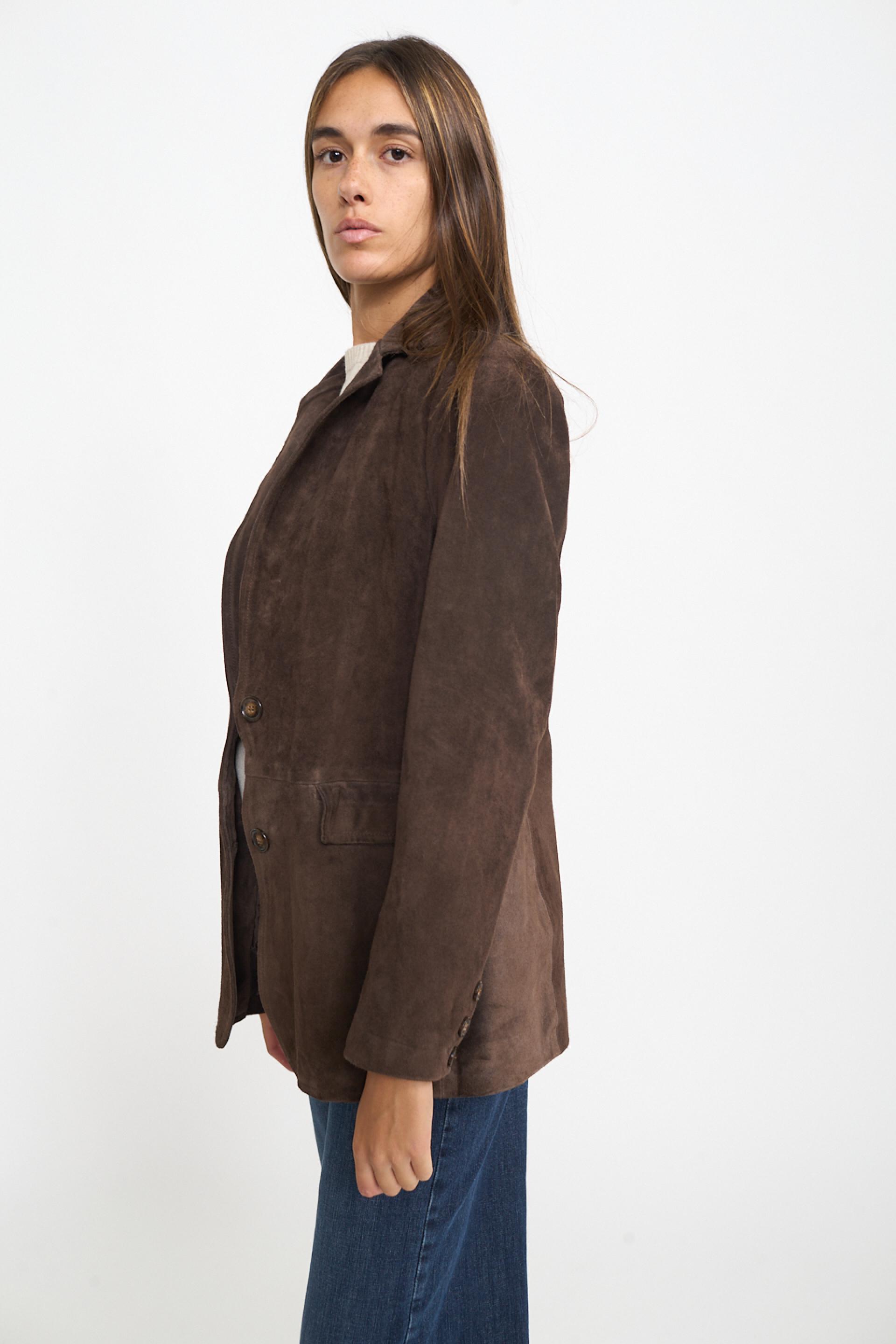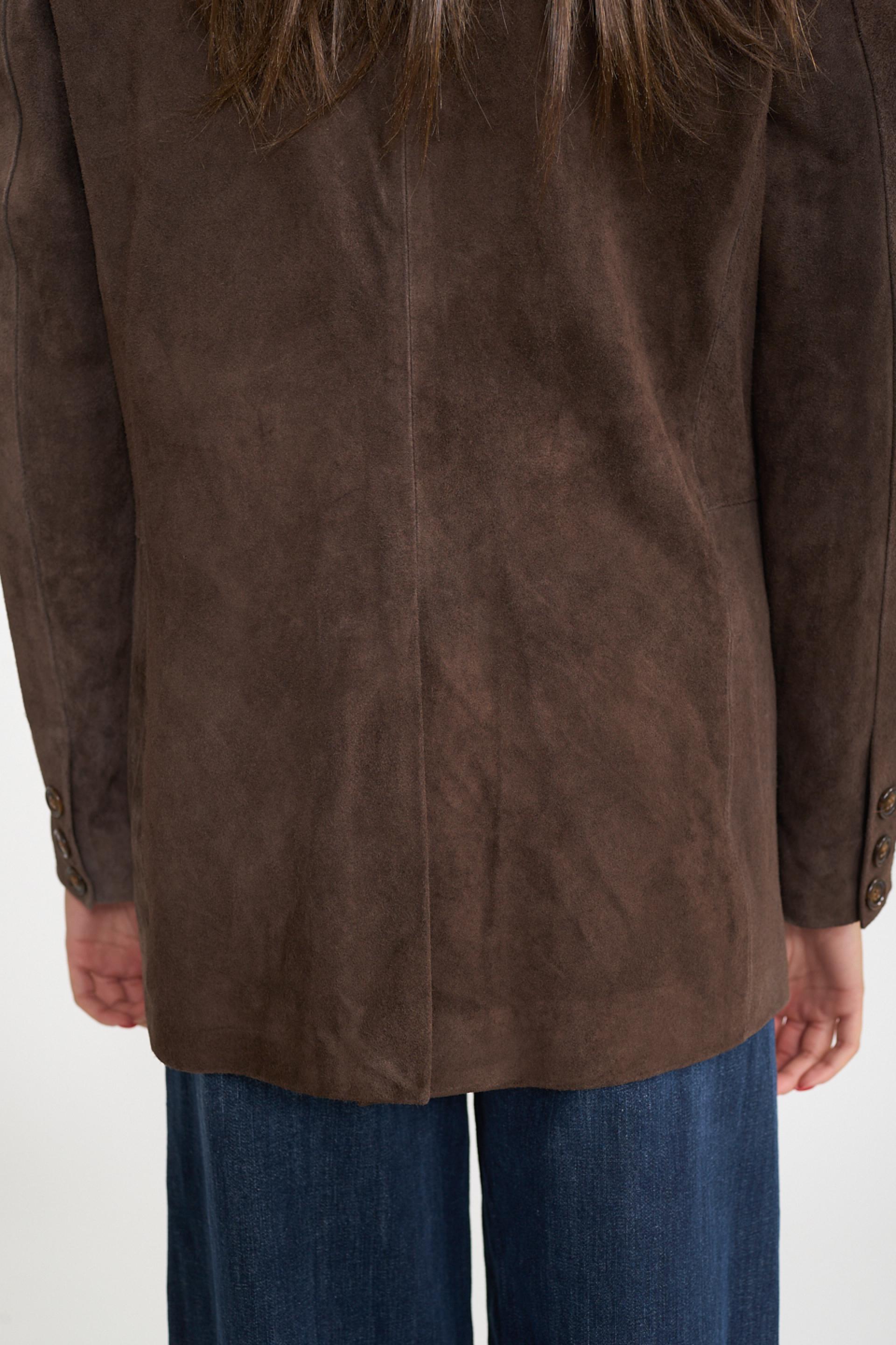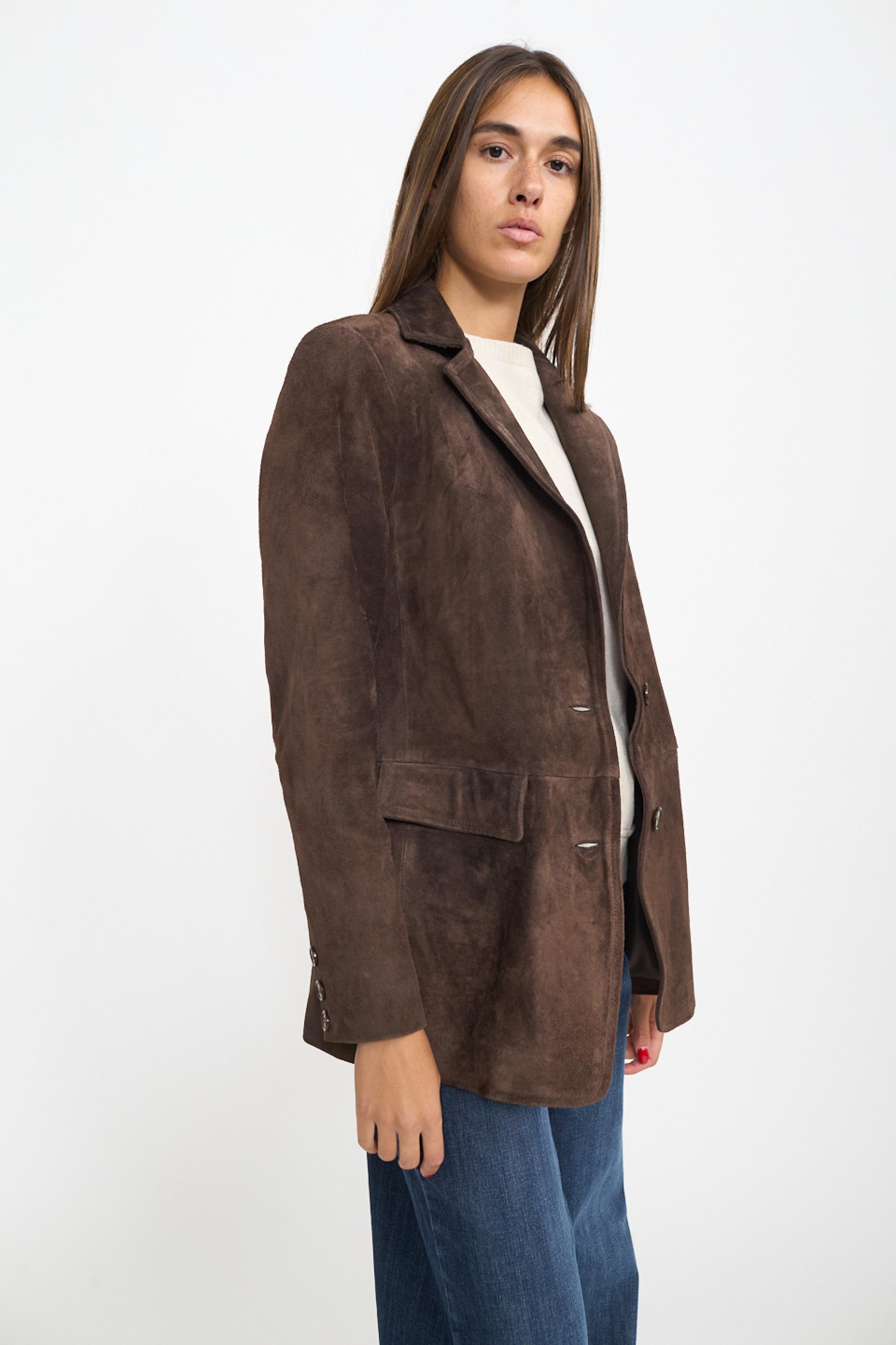 | Giacca scamosciata con collo revers e tasche con pattine. Spalline imbottite e spacco posteriore. Fodera interna tono su tono. Chiusura tramite 2 bottoni. | ||