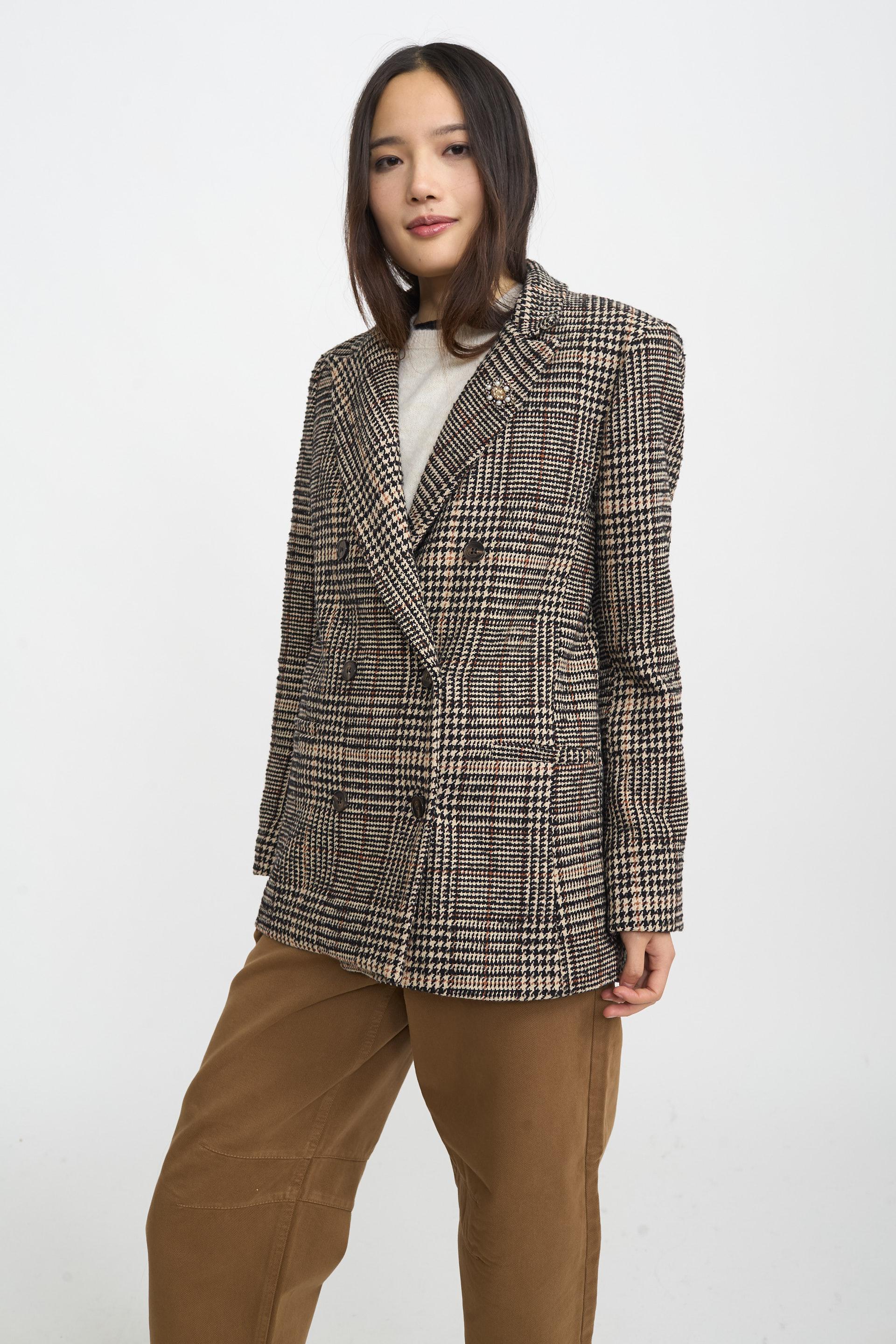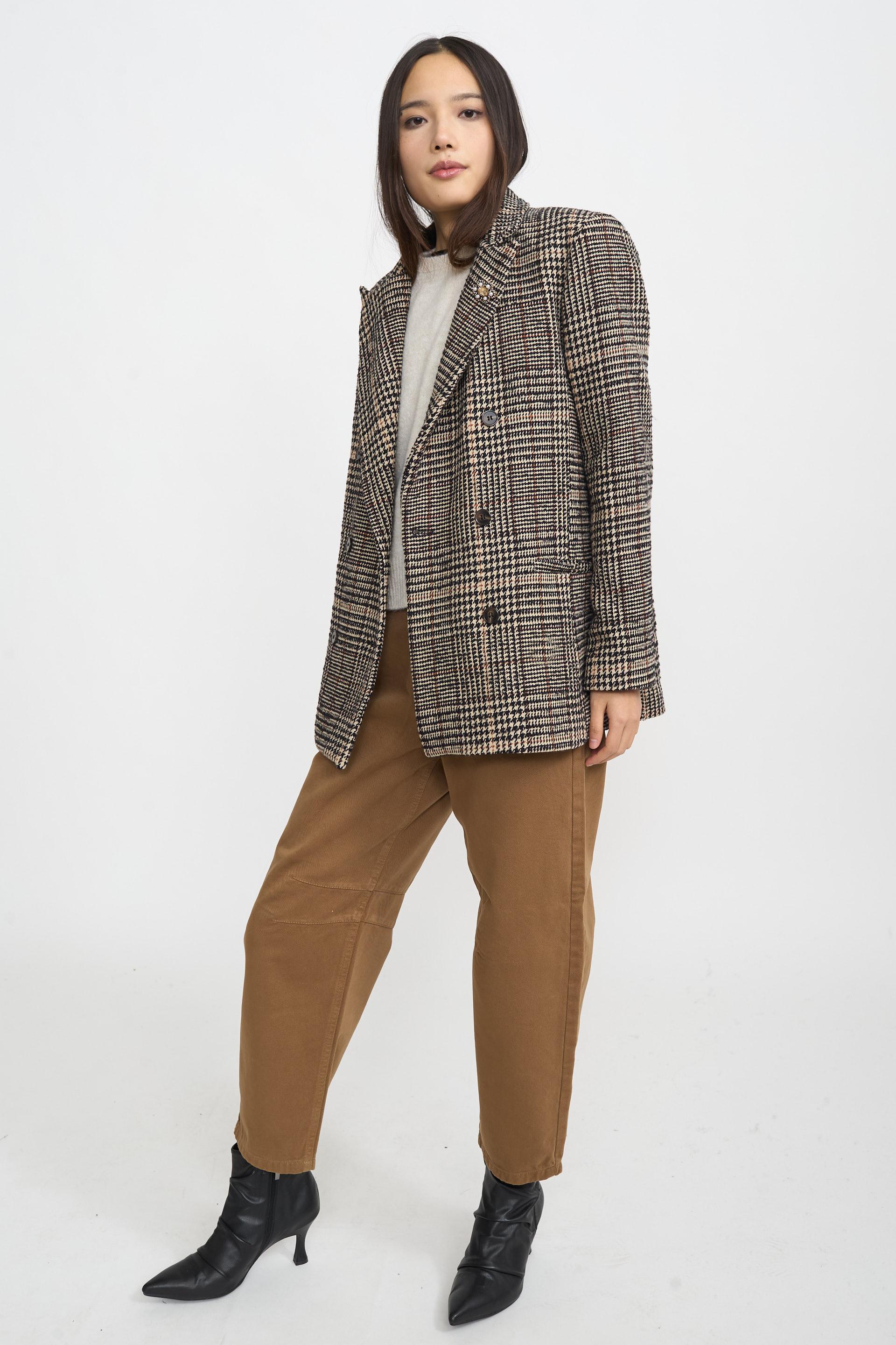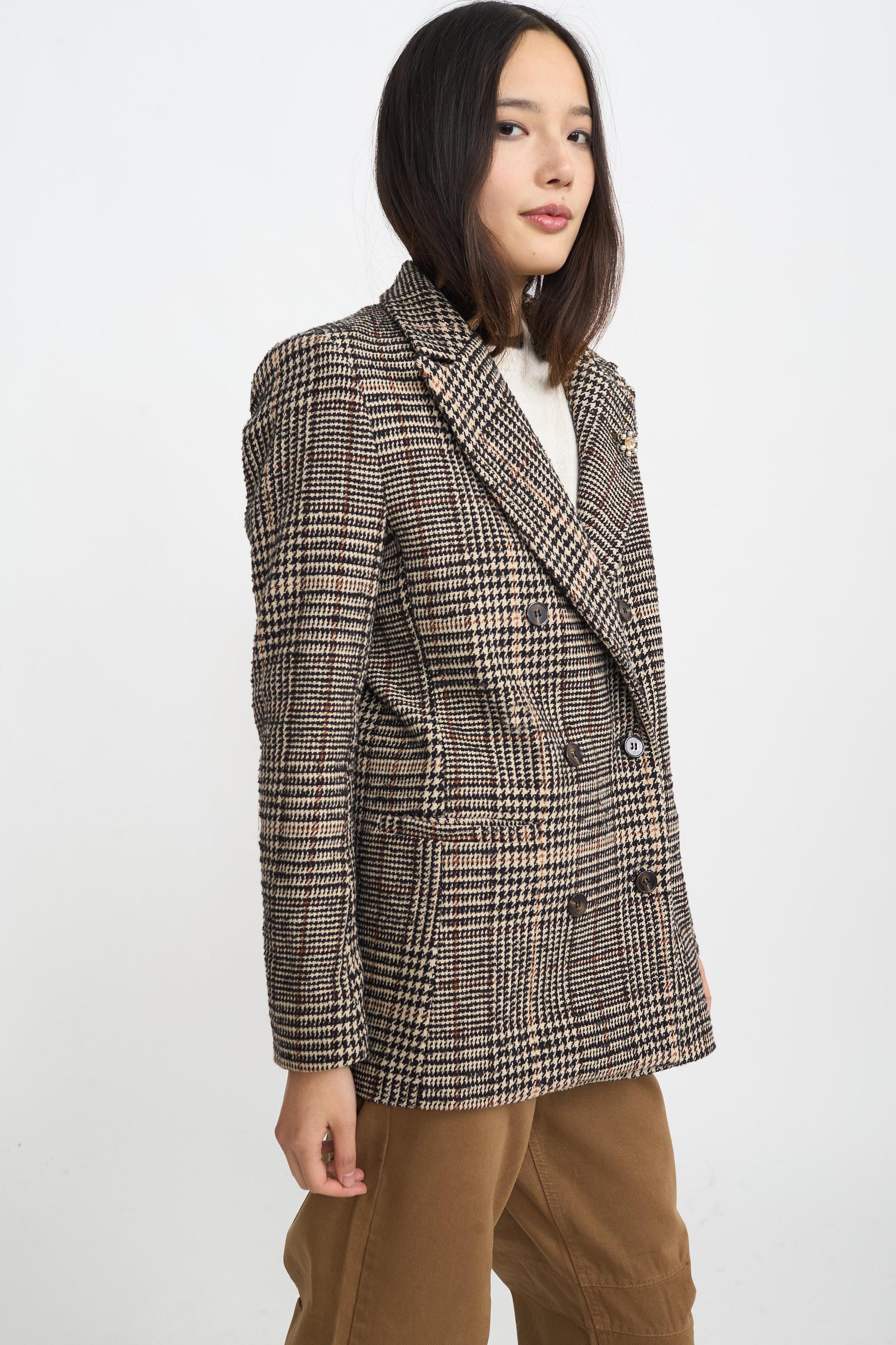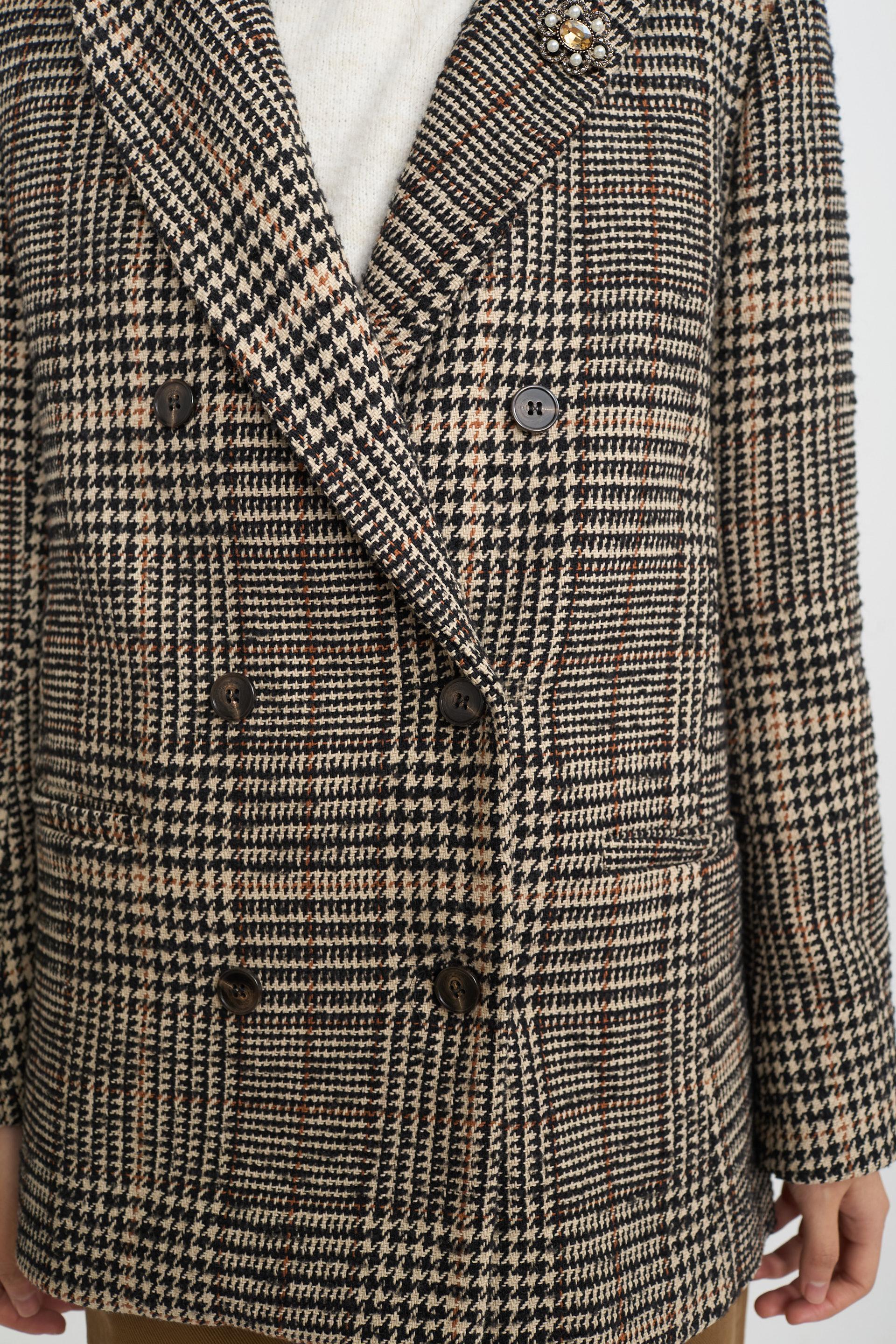 | Giacca doppio petto in tessuto check con tasche applicate. Dettaglio di spille applicate su bavero. Spalline imbottite e fodera. | ||