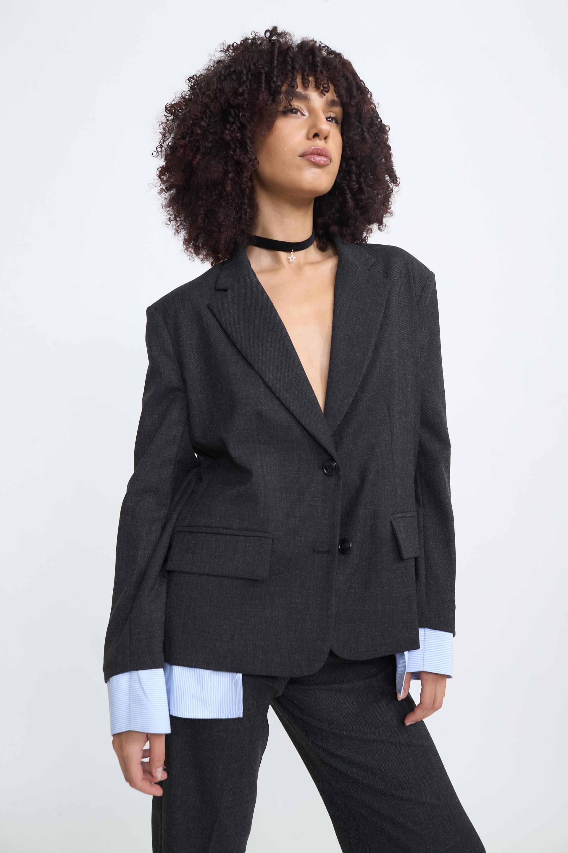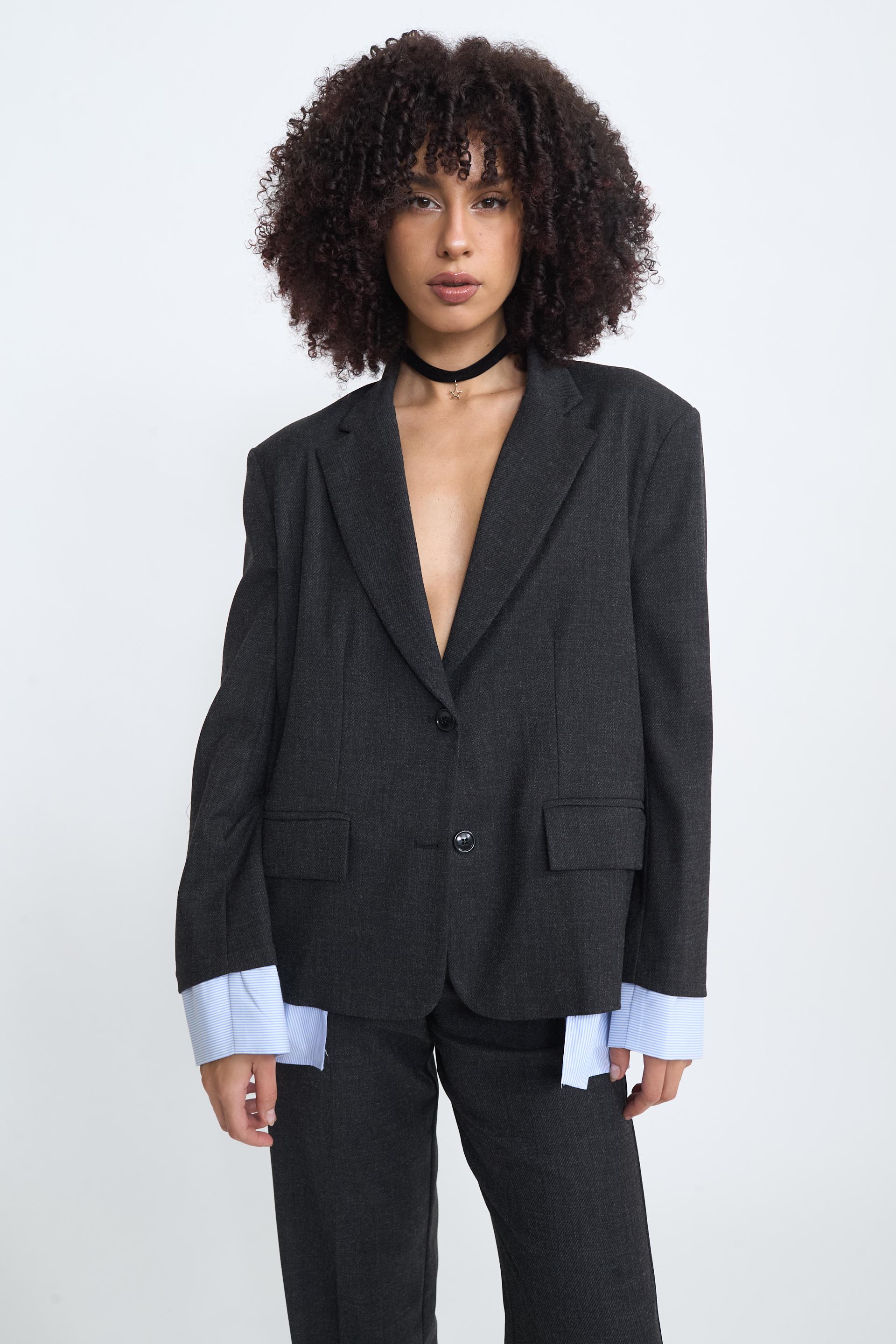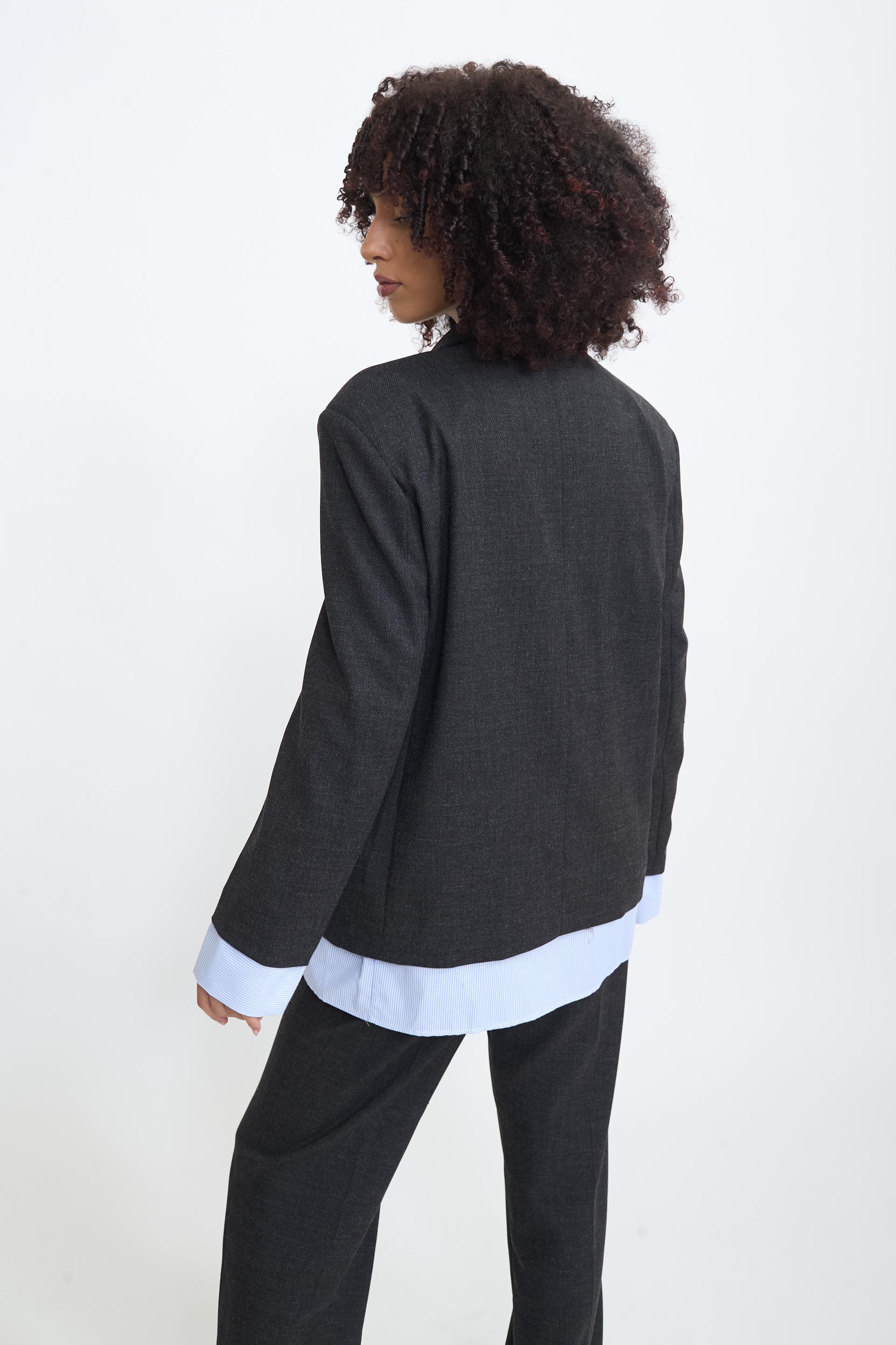 Giacca con inserto camicia rigata. Finte tasche con pattina e spalline imbottite. Chiusura tramite 2 bottoni. | ||