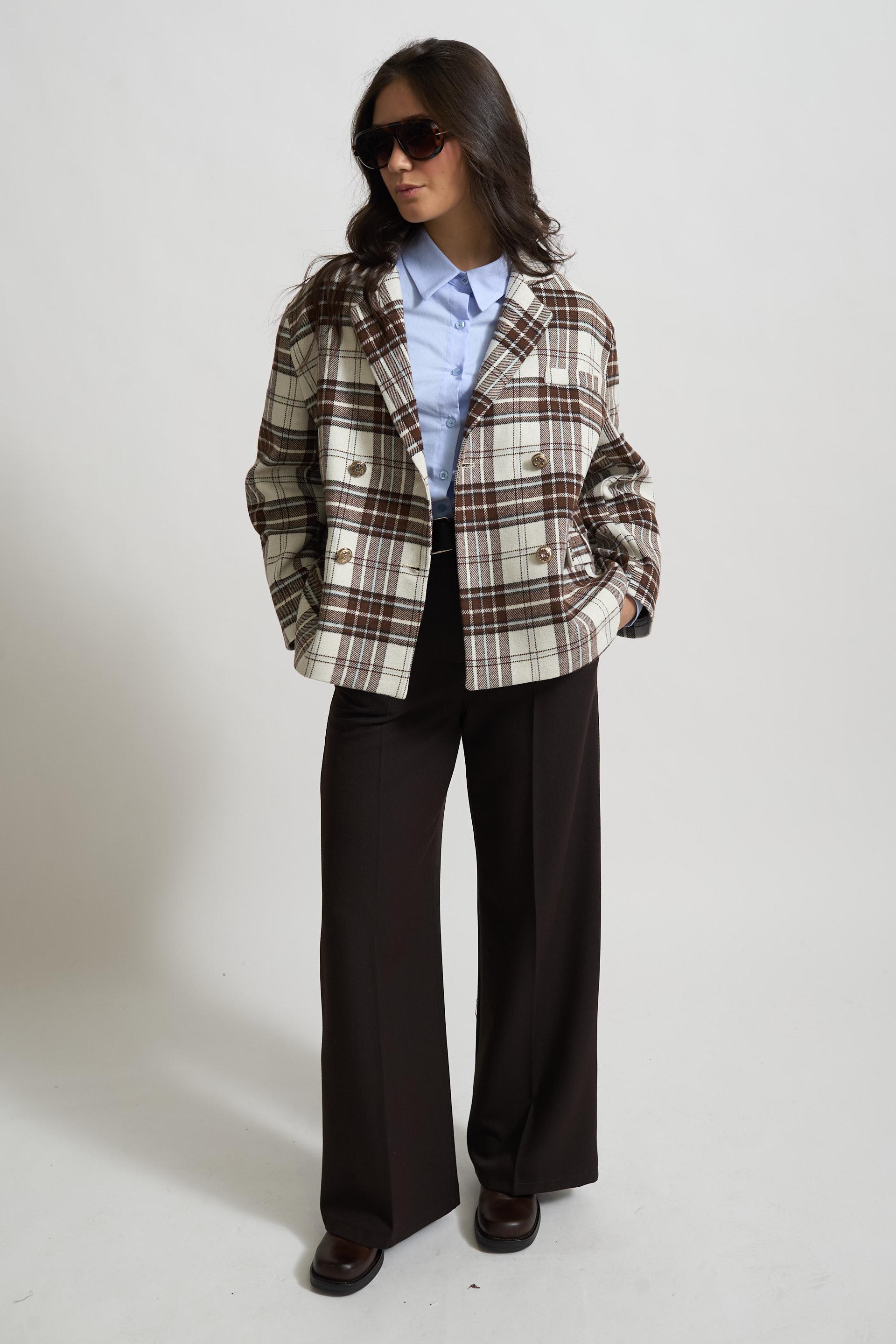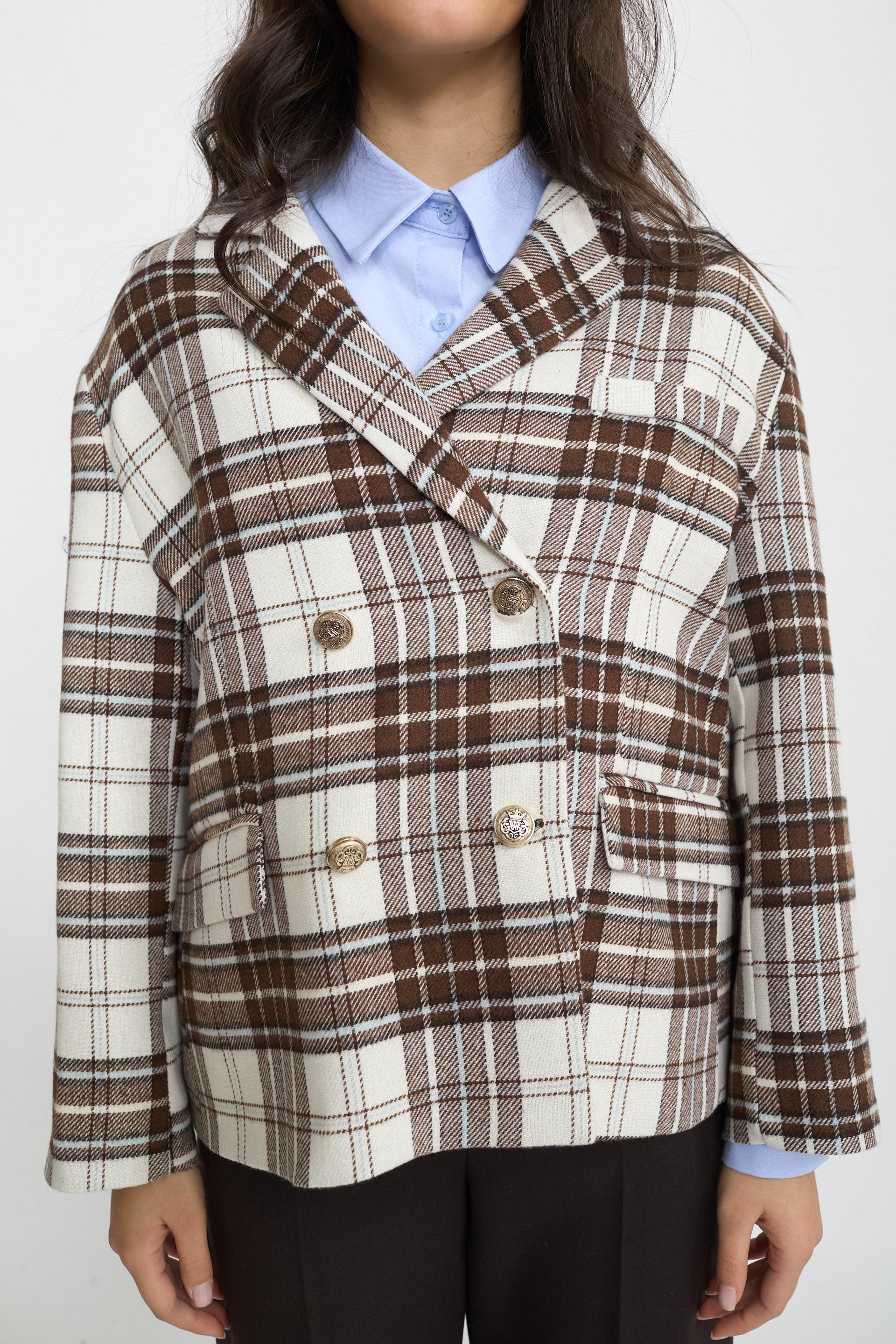 | Giacca cappotto corto doppio petto in tessuto check. Finte tasche con pattina. Dettaglio di bottoni a rilievo e finto taschino applicato. Fodera interna. | ||