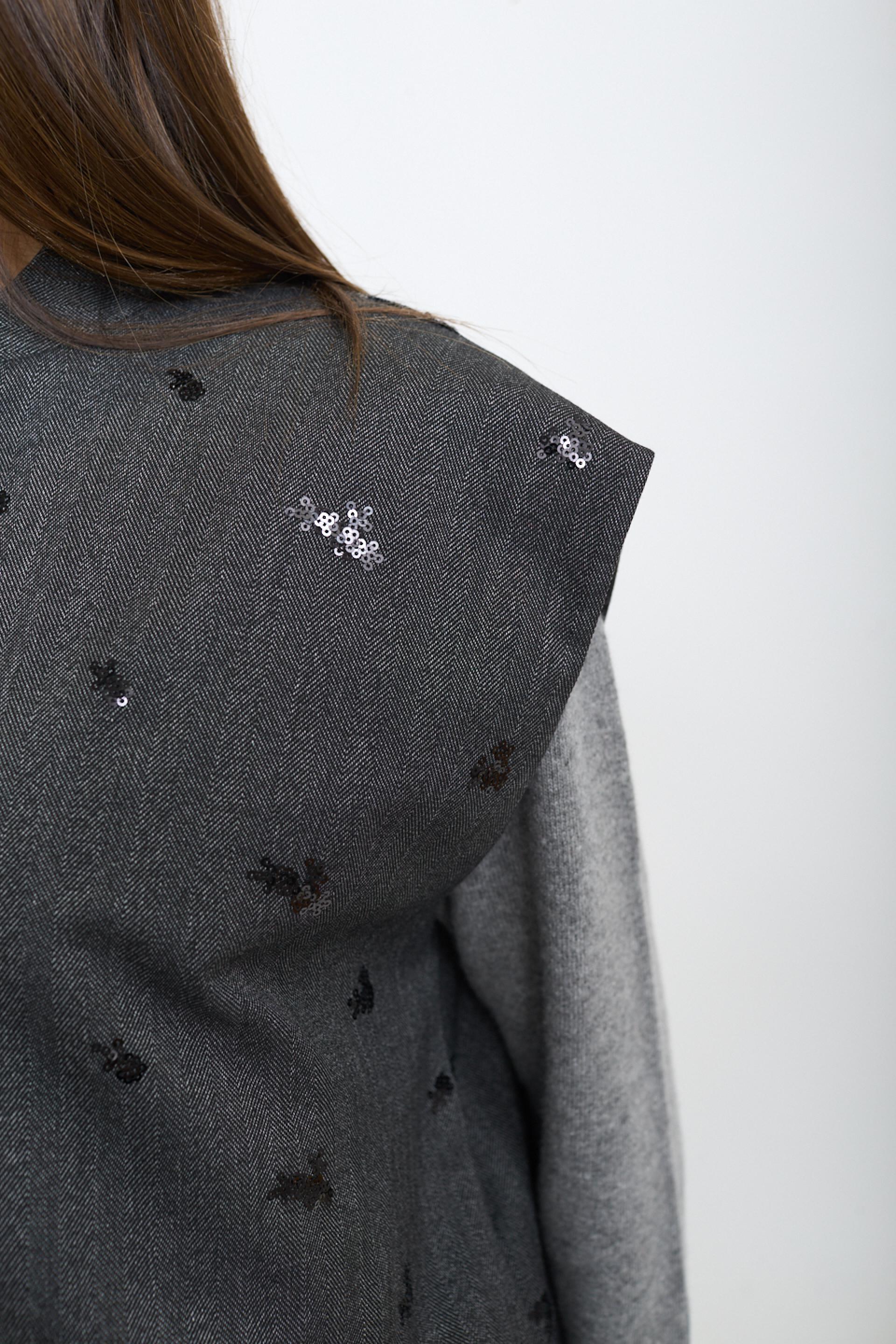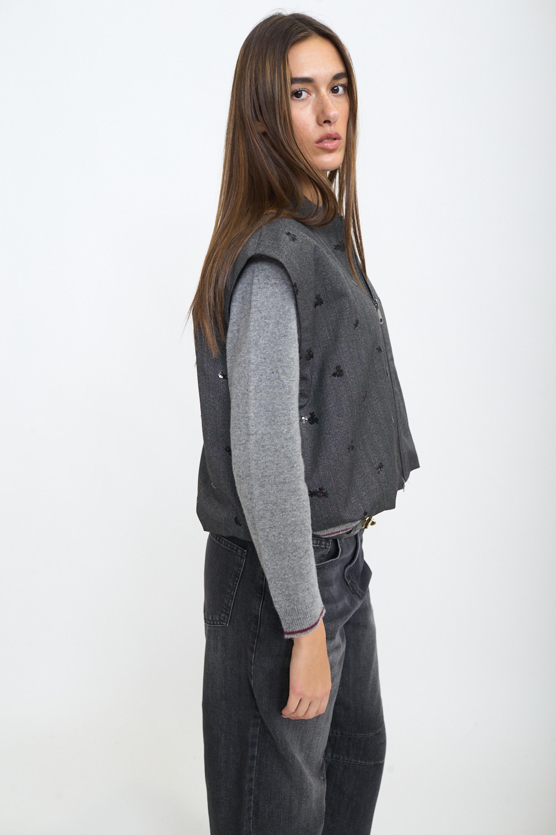 | Gilet trapuntato internamente con ricami di paillettes. Chiusura tramite zip frontale. | ||
