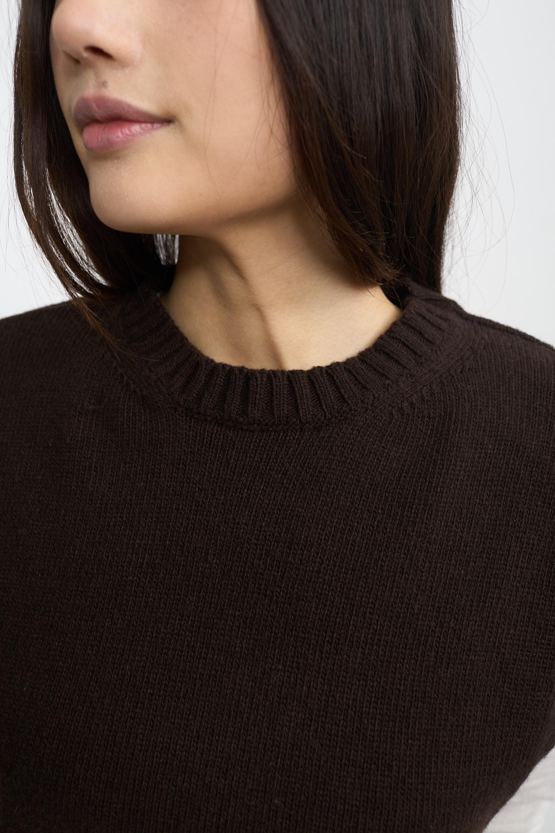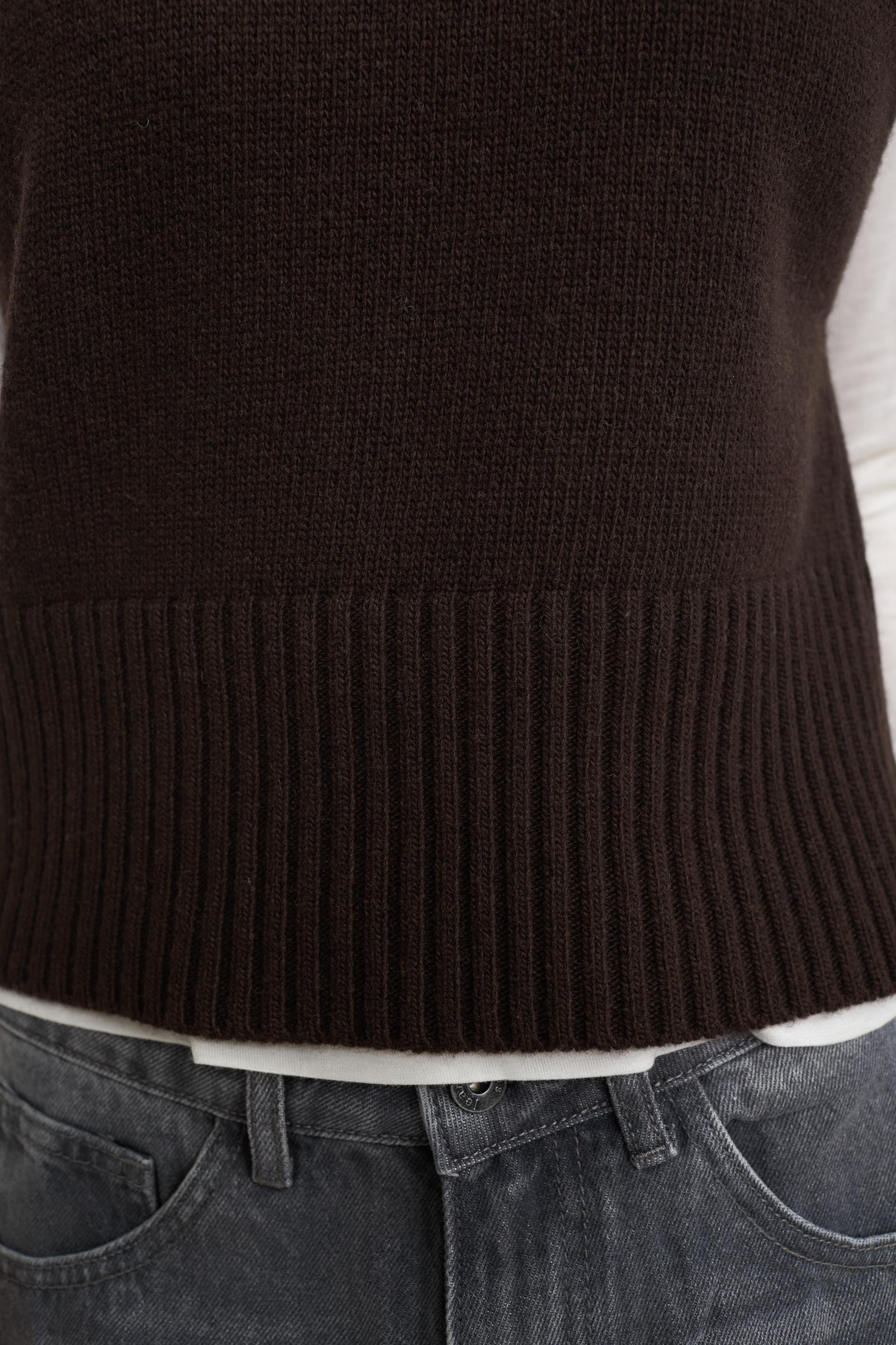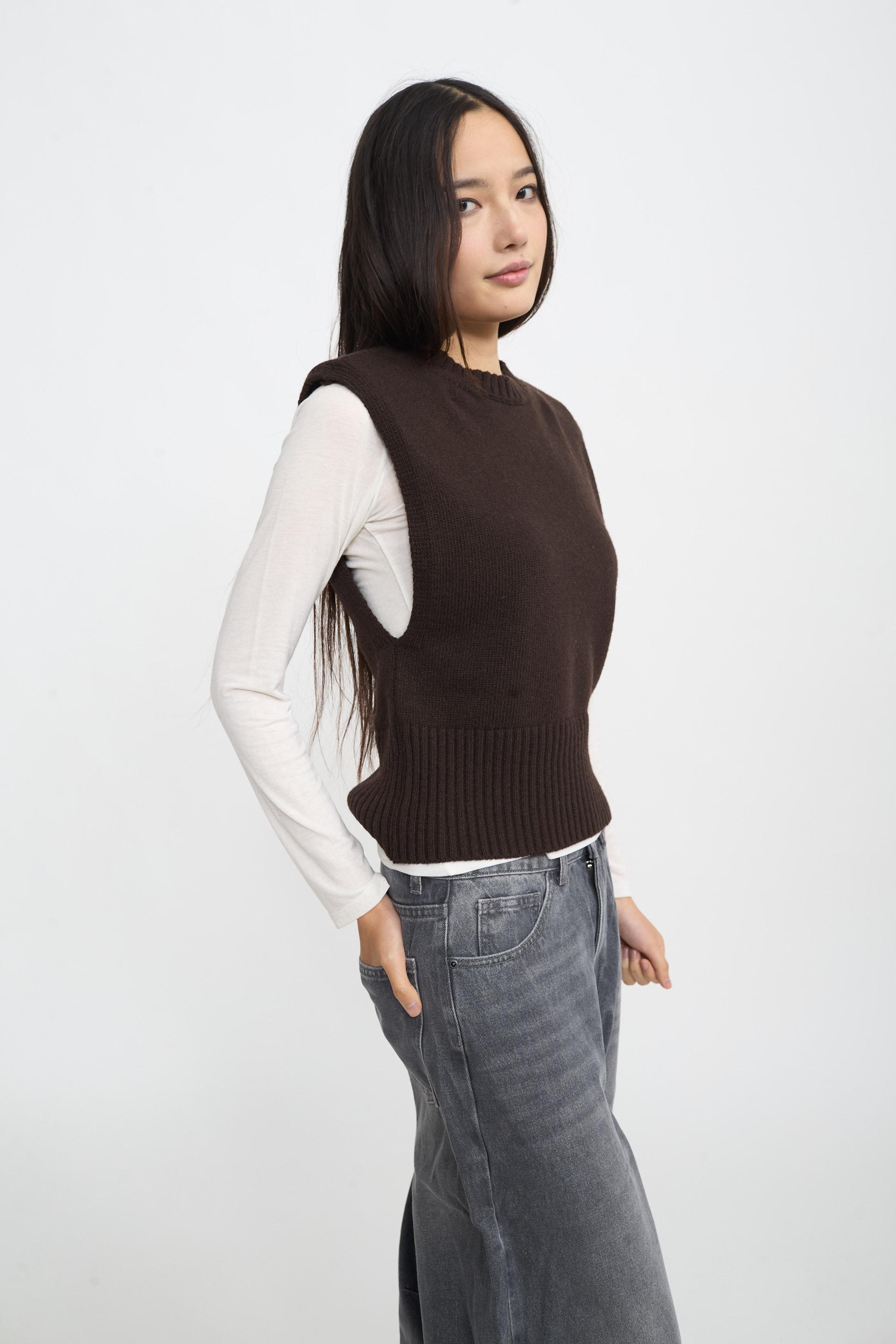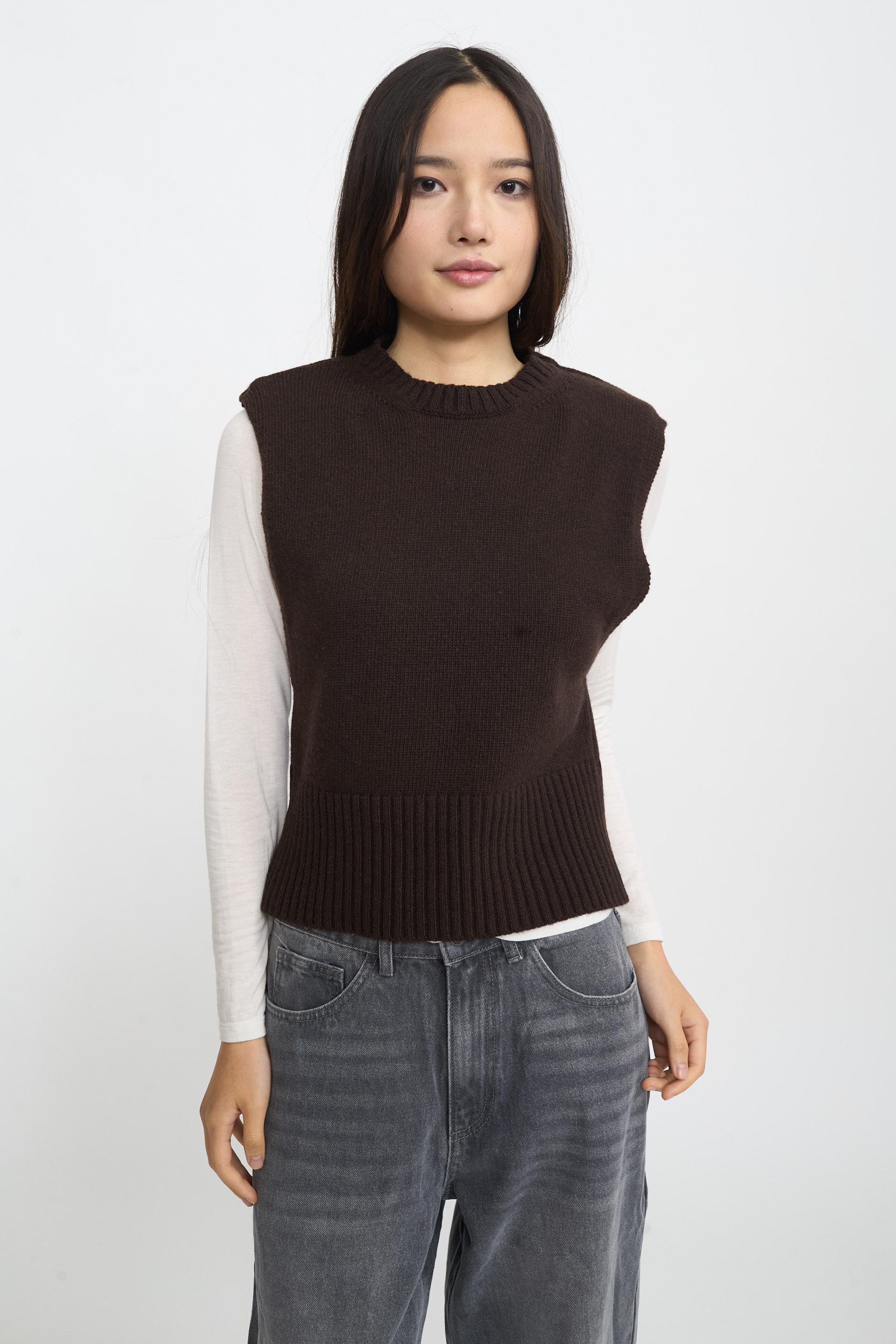 | Gilet girocollo in misto cachemire con spalline imbottite con dettaglio di lavorazione a costine su scollo e orlo. | ||