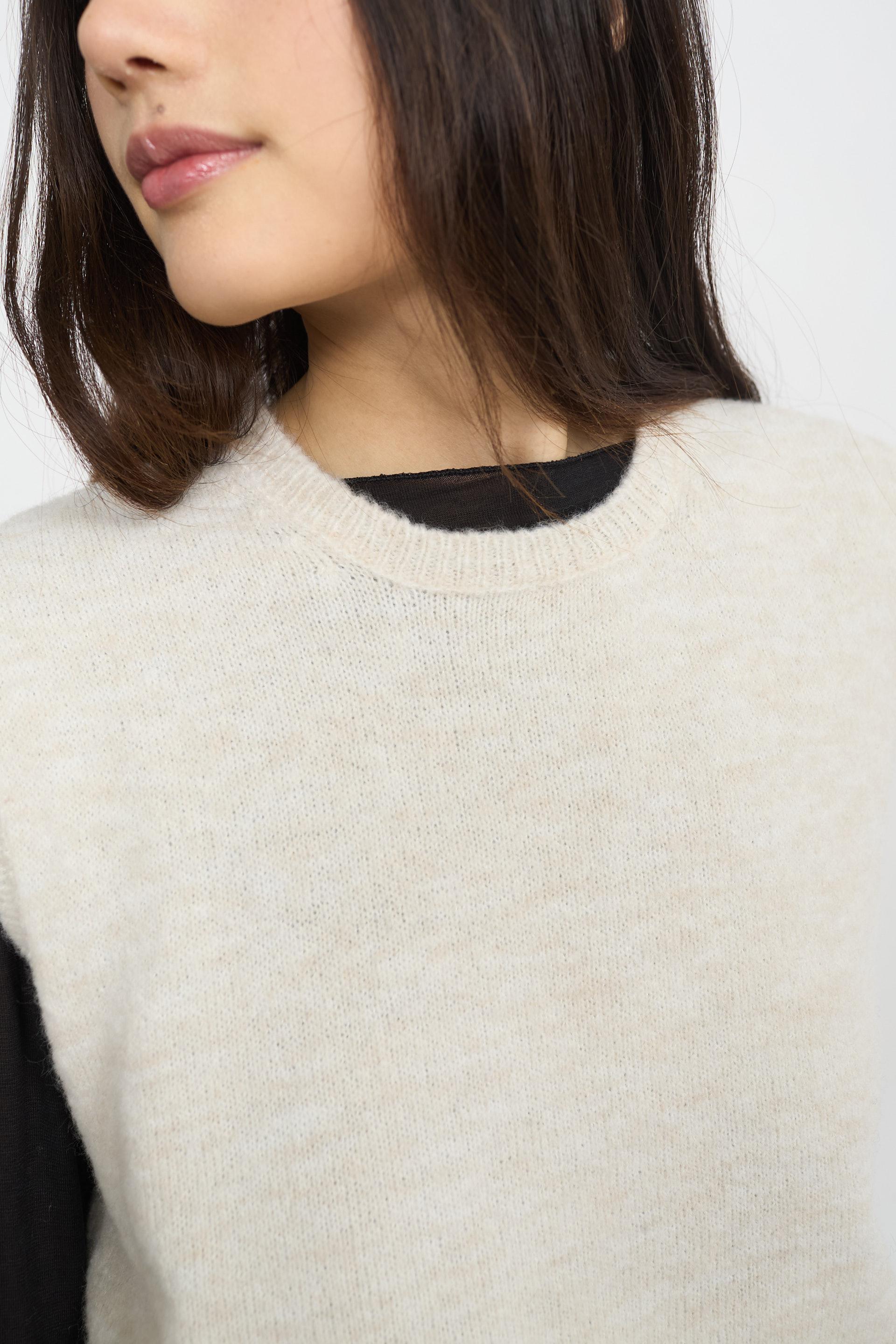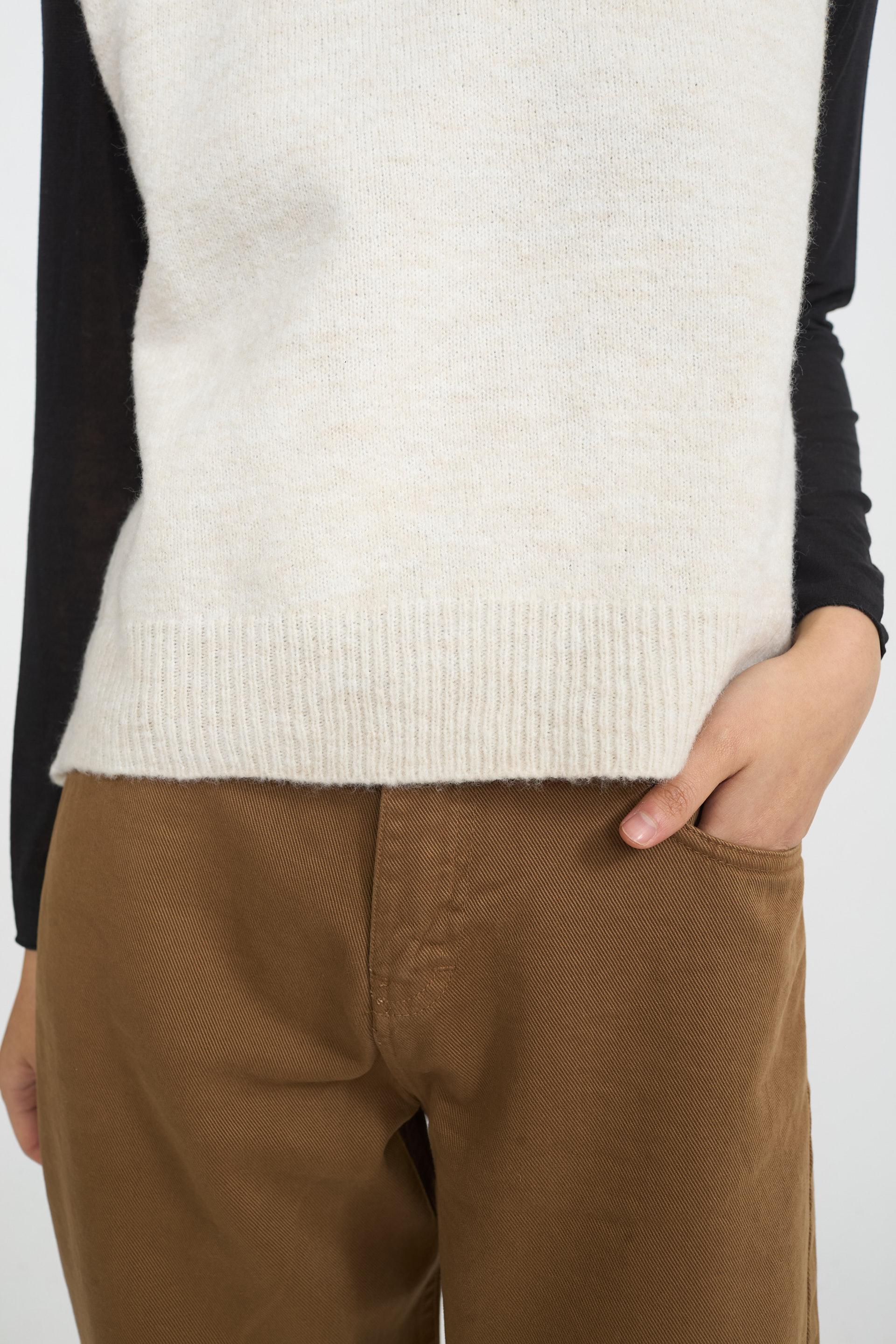 | Gilet scollo rotondo misto lana. Dettaglio di lavorazione a coste su scollo, giromanica e orlo. | ||