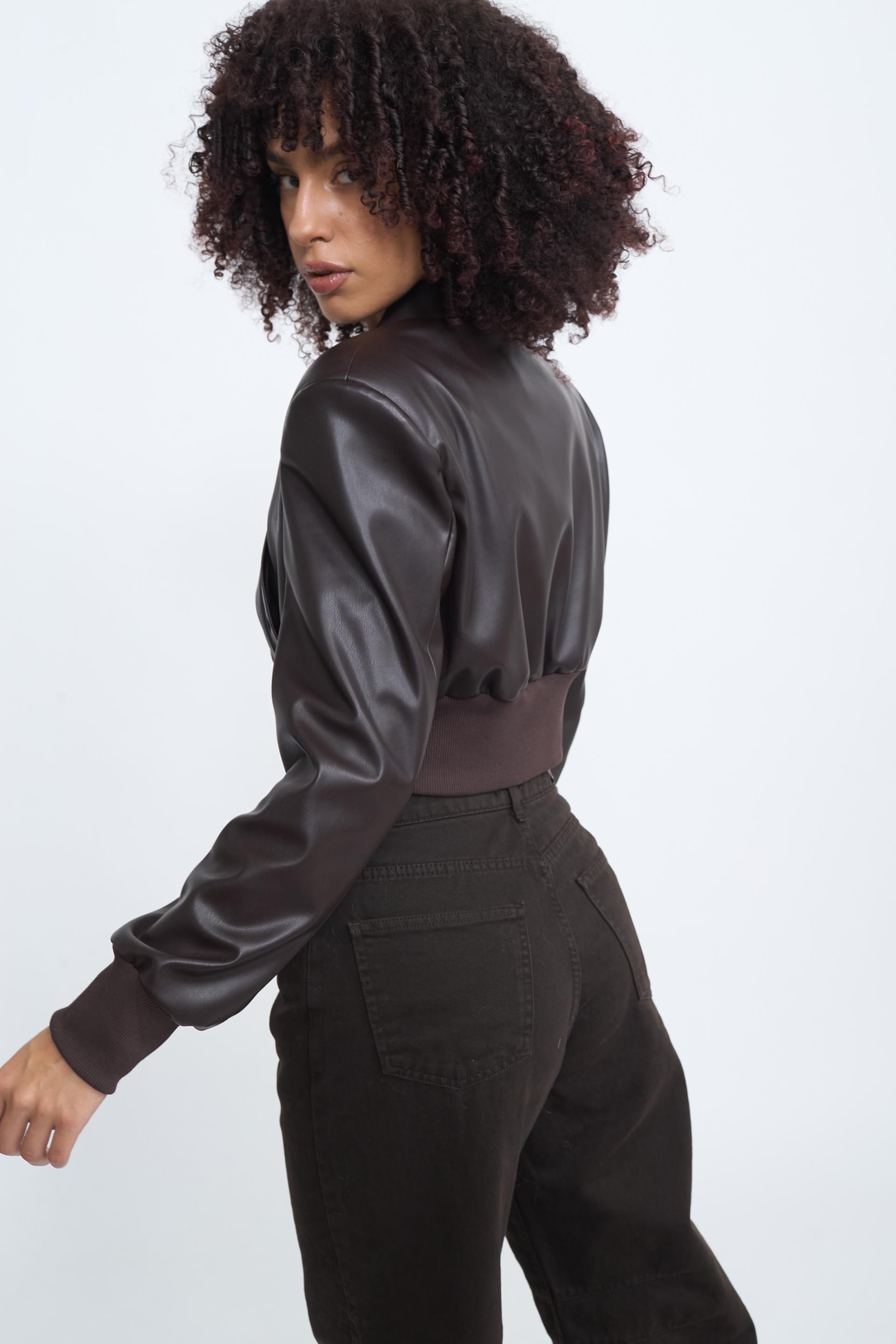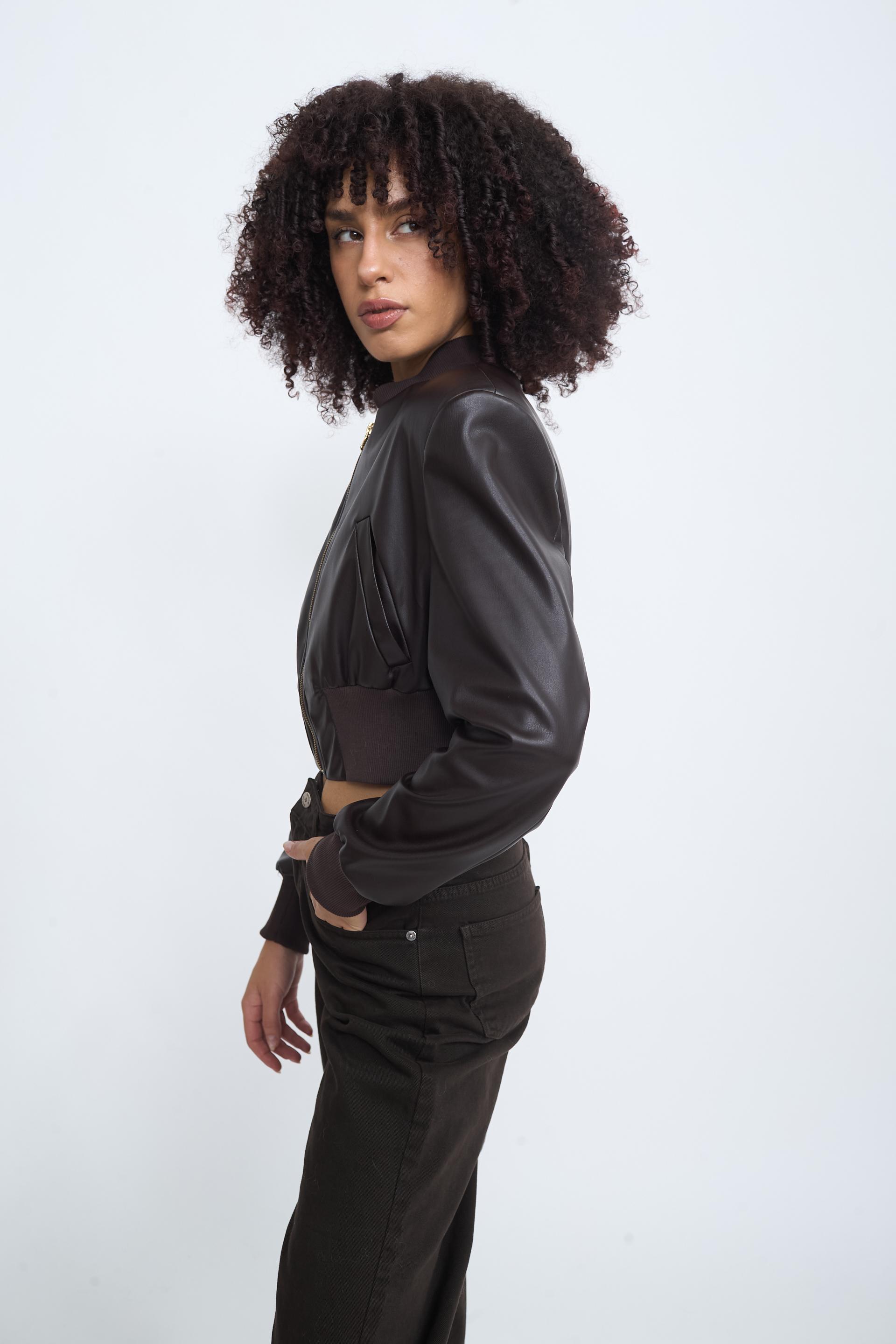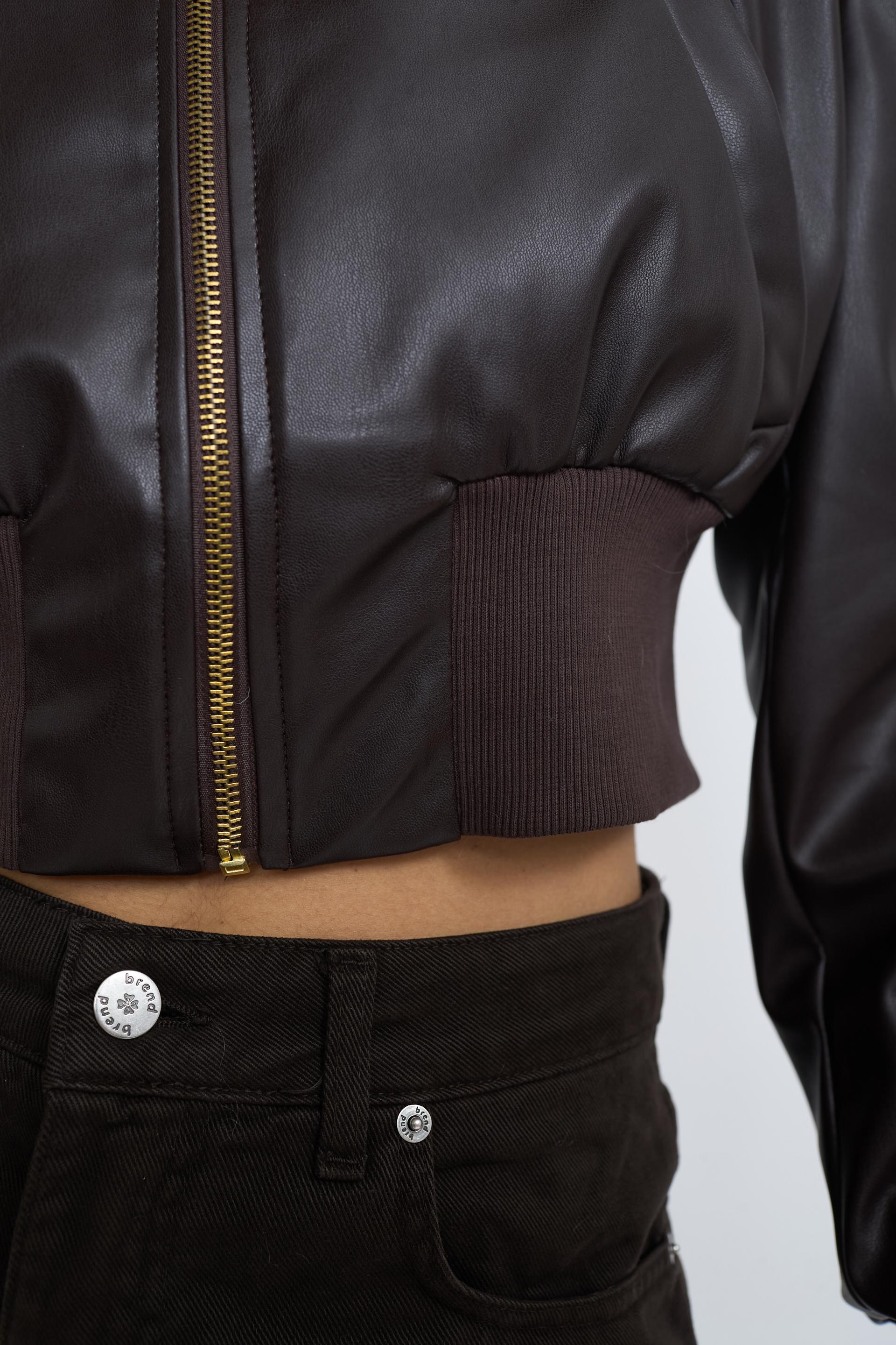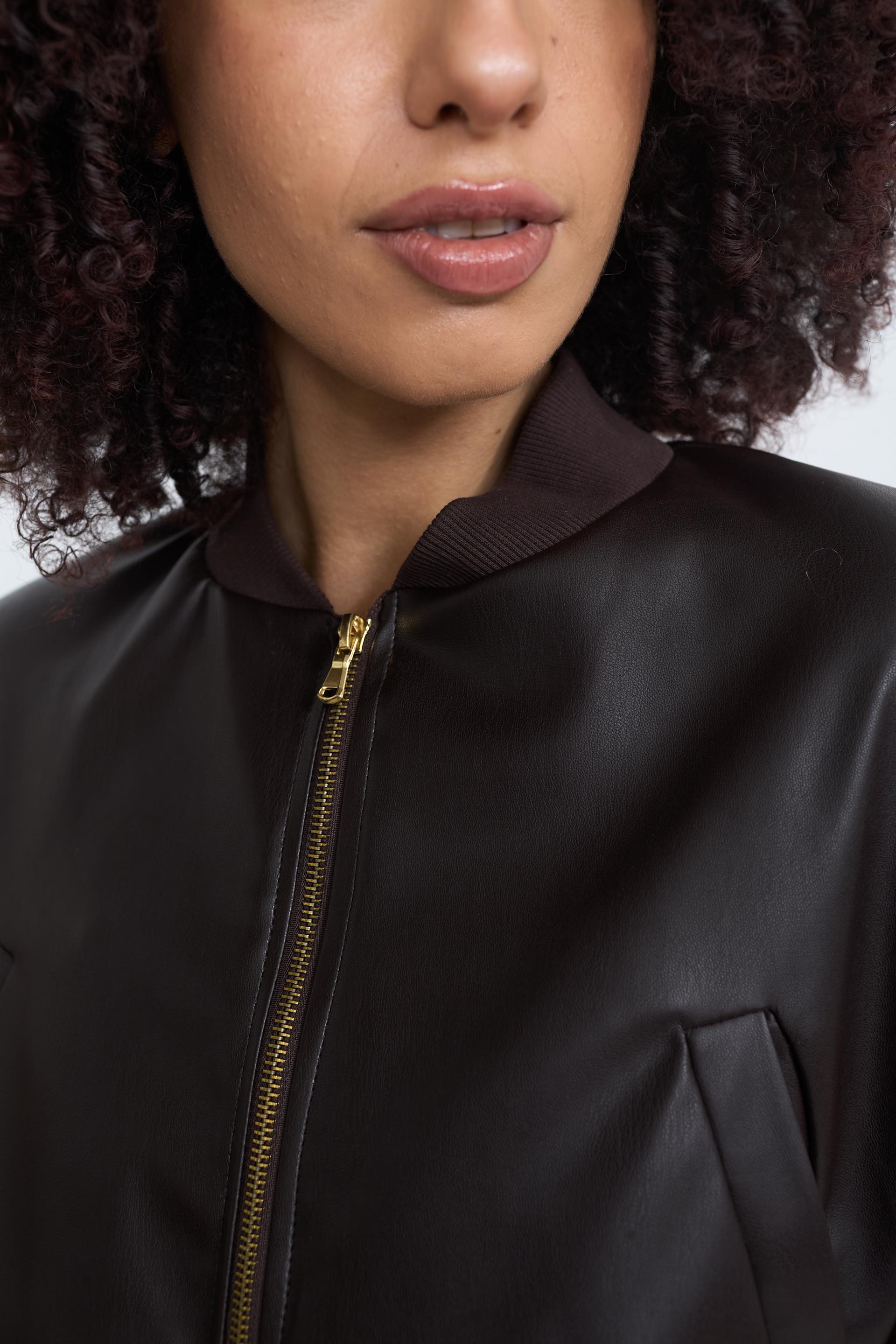 Giubbino baseball effetto pelle con collo e fascia in felpa a costine. Chiusura tramite zip centrale. Fodera interna | ||