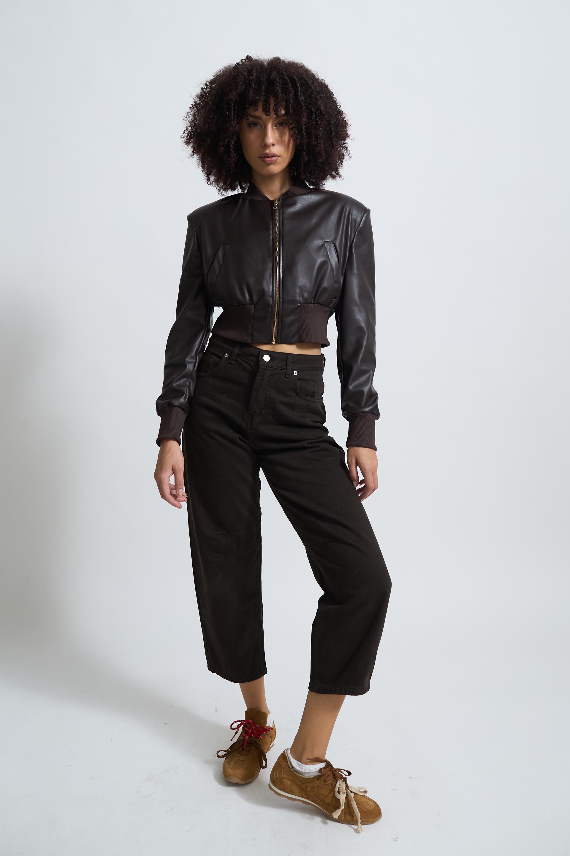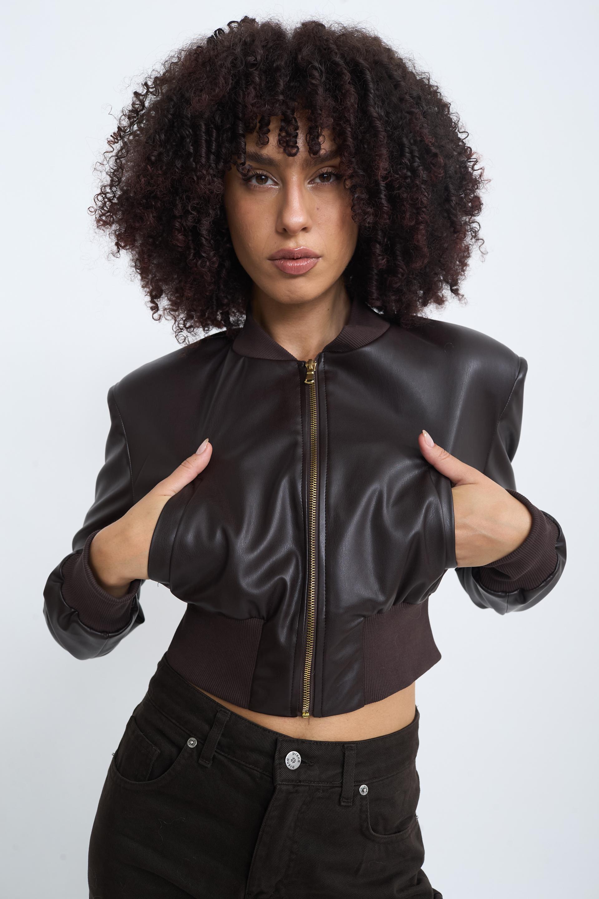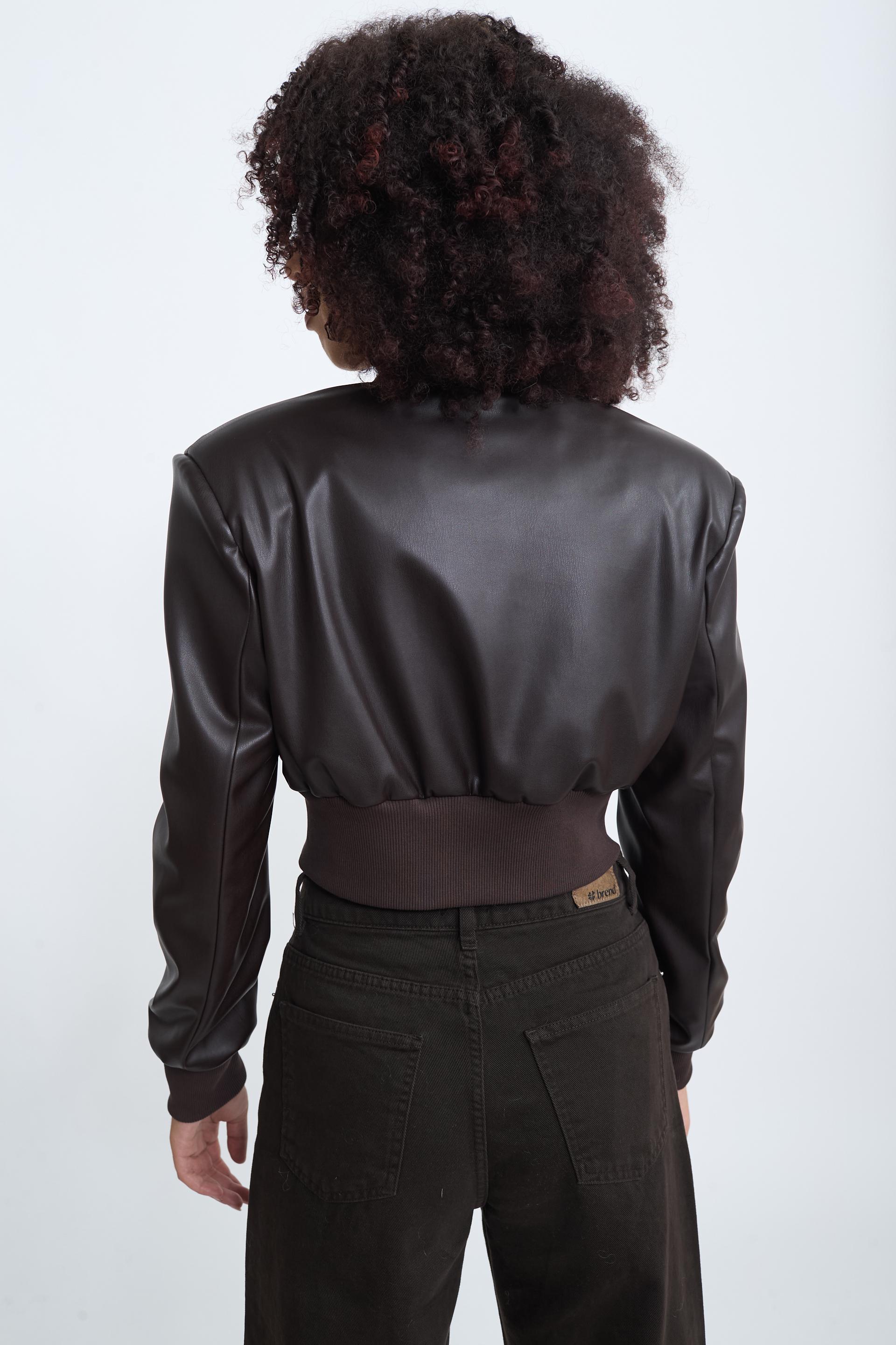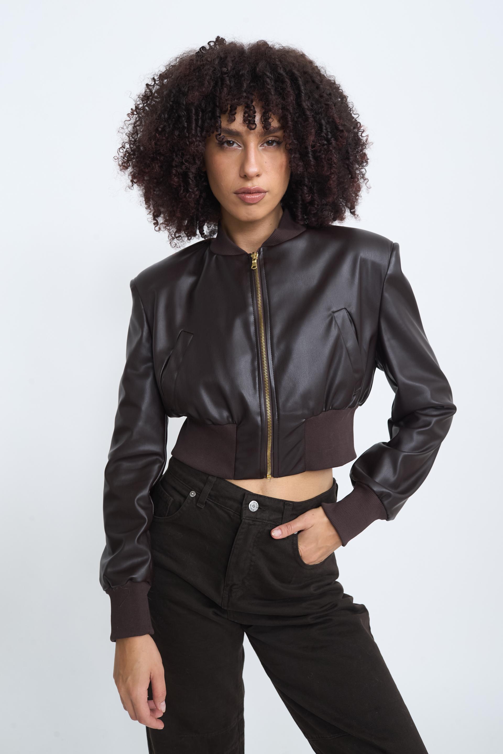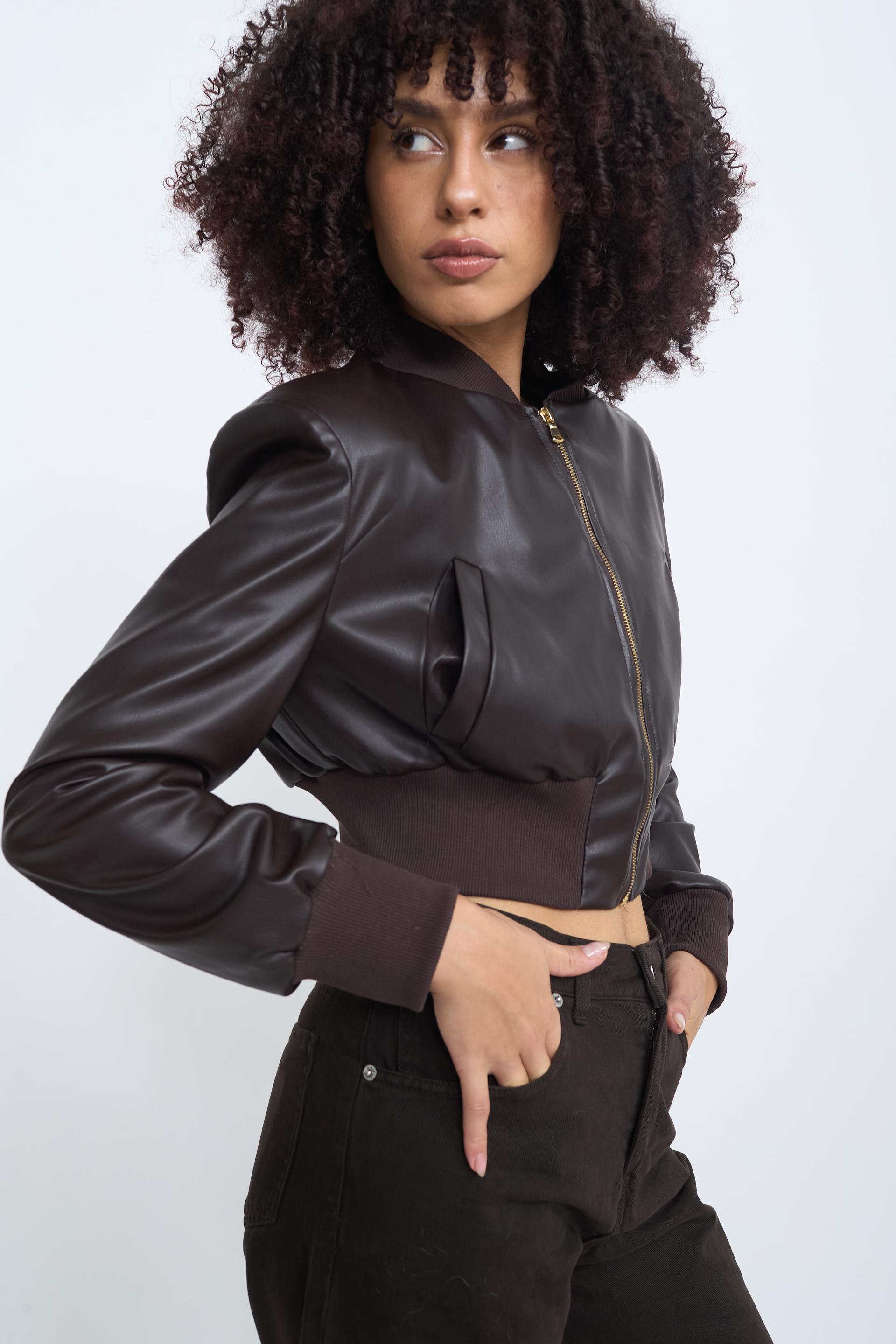 Giubbino baseball effetto pelle con collo e fascia in felpa a costine. Chiusura tramite zip centrale. Fodera interna | ||