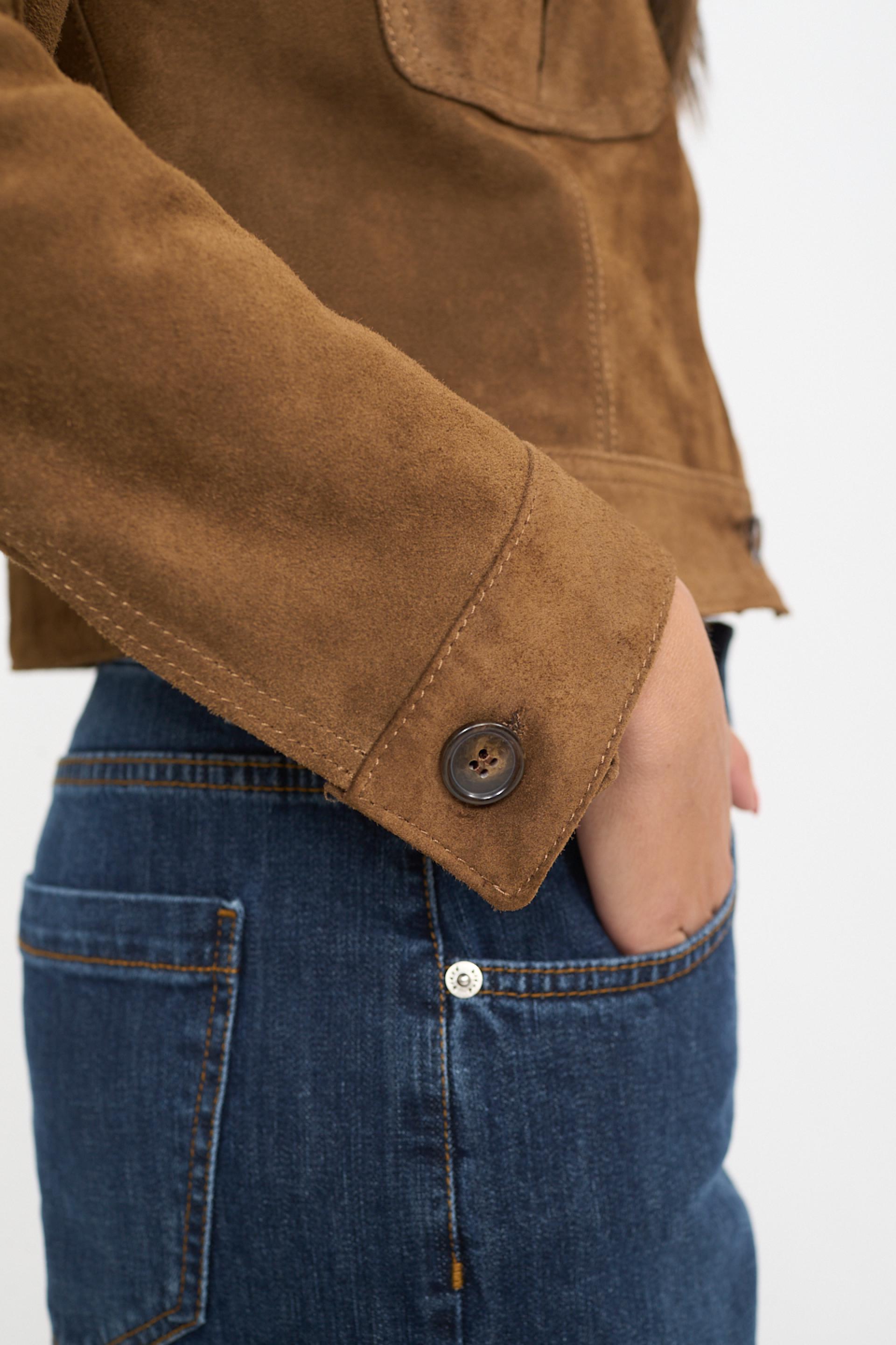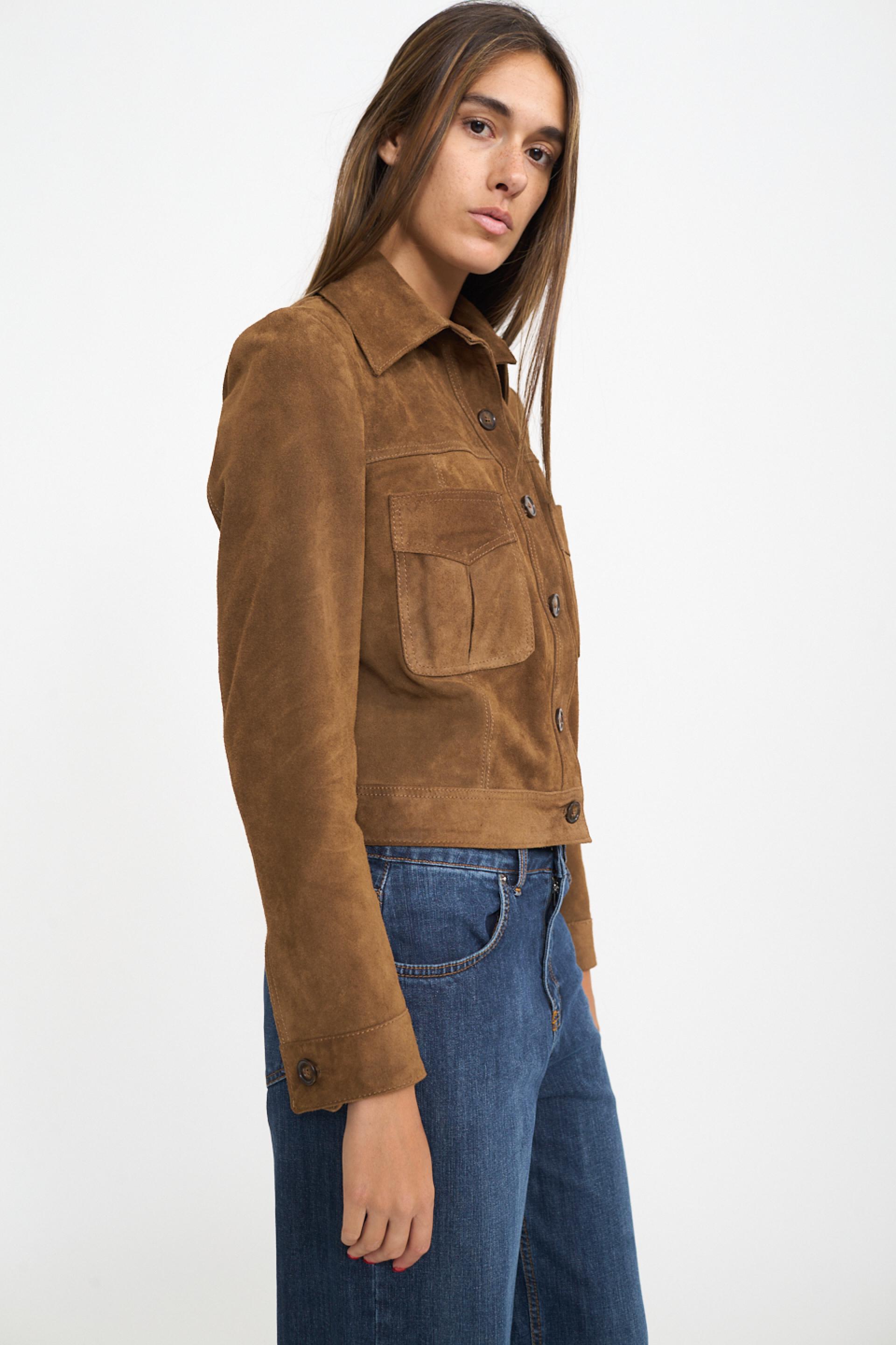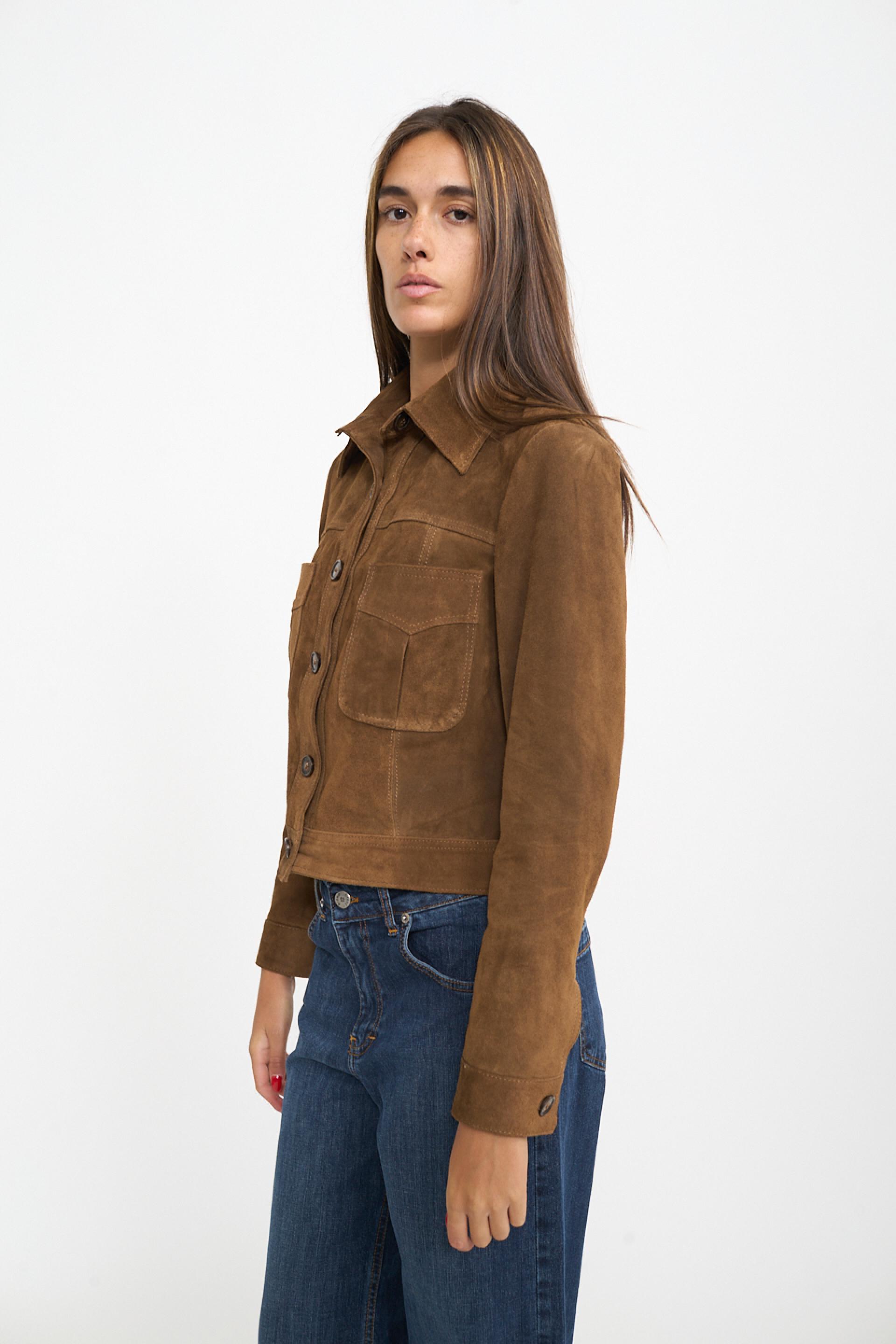 | Giubbino scamosciato con tasche applicate. Fodera interna tono su tono. Chiusura tramite 6 bottoni. | ||