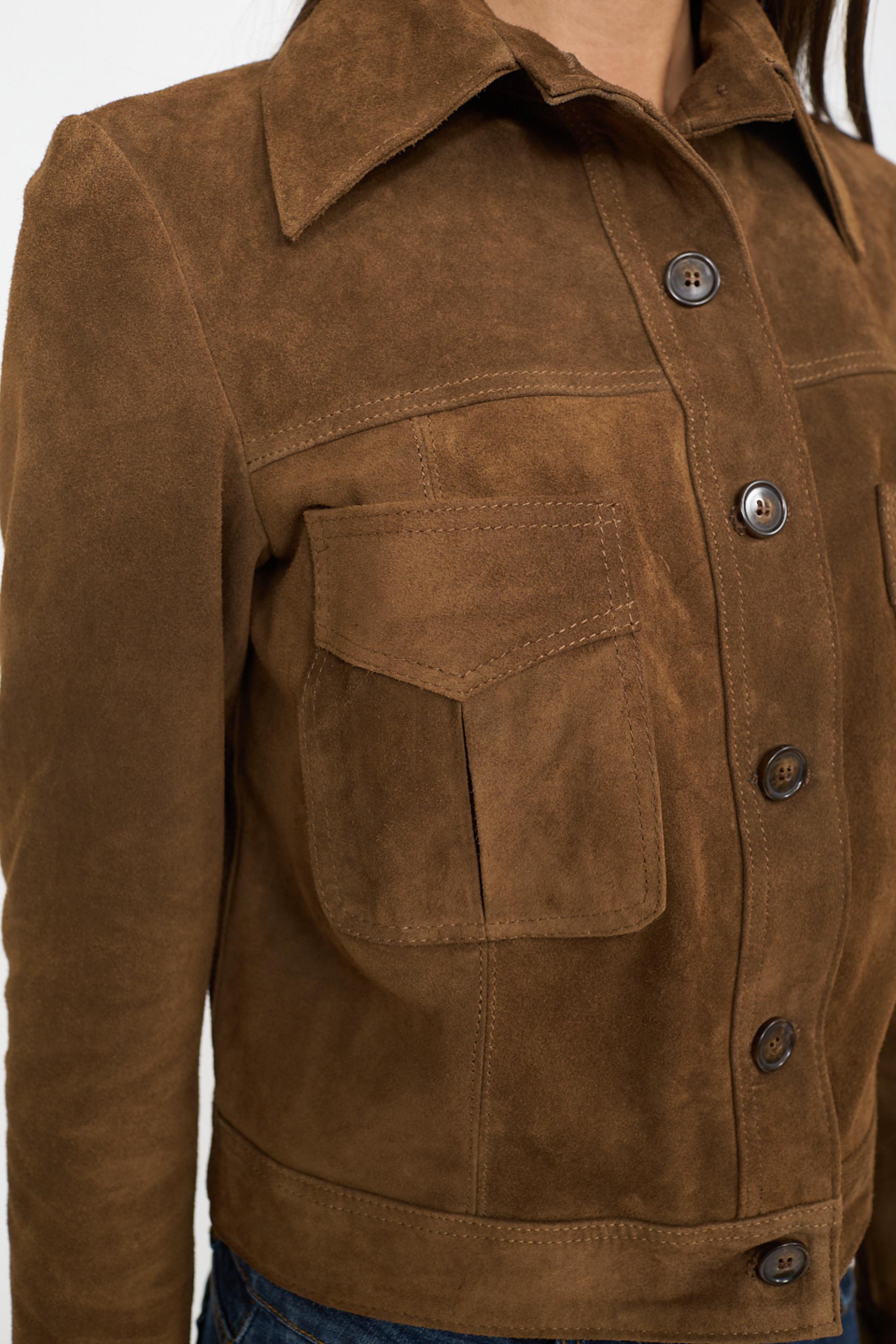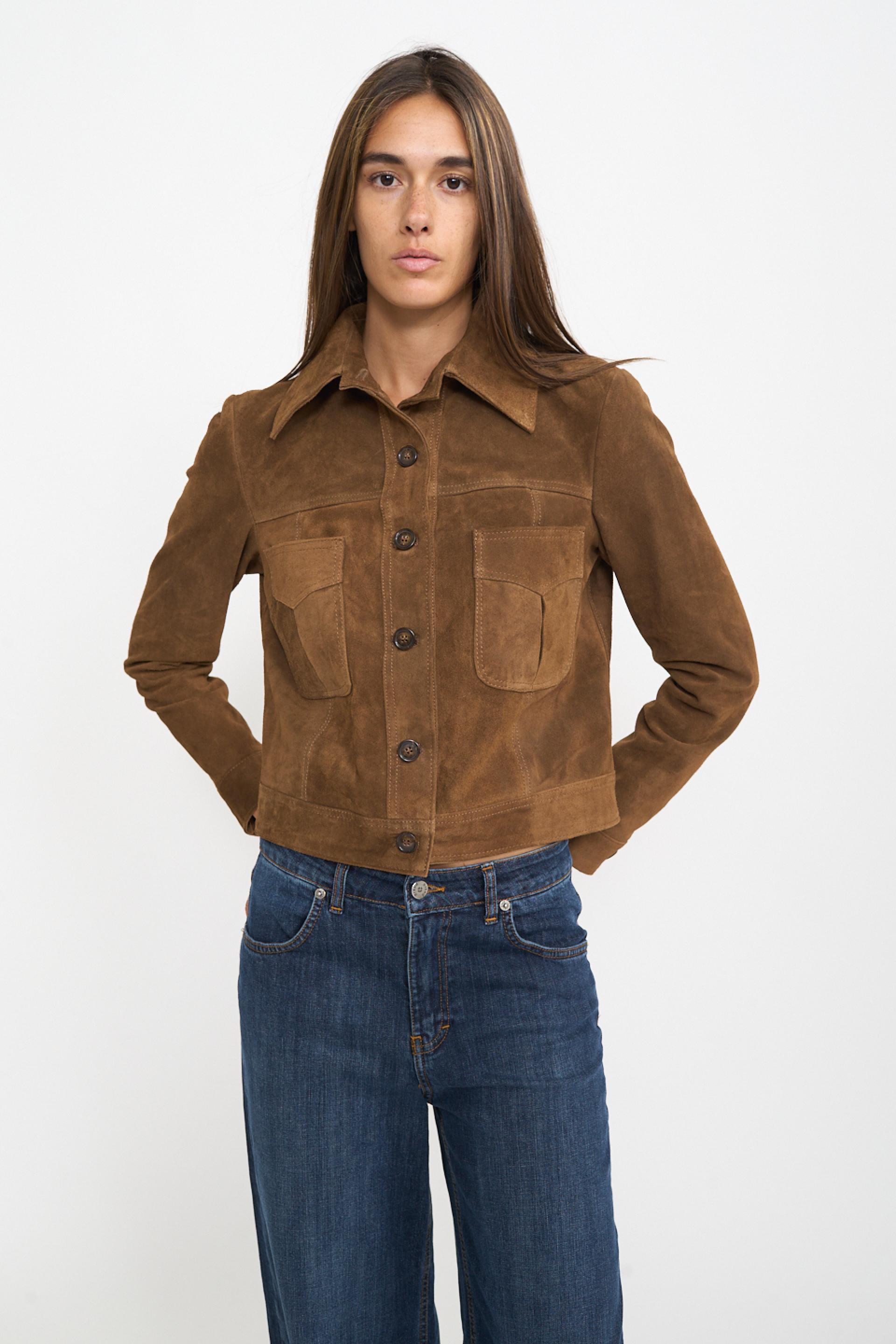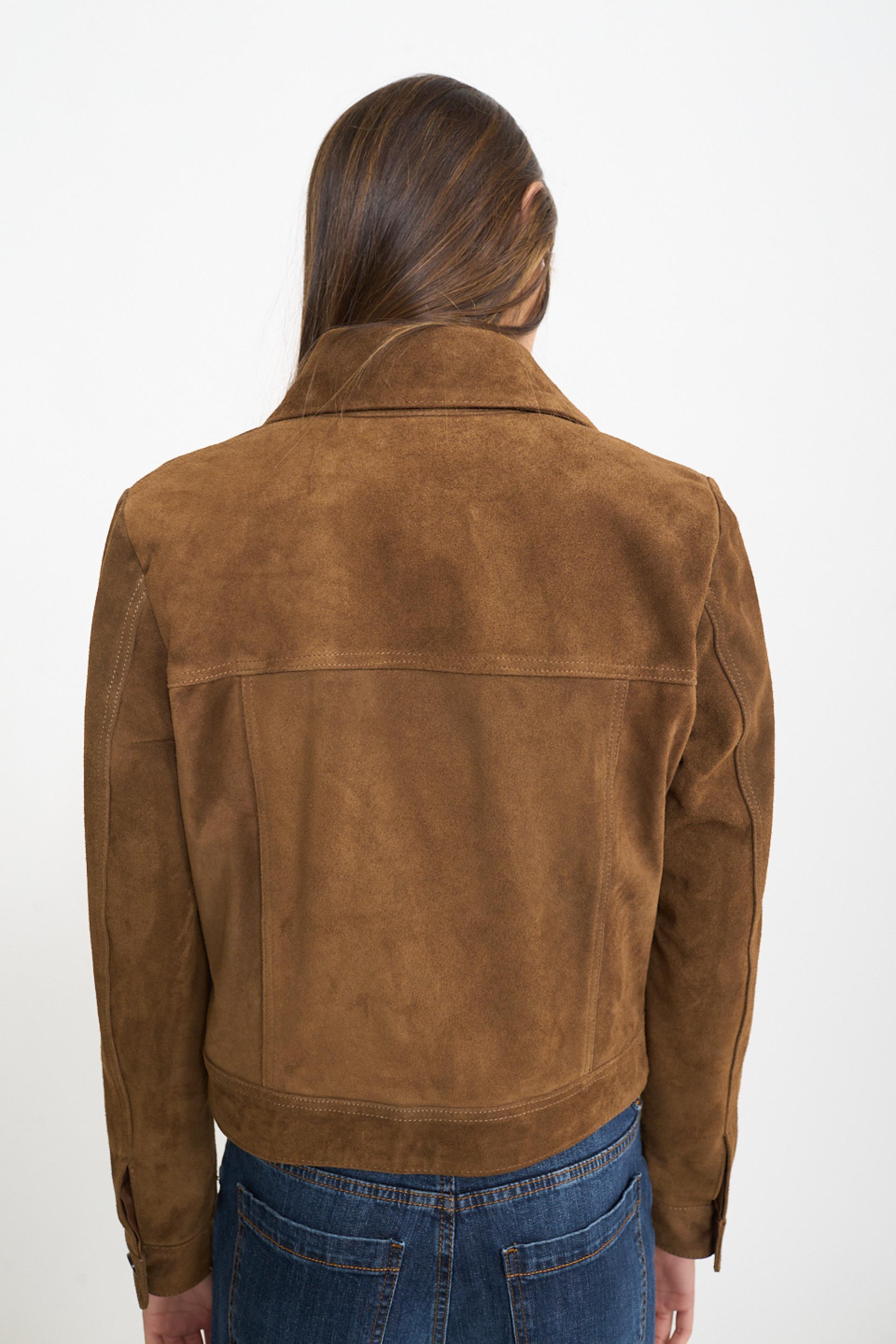 | Giubbino scamosciato con tasche applicate. Fodera interna tono su tono. Chiusura tramite 6 bottoni. | ||