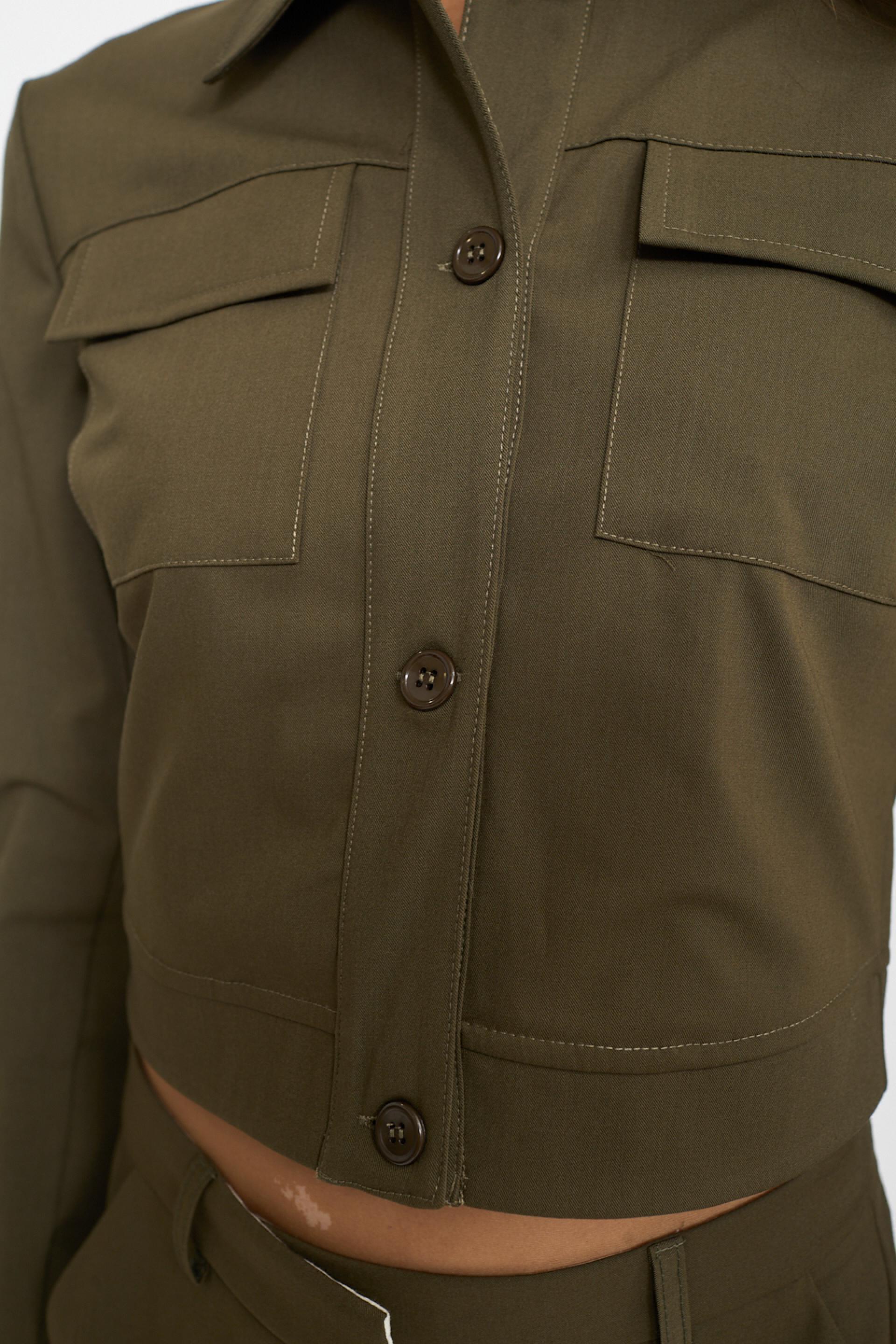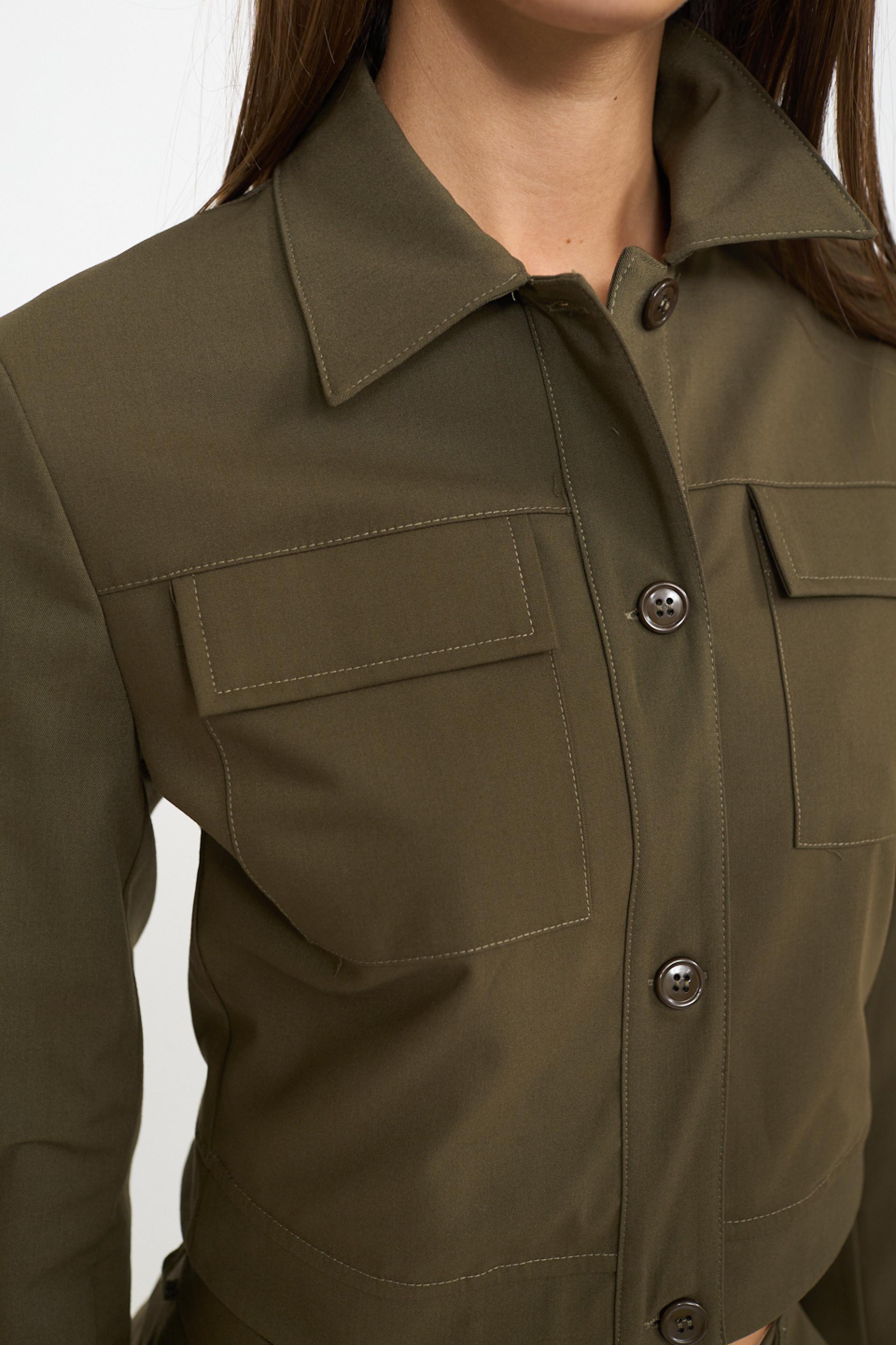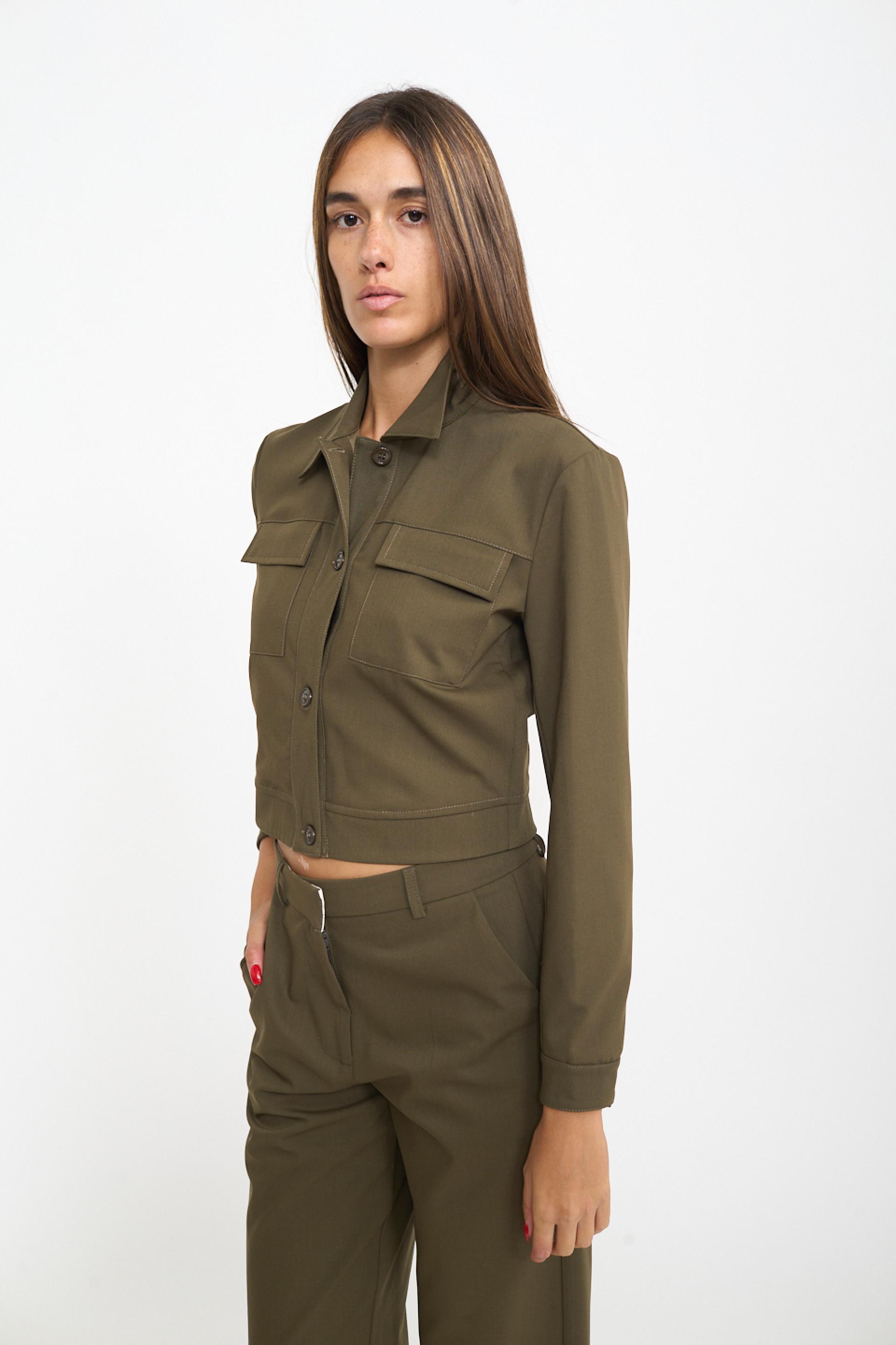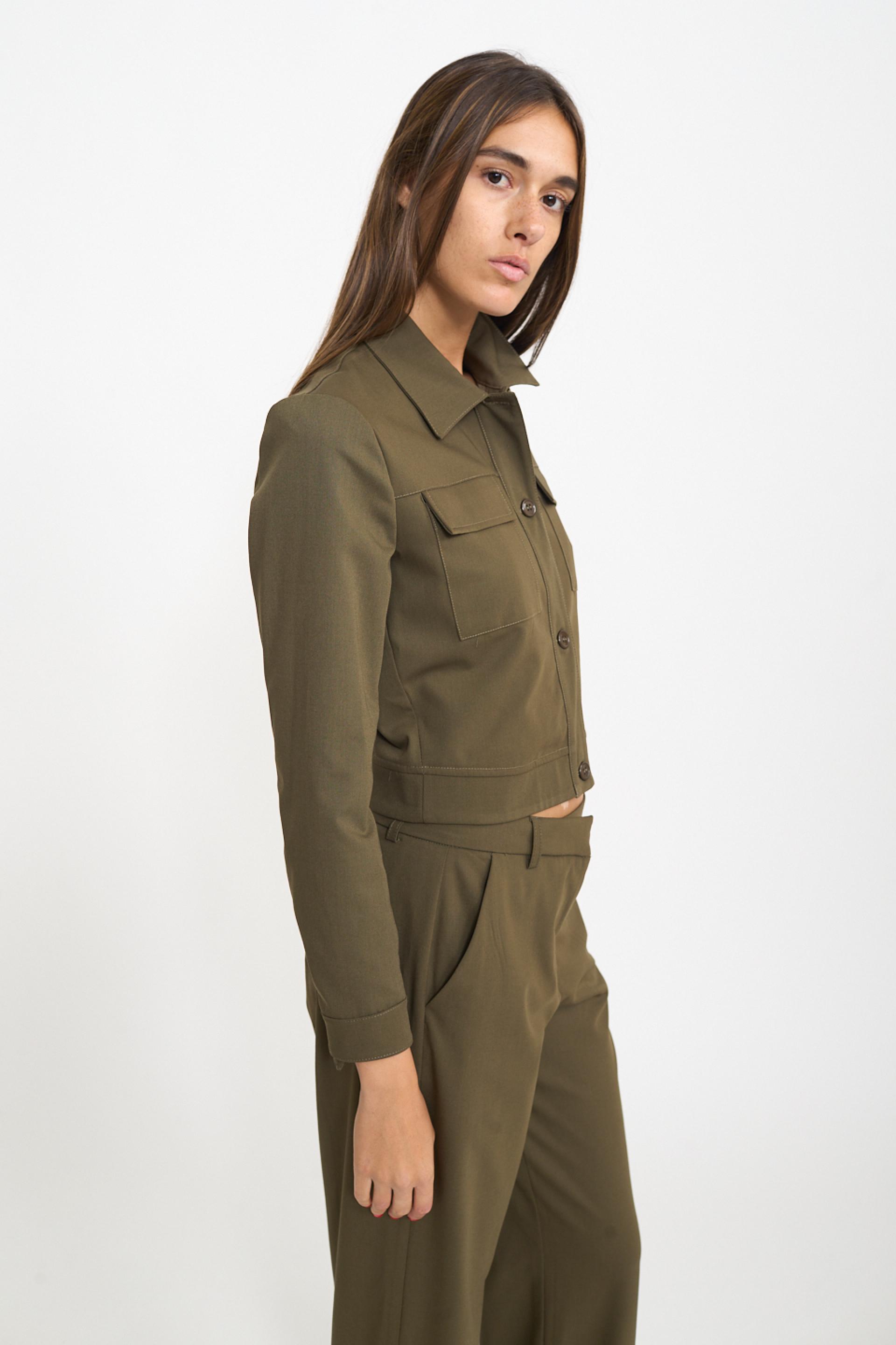 | Giubbino cropped con tasche con pattine sul petto. Fodera interna tono su tono. Bottone ai polsi. Chiusura frontale tramite 4 bottoni tono su tono. | ||