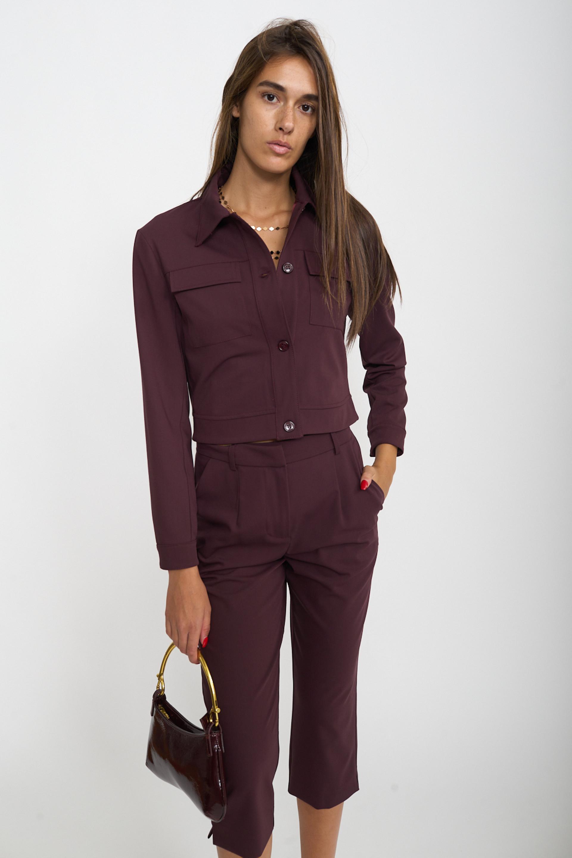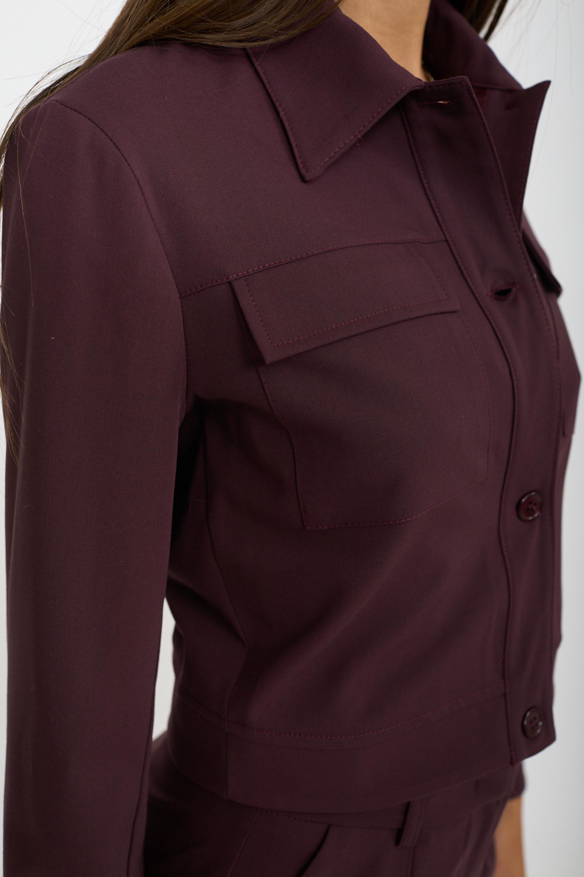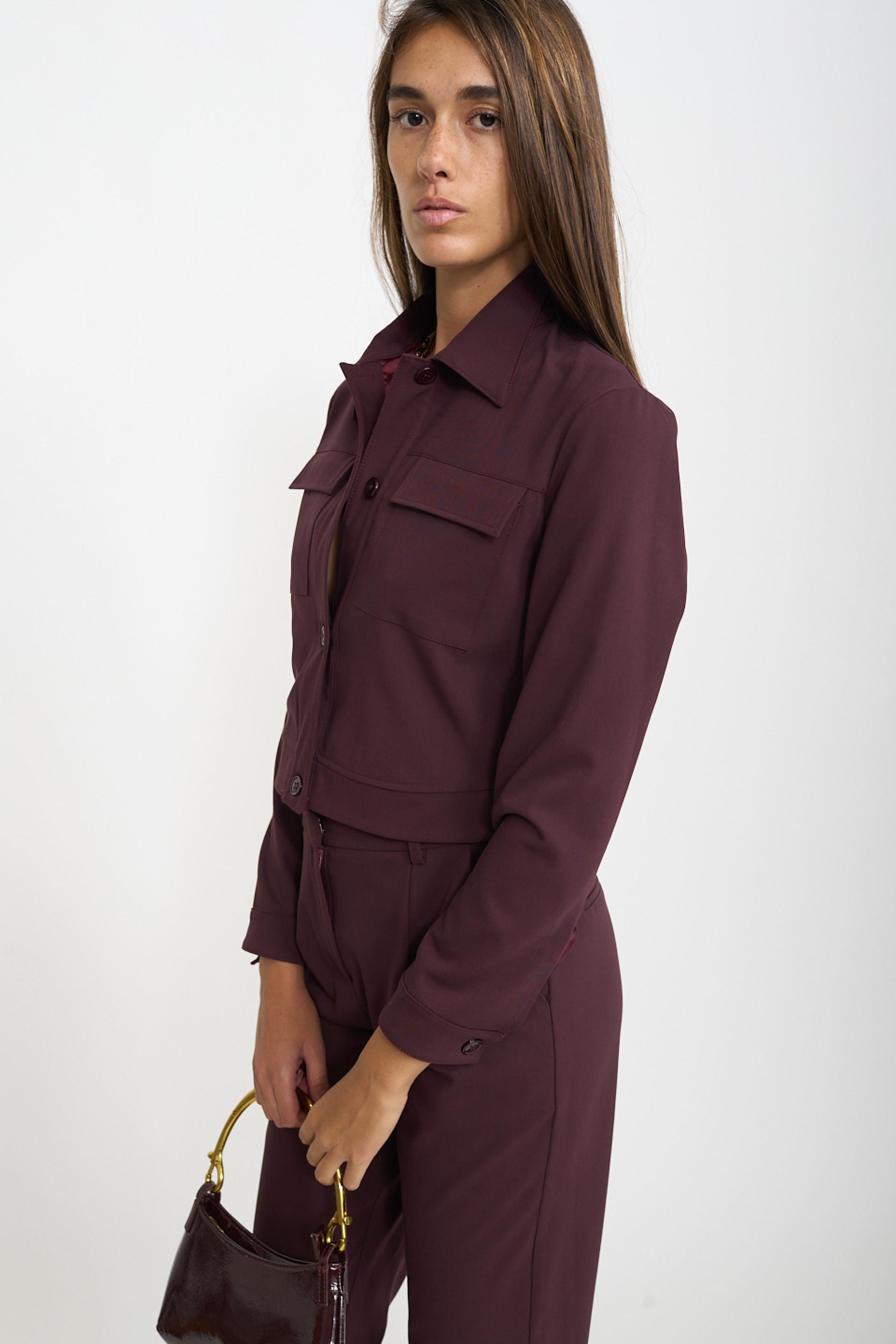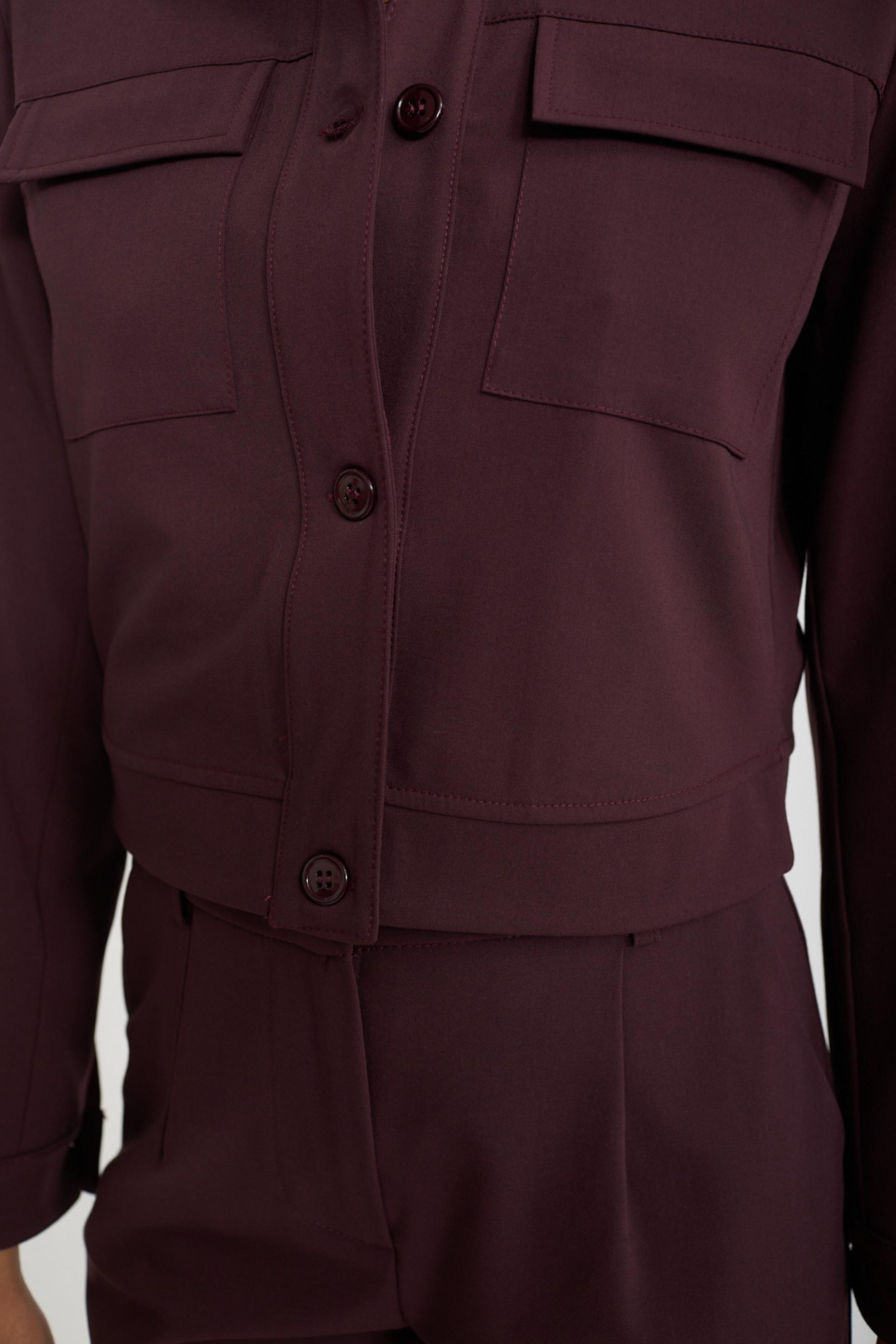 | Giubbino cropped con tasche con pattine sul petto. Fodera interna tono su tono. Bottone ai polsi. Chiusura frontale tramite 4 bottoni tono su tono. | ||