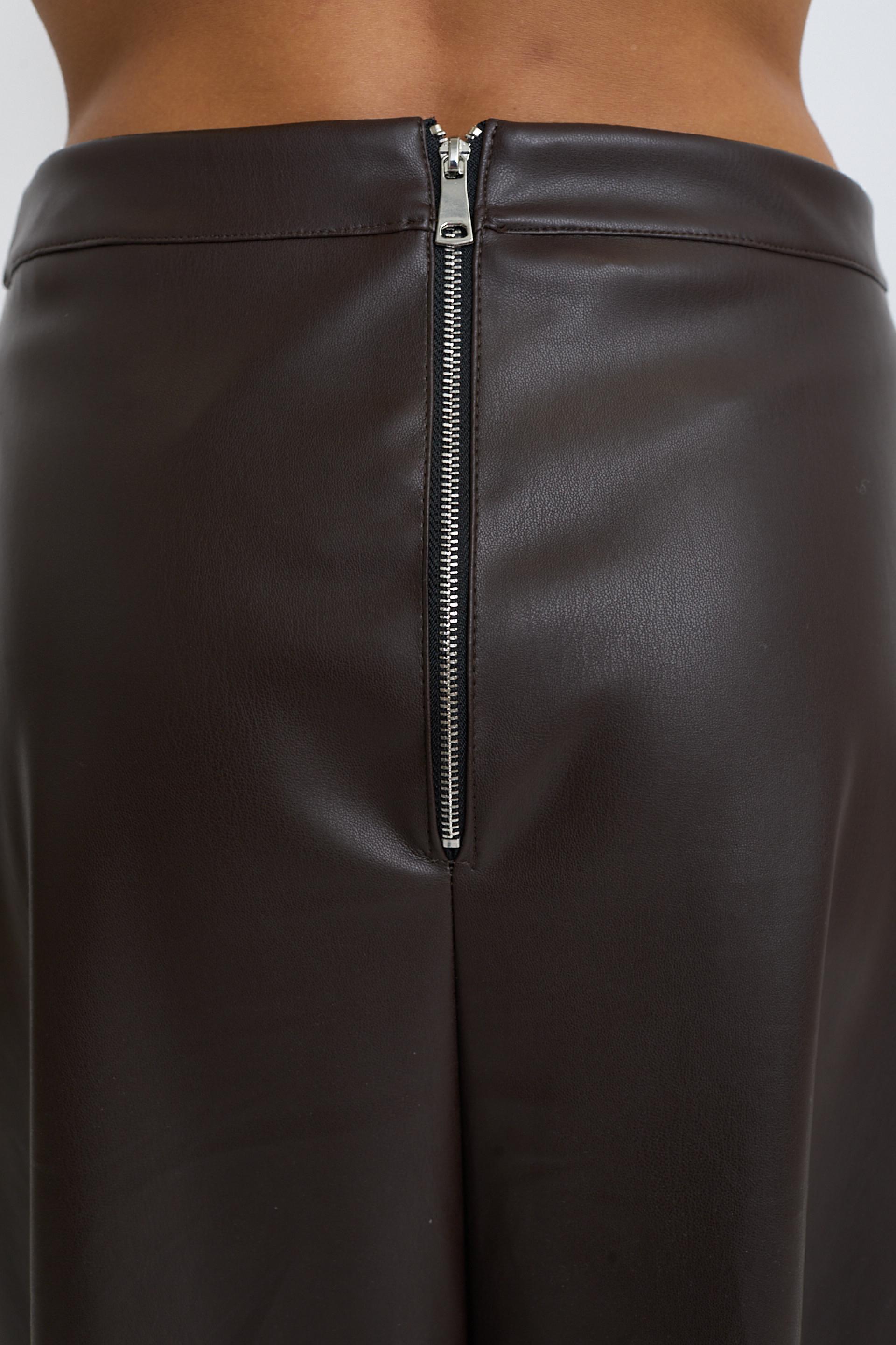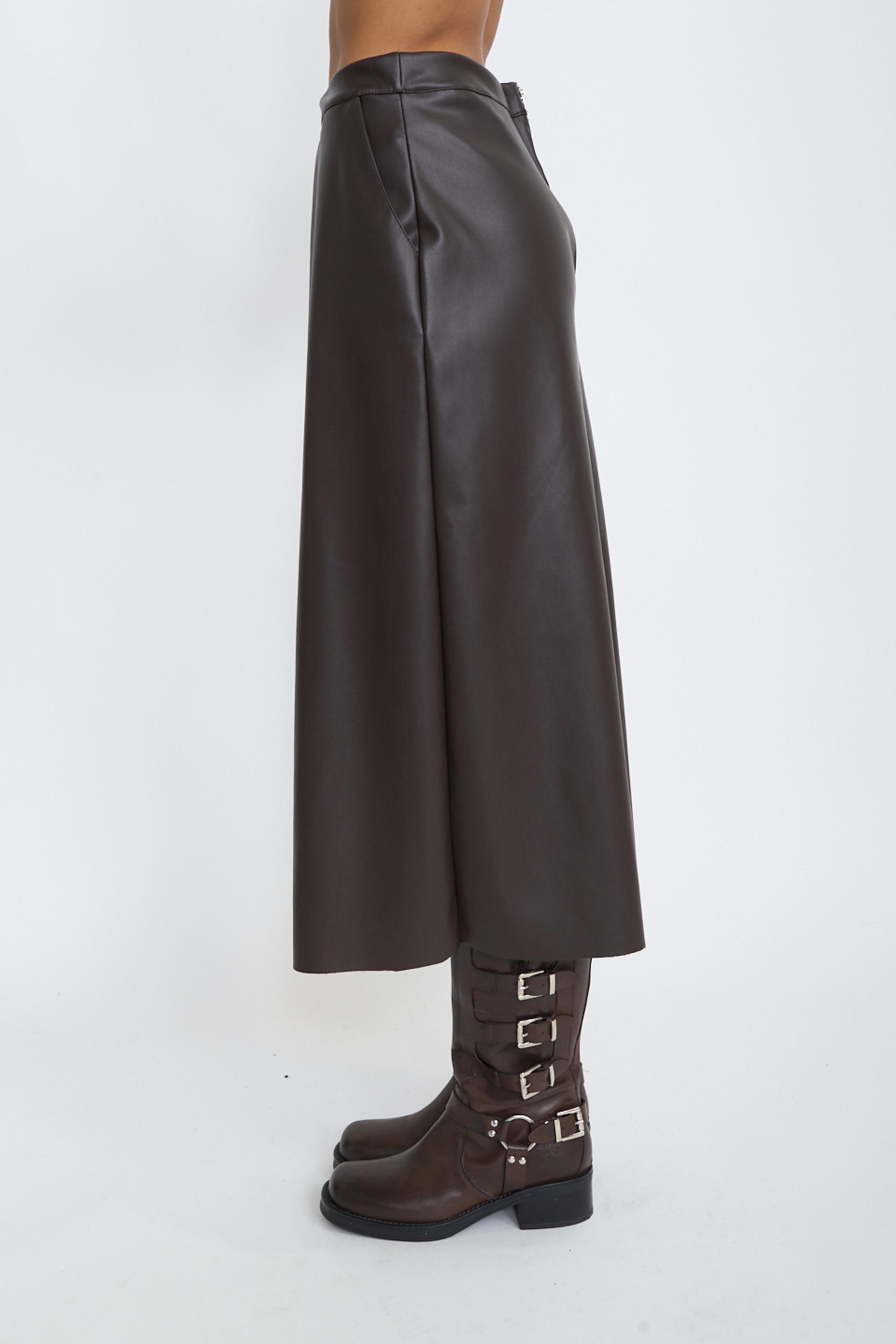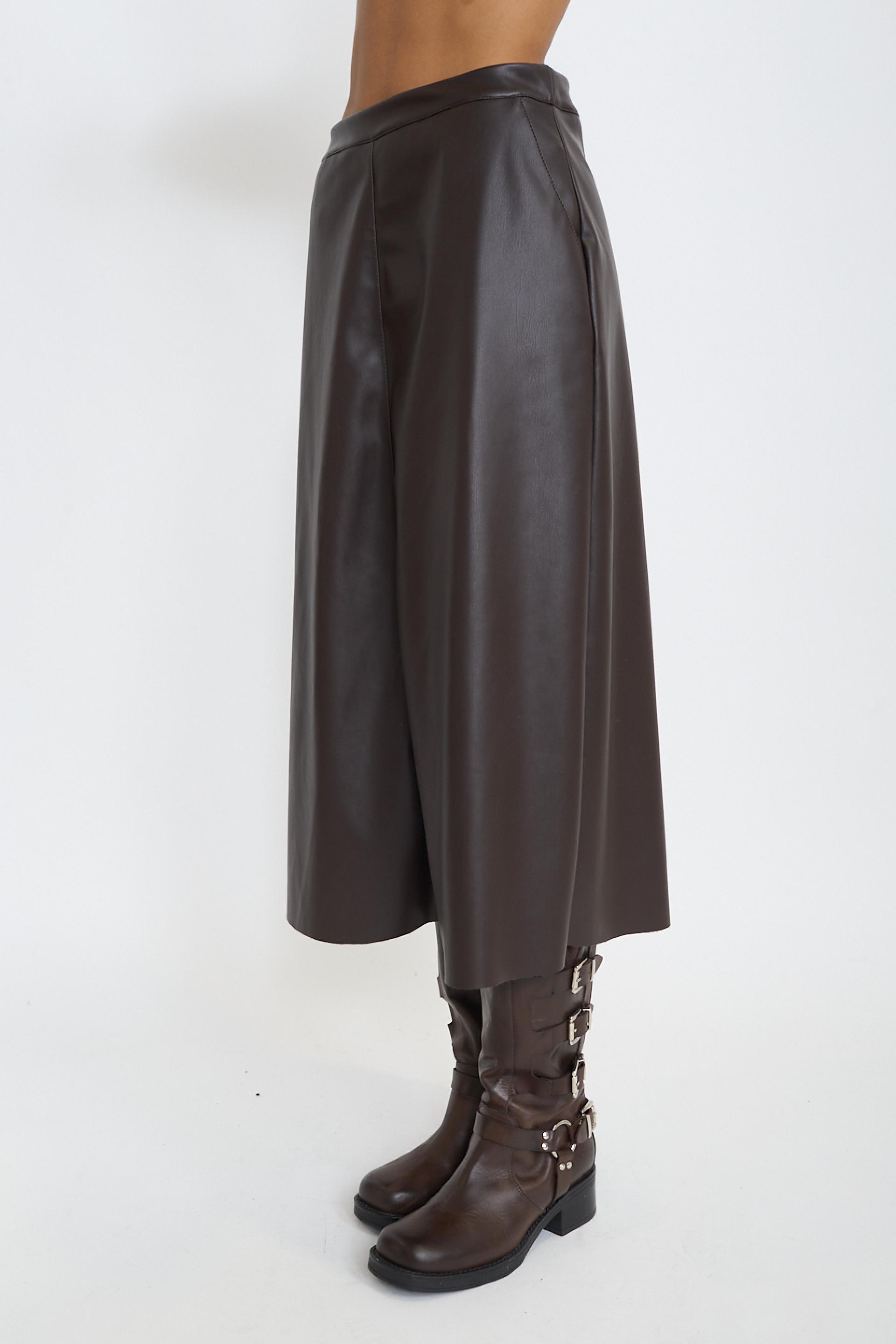 | Gonna svasata effetto pelle con tasche laterali e orlo a taglio vivo. Chiusura tramite cerniera posteriore. | ||