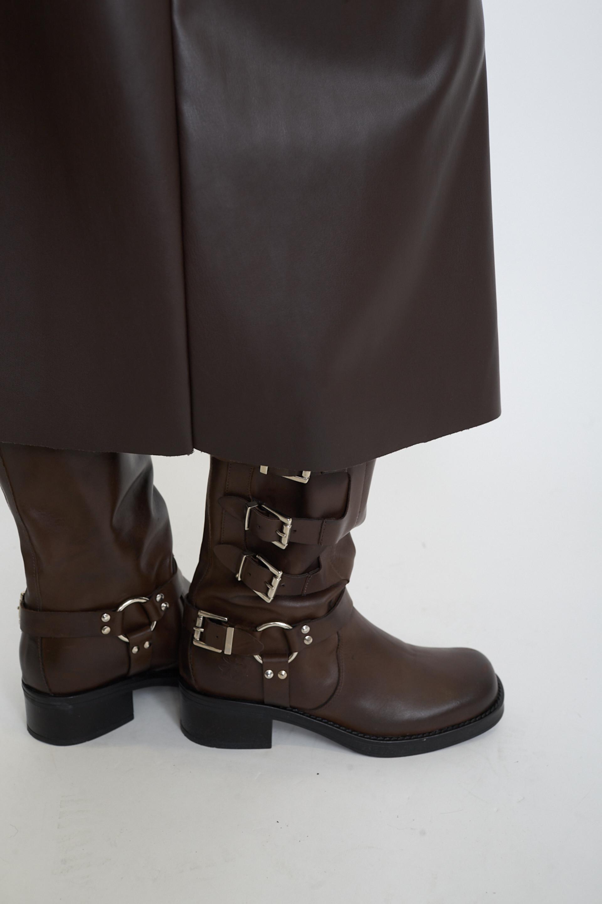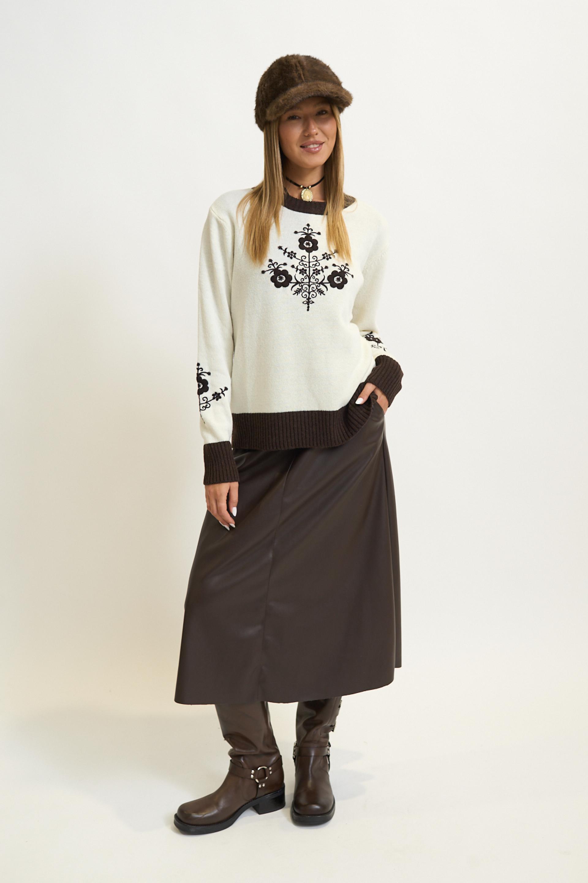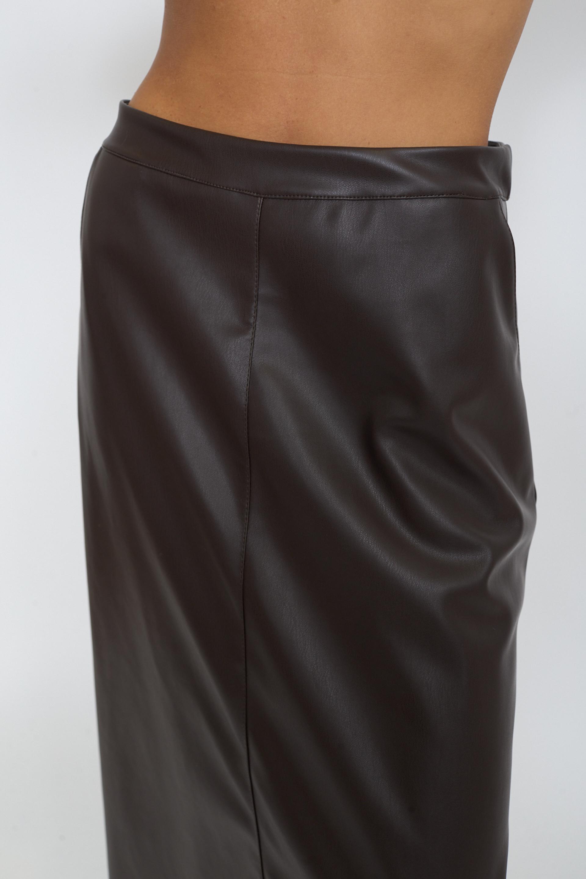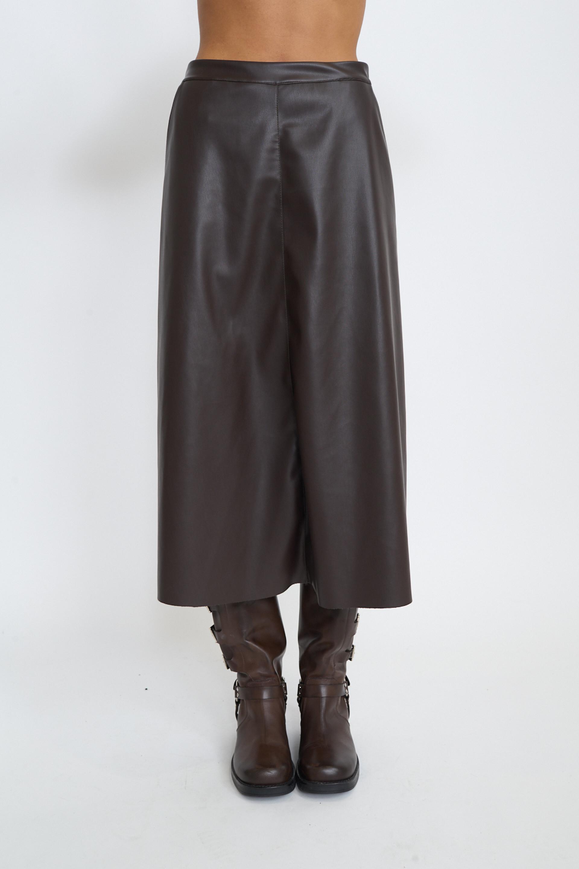 | Gonna svasata effetto pelle con tasche laterali e orlo a taglio vivo. Chiusura tramite cerniera posteriore. | ||