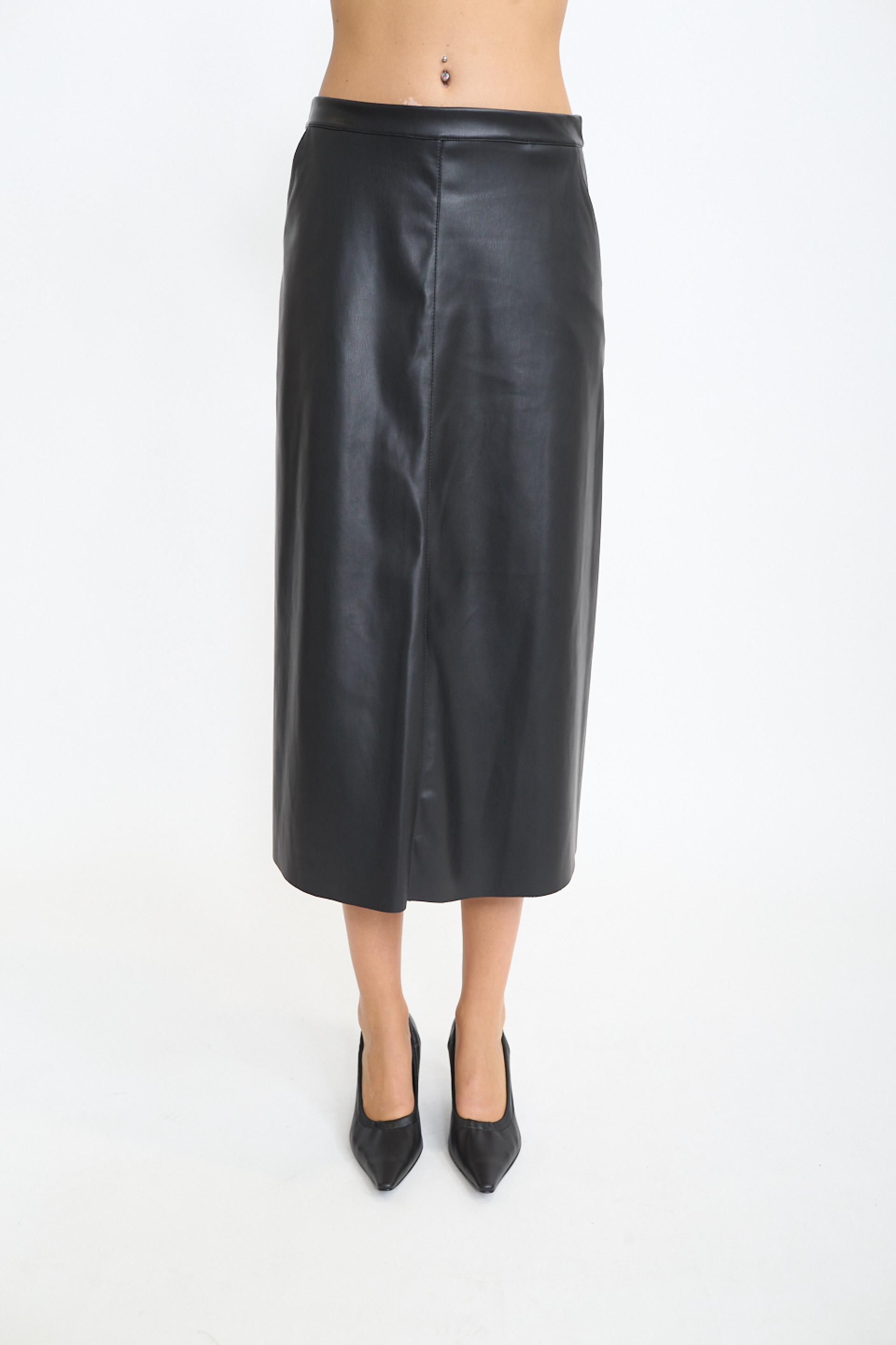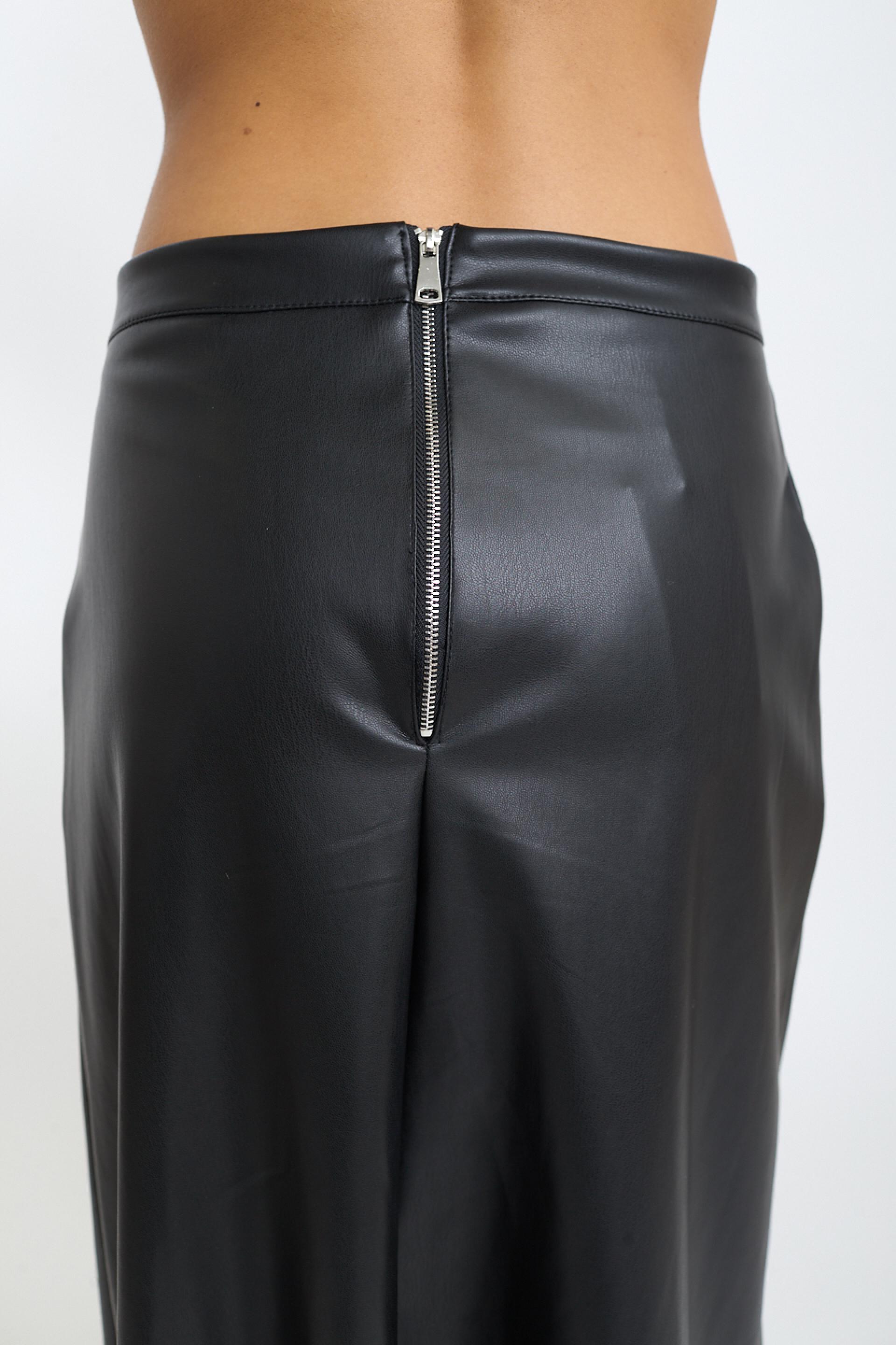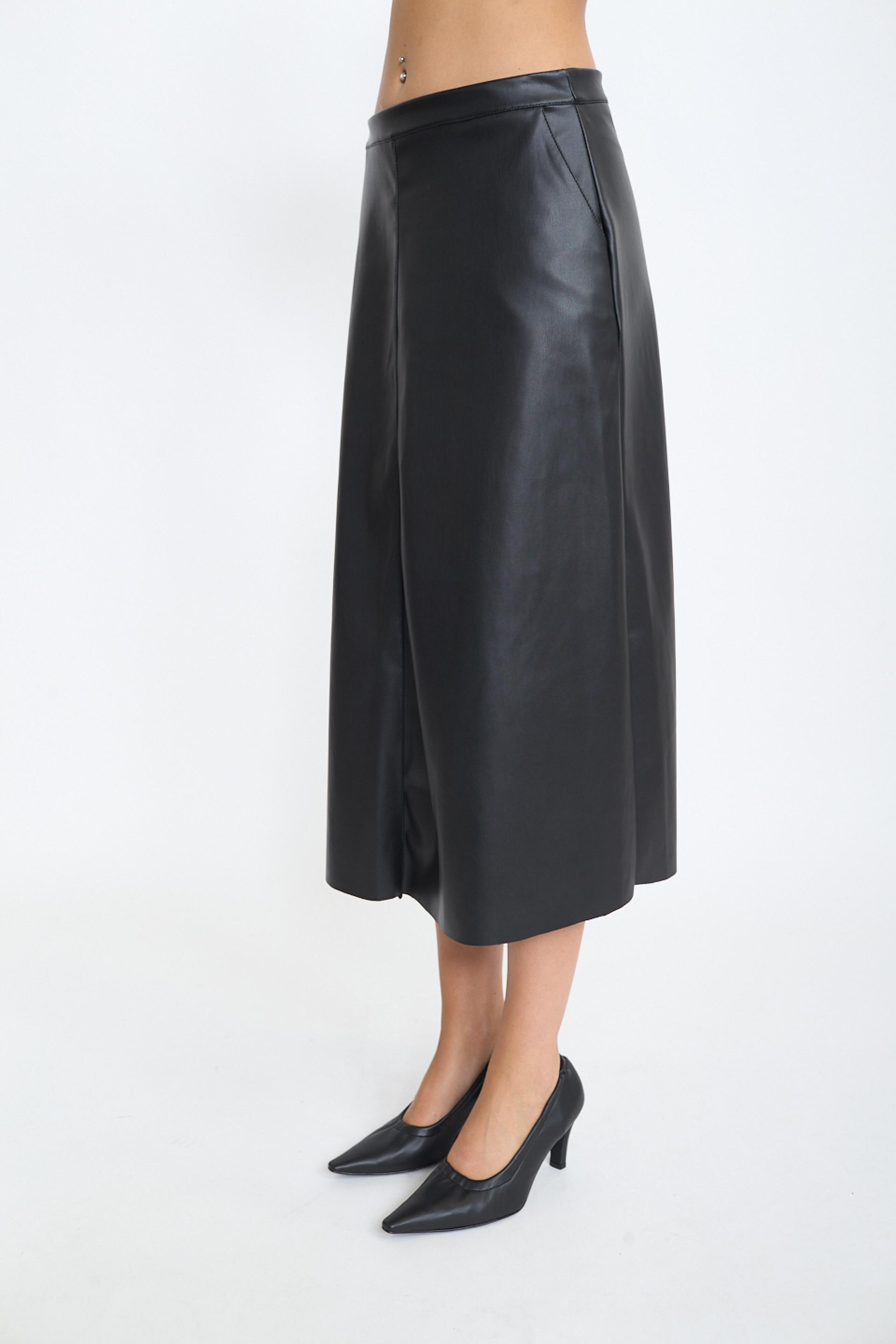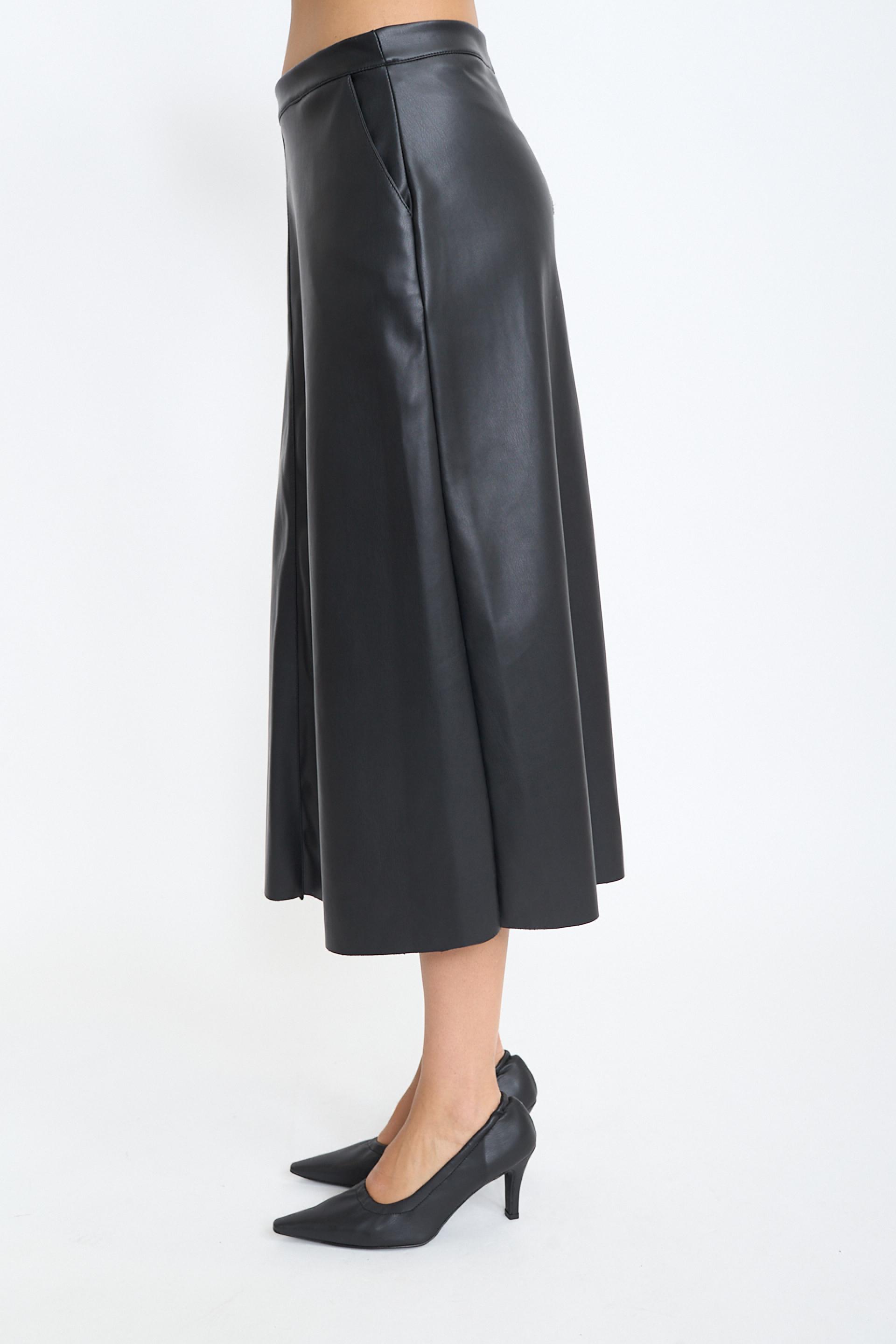 | Gonna svasata effetto pelle con tasche laterali e orlo a taglio vivo. Chiusura tramite cerniera posteriore. | ||