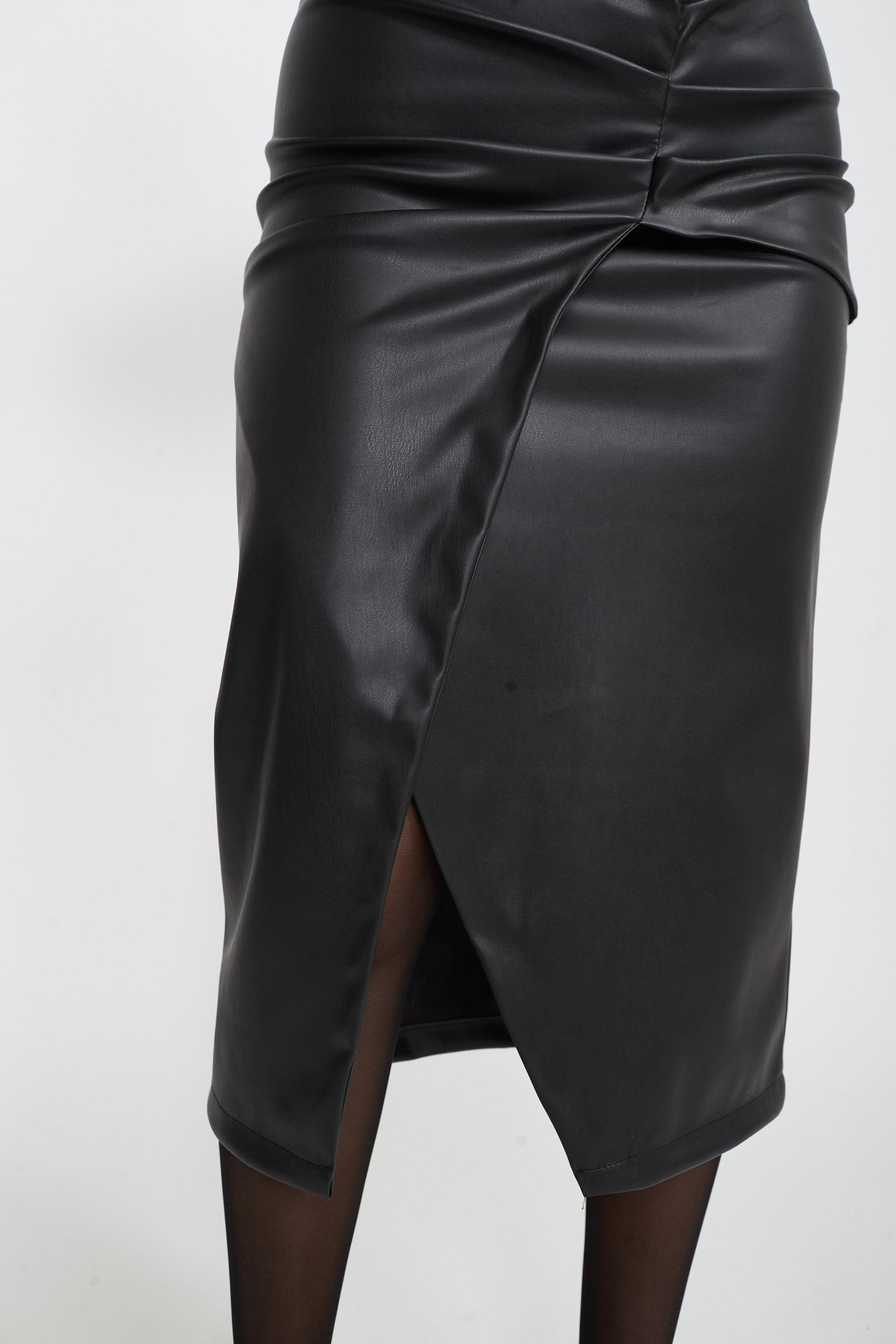 | Gonna longuette portafoglio con spacco e ripresa effetto pelle con fodera. Chiusura posteriore tramite zip. | ||