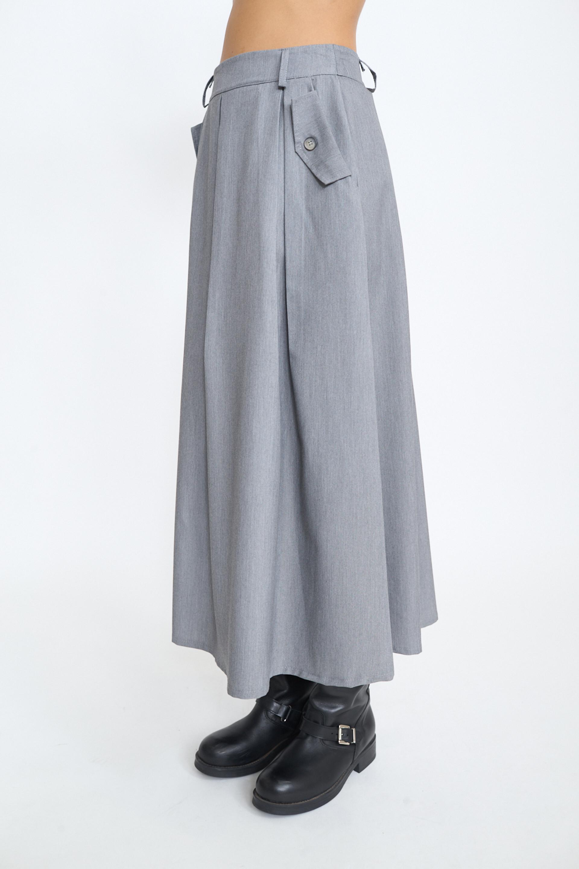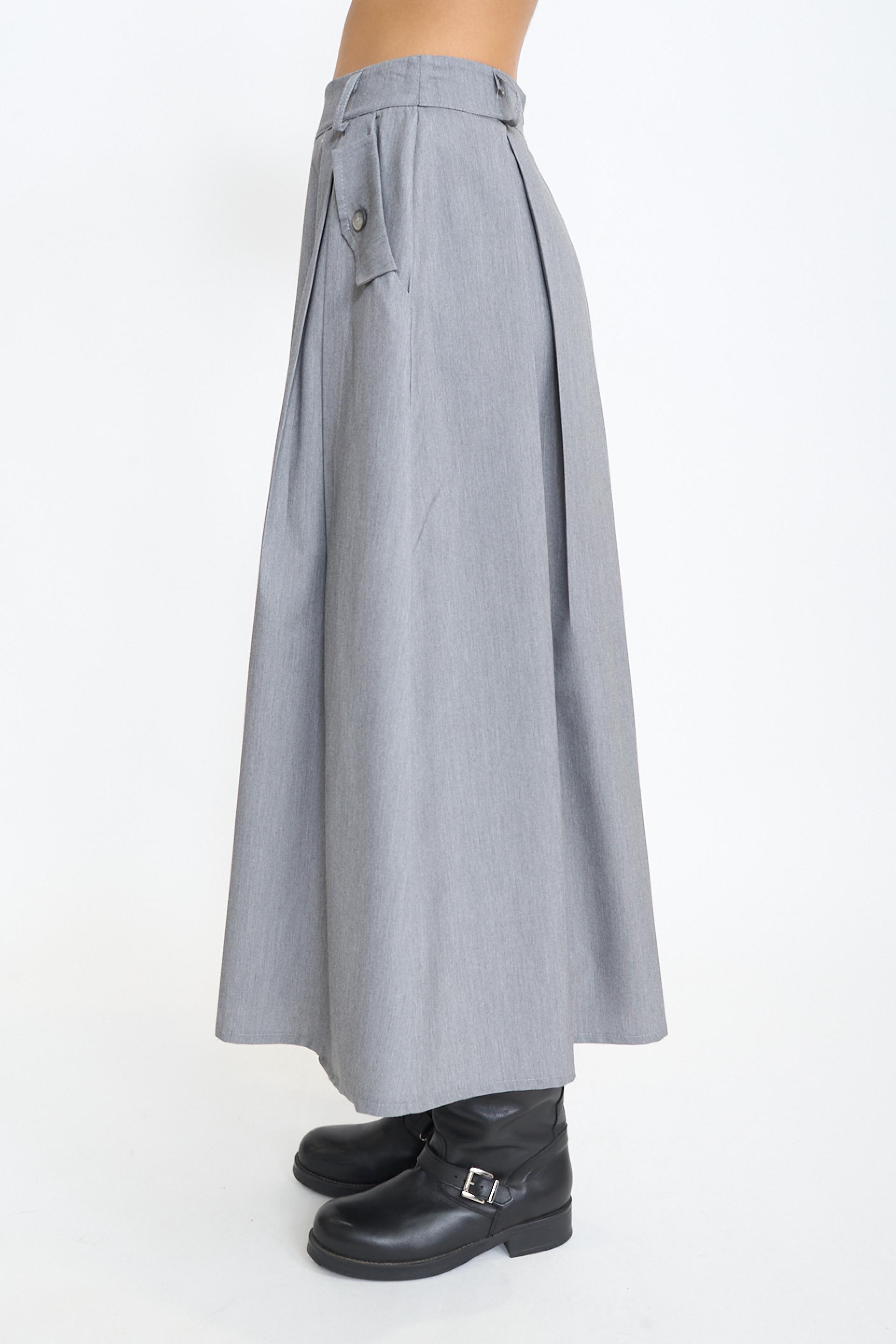 | Gonna lunga a pieghe con tasche laterali con dettaglio di pattine e bottone. Passanti in vita e chiusura posteriore tramite cerniera. | ||