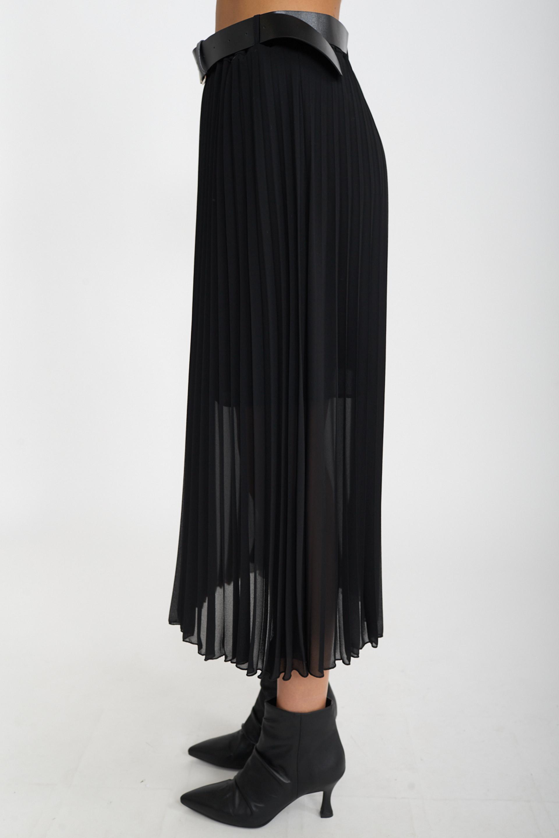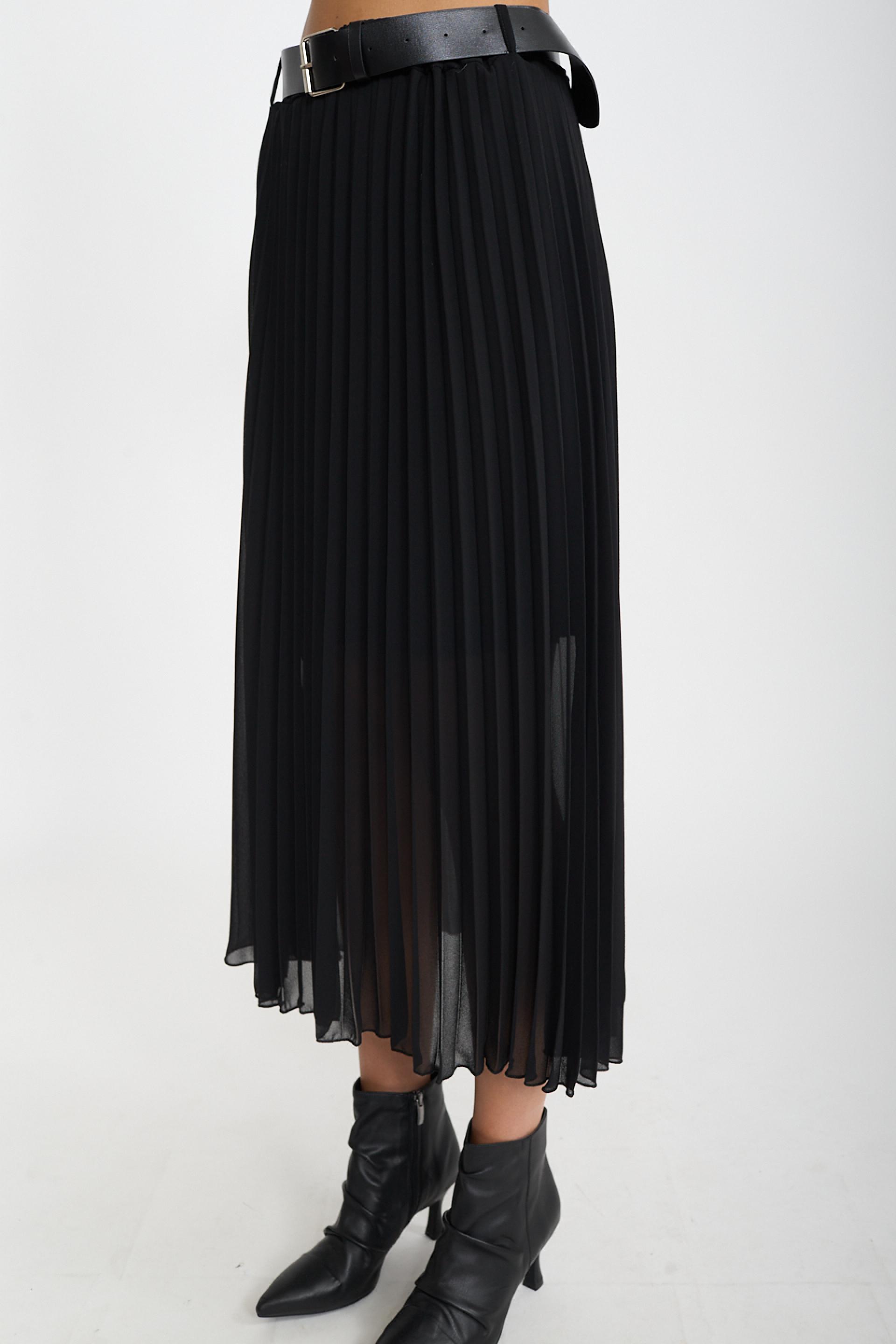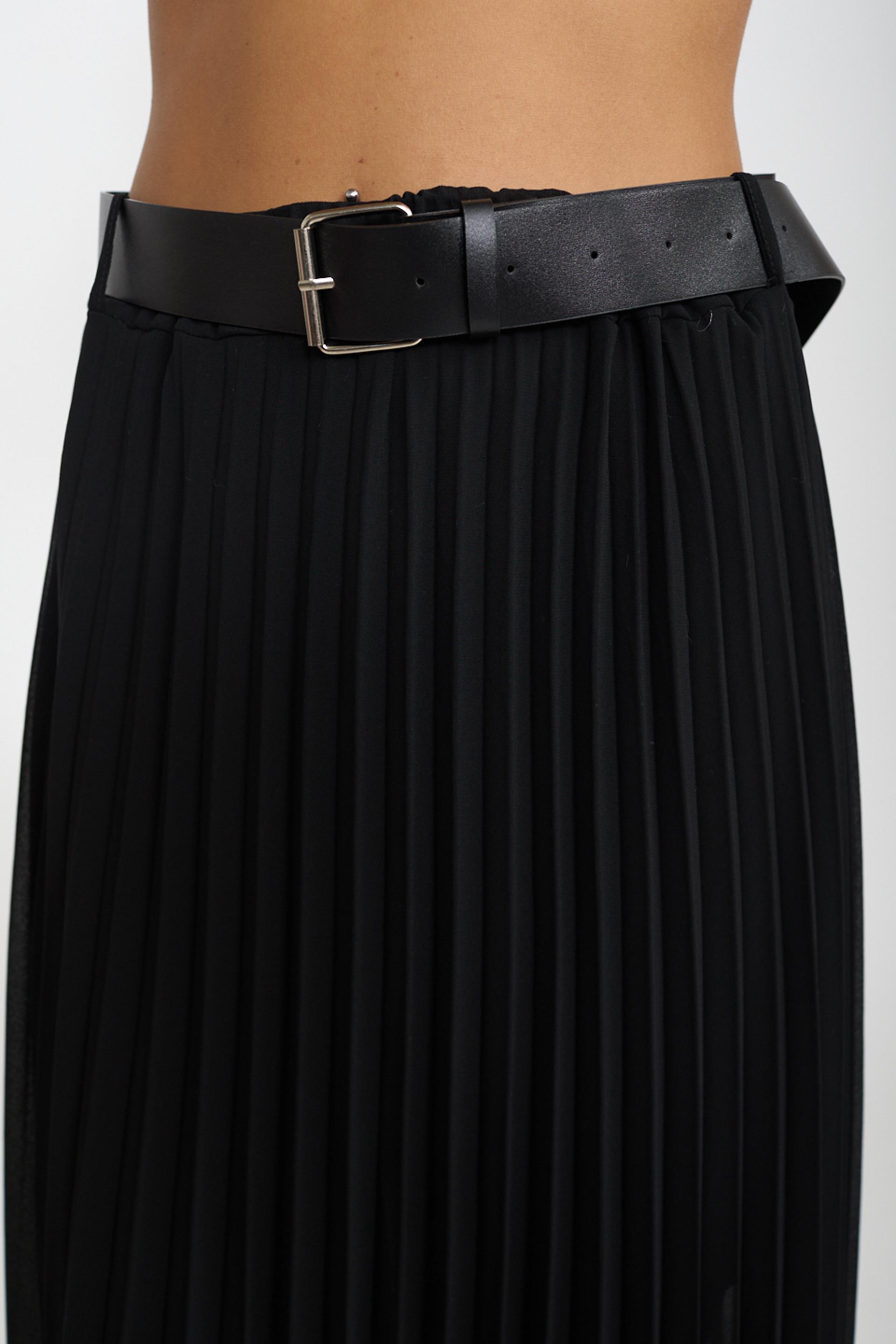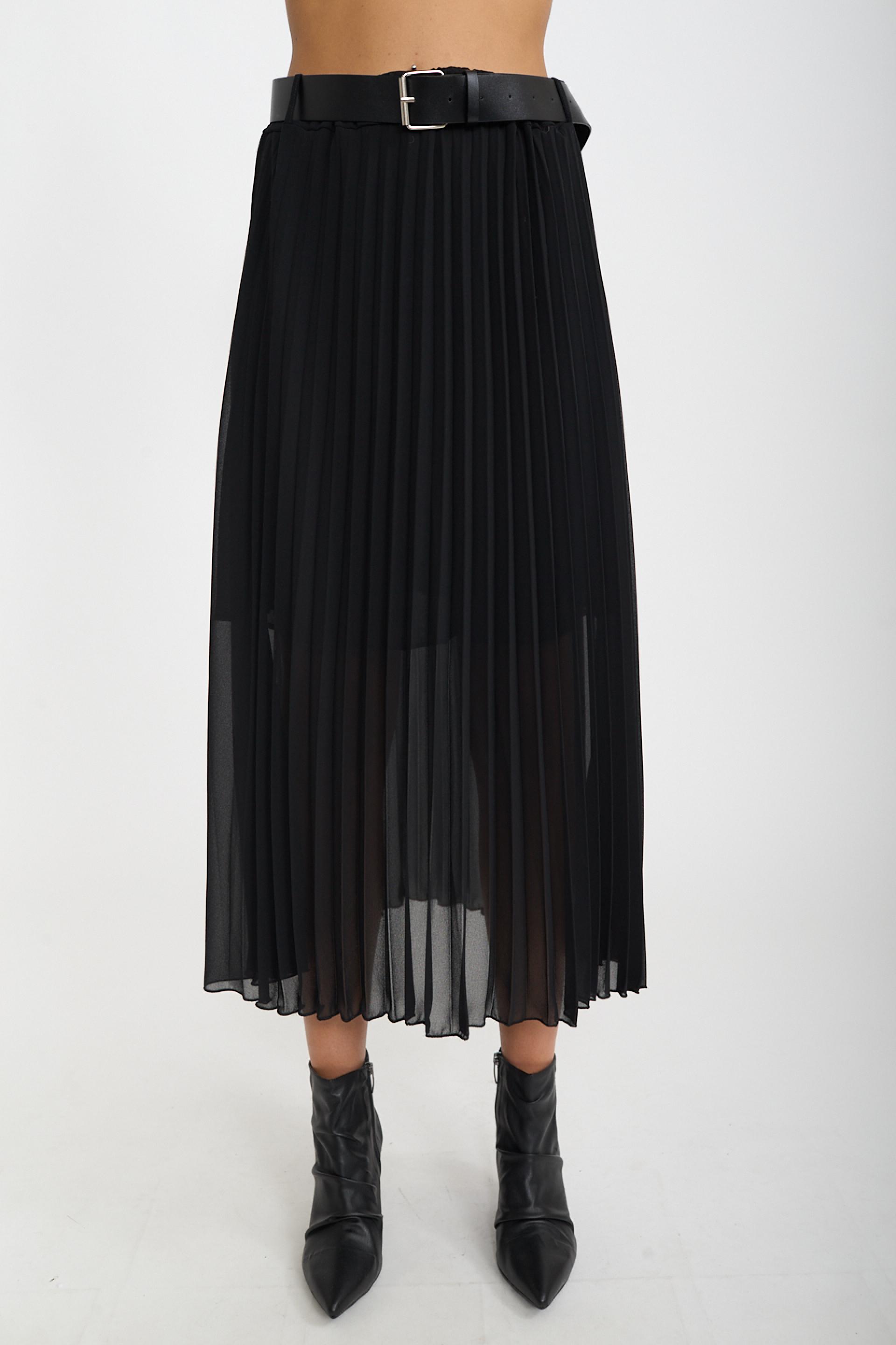 | Gonna lunga plissè con elastico in vita e cinta compresa. Fodera interna tono su tono. | ||