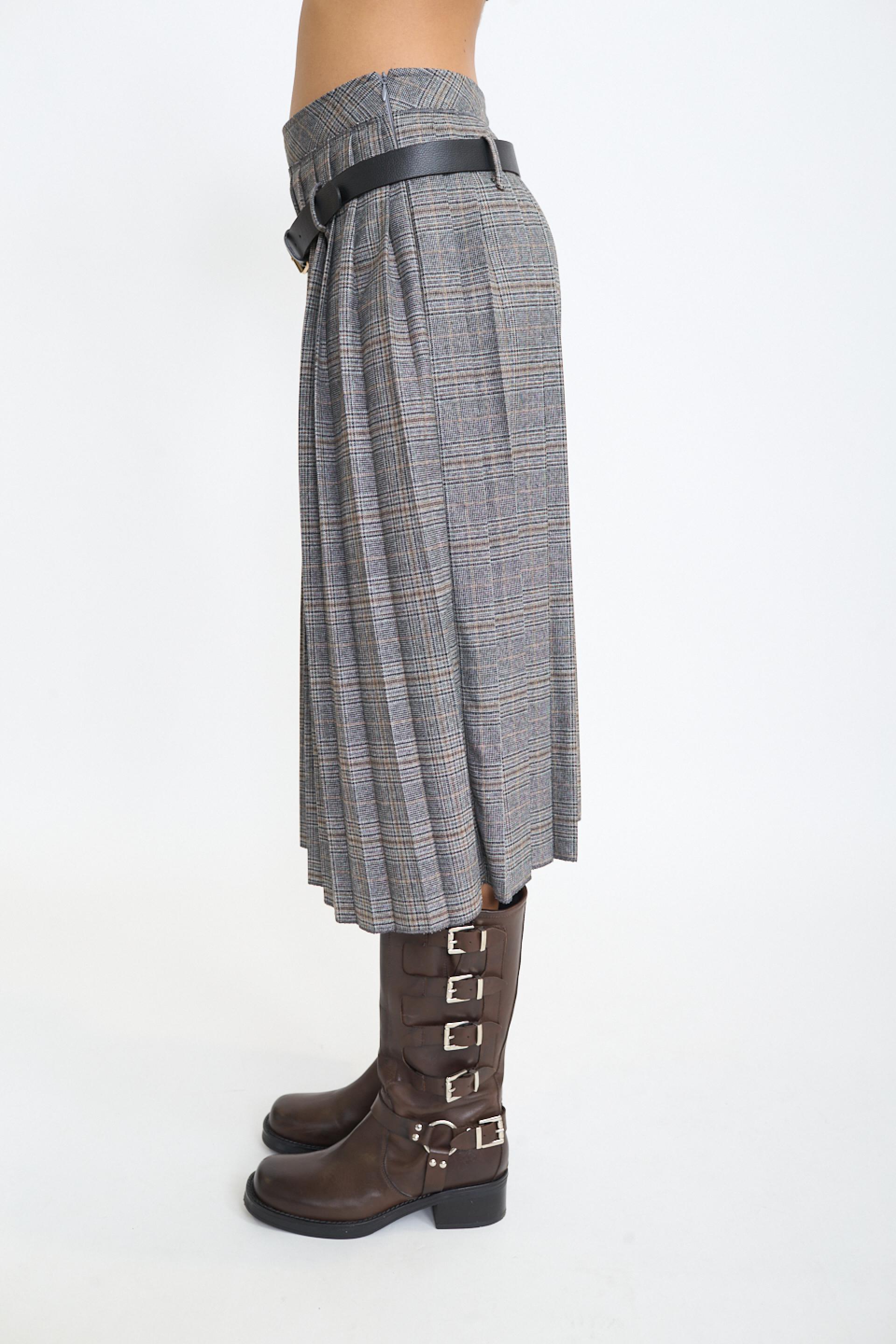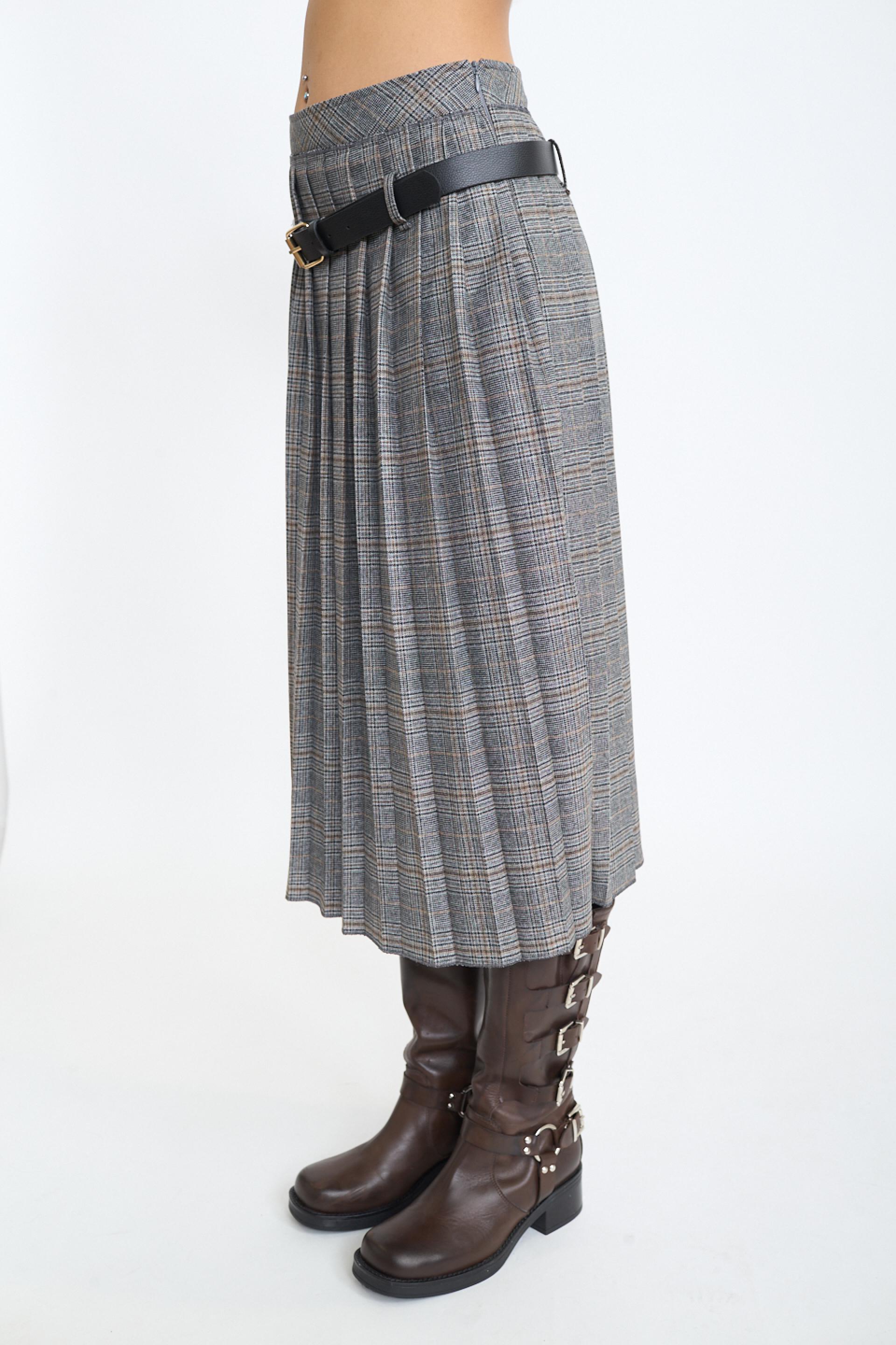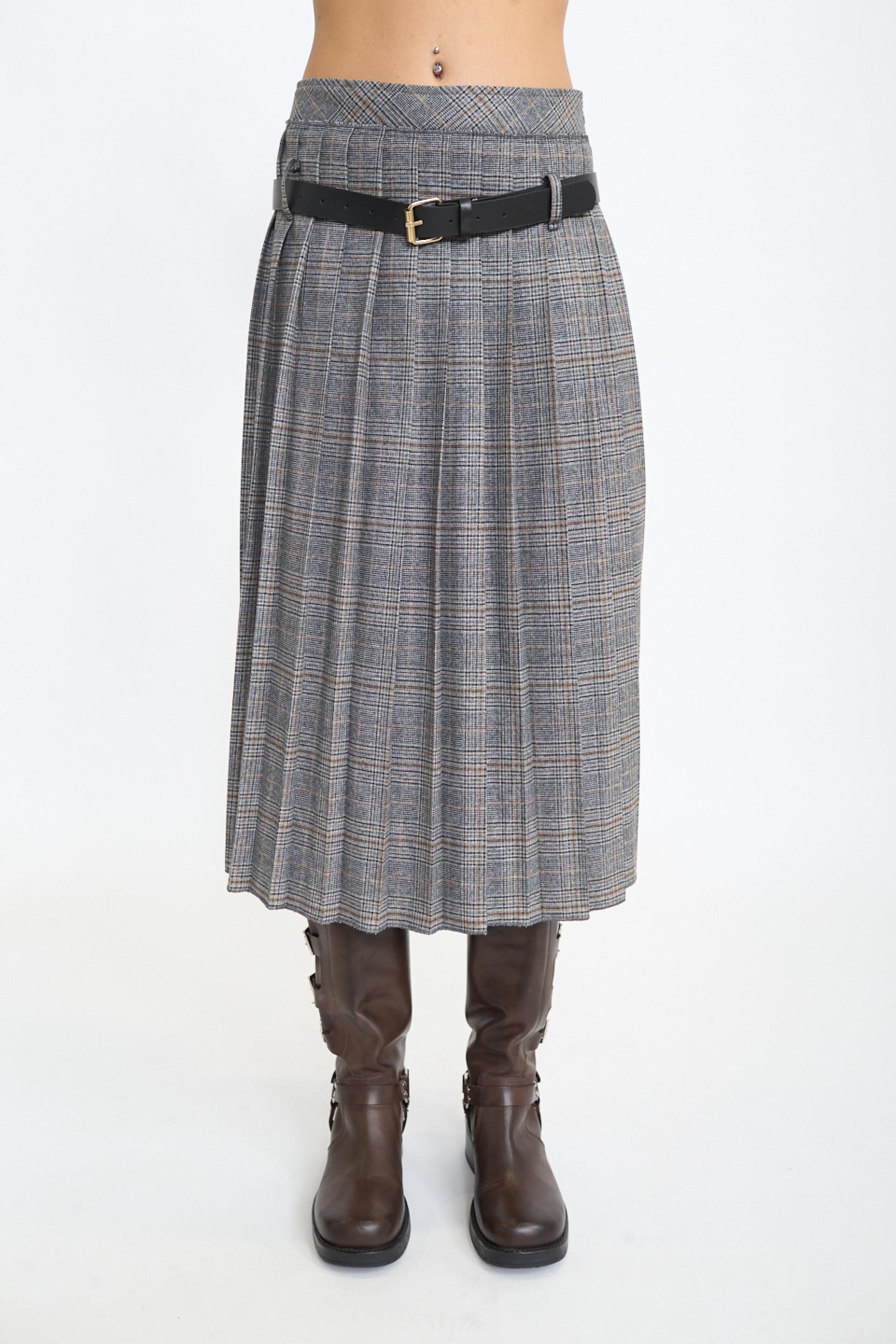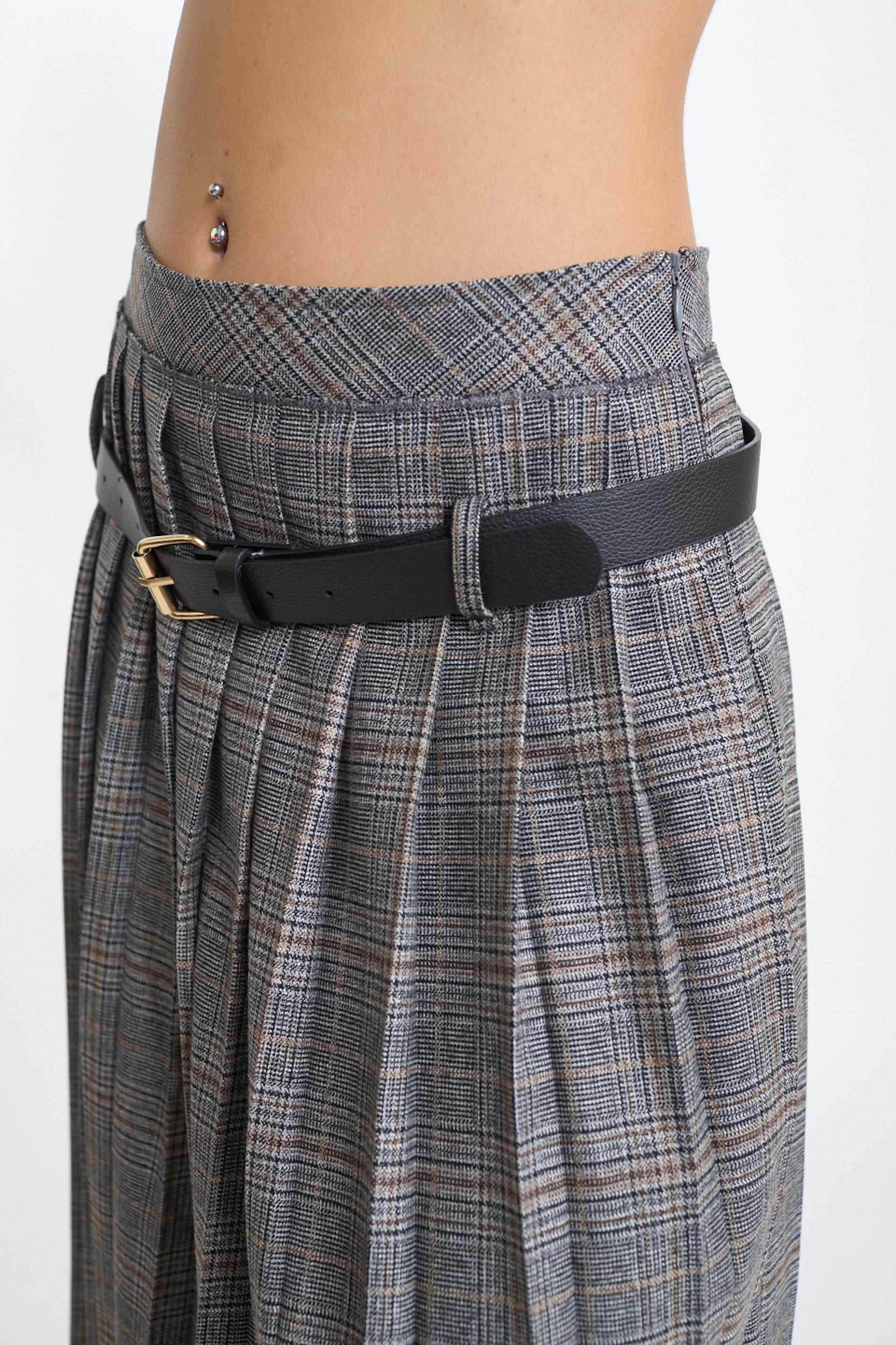 | Gonna midi a pieghe in tessuto tartan. Passanti con cintura compresa. Chiusura laterale tramite cerniera. | ||