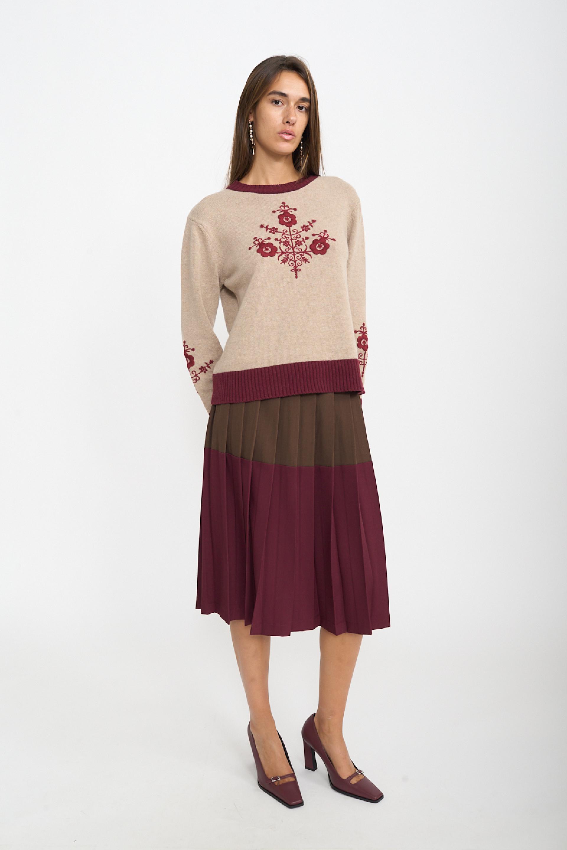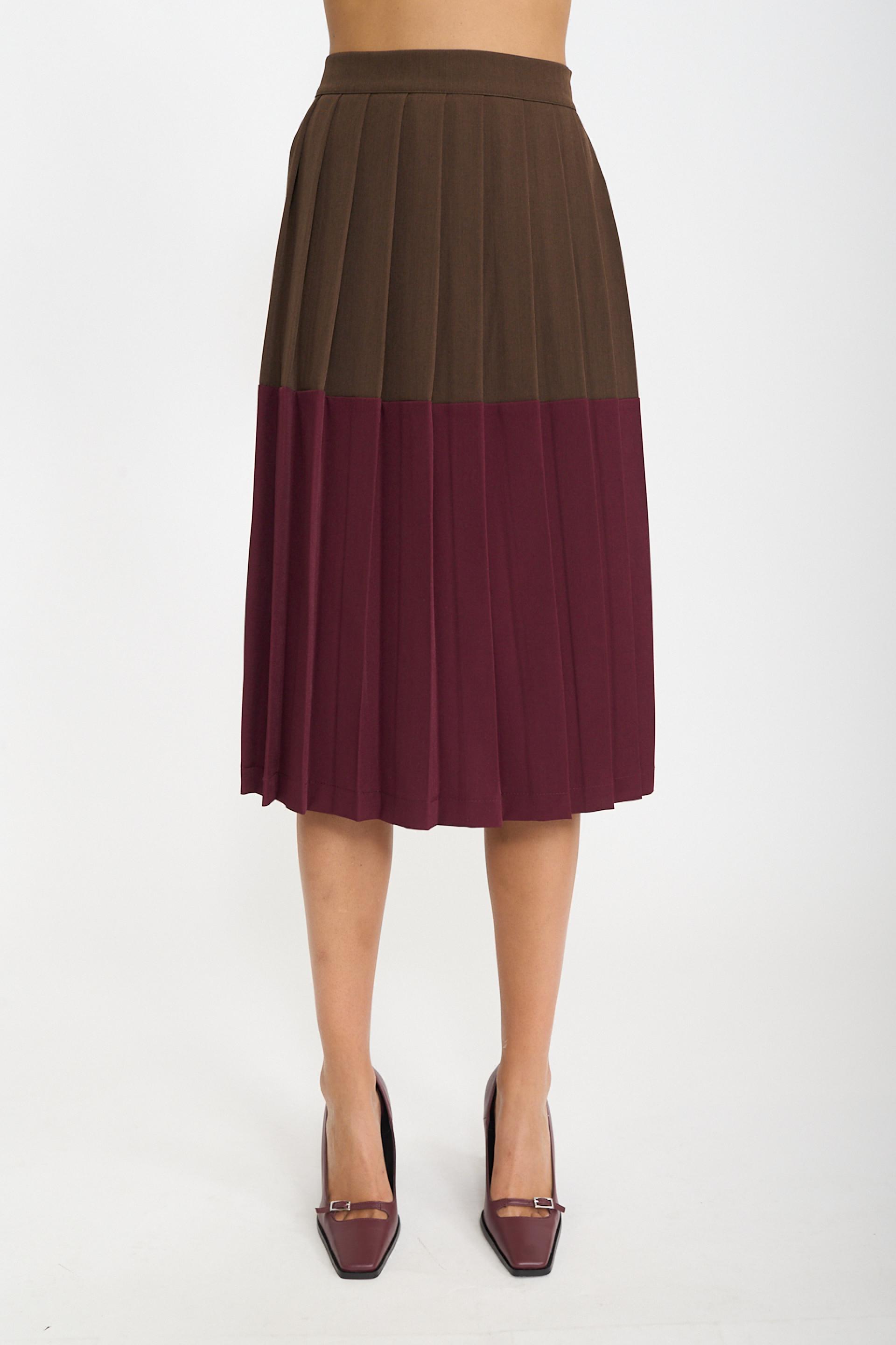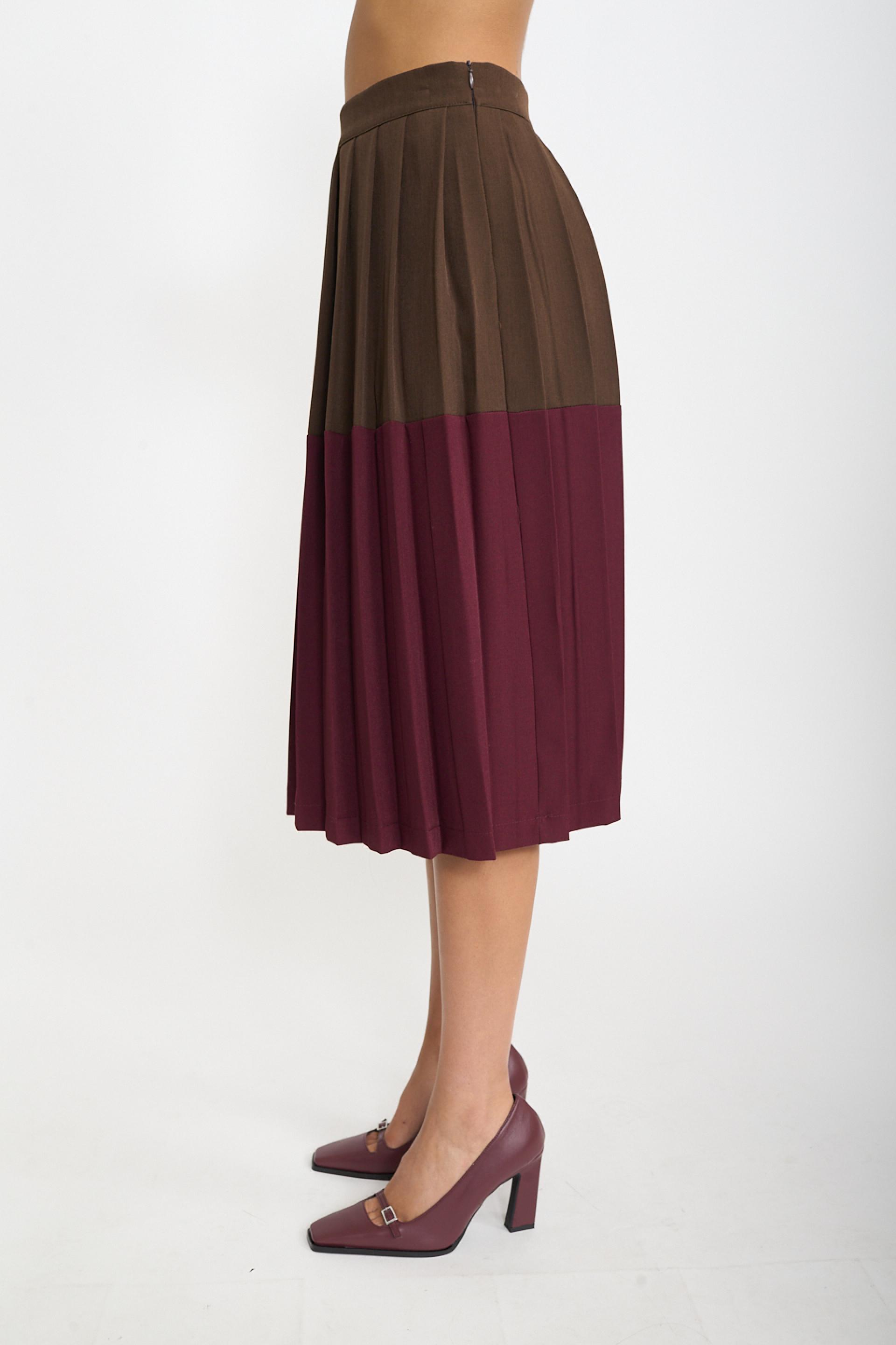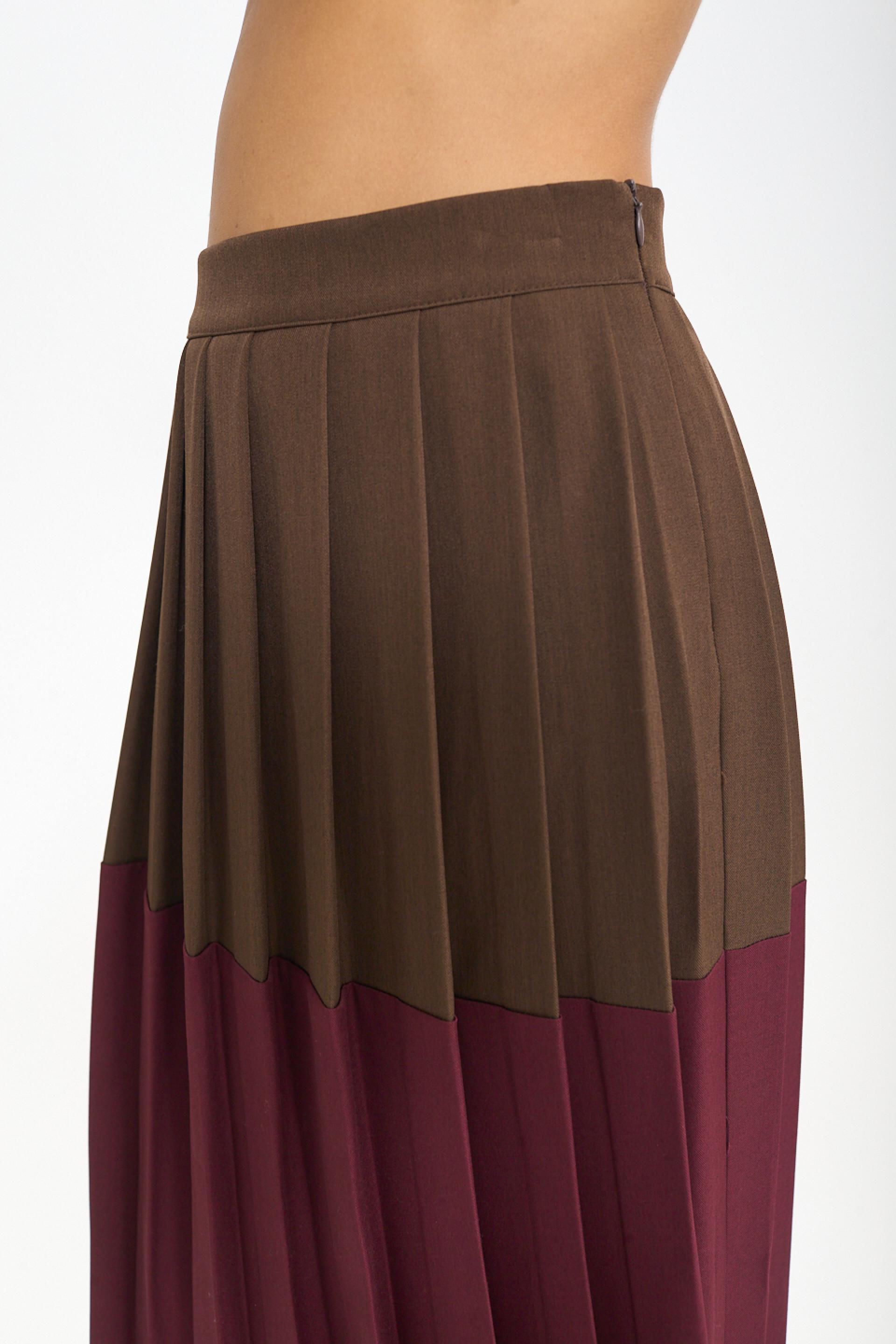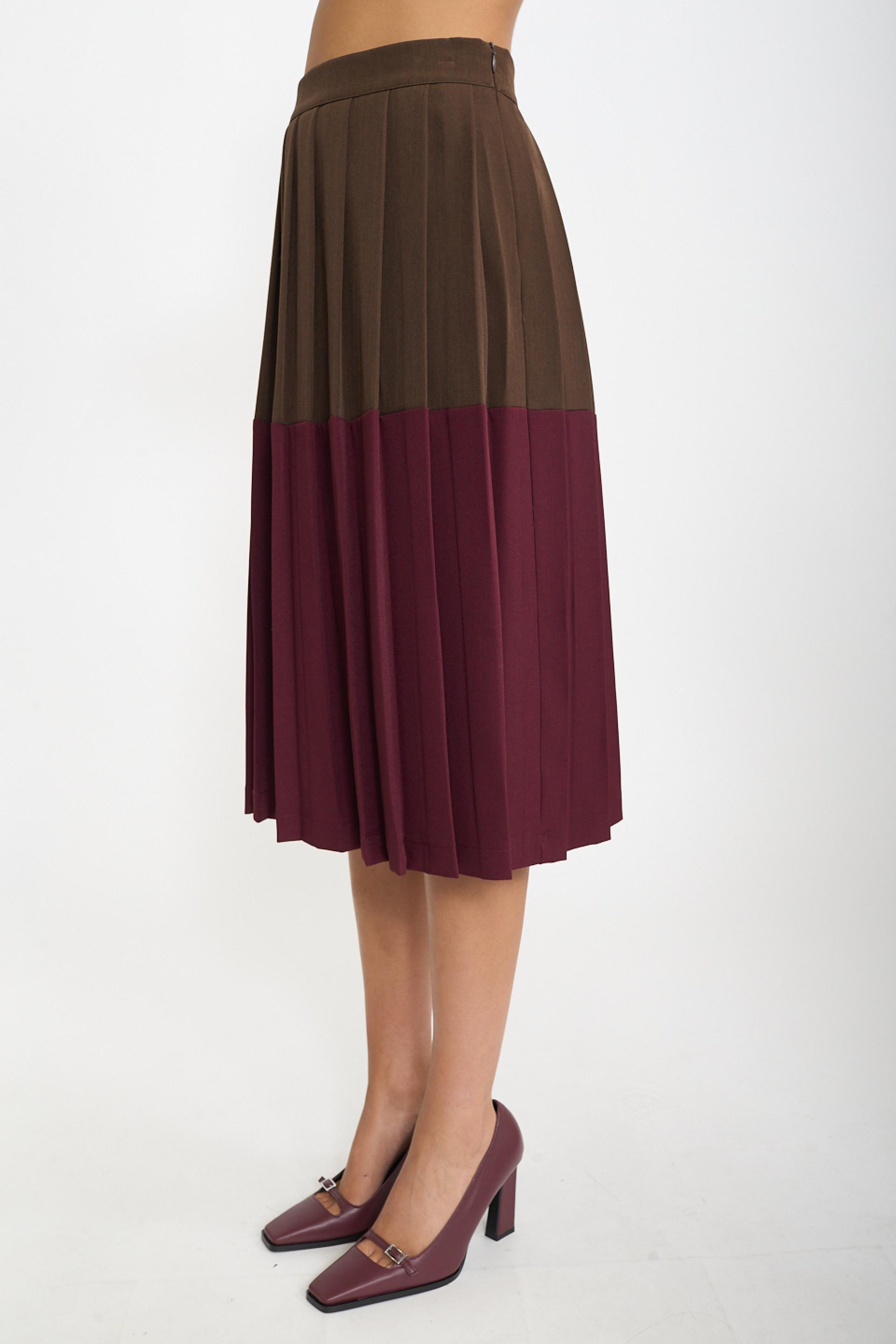 | Gonna midi a pieghe in tessuto bicolore. Chiusura laterale tramite cerniera nascosta nella cucitura. | ||