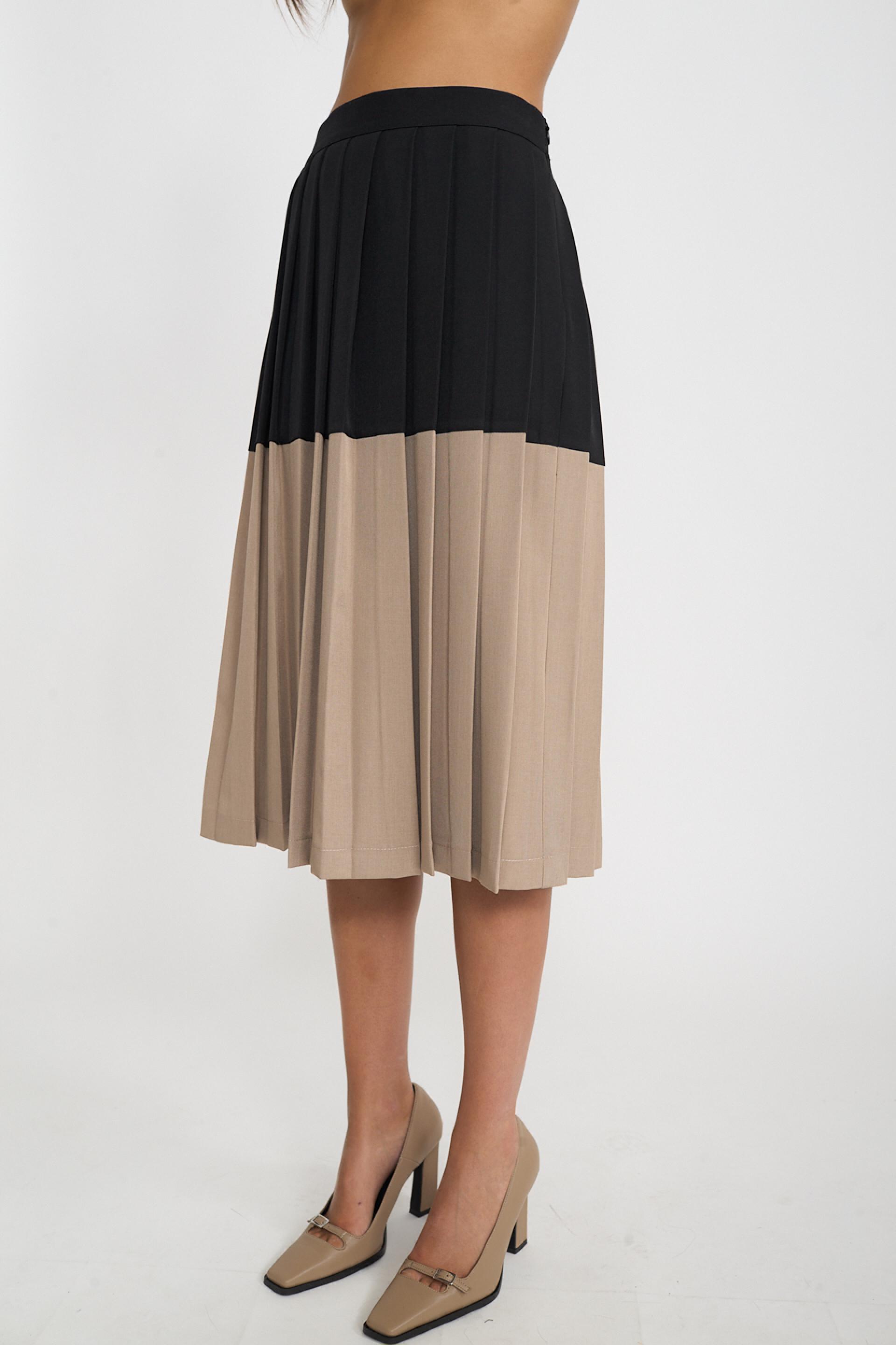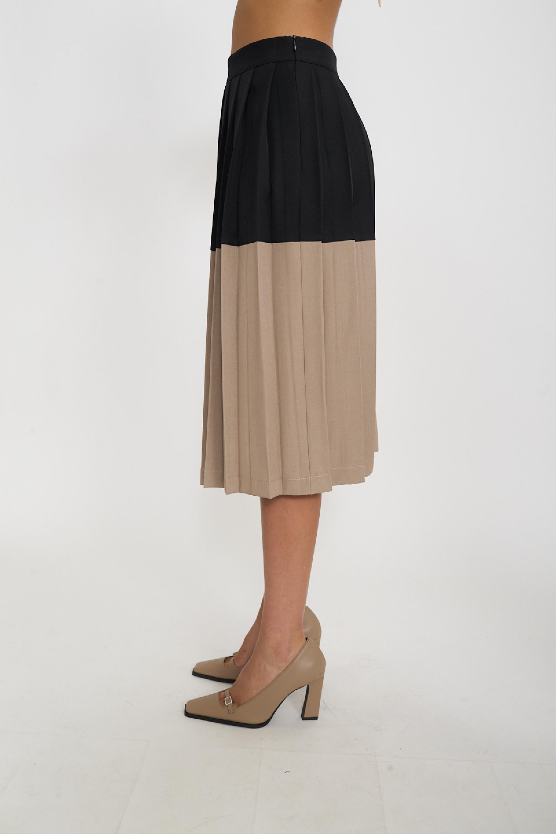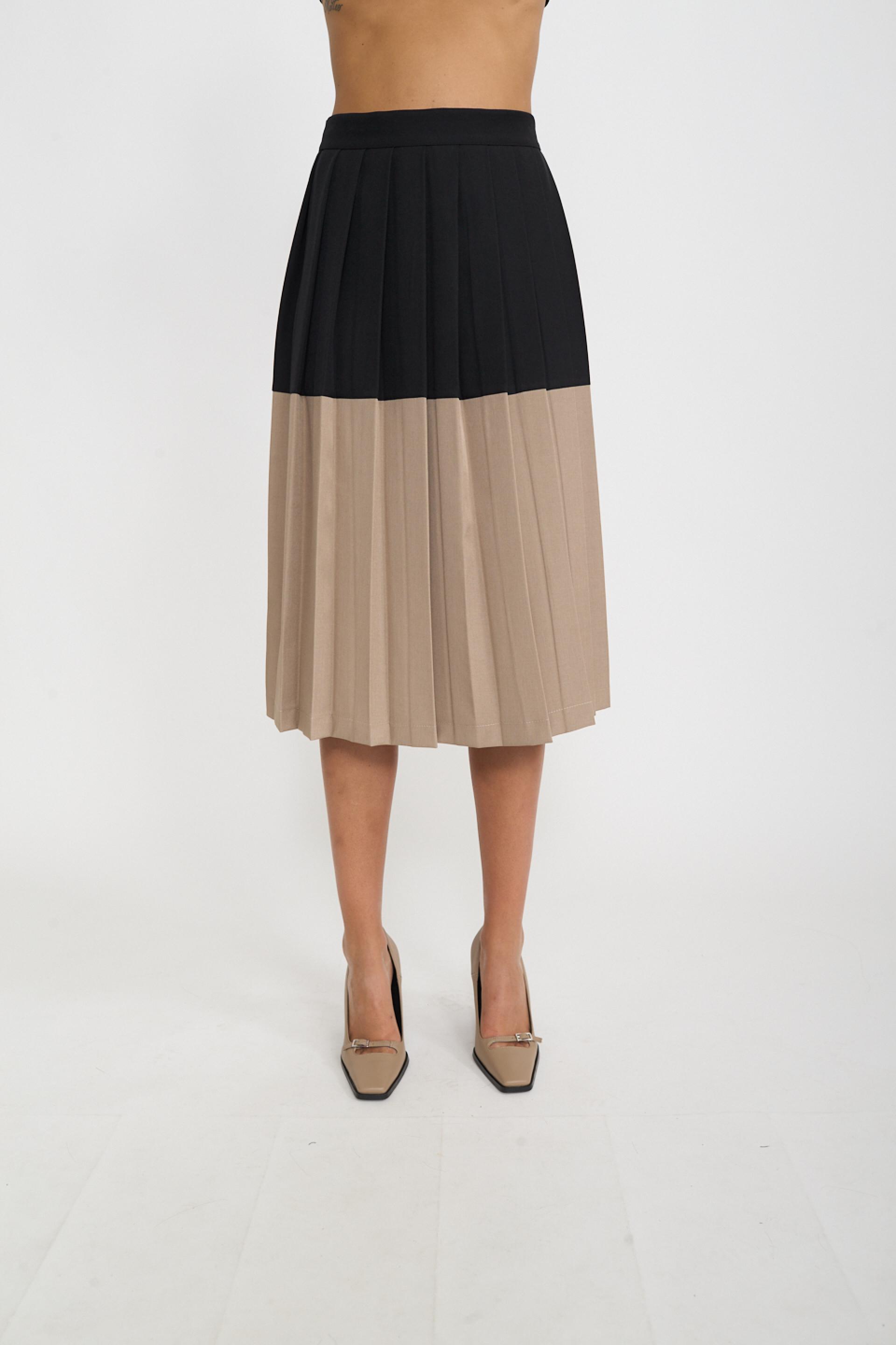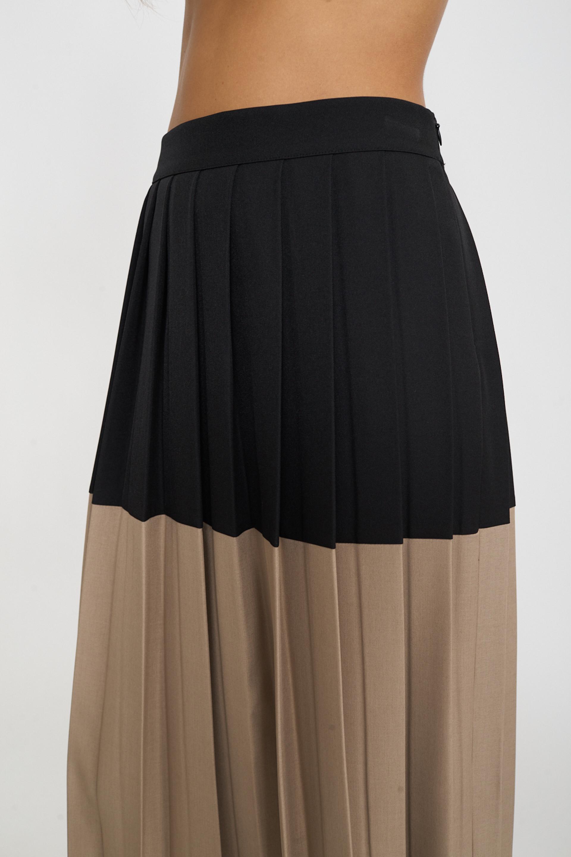 | Gonna midi a pieghe in tessuto bicolore. Chiusura laterale tramite cerniera nascosta nella cucitura. | ||