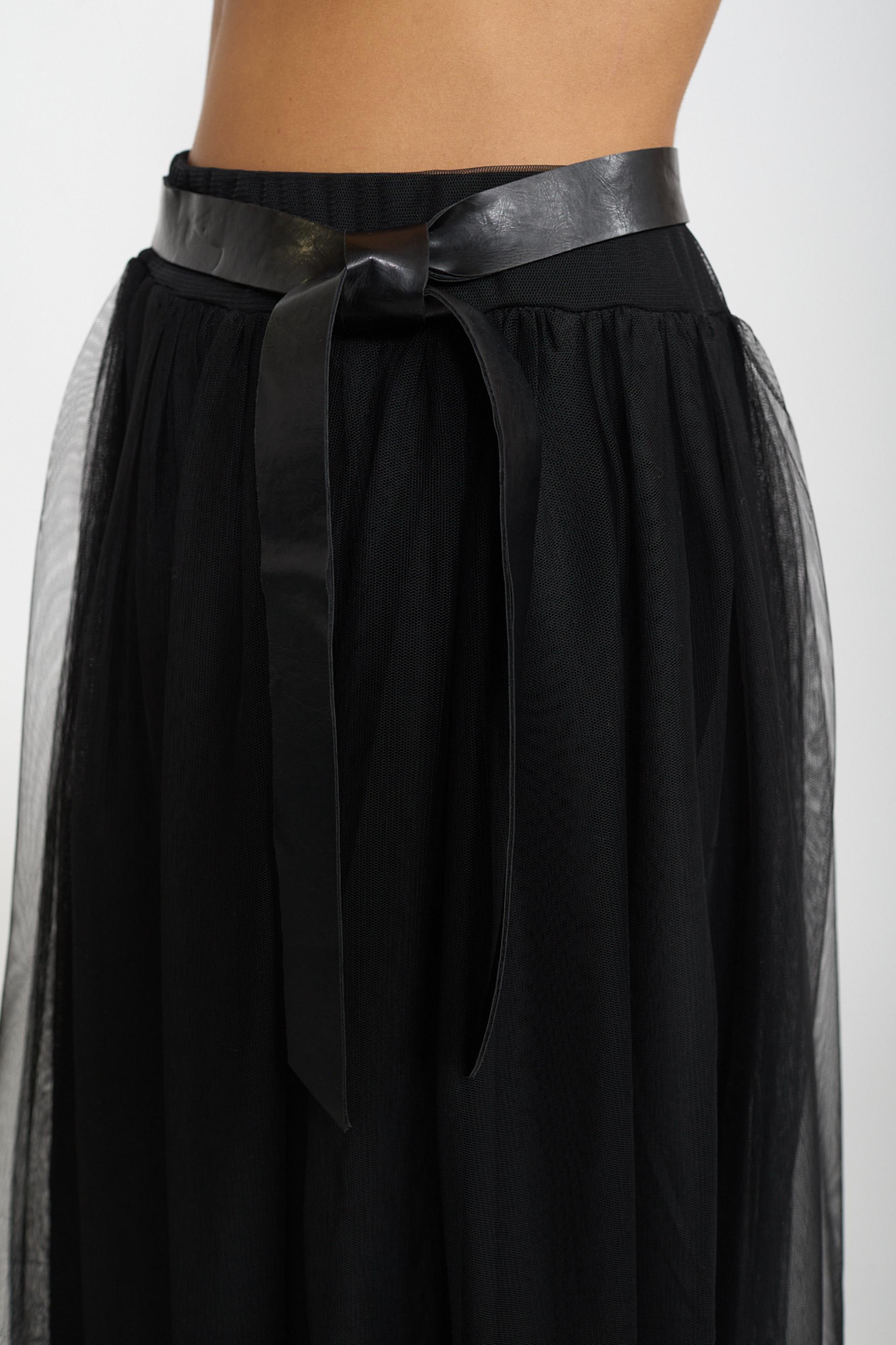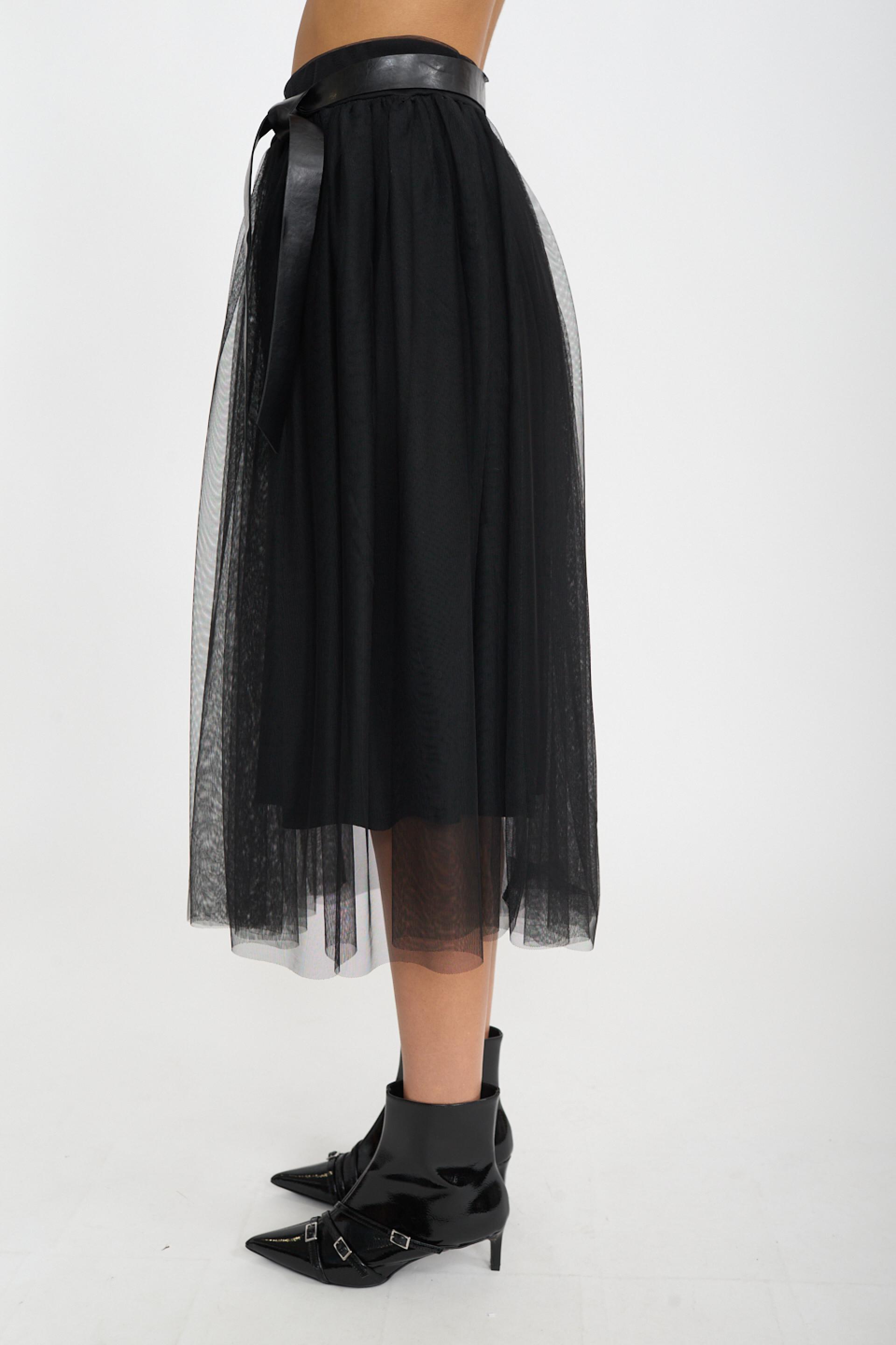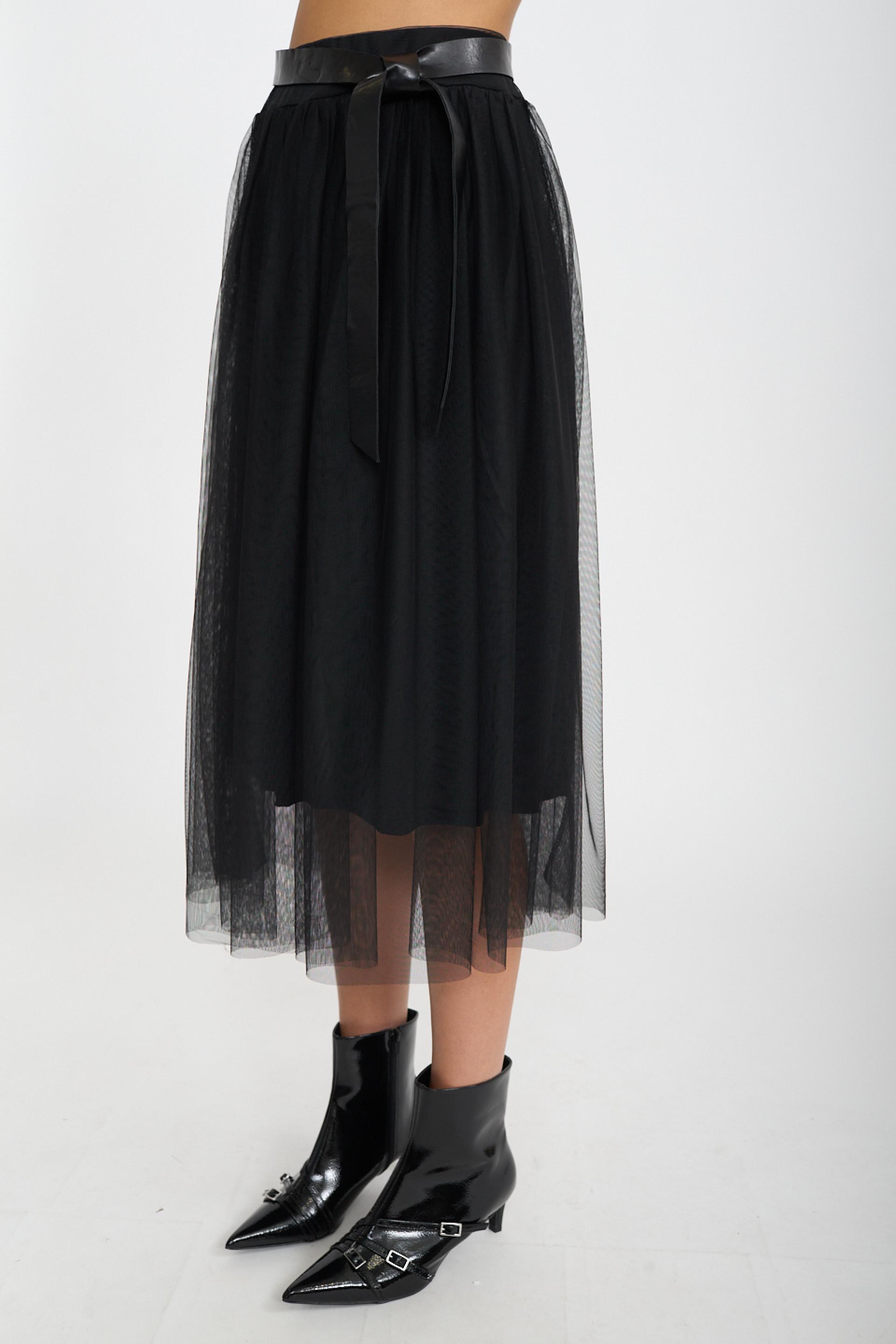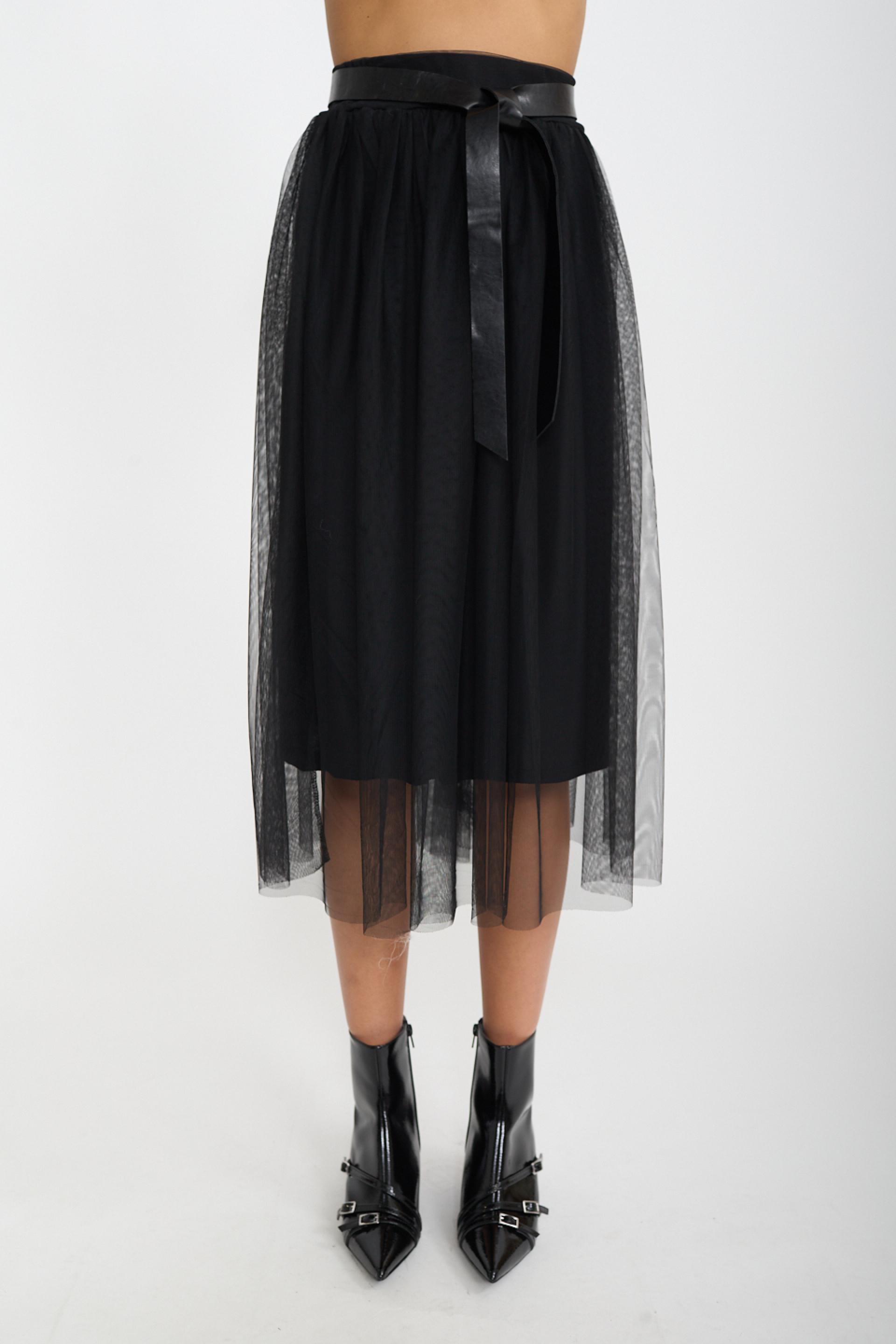 | Gonna midi in tulle con elastico in vita. Fodera in viscosa tono su tono. Cinta effetto pelle compresa. | ||