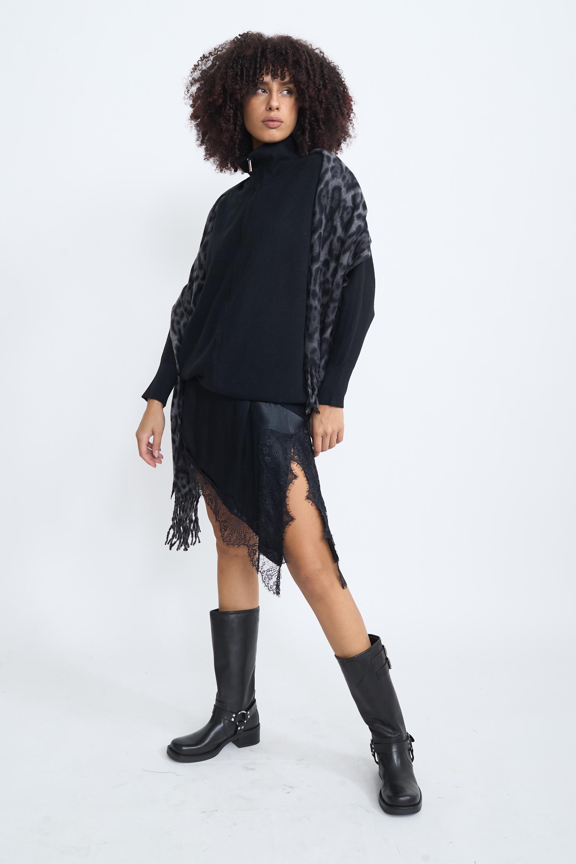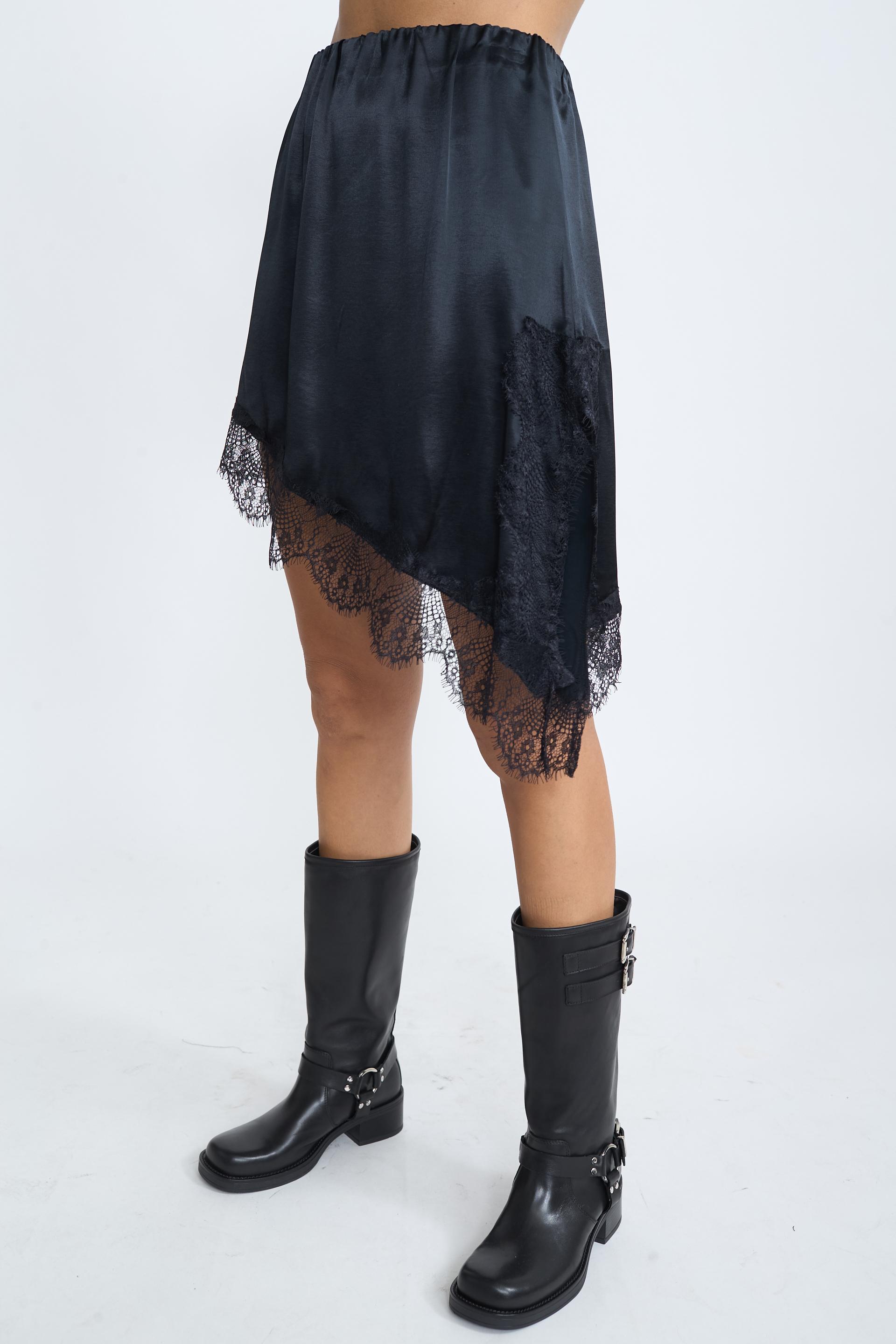 Gonna asimmetrica in raso con elastico in vita. Dettaglio di spacco laterale e fascia pizzo in orlo. | ||